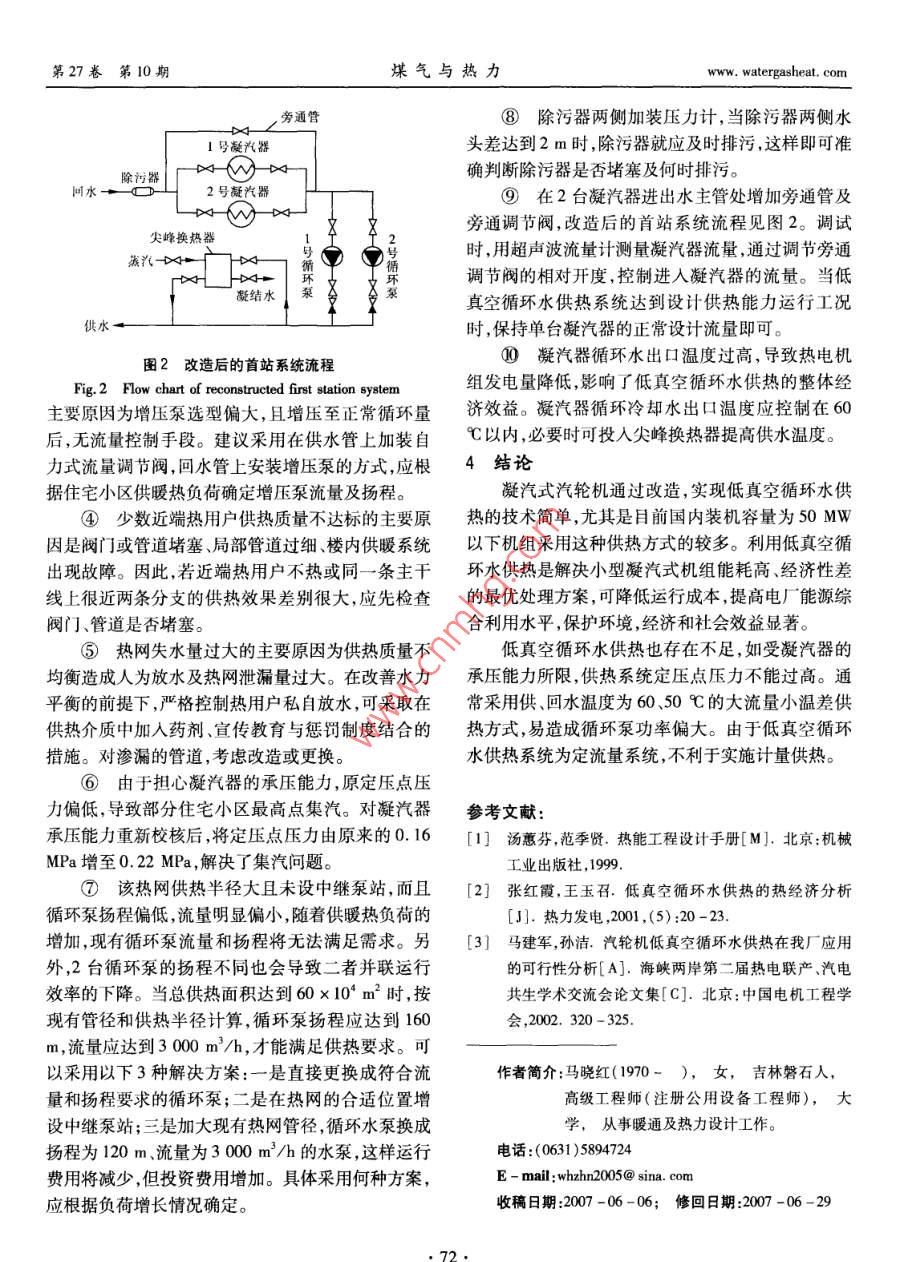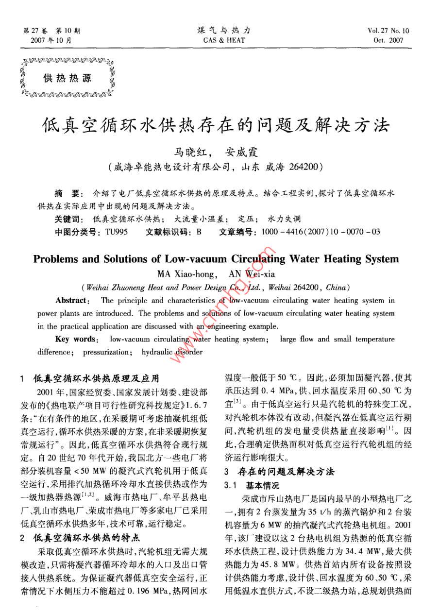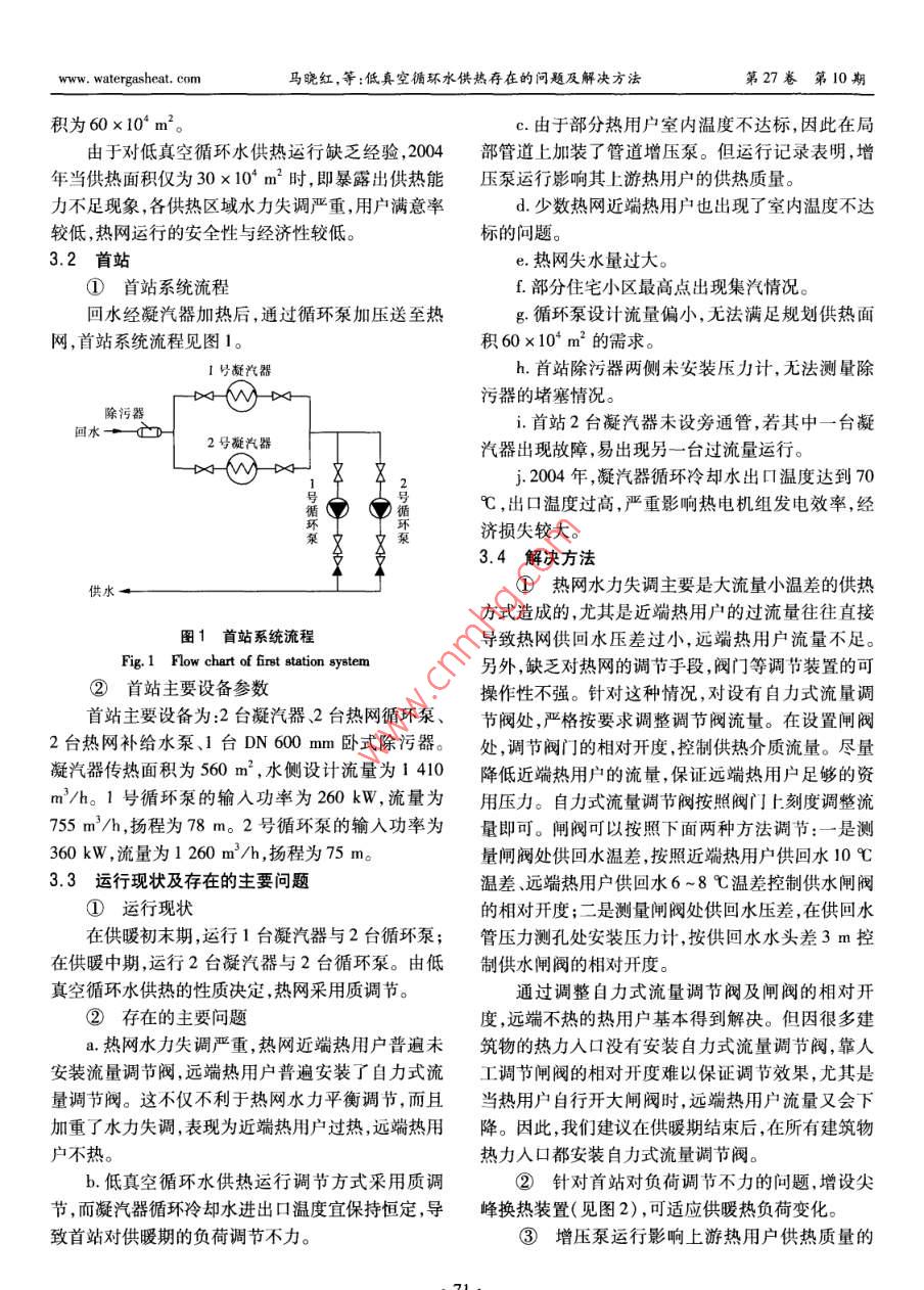 第27卷第10期煤氣與熱力Vol, 27 No. 102007年10月Gas heatOct,2007及》》》》A6公供熱熱源低真空循環(huán)水供熱存在的問(wèn)題及解決方法馬曉紅,安威霞威海卓能熱電設(shè)計(jì)有限公司,山東威海264200)摘要:介紹了電廠低真空循環(huán)水供熱的原理及特點(diǎn)。結(jié)合工程實(shí)例,探討了低真空循環(huán)水供熱在實(shí)際應(yīng)用中出現(xiàn)的問(wèn)題及解決方法。關(guān)鍵詞:低真空循環(huán)水供熱;大流量小溫差;定壓;水力失調(diào)中圖分類(lèi)號(hào):TU995文獻(xiàn)標(biāo)識(shí)碼:B文章編號(hào):1000-4416(2007)10-0070-03Problems and Solutions of Low-vacuum Circulating Water Heating SystemMA Xiao-hong, AN Wei-xiaWeihai Zhuoneng Heat and Power Design Co, Lid, Weihai 264200, China)Abstract: The principle and characteristics of low-vacuum circulating water heating system inpower plants are introduced. The problems and solutions of low-vacuum circulating water heating systemin the practical application are discussed with an engineering exampleKey words: low-vacuum circulating water heating system; large flow and small temperaturedifference; pressurization; hydraulic disorder1低真空循環(huán)水供熱原理及應(yīng)用溫度一般低于50℃。因此,必須加固凝汽器,使其2001年,國(guó)家經(jīng)貿(mào)委、國(guó)家發(fā)展計(jì)劃委、建設(shè)部承壓達(dá)到0.4MPa,供、回水溫度采用60、50℃為發(fā)布的《熱電聯(lián)產(chǎn)項(xiàng)目可行性研究科技規(guī)定》1.6.7宜3。由于低真空運(yùn)行只是汽輪機(jī)的特殊變工況,條:“在有條件的地區(qū),在采暖期可考慮抽凝機(jī)組低對(duì)汽輪機(jī)本體沒(méi)有改動(dòng),但凝汽器在低真空運(yùn)行期真空運(yùn)行,循環(huán)水供熱采暖的方案,在非采暖期恢復(fù)間,汽輪機(jī)組的發(fā)電量受供熱量直接影響。因常規(guī)運(yùn)行”。因此,低真空循環(huán)水供熱符合現(xiàn)行規(guī)此,合理確定供熱面積對(duì)低真空運(yùn)行汽輪機(jī)組的經(jīng)定。自20世紀(jì)70年代開(kāi)始,我國(guó)北方一些電廠將濟(jì)運(yùn)行影響很大。部分裝機(jī)容量<50MW的凝汽式汽輪機(jī)用于低真3存在的問(wèn)題及解決方法空運(yùn)行,采用排汽加熱循環(huán)冷卻水直接供熱或作為3.1基本情況級(jí)加熱器熱源2。威海市熱電廠、牟平縣熱電榮成市斥山熱電廠是國(guó)內(nèi)最早的小型熱電廠之廠、乳山市熱電廠、榮成市熱電廠等多家電廠已采用,擁有2臺(tái)蒸發(fā)量為35Uh的蒸汽鍋爐和2臺(tái)裝低真空循環(huán)水供熱多年,技術(shù)可靠,運(yùn)行穩(wěn)定機(jī)容量為6MW的抽汽凝汽式汽輪熱電機(jī)組。20012低真空循環(huán)水供熱的特點(diǎn)年,該廠建設(shè)以這2臺(tái)熱電機(jī)組為熱源的低真空循釆取低真空循環(huán)水供熱時(shí),汽輪機(jī)組無(wú)需大規(guī)環(huán)水供熱工程,設(shè)計(jì)供熱能力為34.4MW,最大供模改造,只需將凝汽器循環(huán)冷卻水的入口及出口管熱能力為45.8MW。供熱首站內(nèi)所有設(shè)備按照設(shè)接人供熱系統(tǒng)。為保證凝汽器低真空安全運(yùn)行,正計(jì)供熱能力考慮,設(shè)計(jì)供、回水溫度為6050℃,采常情況下水側(cè)壓力不能超過(guò)0.196MPa,熱網(wǎng)回水用低溫水直供方式,不設(shè)二級(jí)熱力站,總規(guī)劃供熱面www.watergasheat.com馬曉紅,等:低真空循環(huán)水供熱存在的問(wèn)題及解決方法第27卷第10期積為60×104m2。c.由于部分熱用戶室內(nèi)溫度不達(dá)標(biāo),因此在局由于對(duì)低真空循環(huán)水供熱運(yùn)行缺乏經(jīng)驗(yàn),2004部管道上加裝了管道增壓泵。但運(yùn)行記錄表明,增年當(dāng)供熱面積僅為30×10′m2時(shí),即暴露出供熱能壓泵運(yùn)行影響其上游熱用戶的供熱質(zhì)量。力不足現(xiàn)象,各供熱區(qū)域水力失調(diào)嚴(yán)重,用戶滿意率d.少數(shù)熱網(wǎng)近端熱用戶也出現(xiàn)了室內(nèi)溫度不達(dá)較低,熱網(wǎng)運(yùn)行的安全性與經(jīng)濟(jì)性較低。標(biāo)的問(wèn)題。3.2首站e.熱網(wǎng)失水量過(guò)大。①首站系統(tǒng)流程f.部分住宅小區(qū)最高點(diǎn)出現(xiàn)集汽情況?;厮?jīng)凝汽器加熱后,通過(guò)循環(huán)泵加壓送至熱g.循環(huán)泵設(shè)計(jì)流量偏小,無(wú)法滿足規(guī)劃供熱面網(wǎng),首站系統(tǒng)流程見(jiàn)圖1。積60×10m2的需求。號(hào)凝汽h.首站除污器兩側(cè)未安裝壓力計(jì),無(wú)法測(cè)量除污器的堵塞情況。除污器首站2臺(tái)凝汽器未設(shè)旁通管,若其中一臺(tái)凝2號(hào)凝汽器汽器出現(xiàn)故障,易出現(xiàn)另一臺(tái)過(guò)流量運(yùn)行。j.2004年,凝汽器循環(huán)冷卻水出口溫度達(dá)到70循℃,出口溫度過(guò)高,嚴(yán)重影響熱電機(jī)組發(fā)電效率,經(jīng)濟(jì)損失較大。3.4解決方法①熱網(wǎng)水力失調(diào)主要是大流量小溫差的供熱方式造成的,尤其是近端熱用戶的過(guò)流量往往直接圖1首站系統(tǒng)流程導(dǎo)致熱網(wǎng)供回水壓差過(guò)小,遠(yuǎn)端熱用戶流量不足。Fig. 1 Flow chart of first station system另外,缺乏對(duì)熱網(wǎng)的調(diào)節(jié)手段,閥門(mén)等調(diào)節(jié)裝置的可②首站主要設(shè)備參數(shù)操作性不強(qiáng)。針對(duì)這種情況,對(duì)設(shè)有自力式流量調(diào)首站主要設(shè)備為:2臺(tái)凝汽器、2臺(tái)熱網(wǎng)循環(huán)泵、節(jié)閥