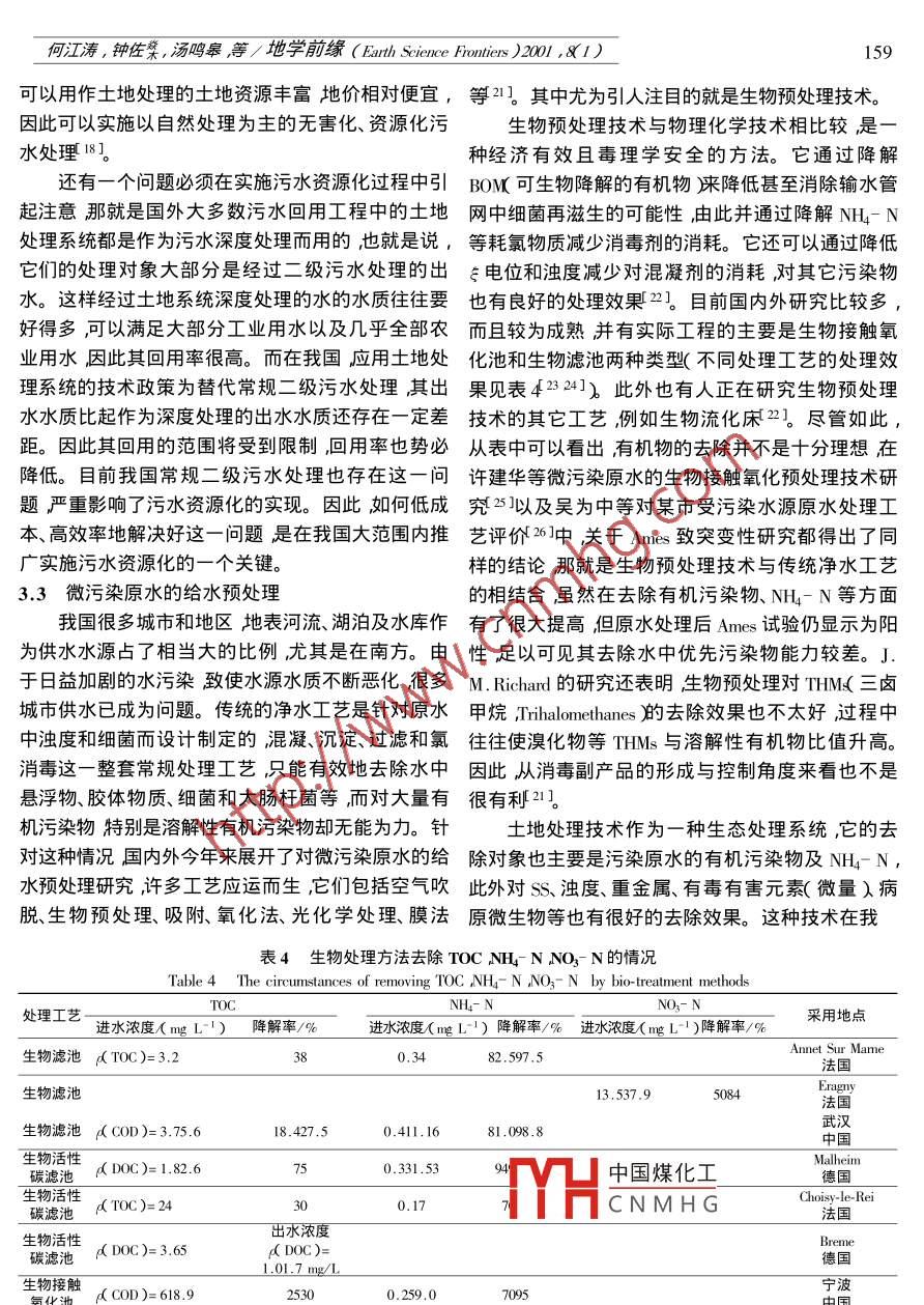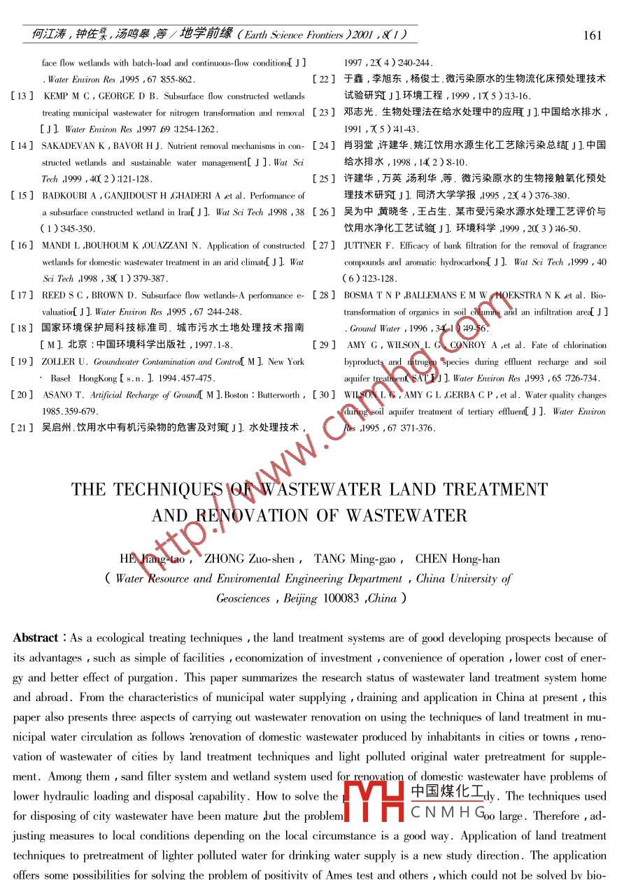 第8卷第1期地學(xué)前緣(中國地質(zhì)大學(xué)北京)Vol.8 No.12001 年3月Earth Science Frontiers ( China University of Geosciences Beijing )Mar.2001污水土地處理技術(shù)與污水資源化何江濤鐘佐湯鳴皋 陳鴻漢(中國地質(zhì)大學(xué)水資源與環(huán)境工程系北京1003 )摘要土地處理作為一種生態(tài)處理技術(shù)以其設(shè)備簡單、投資少、操作管理方便、能耗低以及凈化效果良好而具有廣闊的發(fā)展前景。文中系統(tǒng)總結(jié)了污水土地處理系統(tǒng)國內(nèi)外研究現(xiàn)狀結(jié)合當(dāng)前中國城市供、排水以及用水的特點提出了在城市水循環(huán)中應(yīng)用土地處理技術(shù)實現(xiàn)污水資源化的三個方向城鎮(zhèn)居民區(qū)生活污水資源化、城市污水土地處理資源化、微污染原水給水預(yù)處理。其中城鎮(zhèn)居民區(qū)生活污水資源化所采用的砂濾系統(tǒng)及濕地系統(tǒng)存在的主要問題是水力負(fù)荷低、處理能力低。如何解決這一問題是一個具有實用意義的研究方向。城市污水集中土地處理所采用的技術(shù)目前已經(jīng)比較成熟存在的問題是占地面積太大。因此必須根據(jù)各地區(qū)的實際情況,因地制宜地選用。應(yīng)用土地處理技術(shù)進(jìn)行微污染給水預(yù)處理是--個新的研究方向,它為解決生物預(yù)處理技術(shù)所不能解決的Ames試驗陽性提供了可能,同時也不失為--種廉價有效的方法。關(guān)鍵詞污水土地處理污水資源化中圖分類號:X52文獻(xiàn)標(biāo)識碼 :A文章編號 :005 2321( 2001 )010155 08水是人類生存的基本條件,又是國民經(jīng)濟(jì)的生已達(dá) 560600億m3其中80%以上的污水未經(jīng)處理命線。隨著人口和經(jīng)濟(jì)的增長,-方面人類對水的直接排入水域 90%以上的城市水域污染嚴(yán)重。全需求量和品質(zhì)要求越來越高另一方面水污染的范國因污染而不能飲用的地表水占全部監(jiān)測水體的圍和程度也越來越大這一對日益嚴(yán) 重的矛盾已成40% 流經(jīng)城市的河段中78%不適合作為飲用水為制約社會、經(jīng)濟(jì)和環(huán)境可持續(xù)發(fā)展的主要因素。源50%的地下水受到污染64%的人正在使用不合如何合理有效地解決這一問題,成為世界各國共同格的水源。因此水污染是造成多數(shù)城市缺水的重要關(guān)注的問題。原因。所謂污水資源化即將污水視為-種資源通過1污水資源化是 解決我國水資源短缺各種處理技術(shù) ,使其凈化達(dá)到某種用水標(biāo)準(zhǔn)從而實的必由之路現(xiàn)大部分凈化水的循環(huán)再利用,同時減少污水排放對環(huán)境造成的不良影響的這樣一個過程。 在解決水我國是世界上I3個貧水國家之一人均水量僅資源短缺的對策中應(yīng)當(dāng)將節(jié)水和污水資源化放到為世界人均水平的四分之一居世界 149個國家的首位。 通過節(jié)水可以減少不必要的浪費通過實施110位。目前在全國600多座建制市中,有400 座污水資源化 實現(xiàn)水資源的重復(fù)利用,從而緩解水資城市缺水其中缺水嚴(yán)重的城市達(dá)130 多個。全國源緊張問題。 所以筆者認(rèn)為污水資源化是解決我城市每年缺水60億m' ,日缺水量已超過1 600萬國水資源短缺的必由之 路。m3 ,且呈增長趨勢。事實上,很多地區(qū)不是沒有水,而是無可用之水。據(jù)水利部組織的全國6大流域的2中國煤化工在我國的發(fā)展前入河排污口抽樣調(diào)查推算,目前全國年排放污水量MYHCNMHG收稿日期2000-09- 28 ;修訂日期2000- 12- 22污水土地處理系統(tǒng)可以定義為利用土壤-微生基金項目國家自然科學(xué)基金資助項目( 49832005 )作者簡介:何江濤( 1974- )男 ,博士研究生,水文學(xué)及水資源物-植物系統(tǒng)的陸地生態(tài)系統(tǒng)的自我調(diào)控機(jī)制和對專業(yè),目前主要從事污水土地處理研究。污染物的綜合凈化功能處理城市污水及一些工業(yè)廢156何江濤,鐘佐菜,湯鳴皋等/地學(xué)前緣( Earth Science Frontiers )2001 ,81 )水使水質(zhì)得到不同程度改善實現(xiàn)廢水資源化與無為 飲用水和雜用水兩類。其中飲用水水質(zhì)要求達(dá)到害化的常年性生態(tài)系統(tǒng)工程1。土地處理作為生態(tài)飲用水標(biāo)準(zhǔn) 主要用途為飲用、盥洗和洗浴等。雜用學(xué)處理方法,實際上是追求土壤、含水層和植物的水水質(zhì) 要求較低主要用于廁所便器沖洗、居民區(qū)綠處理”與利用”兩個功能的總體實現(xiàn)。土壤被視為化、 洗車、掃除等。目前我國絕大部分城市的居民區(qū)“活的過濾器”作為工程系統(tǒng)進(jìn)行污水處理。污染物沒有 實現(xiàn)清污分流不管是飲用水還是雜用水全部在這-系統(tǒng)中通過物理的過濾吸附、揮發(fā)、淋溶、化以飲用水供應(yīng) 造成了水資源嚴(yán)重浪費。如果居民學(xué)的分解與轉(zhuǎn)化、植物的吸收與微生物的降解、吸收區(qū)的生活污水能夠就地處理實現(xiàn)中水回用補(bǔ)充部等作用由復(fù)雜變?yōu)楹唵?由大分子變?yōu)樾》肿佑芍卜蛛s用水 將可大量節(jié)約水資源避免浪費。目前,物、微生物不可利用變?yōu)榭衫谩⑽者M(jìn)行不斷的國內(nèi)中水處理工藝根據(jù)中水原水的水量、水質(zhì)和中更新和循環(huán)再生。從而實現(xiàn)污水的充分凈化和水、水使用要求等因素 ,可分為物化處理(優(yōu)質(zhì)雜排水和肥