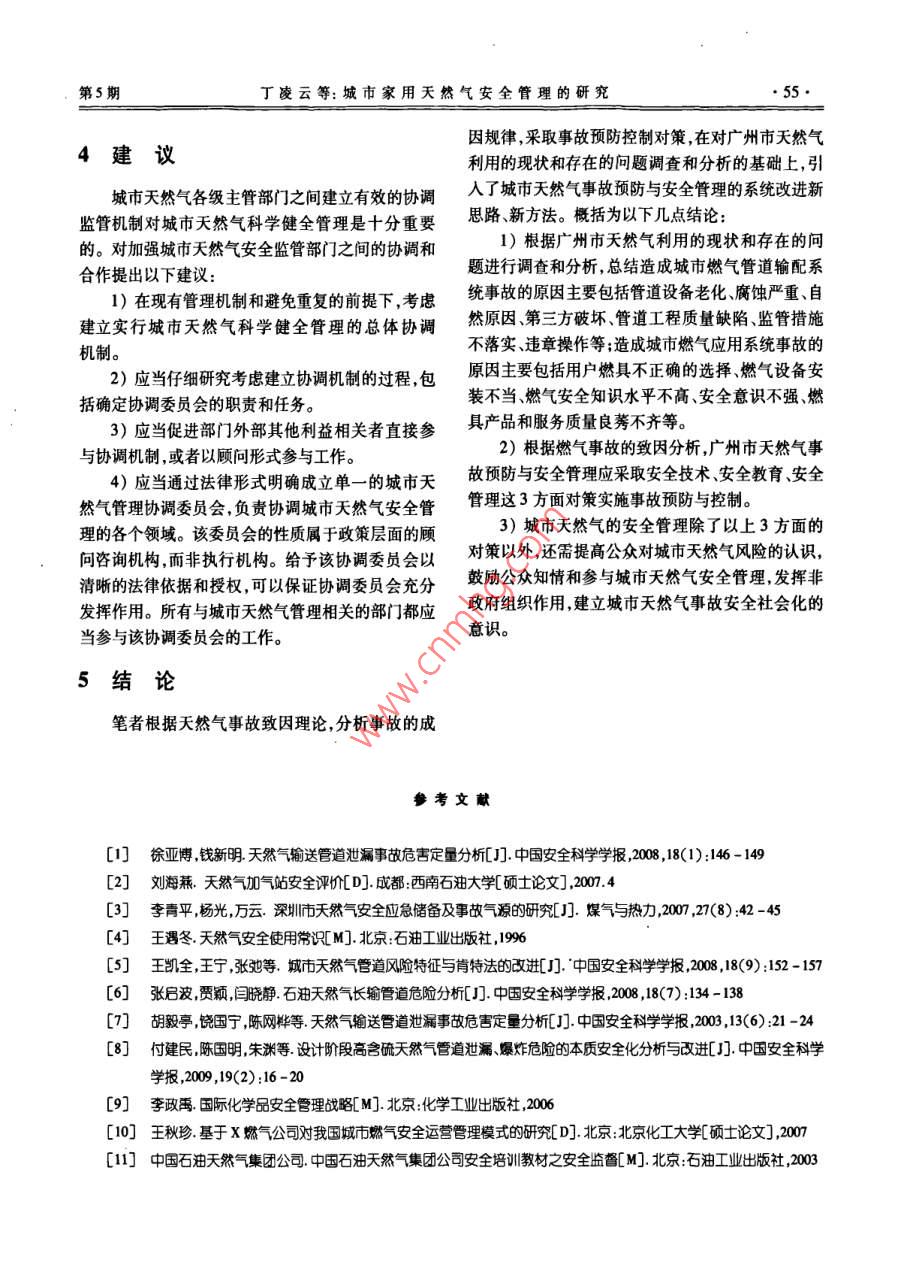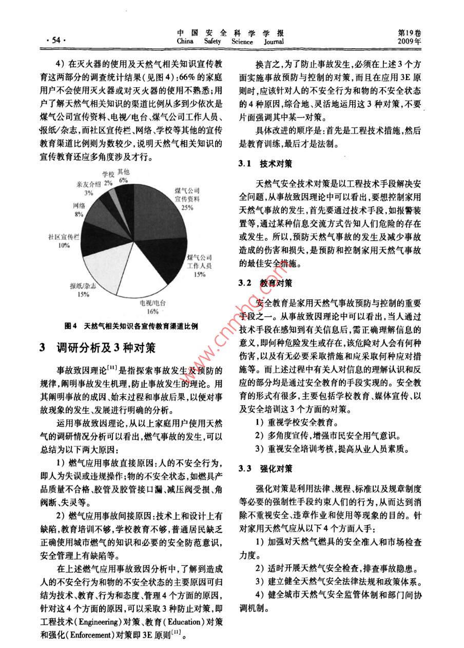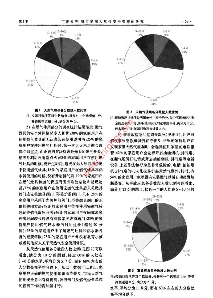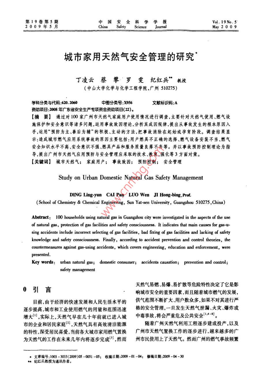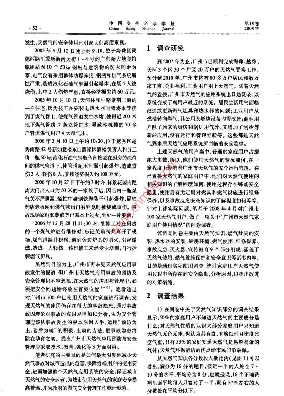 第19卷第5期安全科學(xué)學(xué)報Vol 19 No 52009年5月May 200 9城市家用天然氣安全管理的研究丁凌云蔡攀¨羅雯紀(jì)紅兵”教授(中山大學(xué)化學(xué)與化學(xué)工程學(xué)院,廣州510275)學(xué)科分類與代碼:620.2060中圖分類號:8956文獻(xiàn)標(biāo)識碼:A資助項目:1008年廣東省安全生產(chǎn)專項資金資助項目(22)?!菊客ㄟ^對100家廣州市天然氣家庭用戶使用情況進(jìn)行調(diào)查,主要針對天然氣使用、燃?xì)庠O(shè)施保護(hù)和安全意識等諸多問題,運(yùn)用事故致因理論,分析其成因規(guī)律,提出從事故發(fā)生的根本原因入手,運(yùn)用“預(yù)防為主、善后為輔”的積極、主動的方法,把事故消除在起始或孕育階段。調(diào)查結(jié)果顯示:造成城市燃?xì)鈶?yīng)用系統(tǒng)事故的原因主要包括:用戶燃具不正確的選擇、燃?xì)庠O(shè)備安裝不當(dāng)、燃?xì)獍踩R水平不高、安全意識不強(qiáng)、燃具產(chǎn)品和服務(wù)質(zhì)量良券不齊等。并以事故預(yù)防控制理論為指導(dǎo)提出廣州市天然氣應(yīng)用預(yù)防與安全管理應(yīng)采取的技術(shù)、教育、強(qiáng)化等3方面對策?!娟P(guān)鍵詞】城市天然氣;家庭用戶;事故致因;預(yù)防控制;安全管理Study on Urban Domestic Natural Gas Safety ManagementDING Ling-yun CAI Pan LUO Wen JI Hong-bing, Prof.School of Chemistry Chemical Engineering, Sun Yat-sen University, Guangzhou 510275, China)Abstract: 100 households using natural gas in Guangzhou city were investigated in the aspects of the useof natural gas, protection of gas facilities and safety consciousness. It indicates that main causes for gas-using accidents include incorrect selecting of gas facilities, bad fixing of gas facilities and lacking of safetyknowledge and safety consciousness. Finally, according to accident prevention and control theories, thecountermeasures against gas-using accidents, which covers engineering, education and enforcement, werepresentedKeydomestic consumer; accidents causation; prevention and control;safety management天然氣易燃、易爆、易擴(kuò)散等危險特性決定了它是影0引言響城市安全的重要因素,而且隨著城市燃?xì)獾陌l(fā)展,目前,由于經(jīng)濟(jì)的快速發(fā)展和人民生活水平的供氣范圍不斷擴(kuò)大用戶數(shù)眾多如果不對其進(jìn)行嚴(yán)逐步提高城市和工業(yè)使用燃?xì)獾挠昧亢头秶杆俑竦陌踩芾?一旦發(fā)生天然氣泄漏、火災(zāi)、爆炸或增大,實際上,天然氣早在幾十年前就已進(jìn)入城中毒事故將會嚴(yán)重危及公共安全市的企業(yè)和居民家庭2,天然氣具有高效清潔能源隨著廣州天然氣利用工程逐步建成投產(chǎn),以及的特性,深受居民喜愛,當(dāng)前各大城市家用燃?xì)庵脫Q廣州市天然氣置換工作的逐步進(jìn)行,越來越多的廣為天然氣的工作在未來幾年內(nèi)將逐步完成,然而州市民使用上了天然氣。然而廣州的燃?xì)馐鹿暑l繁·文章編號:1003-303(2009)05-0051-05;收稿日期:200-01-04;修稿日期:2000-04-30率紀(jì)紅兵教授為通訊作者。中國安全科學(xué)學(xué)報第19卷52·China Safety Science Journal009年發(fā)生天然氣的安全使用已引起人們高度重視。005年5月12日晚上約9:10,位于海珠區(qū)聚Ⅰ調(diào)查研究德西路匯源新街南大街1-4號的廣東新大塘賓館到2007年為止,廣州市已順利完成海珠越秀瓶組站因10個50kg鋼瓶與建筑物的防火間距為天河3個區(qū)30個片區(qū)20萬戶的天然氣置換工作,零電氣沒有采用整體防爆連接,鋼瓶和供氣系統(tǒng)腐預(yù)計到2010年,廣州市將有80多萬戶居民和數(shù)萬蝕嚴(yán)重,造成液化石油氣泄漏引起爆炸在場4人被家工商、公共福利、工業(yè)用戶用上天然氣。隨著天然燒傷,其中2人傷勢嚴(yán)重直接經(jīng)濟(jì)損失約60萬元。氣的置換,廣州市天然氣的應(yīng)用系統(tǒng)也日趨復(fù)雜該200年0月10日,天河林和中路紫判二街的系統(tǒng)變成了離用戶最近的系統(tǒng)。居民生活用氣面臨戶住宅,因為技工在安裝電熱水器時錯將水管接改造或更新燃?xì)庠罹吆蜔崴鞯膯栴}:工業(yè)用戶從到了煤氣管上使煤氣管道發(fā)生水堵使得近200米燃油轉(zhuǎn)向燃?xì)馄涔眉叭紵O(shè)備均需改造商業(yè)用地下煤氣管線、7條立管進(jìn)水,導(dǎo)致整棟樓的0多戶除了原來的廚房和鍋爐用氣外,又增加了制冷等戶管道煤氣用戶4天沒氣用。新的應(yīng)用沒有運(yùn)行和管理經(jīng)驗等。這些都是天然200年2月10日上午約10:20,位于越秀區(qū)越氣到來后天然氣應(yīng)用系統(tǒng)所面臨的安全隱患。秀南路42號新如意樓東山酒家因酒樓負(fù)責(zé)人和員工上述天然氣的用戶當(dāng)中,普通的家庭用戶占據(jù)將一瓶50kg液化石油氣鋼瓶私自接駁在廚房的洗消絕大多數(shù)所以,他們使用天然氣的情況如何,在間的供氣管道上,使管道超壓泄漏引起爆炸造成重定程度上影響著廣州市天然氣的安全運(yùn)行管理。在傷3人,輕傷8人,直接經(jīng)濟(jì)損失約100萬元。已置換天然氣的家庭用戶中,他們對天然氣使用的200年10月27日下午約3時許祥景花園內(nèi)距相關(guān)知識的了解程度如何使用過程存在哪些安全離大門出入口約S0米的一家餃子店,因店內(nèi)一瓶煤隱患使用后有無定期對燃具和燃?xì)庠O(shè)施進(jìn)行維修氣關(guān)不嚴(yán)泄漏慌忙中碰倒鐵腳凳子引起爆炸隔壁保養(yǎng),以及事故應(yīng)急安全知識的了解程度如何等等,藥店老板聞到煤