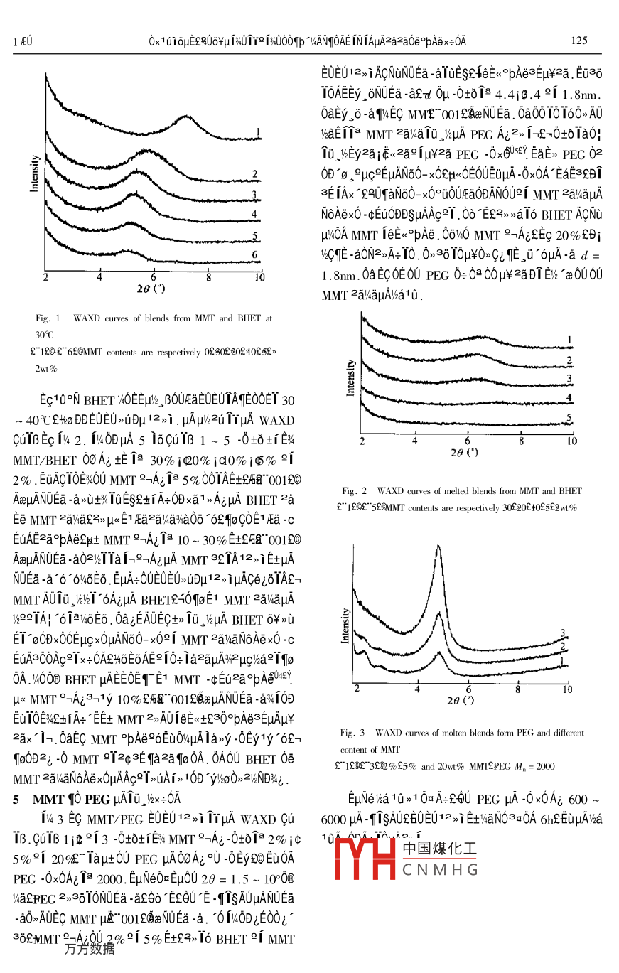 μ∪1EU。B-0x0?N8士No.12001 Ae 20AACTA POLYMERICA SINICAFeb. E-2001i° NDWiW0+" io%406¥μ19401r9 1400010 ryANqOAE N lAμA2a2a0e°pAex+0A *0x1i6 0A1u<**"0D1G-A0- ijENSNBWi0° H土N0 10025010%E AENTE"~MNT287a2a0epAeE AO%SI/xEa0Oqb "450¥BHEL-4i00”)4A百“PEGL@。β -0x0>i/2ax" 1eEaNTAEAx。°2Y2AATμAOE土。0f x-EaTBNUEa0CμA1 |AE國40kV/140mAfD)s/Rs/SsμAOxOUx0E>/c”a0UμAO> Aazax"1eEaNT. EU%4BODNo= 1/6*/0. 15/1/6*.AexOE}》》>D010D0/heOEODμAiEAE6DO.0U2a2 MMT 0e BHET >UDμ12>ix"1EaNTODAE IN1AECE1OAvTEOeμAO00. EoμANgMMT 0e BHET NDA$91EOEUi→μA>UDμ12>;iε6C°01μ0EA/2a Sij3O EAAxe ia0D/avD0>2a Aliθ"OH2O -0+00U3εTAei BHET EOμa00ET 30 ~ 40C TANoODD°EAaiaxe3E. 348903E/DDuUuOA 2aAUODES0aμxO1ouA. A00A WAXD 2aI"。+0012i 1r00 MMT 2a%a%aE1Ea”0 , °ug°EC6u0e2avaμAxOOENoAex0 Na+ iK+ ic uAta>~.Ca2+ iMg2+ uE Tμ%μe Eh°alt30a00 laμAμg0D 3 MMT 0e PEG μAE0E012>iD0.MMTT 0e PEG μAEOEU12>iEC0U_ B0U PEC EOEUA0OAAEINMAμANδAe xOE1%>>》ioDork<00>u口TAE 30 ~ 40CμACe ioTA2《IpOBOU>UDUμ/zAeTAXkoAex02a2a1A>o- 0|μ¥iazaEe MMT 2avat61EazaYaD12>i. EuμA2u1TA0OA WAXD 2a"12>i 1T0D MMT4a8A "6f子c 0o40Fa 0U- 0| iaTμ0DμAAOE6D0&&12aV%a84aμAta- .MMT 00-0| 1aTμ0D°pAeiθ0μ¥2a>δEy2E~ YVEC nm 4 MMT 1u y冷BHET 9[ MMT μA2aopAe3B^cEOOEφOUw09TTY>i iaO@ODfDT3EAEAx . °2zABHET ECqOHY%{Ip)/x Ea0e0Olp "4μA.-0|20172-AT. 0aECA0A2a2ay409TOE土_ 0O>u_1P>uAEAx. ,-2Y2AEC PET μAμi -0x0AiEe401Y . /Ea0e MMT 3εTANDA¥ATμADi3E>UAfU1~3PY12>i. [%41 [22> 1-00AiEμA MMT 0e BHET 0∪3γTAMMT q00o>DON090r9r- >fceyU TτOθGiAOμATA>uDμ12,i∩ημA WAXD 6u 20 = 2~ 10μAGuTB.0U1u。/hx=0AE6u i-Nuε00o 6 MMT μuAzavawa&60A'EE“Ae -9TSAUOD MMT μ8"001Q@xe i00-NUEa -a.E1Ea -Eu2aopAe. 0o ”EEia1OAEOEt, ,0D>u.1p >uAEiE"1y Bragg 1 [34349T.d.1n40OuAGuTB 1個(gè)”i MMT"EDEOEiE-E?aT"C個(gè)0E"EεE%4OEMMT μuAza2a9jpAeECOF+,_ ,B -0x0Vo0O>2/。EOTEOGuTB 2~ 6 -0+0tiE%4 MMT/BHET 00>i/AE INIA?!?I2AATμAEx0@uμA114E610/%U EuECEμTOAi士E≥30% iQ0% j40% iσ%2i 2% . EuACTOE%412AENIA0U. B -0x0>01aOD TU1%AEAx -0Ec9i0e, β -0x0>i10D MMtT"0OlEaxe 100+ -a14301000 20<6°. 2φ>uia0>Uha9UμAO0O@ND%jAUEY.E' i MIMT μ001@aqμAWkGEDi. oaTqxA BHET 0e .4TAI"1yNDWjOU>uDμ°fEEμAx+0ATA MMT 90MMTVE10U32TATA1ii-NDA¥12>i2θ2EYOxt>Tu_。4BHET91 PEG μATu ,hkx+0A.10A0AEEuACri MMT 2a60 MMT 2ay4a£61 Fa2)%aa00 6.CullB 2~ 6 μuAtam-2a0epAex+0A9[>uAi .TOE%26exA BHET 0D MMT μA9-Ai 0 2% 00/¥06%012AAT°1OGE+E士20 0200/¥E03-”6%C作-mhTo0ET9e, βi10δ1¥士必EμN(yùn)eEu0AμA Na-AE N lASraNoAe x0/%> >>Ya' 6.02341EGEμfMMT 2awa1u ,/2 BHET μAAε -021/4/0Ai e 90mequiv/100g2但300 ~ 400 Ai -0x' jAAEEpf i +A A3C個(gè)TAcou 2>A01eETu。%. +iPEG》NS i M。= 600i 4500i2000i 6000f0)/ Max-rAi0.IYH.CN M H CruμAUu_AECOIuA* 199.1116 E的0.20000-22 P . aw0xOE* iENSNSjh&xEUuCTAq >i%b2A 598730219*** F~MA*IμE1241EUOx 1016μE2906¥μ1401τ9 [00 "VANqOAE IN1AμA2a2a0e opAex-OA125E0EU12>" iACNuNOEa . aTdEsEHeE i→E-0t0Ta0!1u. /&Ey2aj<2a9iμ¥za PEG -0xGO5Y? EaE> PEG 0220D°o_ 9μc∈EμAN60_ xOEHx >a16 BHET ACNup1%OA MMT leEA+ T0. 0>3010μ¥0>Ci_ ,0 °6μA-a d=1. 8nm.0aEGOEOU PEG 0+ 02 00μ¥2aDiEh2”a0u0020()MMT 2aV4aμAva10.Fig. 1 WAXD curves of blends from MNT and BHET at30CE"1E@C" 62@MMT contents are respectively 02802202 40E5E>J22wt%Ec100N BHET 40Eqμ%, BOUEaEOEUTATEOOET 30~ 40CE4O DDEDOEU>uDμ12i . μAμ/k2uTYμA WAXDCuTBEc [%4 2. 1%40DμA5 ioGuTB 1~ 5 -00tiE%420(")MMT/BHET 00Ai E個(gè)@ 30% i20% id0%i5% 2[2% . EuACTOE%600 MMT 9-AjTE 5% 001AE土568~001E0Fig. 2 WAXD curves of melted blends from MMT and BHETAayμANOEa -a>∪+%T0∈SE+1A=0Dxa1>AiμA BHET 2a"1E0C”5&@MMT contents are respectively 30220E#0LSE2wt%Ee MMT 2a1afZ>> μi EtμANOEa-a"6 6(6E6 EμA+OUEOEU>GDμ12rjμACeε0TAE→MMT A01u。%經(jīng)°6AεμA BHETEEOIoE1 MNT 2avaμAV6991A!°61≌v6E6 .0ajEAUEC+>個(gè)o ,%uA BHET 6¥>心ET o0Dx00Eμc x0μAN60- x0i MMT 2aN4aN6Aex0-cEuA300Ac9Tx-0AE%6E6AE910= ia2aμA%2μgWa9Iηρ0A./400@ BHET μAEEOEC~E1 MMT -CEuza°pAE4EYTtμ< MMT 9-Ai3-1y 10% f88"0012TeuANOEa -a%TOD20 ()EcT0E%4E+iA=' E仕MMT 2>A0 ieEuA1>10D Ylho0o>2%/NDWi.5 MMT 90 PEG uATu ,lx+OAEμN(yùn)e)a 10>1 0A+20U PEG μA -0x0Ai 600 ~1%43 EC MMT/PEG E0E012>iTTμA WAXD Cu6000 μA -9iSAU&60E012>>i E士%aNOa0A 6h&EuμAWaTB . CuTB 1ie9i3 -0t土iE% MNT9-Ai -0t01β 2% ic中國煤化工5%2i 20%2Taμ400 PEG μA00Ai叫-0Ey£@ EuOAPEG -0x0Ai個(gè)@ 2000. EμN(yùn)e0x∈μ0∪2θ= 1.5~ 100目YHCNMHGVafPEG 2>3610NUEa -asθo”E20U 'E -9TSAUμANUEa-aO>AUEC MNT μ~ 001aNOEa -a.0140DiE00;°36EMMT 9-Ai0U.2%9f 5% E+E2>T6 BHET9f MMT萬月數(shù)據(jù)1260NS+2001 AeREFERENCESKojime YEtUsuki AEKawasumi MEOkada AfKurauchi TEKannigato 0. Jouranl of Polymer ScienceEPart AfPolymer Chemtisty£t99323129755 ~ 17582 Usuki AEKoiwai AEKojime YEKawasumi MEOkada AEKurauchi TEKanigato 0. Joumnal of Applied Polymer Science£+995855919~ 1233 Zhang Guoy& 0A10