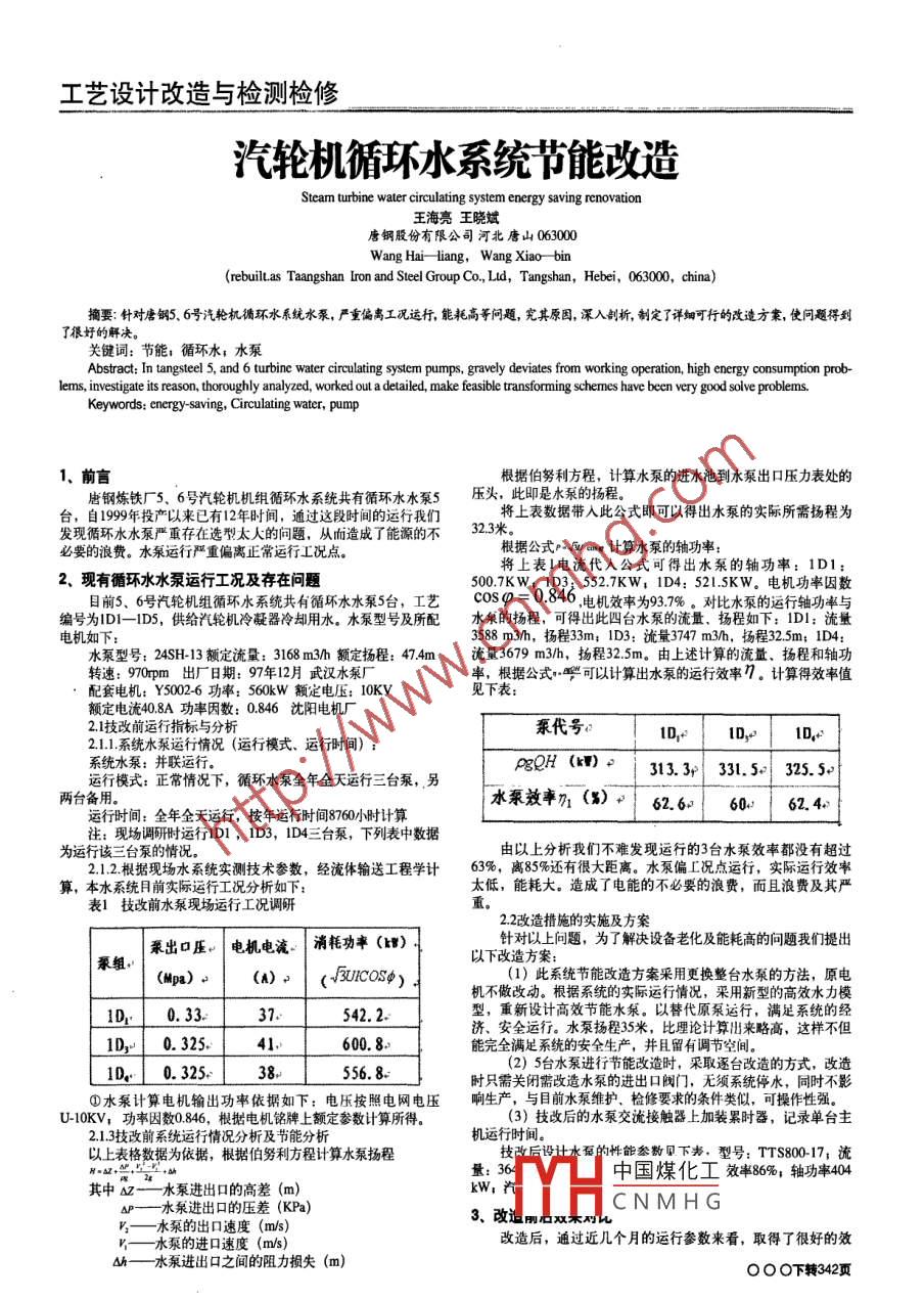 工藝設(shè)計(jì)改造與檢測(cè)檢修汽輪機(jī)循環(huán)水系統(tǒng)節(jié)能改造Steam turbine water circulating system energy saving renovation王海亮王曉斌唐鋼股份有限公司河北唐山0630000Wang Hai- liang, Wang Xiao- tin(rebuiltas Taangshan lron and Steel Group Co, Ld, Tangshan, Hebei, 063000, china)摘要:針對(duì)唐鋼5.6號(hào)汽輪機(jī)循環(huán)水系統(tǒng)水泵,嚴(yán)重偏離工況運(yùn)行,能耗高等問題,究其原因,深入剖析,制定了詳細(xì)可行的改造方案,使問題得到了很好的解決。關(guān)鍵詞:節(jié)能,循環(huán)水水泵Abstract: In tangsteel 5, and 6 turbine water cirulaing system pumps, gravely deviates from working operation, high energy consumption prob-lems, investigate its reason, thoroughly analyzed, worked out a detailed, make feasible transforming schemes have been very good solve problems.Keywords: cnergy-saving, Circulating water, pump1,前言根據(jù)伯努利方程,計(jì)算水泵的進(jìn)水池到水泵出口壓力表處的唐鋼煉鐵廠5.6號(hào)汽輪機(jī)機(jī)組循環(huán)水系統(tǒng)共有循環(huán)水水泵5將上表數(shù)據(jù) 帶入此公式即可以得出水泵的實(shí)際所需揚(yáng)程為壓頭,此即是水泵的揚(yáng)程。臺(tái),自1999年投產(chǎn)以來已有12年時(shí)間,通過這段時(shí)間的運(yùn)行我們32.3米。發(fā)現(xiàn)循環(huán)水水泵嚴(yán)重存在選型太人的問題,從而造成了能源的不必要的浪費(fèi)。水泵運(yùn)行嚴(yán)重偏離正常運(yùn)行工況點(diǎn)。根據(jù)公式P-面cme計(jì)算水泵的軸功率:將上表1電流代人公式可得出水泵的軸功率: 1D1:2、現(xiàn)有循環(huán)水水泵運(yùn)行工況及存在問題COsφ= 0.846,500.7K W;552.7KW, 1D4: 521.5KW.電機(jī)功率因數(shù)目前5.6號(hào)汽輪機(jī)組循環(huán)水系統(tǒng)共有循環(huán)水水泵5臺(tái),工藝.電機(jī)效率為93.7%。對(duì)比水泵的運(yùn)行軸功率與編號(hào)為1D1-1D5,供給汽輪機(jī)冷凝器冷卻用水。水泵型號(hào)及所配水泵的揚(yáng)程,可得出此四臺(tái)水泵的流量.揚(yáng)程如下: lDI:流量電機(jī)如下:3588 m3/h,揚(yáng)程33m; ID3: 沈量3747 m3/h,揚(yáng)程32.5m; 1D4:水泵型號(hào): 24SH-13額定流量: 3168 m3/h額定揚(yáng)程: 47.4m流量3679 m3/h,揚(yáng)程32.5m。 由上述計(jì)算的流量、揚(yáng)程和軸功轉(zhuǎn)速: 970rpm出廠 日期: 97年12月 武漢水泵廠串,根據(jù)公式.等可以計(jì)算出水泵的運(yùn)行效率7。計(jì)算得效率值配套電機(jī): Y5002-6 功率: 560kW 額定電壓: 10KV見下表:額定電流40.8A功率因數(shù): 0.846沈陽電機(jī)廠2.1技改前運(yùn)行指標(biāo)與分析泵代號(hào):1D,2.1.系統(tǒng)水泵運(yùn)行情況(運(yùn)行模式、運(yùn)行時(shí)間) :系統(tǒng)水泵:并聯(lián)運(yùn)行。PgQH (kW) 。313. 3p331.50 325. So運(yùn)行模式: 正常情況下,循環(huán)水泵全年全天運(yùn)行三臺(tái)泵,,另兩臺(tái)備用。|水泵效率勿(%)。62.606062. 4+>運(yùn)行時(shí)間:全年全天運(yùn)行,按年運(yùn)行時(shí)間8760小時(shí)計(jì)算注:現(xiàn)場(chǎng)調(diào)研時(shí)運(yùn)行1D1,1D3, 1D4三臺(tái)泵,下列表中數(shù)據(jù)為運(yùn)行該三臺(tái)泵的情況。由以.上分析我們不難發(fā)現(xiàn)運(yùn)行的3臺(tái)水泵效率都沒有超過2.1.2.根據(jù)現(xiàn)場(chǎng)水系統(tǒng)實(shí)測(cè)技術(shù)參數(shù),經(jīng)流體輸送工程學(xué)計(jì)63%, 離85%還有很大距離。水泵偏上況點(diǎn)運(yùn)行,實(shí)際運(yùn)行效事算,本水系統(tǒng)月前實(shí)際運(yùn)行工況分析如下:太低,能耗大。造成了電能的不必要的浪費(fèi),而且浪費(fèi)及其嚴(yán)表1技改前水泵現(xiàn)場(chǎng)運(yùn)行工況調(diào)研重2.2改造措施的實(shí)施及方案泵出口壓。|電機(jī)電流~ |消耗功率(Hw)以下改造方案:針對(duì)以上問題,為了解決設(shè)備老化及能耗高的問題我們提出泵組。(Mpa) 2 .(A)。( J3uICOS4)(1)此系統(tǒng)節(jié)能改造方案采用更換整臺(tái)水泵的方法,原電機(jī)不做改動(dòng)。根據(jù)系統(tǒng)的實(shí)際運(yùn)行情況,采用新型的高效水力模1Dr0. 33.37.542. 2.型,重新設(shè)計(jì)高效節(jié)能水泵。以替代原泵運(yùn)行,滿足系統(tǒng)的經(jīng)濟(jì)、安全運(yùn)行。水泵揚(yáng)程35米,比理論計(jì)算出來略高,這樣不但1D30. 325.41.00. 8.能完全滿足系統(tǒng)的安全生產(chǎn),并且留有調(diào)節(jié)空間。(2) 5臺(tái)水泵進(jìn)行節(jié)能改造時(shí),采取逐臺(tái)改造的方式,改造1D.0. 325;38p56.8.時(shí)只需關(guān)閉需改造水泵的進(jìn)出口閥門,無須系統(tǒng)停水,同時(shí)不影①水泵計(jì)算電機(jī)輸出功率依據(jù)如下:電壓按照電網(wǎng)電壓響生產(chǎn),與目前水泵維護(hù)、檢修要求的條件類似,可操作性強(qiáng)。U-10KV,功率因數(shù)0.846, 根據(jù)電機(jī)銘牌上額定參數(shù)計(jì)算所得。(3)技改后的水泵交流接觸器上加裝累時(shí)器,記錄單臺(tái)主2.1.3技改前系統(tǒng)運(yùn)行情況分析及節(jié)能分析機(jī)運(yùn)行時(shí)間。以上表格數(shù)據(jù)為依據(jù),根據(jù)伯努利方程計(jì)算水泵揚(yáng)程技改后設(shè)計(jì)水泵的性能參數(shù)見下去,型號(hào): TTS800-17;流量: 36中國(guó)煤化工效率86%;軸功事404其中Az-- -水泵進(jìn)出口的高差(m)kW;¥sP- -水泵進(jìn)出口的壓差(KPa)MHCNMHG3、改造剛口x術(shù)對(duì)兒水泵的出口速度(m/s)-水泵的進(jìn)口速