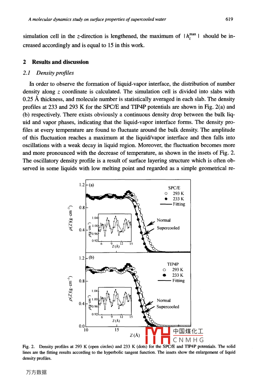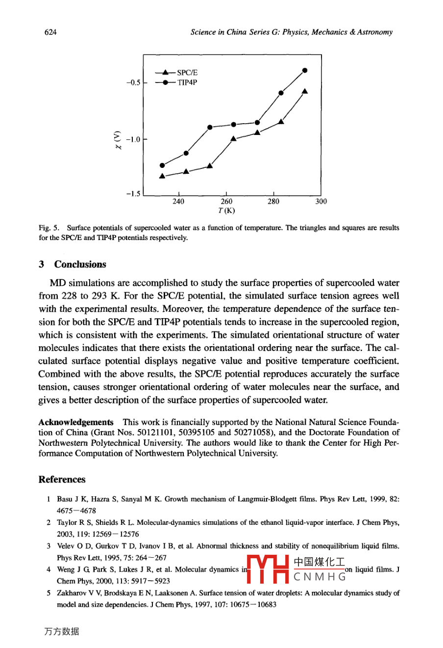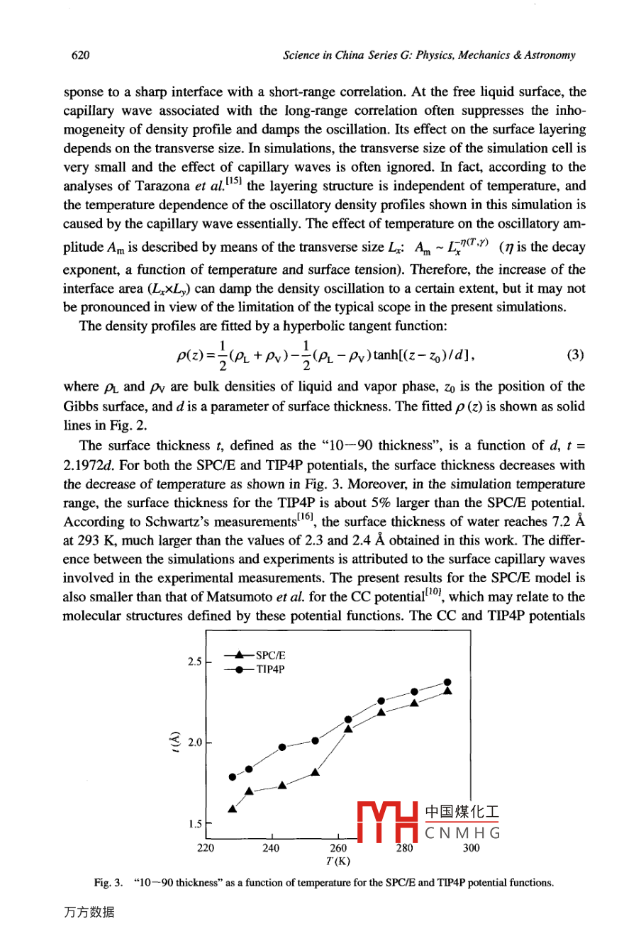 616Science in China Series G: Physics, Mechanics & Astronomy 2006 Vol.49 No.5 616- -625DOI: 10.1007/s11433-006 2019-6A molecular dynamics study on surfaceproperties of supercooled waterL0 Yongjun & WEI BingboDepartment of Applied Physics, Northwestern Polytechnical University, Xi'an 710072, ChinaCorrespondence should be addressed to Wei Bingbo (email: bbwei@ nwpu.edu.cn)Received May 10, 2005; accepted July 14, 2006Abstract Molecular dynamics simulations were performed to study the surface proper-ties of water in a temperature range from 228 to 293 K by using the extended simple pointcharge (SPC/E) and four-site TIP4P potentials. The calculated surface tension increaseswith the decrease of temperature, and moreover the slopes of the surface ten-sion-temperature curves show a weak rise below 273 K, whereas no obvious anomaliesappear near 228 K, which accords with the previous experiments. Compared with themeasured values, the SPC/E potential shows a good agreement, and the TIP4P potentialunderestimates the surface tension. The main reason for that may be the reasonable de-scription of the surface structure of supercooled water for the SPC/E. When simulating theorientational distributions of water molecules near the surface, the SPC/E potential pro-duces higher ordering and larger surface potentials than the TIP4P potential.Keywords: surface tension, supercooled water, molecular dynamics simulation.Liquid-vapor interface has aroused wide research interest in experimental and theo-retical fields in recent several years because of its importance in physics, biology andenvironmental sciencel- 5. As a transition phase between the two bulk systems, liq-uid-vapor interface displays different physical and chemical properties. In particular, Wa-ter, the most popular liquid in nature, has especially large surface tension compared tosome simple liquids owing to the hydrogen-bonding structure at the surface. Therefore,the better understanding of thermodynamic and dynamic properties associated with liq-uid-vapor interface requires a molecular-level investigation of surface structure.Molecular dynamics (MD) simulation is one of the effective methods to study interfa-cial phenomena in molecular level. In the past decade, the surface properties of waterhave been subjected to extensive investigation by MD method using various interactionpotentials7- 9. Guissani and Guillot studied the liquid vanr cnexistence curve of SPC/Bwater and discussed the relationship between中國煤化工:rater moleculesand the slope of the liquid-vapor coexistence curHCNMHGtedthesufacetension and surface potential of water at 325 K for the TIP4P model8l. The correctedwww.scichina.com www.springerlink.comA molecular dynamics study on surface properties of supercooled water617value of the surface tension is 59 mNm , which is 13% smaller than the experimentalresults. And the calculated surface potential has reasonable magnitude but opposite sign.Alejandre et al.!9l investigated the liquid vapor equilibrium of water in the range of 316一573 K by using the SPC/E model with the Ewald sum. The simulated surface tensions arein good agreement with the experimental results, which suggests that the SPC/E model is amore effective potential function for studying the liquid vapor interface of water.It is noted that most studies on the surface properties of water concentrate on hightemperature region, and less attention is paid to supercooled water. Although Matsumotoand Kataokalu studied the surface properties of water in a wide temperature range from250 to 400 K with MD method, including surface tension, surface excess energy andorientational structure near the surface, the simulated surface tensions are 50% smallerthan the experimental values, and moreover, the specific surface entropy Ss(s。=-dy/dT, γis the surface tension, T the temperature) diminishes monotonouslywith the decrease of temperature in the supercooled region, which is contradictory to theexperimental results by Floriano et al.". Floriano et al.'measured the surface tensionof water using a small-sample capillary rise method down to 245.8 K and the resultsshowed that s is inclined to increase below 273 K. Therefore, it is necessary to investi-gate the surface tension of supercooled water in detail.In this paper, we report a study on the surface properties of supercooled water down to228 K with a classical MD method, and the behaviors of the surface tension and surfacestructure in the supercooled region are discussed.1Simulation methodDuring the simulations, the SPC/E and 4 site TIP4P potential functions are utilized.The interaction between two water molecules is a combination of Lennard-Jones 6-12potential function and Coulomb potential:U(n)=4ejt qi9j.(1])where r;j is the distance between atom i and j in two different molecules; qi and qj are thecharges of atom i and j; Ej and σj are Lennard-Jones parameters. The potential parame-ters for the SPC/E and TIP4P models are given in Table 1.Table 1 Molecular potental parameters for the SPC/B and TIP4P potential functios12,13)SPCETIP4ProH(A)0.9572∠HOH (deg)109.47104.52σ(A)3.1663.154E(kJ-mor)0.65020.6481go (e)-0.8746中國煤化工9(e)0.4238MHC NMH Goqm(e)roM (A)0.15618Science in China Series G: Physics, Mechanics & AstronomyThe simulation domain is schematically shown in Fig. 1. Periodical boundary condi-tions are applied in the three coordinate directions. The simulation system consists of 512.water molecules. The simulation is performed with a time step of 2.5 fs, and the simula-tion temperature ranges from 228 to 293 K. The short-range potential cutoff is 9.8 A. Ateach temperature, the bulk water system without liquid-vapor interface is equilibrated atfirst and then the z dimension of the simulation cell is increased to 100 A in order to formtwo liquid-vapor interfaces. The new system is equilibrated in a NVT ensemble rangingfrom 10 to 5x10' time steps with the decrease of simulation temperature. The productionruns of 10’