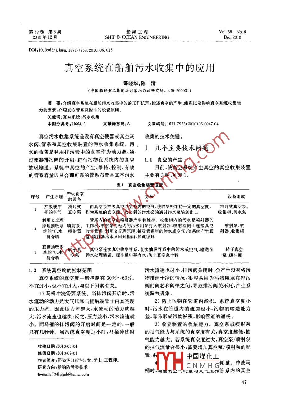 第39卷第6期船海工程Vol. 39 No. 62010年12月.SHIP & OCEAN ENGINEERINGDec. 2010DOI: 10.3963/j. issn. 1671-7953. 2010. 06. 015真空系統(tǒng)在船舶污水收集中的應(yīng)用邵曉華,陳清(中國船舶重工集團(tuán)公司第七O四研究所,上海200031)摘要:介紹 真空系統(tǒng)在船舶污水收集中的的工作機(jī)理,論述真空的產(chǎn)生、維系以及影響真空系統(tǒng)收集能力的因素,介紹真空管系及附件的設(shè)置原則。關(guān)鍵詞:真空系統(tǒng);污水收集中圖分類號:U664.9文獻(xiàn)標(biāo)志碼:A文章編號:1671- 7953(2010)06-0047-04真空污水收集系統(tǒng)是設(shè)有真空便器或真空灰收集的技術(shù)關(guān)鍵。水閥、管系和真空收集裝置的污水收集系統(tǒng)。污1幾個主要技術(shù)問題水的收集是利用排污管中的真空作為動力源,通.過便器排污閥的開啟,進(jìn)行污物在系統(tǒng)內(nèi)的真空1.1真空的產(chǎn)生抽吸輸送。系統(tǒng)中真空的產(chǎn)生、維持、控制、有效目前,使真空系統(tǒng)產(chǎn)生真空的真空收集裝置的管系容量以及合理可靠的管系布置是真空污水主要有3種,見表1。表1真空收集裝置設(shè)置序號產(chǎn)生原理產(chǎn)生真空.方法設(shè)備組成的設(shè)備抽吸緩沖滑片式 由 真空泵抽吸真空收集柜內(nèi)的空氣.使收集柜維持- -定的真空度,滑片式真空泵、柜的空氣真空泵 作為系統(tǒng)的真空源。 收集到的污水必須通過污水泵輸送出去收集柜、污水泵.利用文丘理管系內(nèi)的貞空由噴射器產(chǎn)生和維持。收集柜內(nèi)的污水是噴射器的原理抽吸系噴射泵、T作水.噴射泵將柜內(nèi)的污水用泵打入噴射器.噴射器側(cè)面連接真空噴射泵、噴統(tǒng)的氣.水噴射器 收集管 系,利用文丘理原理,抽吸管系里的污水或空氣,使系統(tǒng)產(chǎn)生真射器 、收集柜混合物空,噴射器出水又回到柜內(nèi),如此循環(huán)直接抽吸系轉(zhuǎn)子真真空泵連接真空收集管系.直接抽吸管系中的污水或空氣,輸送至轉(zhuǎn)子真空空泵污水處理裝置。 緩沖罐中存有水,防止真空泵f轉(zhuǎn)泵、緩沖罐1.2 系統(tǒng)真空度的控制范圍污水流速也過小,排污閥關(guān)閉時,會產(chǎn)生沒有將污真空系統(tǒng)的真空度一般控制在30% ~60%.物排泄十凈的情況,很容易因?yàn)槲畚镒枞谂盼鄄灰诉^小,也不宜過大,與以下因素有關(guān)。閥的閥芯和閥壁之間,導(dǎo)致排污閥關(guān)不死,產(chǎn)生系1)馬桶沖洗需要系統(tǒng)。當(dāng)排污閥開啟時,污統(tǒng)漏氣現(xiàn)象。水流動的動力是大氣壓和馬桶后端管子內(nèi)真空度2)防止污物在管道內(nèi)淤積。系統(tǒng)真空度小的壓力差。因此壓力差越大,水流動的動力就越時,污水在管道內(nèi)的流速也小,污物的輸送能力大,污水流速也越快;反之,壓力差小,污水流速就差,容易形成污物淤積,影響管道的通暢。小。而馬桶的排污閥的開啟時間是一定的,一般3)收集裝置的收集能力。真空泵或噴射泵只有幾秒鐘。當(dāng)系統(tǒng)真空度過小時,馬桶沖洗時的抽氣能力與系統(tǒng)的真空度有關(guān),真空度越低,抽氣能力越大。若系統(tǒng)真空度過大,真空泵/噴射泵收稿日期:2010-06-04的抽氣流最會很小,需要增加真空泵/噴射泵的配修回日期:2010-07-01置,系中國煤化工作者簡介:邵曉華(1977-).女,學(xué)士.工程師。研究方向:船舶防污染技術(shù)[HCNMHG三耗量。沖洗馬桶時,與傭的空七化重與入氣壓和管系內(nèi)的真空E-mail; 704hjgcb@ sina. com47第6期船海工程第39卷壓力差有關(guān),真空度低時,空氣耗量小,真空度高真空調(diào)節(jié)量的計算公式如下:時,空氣耗量大。若系統(tǒng)真空度大于60%時,馬Vz=VX30%(2)桶的空氣耗量將成倍增加,提高了真空泵/噴射泵式中:V:-系統(tǒng)真空調(diào)節(jié)量;的抽氣要求。30%--系統(tǒng)真空度從 60%下降到30%的5)控制馬桶沖洗時產(chǎn)生過大的噪聲。真空差值;度越大馬桶沖洗時動能越大,同時產(chǎn)生的噪聲也V一系統(tǒng)真空容量,L,V= V系+V器越大,所以需控制系統(tǒng)的真空度不大于60%。其中:V省系管系的容積,L;1.3 系統(tǒng)真空容A適配性Vsm-真空 容器的容積,L。真空系統(tǒng)的收集能力主要與真空泵、噴射泵②同時起動馬桶次數(shù)。是指在較短的時間抽吸空氣的能力有關(guān);真空系統(tǒng)的運(yùn)行穩(wěn)定性與內(nèi)(一般為3~5 s)同時按下馬桶的數(shù)量。其設(shè)置收集系統(tǒng)的管系容量有關(guān),管系容量越大,真空系值參見表2。.統(tǒng)運(yùn)行越穩(wěn)定。表2系統(tǒng)內(nèi)同時起動馬桶次數(shù)的設(shè)置值真空收集系統(tǒng)的真空建立能力的確定,需從系統(tǒng)馬桶總數(shù)/只5~15 15~30 30~50兩個方面進(jìn)行評估。同時起動馬桶次數(shù)n/次1)小時高峰負(fù)荷真空建立能力。定義:小時高峰負(fù)荷真空建立能力需滿,1 h內(nèi)真空系統(tǒng)的當(dāng)V:≥nV1時,可保證真系統(tǒng)的真空度維系抽氣能力(q)大于小時高峰耗氣量(Q),即q>Q。在一個較為穩(wěn)定的環(huán)境下,有利于馬桶的良好使用。在不同的同時起動馬桶次數(shù)要求下,系統(tǒng)真高峰時耗氣量Q的計算公式如下:Q=nV:+n2V2+nzV3(1)空調(diào)節(jié)容量參見表3。式中:m-高峰時段的馬桶使用次數(shù),一般為全表3系統(tǒng)真空調(diào)節(jié)容t系統(tǒng)的使用人數(shù);n/次34V一使用- -次馬桶的耗氣量,L/次,一般V/L300~400 450