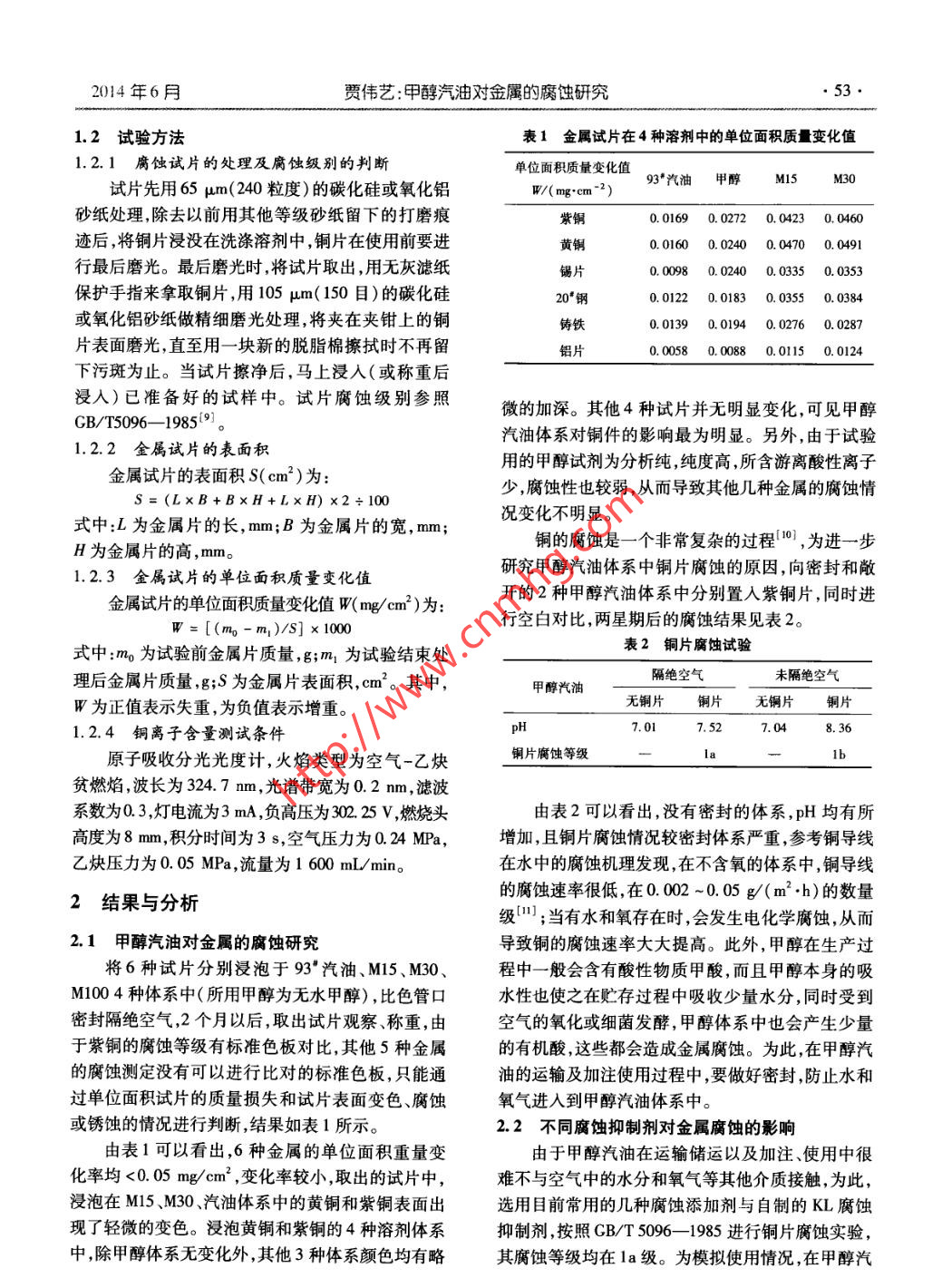 June 2014現(xiàn)代化工第34卷第6期52●Modern Chemical Industry2014年6月御研與開(kāi)潑甲醇汽油對(duì)金屬的腐蝕研究賈偉藝12(1.開(kāi)灤煤化工研發(fā)中心,河北唐山063611;2.河北省煤基材料與化學(xué)品工程技術(shù)研究中心,河北唐山063018)摘要:研究了在未添加腐蝕抑制劑的條件下,甲醇、汽油、M15和M30甲醇汽油4種體系對(duì)6種不同金屬的腐蝕情況,同時(shí),考察了環(huán)境因素對(duì)金屬試片的腐蝕情況。結(jié)果表明,甲醇汽油對(duì)20*鋼、鋁片、鑄鐵、錫片的腐蝕影響不大,對(duì)黃銅、紫銅有一定的影響。 環(huán)境中水和空氣的進(jìn)入增大了燃料對(duì)銅件的腐蝕能力。鑒于此,有針對(duì)性的研制了- -種腐蝕抑制劑,能有效抑制甲醇汽油對(duì)銅件的腐蝕能力。關(guān)鍵詞:甲醇汽油;腐蝕;原子吸收;金屬中圖分類(lèi)號(hào):U473.1文獻(xiàn)標(biāo)志碼:A文章編號(hào):0253 -4320(2014)06 -0052 -03Study of metal corrosion by methanol gasolineJIA Wei-yi.2(1. Coal Chemical R&D Center of Kailuan Group, Tangshan 063611, China; 2. Hebei Provincial EngineeringTechnology Research Center of Coal-based Chemicals and Materials, Tangshan 063018, China)Abstract : Corrosion problems caused by methanol gasoline have received great attention in recent years. In absenceof corrosion inhibitors , the infuences of methanol, gasoline, M15 and M30 methanol gasoline on the corrosion of sixdifferent metals are studied. In addition, the environmental factors are also investigated. The results show that methanolgasoline does not have obvious efect on the corrosion of 20#steel , aluminum, cast iron and tin sheet, but greatly afectsthe corrosion of brass and copper. In presence of water and air , the corrosion of copper parts will increase. Based on thisresult,a corrosion inhibitor is developed to efectively inhibit the corrosion of copper in methanol gasoline.Key words: methanol gasoline; corrosion; AAS; metal在石油資源日益匱乏和環(huán)保呼聲日益高漲的今1研究方法天,甲醇汽油作為替代能源受到了廣泛關(guān)注。首先,甲醇具有辛烷值高、污染物排放少等特點(diǎn),研究表1.1試驗(yàn)材料與儀器明,使用甲醇汽油,CO、HC、NO,等常規(guī)排放物質(zhì)大試驗(yàn)材料:無(wú)水甲醇,分析純;甲酸,分析純;93*幅度減少[1-3] ;其次, GB/T 23510- -2009《車(chē) 用燃料汽油,市售;紫銅:符合GB/T 5096銅片腐蝕要求;甲醇》、GB/T 23799- -2009《 車(chē)用甲醇汽油( M85)》黃銅:符合GB 5332中H70銅要求;鑄鐵化學(xué)組成:2項(xiàng)國(guó)家標(biāo)準(zhǔn)讓甲醇燃料有了合法身份。碳質(zhì)量分?jǐn)?shù)為3.0% ~ 3.3%,硅的質(zhì)量分?jǐn)?shù)為甲醇可以與汽油摻燒或單獨(dú)使用,使用低比1.8% ~2.2% ,鐵余量;20*鋼:符合GB 699要求;鋁例甲醇汽油,發(fā)動(dòng)機(jī)可以不作改動(dòng)。由于低比例片化學(xué)組成:硅的質(zhì)量分?jǐn)?shù)為5.5% ~6. 5% ,銅的甲醇汽油國(guó)家標(biāo)準(zhǔn)尚未出臺(tái),目前僅在山西、陜質(zhì)量分?jǐn)?shù)為3.0% ~4. 0% ,鐵的質(zhì)量分?jǐn)?shù)<1.2%,西、浙江、貴州等地試點(diǎn)推廣,在推廣應(yīng)用中,甲醇錳的質(zhì)量分?jǐn)?shù)為0. 8% ,鎂的質(zhì)量分?jǐn)?shù)為0.1% ~汽油的相溶性.腐蝕性、溶脹性、氣阻等引起了廣0.5%,鎳的質(zhì)量分?jǐn)?shù)< 0.5%,鋅的質(zhì)量分?jǐn)?shù)泛關(guān)注(4-8]。由于汽油的酸性腐蝕很弱,主要是<1. 0% ,鋁余量;錫片:錫的質(zhì)量分?jǐn)?shù)為29. 0%活性硫化物引起的腐蝕,當(dāng)汽油中存在- -定量的30. 0%,鉛余量。甲醇時(shí),在運(yùn)輸儲(chǔ)運(yùn)過(guò)程中,難免會(huì)有水的進(jìn)人以試驗(yàn)儀器:賽多利斯分析天平,精度為0.1 mg;及甲酸的生成,會(huì)激活金屬的酸腐蝕和電化學(xué)腐恒溫水浴鍋,精度為0.1C;游標(biāo)卡尺,精度為蝕等,筆者主要針對(duì)甲醇汽油的腐蝕性問(wèn)題進(jìn)行0.02mm;TAS-990原子吸收分光光度計(jì),普析通用研究。儀器設(shè)備有限公司生產(chǎn)。收稿日期:2014 -02 -21作者簡(jiǎn)介:賈偉藝(1987 -),女,學(xué)士,助理工程師,主要從事能源化工技術(shù)開(kāi)發(fā)及研究工作,0315 - 3039385 ,cjwy@ kailuan. com. cn。.2014年6月賈偉藝:甲醇汽油對(duì)金屬的腐蝕研究●531.2 試驗(yàn)方法表1金屬試片在 4種溶劑中的單位面積質(zhì)量變化值1.2.1腐蝕試片的處理及腐蝕級(jí)別的判斷單位面積質(zhì)量變化值93*汽油甲醇M30試片先用65 μm(240粒度)的碳化硅或氧化鋁W/( mg.cm -2 )砂紙?zhí)幚?除去以前用其他等級(jí)砂紙留下的打磨痕紫銅0.0169 0.0272 0.0423 0. 0460跡后,將銅片浸沒(méi)在洗滌溶劑中,銅片在使用前要進(jìn)黃銅0.0160 0.0240 0.0470 0. 0491行最后磨光。最后磨光時(shí),將試片取出,用無(wú)灰濾紙錫片0.00980. 0240 0. 03350.0353保護(hù)手指來(lái)拿取銅片,用105 μm( 150目)的碳化硅20*鋼0.0122 0.0183 0.0355 0. 0384或氧化鋁砂紙做精細(xì)磨光處理,將夾在夾鉗上的銅鑄鐵0.0139 0.0194 0.0276 0. 0287片表面磨光,直至用--塊新的脫脂棉擦拭時(shí)不再留鋁片0.0058 0.0088 0.0115 0. 0124下污斑為止。當(dāng)試片擦凈后,馬上浸人(或稱(chēng)重后浸人)已準(zhǔn)備好的試樣中。試片腐蝕級(jí)別參照微的加深。其他4種試片并無(wú)明顯變化,可見(jiàn)甲醇GB/T5096- -1985193 。汽油體系對(duì)銅件的影響最為明顯。另外,由于試驗(yàn)1.2.2金 屬試片的表面積用的甲醇試劑為分析純,純度高,所含游離酸性離子金屬試片的表面積S(cm2 )為: .少,腐蝕性也較弱,從而導(dǎo)致其他幾