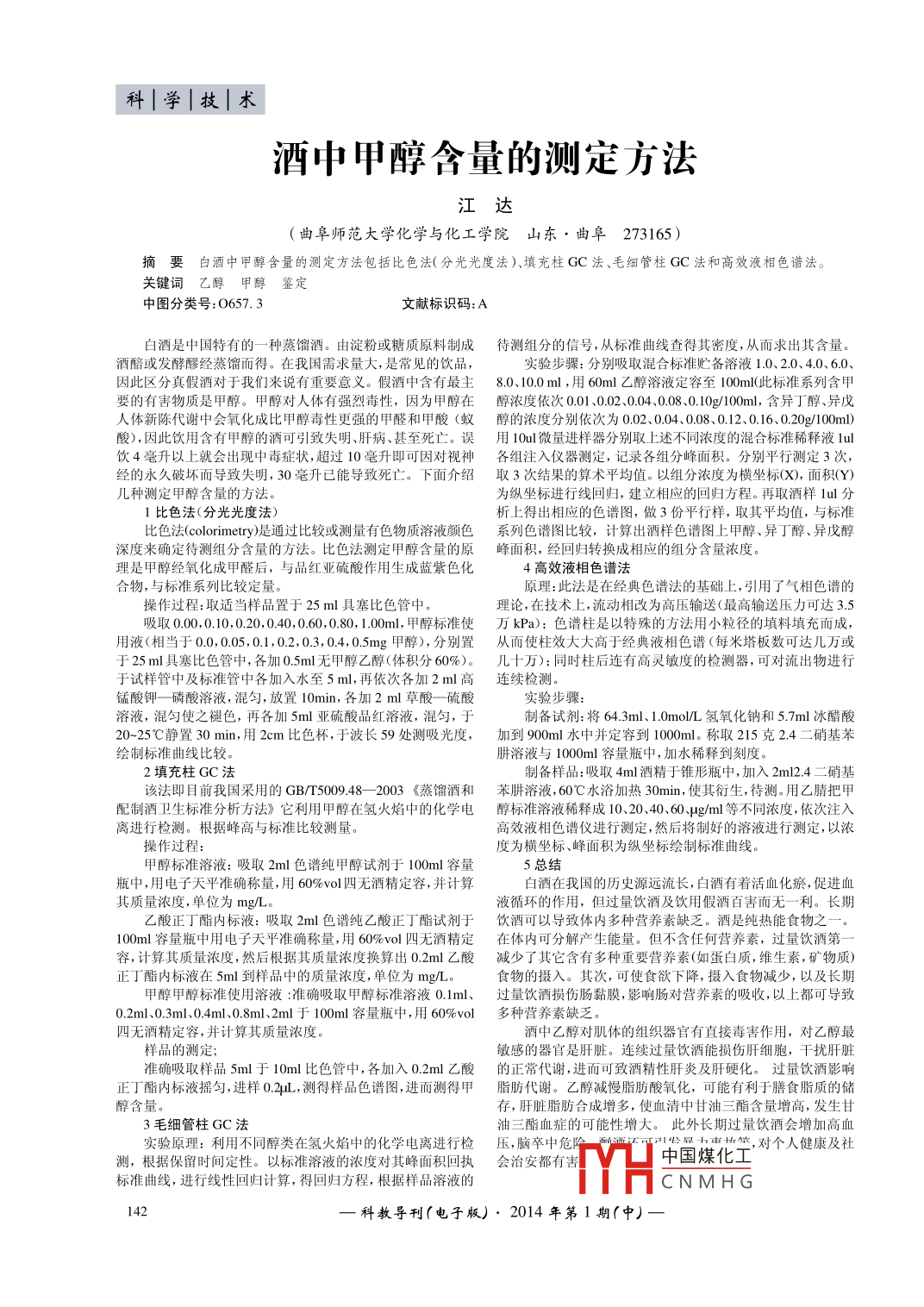 科|學|技|術酒中甲醇含量的測定方法江達(曲阜師范大學化學與化工學院山東·曲阜273165)摘要白酒中甲醇含量的測定方法包括比色法(分光光度法)、填充柱GC法、毛細管柱GC法和高效液相色譜法。關鍵詞乙醇甲醇鑒定中圖分類號:O657.3文獻標識碼:A白酒是中國特有的一種蒸餾酒。由淀粉或糖質(zhì)原料制成待測組分的信號,從標準曲線査得其密度,從而求岀其含量。酒醅或發(fā)酵醪經(jīng)蒸餾而得。在我國需求量大,是常見的飲品,實驗步驟:分別吸取混合標準貯備溶液1.0、2.0、4.0、6.0因此區(qū)分真假酒對于我們來說有重要意義。假酒中含有最主8.0、10.0m,用6oml乙醇溶液定容至100ml此標準系列含甲要的有害物質(zhì)是甲醇。甲醇對人體有強烈毒性,因為甲醇在醇濃度依次001、0.02、0.04、0.08、0.10g/100m,含異丁醇、異戊人體新陳代謝中會氧化成比甲醇毒性更強的甲醛和甲酸(蟻醇的濃度分別依次為0.02、0.04、0.08、0.12、0.16、0.20g/l00ml酸),因此飲用含有甲醇的酒可引致失明、肝病、甚至死亡。誤用10u微量進樣器分別取上述不同濃度的混合標準稀釋液lul飲4毫升以上就會出現(xiàn)中毒癥狀,超過10毫升即可因?qū)σ暽窀鹘M注入儀器測定,記錄各組分峰面積。分別平行測定3次經(jīng)的永久破壞而導致失明,30毫升已能導致死亡。下面介紹取3次結果的算術平均值。以組分濃度為橫坐標(X),面積(Y)幾種測定甲醇含量的方法為縱坐標進行線回歸,建立相應的回歸方程。再取酒樣1ul分1比色法(分光光度法)析上得出相應的色譜圖,做3份平行樣,取其平均值,與標準比色法( colorimetry是通過比較或測量有色物質(zhì)溶液顏色系列色譜圖比較,計算出酒樣色譜圖上甲醇、異丁醇、異戊醇深度來確定待測組分含量的方法。比色法測定甲醇含量的原峰面積,經(jīng)回歸轉換成相應的組分含量濃度理是甲醇經(jīng)氧化成甲醛后,與品紅亞硫酸作用生成藍紫色化4高效液相色譜法合物,與標準系列比較定量原理:此法是在經(jīng)典色譜法的基礎上,引用了氣相色譜的操作過程:取適當樣品置于25ml具塞比色管中理論,在技術上,流動相改為高壓輸送(最高輸送壓力可達3.5吸取O00,0.10,0.20,0.40,0.60,0.80,1.o0ml,甲醇標準使萬kPa);色譜柱是以特殊的方法用小粒徑的填料填充而成,用液(相當于00,005,0.1,0.2,0.3,0.4,0.5mg甲醇),分別置從而使柱效大大高于經(jīng)典液相色譜(每米塔板數(shù)可達幾萬或于25ml具塞比色管中,各加0.5m無甲醇乙醇(體積分60%)。幾十萬):同時柱后連有高靈敏度的檢測器,可對流出物進行于試樣管中及標準管中各加入水至5m,再依次各加2ml高連續(xù)檢測錳酸鉀一磷酸溶液,混勻,放置10min,各加2m草酸—硫酸實驗步驟溶液,混勻使之褪色,再各加5m亞硫酸品紅溶液,混勻,于制備試劑:將64.3ml、1.0mo/氫氧化鈉和5.7m冰醋酸20~25℃靜置30min,用2cm比色杯,于波長59處測吸光度,加到90om水中并定容到1000ml。稱取215克2.4二硝基苯繪制標準曲線比較肼溶液與1000ml容量瓶中,加水稀釋到刻度2填充柱GC法制備樣品:吸取4ml酒精于錐形瓶中,加入2ml2.4二硝基該法即日前我國采用的GB灬r500948—2003《蒸餾酒和苯肼溶液,60℃水浴加熱30πin,使其衍生,待測。用乙腈把甲配制酒衛(wèi)生標準分析方法》它利用甲醇在氫火焰中的化學電醇標準溶液稀釋成10、20、40、60g/m等不同濃度,依次注入離進行檢測。根據(jù)峰高與標準比較測量。高效液相色譜儀進行測定,然后將制好的溶液進行測定,以濃操作過程:度為橫坐標、峰面積為縱坐標繪制標準曲線。甲醇標準溶液:吸取2ml色譜純甲醇試劑于100m容量5總結瓶中,用電子天平準確稱量,用60%vol四無酒精定容,并計算白酒在我國的歷史源遠流長,白酒有著活血化瘀,促進血其質(zhì)量濃度,單位為mg/L液循環(huán)的作用,但過量飲酒及飲用假酒百害而無一利。長期乙酸正丁酯內(nèi)標液:吸取2ml色譜純乙酸正丁酯試劑于飲酒可以導致體內(nèi)多種營養(yǎng)素缺乏。酒是純熱能食物之l0om容量瓶中用電子天平準確稱量,用60%vol四無酒精定在體內(nèi)可分解產(chǎn)生能量。但不含任何營養(yǎng)素,過量飲酒第容,計算其質(zhì)量濃度,然后根據(jù)其質(zhì)量濃度換算出0.2ml乙酸減少了其它含有多種重要營養(yǎng)素(如蛋白質(zhì),維生素,礦物質(zhì))正丁酯內(nèi)標液在5ml到樣品中的質(zhì)量濃度,單位為mg/L食物的攝入。其次,可使食欲下降,攝入食物減少,以及長期甲醇甲醇標準使用溶液:準確吸取甲醇標準溶液υ.lm、過量飲酒損傷腸黏膜,影響腸對營養(yǎng)素的吸收,以上都可導致0.2ml、0.3ml、04ml、0.8ml、2ml于100m容量瓶中,用60%vol多種營養(yǎng)素缺乏四無酒精定容,并計算其質(zhì)量濃度。酒中乙醇對肌體的組織器官有直接毒害作用,對乙醇最樣品的測定敏感的器官是肝臟。連續(xù)過量飲酒能損傷肝細胞,干擾肝臟準確吸取樣品5m于loml比色管中,各加λ0.2m乙酸的正常代謝,進而可致酒精性肝炎及肝硬化。過量飲酒影響正丁酯內(nèi)標液搖勻,進樣0.L,測得樣品色譜圖,進而測得甲脂肪代謝。乙醇減慢脂肪酸氧化,可能有利于膳食脂質(zhì)的儲醇含量存,肝臟脂肪合成增多,使血清中甘油三酯含量增高,發(fā)生甘3毛細管柱GC法油三酯血癥的可能性増大。此外長期過量飲酒會增加高血實驗原理:利用不同醇類在氫火焰中的化學電離進行檢壓,腦卒中危險中星七市,對個人健康及社測,根據(jù)保留時間定性。以標準
