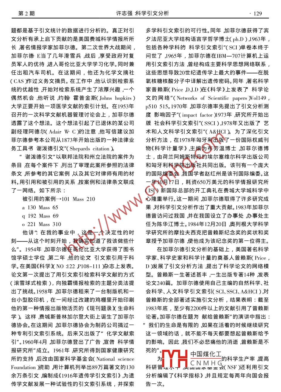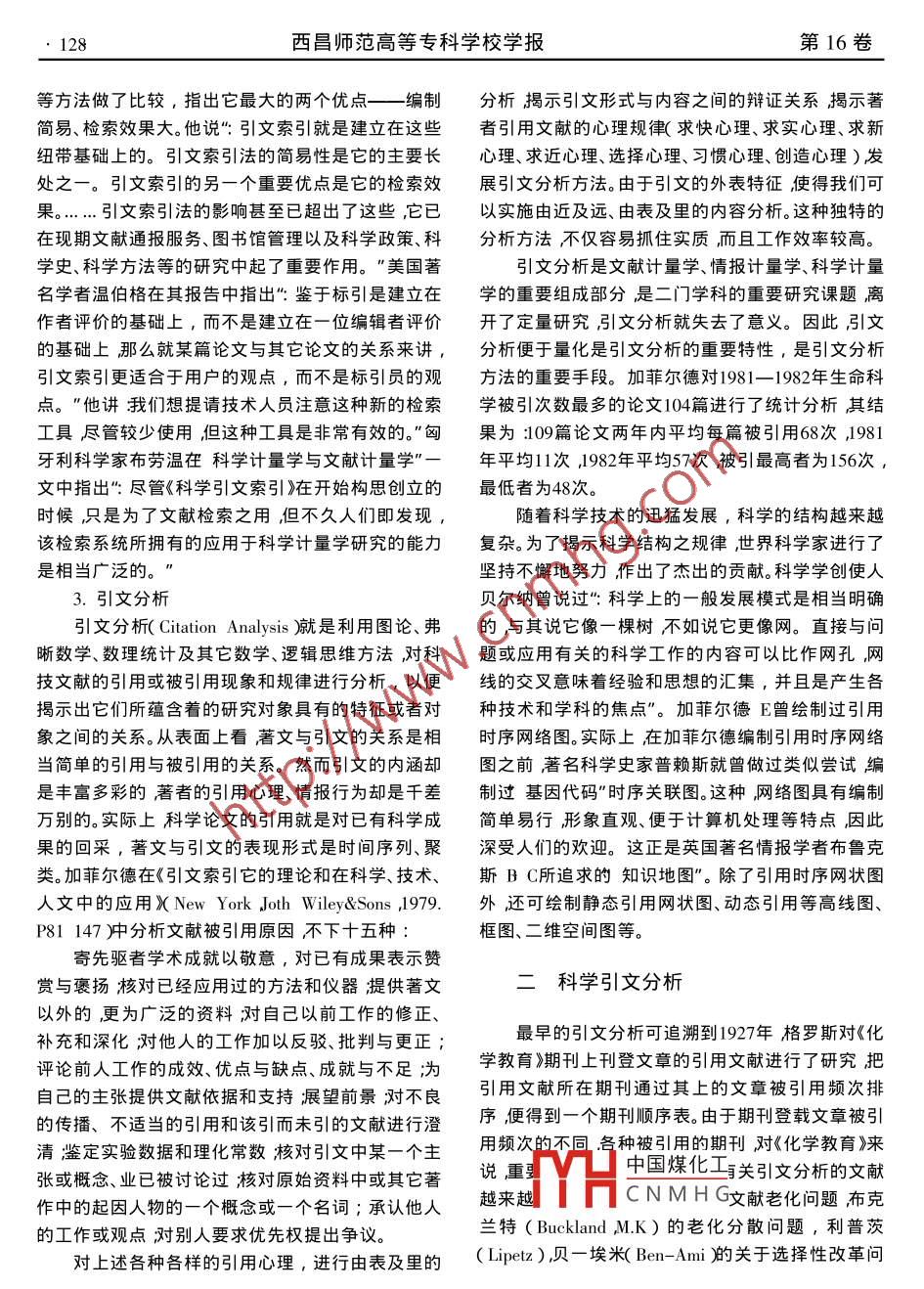 第16卷第2期西昌師范高等??茖W(xué)校學(xué)報(bào)Vol 16 No.22004年6月Journal of Xichang Teachers CollegeJun.2004科學(xué)引文分析許志強(qiáng)西昌學(xué)院圖書館,四川西昌615022)【摘要】文章概述引文、引文索引與引文分析科學(xué)引文分析與科學(xué)引文分析的應(yīng)用?!娟P(guān)鍵詞】引文;引文索引;引文分析;科學(xué)引文分析;應(yīng)用【中圖分類號(hào)】C7【文獻(xiàn)標(biāo)識(shí)碼】A【文章編號(hào)】1008-6307200402-0127-04The Analysis of Science QuotutionXU Zhi-qiang(ichang College, Xichang, Sichuan 615022Abstract: This paper defines the quotation, quotation index, quotatation analysis and thelotation. It further illustrates the application of the analysis of Science quotationkey words: quotation; quotation Index; quotation analysis; the analysis of science quotation; appl引文、引文索引與引文分析約有90%以上的科學(xué)論文附設(shè)有引文,平均每篇文獻(xiàn)具有引文15篇。我國目前88%左右的重要科學(xué)論引文文帶有引文,平均每篇中文科學(xué)論文有引文8、9篇引文來源于英文 Citation”,國外習(xí)慣于稱對(duì)部分中科院學(xué)部委員的引文統(tǒng)計(jì),他們的論文平引文”為再版目錄是一種與一次文獻(xiàn)同時(shí)出版的均引文量約為12篇。目前西文圖書附書末索引的達(dá)準(zhǔn)二次文獻(xiàn)”。具體地講引文”就是從一部著作引94%日文圖書達(dá)到90%中文圖書達(dá)到20%左右。用某一章節(jié),對(duì)于該一著作的或?qū)τ谝豁?xiàng)陳述或主隨著引文(參考文獻(xiàn)簷錄標(biāo)準(zhǔn)化、規(guī)范化引文張作為權(quán)威依據(jù)的某些來源資料的參考注釋”。這是(參考文獻(xiàn))成為科技文獻(xiàn)的重要特征引用已成一種簡(jiǎn)短的參考性的記載用以指明引用的文字公為文獻(xiàn)之間的一種普遍現(xiàn)象。根據(jù)引文在正文中的式,結(jié)論等的來源,或指明含有類似資料的出版物位置可分為文內(nèi)引文、頁下引文和末尾引文(將引文放在篇、章或書的末尾即參考文獻(xiàn))研究表明由于科學(xué)勞動(dòng)的繼續(xù)性和科技論文的整體性篇論文的質(zhì)量越高越容易引起學(xué)術(shù)界的注意因所以引文是普遍存在的。馬克思講”科學(xué)研究部分而在相關(guān)論文中被引用的概率就越大次數(shù)越多社地以今人的協(xié)作為條件,部分地又是以對(duì)前人勞動(dòng)會(huì)響應(yīng)值越大。反之亦然的利用為條件"。這里“,前人勞動(dòng)者的成果”指的就2.引文索引是歷史上留下的圖書文獻(xiàn)資料。因此“,科學(xué)研究必引文索引是建立在文獻(xiàn)的引用和被引用關(guān)系上須充分地占有資料”必須站在巨人的肩膀上″。正的一種新型索引,是從被引用文獻(xiàn)去檢索引用過該如英國著名物理學(xué)家齊曼教授在《知識(shí)的力量》一書文獻(xiàn)的文獻(xiàn)索引。嚴(yán)格地講",引文索引"是指已發(fā)中所指出的“一篇典型的科學(xué)論文中,往往大量地表文獻(xiàn)的一種索引,在書目中所引用的每一篇早期參考或引用其他人的實(shí)驗(yàn)、計(jì)算、觀測(cè)或理論。它不文獻(xiàn)附女丐引的峾邯立盍中”。美國著名情報(bào)學(xué)是憑自己想象向未知進(jìn)軍,而是根據(jù)前人有把握的家加中國煤化工第一章引文索引法研究小心翼翼地,一步步地前進(jìn)"。據(jù)統(tǒng)計(jì)全世界的概CNMH題索引、篇名索引收稿日期2004-05-28作者簡(jiǎn)介許志強(qiáng)(1962—)男研究館員主要從事信息(情報(bào)蒼理研究。128西昌師范高等??茖W(xué)校學(xué)報(bào)第16卷等方法做了比較,指岀它最大的兩個(gè)優(yōu)點(diǎn)——編制分析揭示引文形式與內(nèi)容之間的辯證關(guān)系揭示著簡(jiǎn)易、檢索效果大。他說“引文索引就是建立在這些者引用文獻(xiàn)的心理規(guī)律(求快心理、求實(shí)心理、求新紐帶基礎(chǔ)上的。引文索引法的簡(jiǎn)易性是它旳主要長心理、求近心理、選擇心理、習(xí)慣心理、創(chuàng)造心理)發(fā)處之一。引文索引的另一個(gè)重要優(yōu)點(diǎn)是它的檢索效展引文分析方法。由于引文的外表特征使得我們可果?!乃饕ǖ挠绊懮踔烈殉隽诉@些它已以實(shí)施由近及遠(yuǎn)、由表及里的內(nèi)容分析。這種獨(dú)特的在現(xiàn)期文獻(xiàn)通報(bào)服努、圖書館管理以及科學(xué)政策、科分析方法不僅容易抓住實(shí)質(zhì)而且工作效率較高。學(xué)史、科學(xué)方法等的研究中起了重要作用。"美國著引文分析是文獻(xiàn)計(jì)量學(xué)、情報(bào)計(jì)量學(xué)、科學(xué)計(jì)量名學(xué)者溫伯格在其報(bào)告中指岀鑒于標(biāo)引是建立在學(xué)的重要組成部分是二門學(xué)科的重要研究課題離作者評(píng)價(jià)的基礎(chǔ)上,而不是建立在一位編輯者評(píng)價(jià)開了定量研究引文分析就失去了意義。因此引文的基礎(chǔ)上那么就某篇論文與其它論文的關(guān)系來講,分析便于量化是引文分析的重要特性,是引文分析引文索引更適合于用戶的觀點(diǎn),而不是標(biāo)引員的觀方法的重要手段。加菲爾德對(duì)1981—1982年生命科點(diǎn)。"他講我們想提請(qǐng)技術(shù)人員注意這種新的檢索學(xué)被引次數(shù)最多的論文104篇進(jìn)行了統(tǒng)計(jì)分析其結(jié)工具盡管較少使用但這種工具是非常有效的?!毙