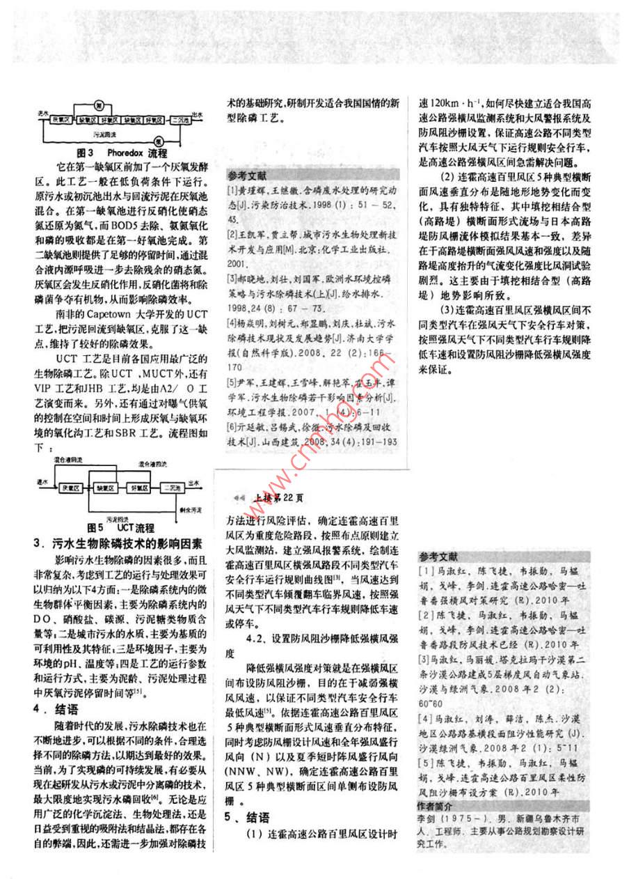能漂及環(huán)境中國科技息200年第20期 CHINA SCIENCE AND TECHNOLOGY INFORMATION O2o0Do410.3969/jisn.1001-8972.2010.20.005污水的生物除磷技術(shù)商曉玲河北省定州市環(huán)境保護局摘要除磷法具有節(jié)約能源運行費用較低不造2.3 Phostrip法簡單介紹了當(dāng)前污水中除磷的主要方法,成二次污染除磷效率高等諸多優(yōu)點目前Phostrip工藝作為側(cè)流除磷工藝的代探討了生物除磷技術(shù)的進展和現(xiàn)狀以及生許多國家已在使用此技術(shù)。表,把生物和化學(xué)除磷法結(jié)合起來,其工物除磷工藝的特點,并根據(jù)不同的條件選2.生物除磷法藝流程及運行參數(shù)如圖:擇不同的生物除磷工藝生物除磷法“是根據(jù) Luxury up take[x][[8關(guān)鍵詞現(xiàn)象而進行的除磷方法和手段。自1955影響因素;生物除磷后,人們發(fā)現(xiàn)某些在厭氧條件下釋放磷的微生物能夠進一步在好氧條件下過量吸收取蠟污廢水中的磷在此基礎(chǔ)上逐漸發(fā)展的生物除圖1Pho- strip流程磷方法稱為生物過量磷去除法,簡稱生物除該工藝中主流部分為常規(guī)的活性污泥磷法。曝氣池回流污泥的一部分(約為進水流量磷來源于不可再生的磷礦石,通過化2.1A/ O(Anaerobic/oxc法的10-20%)被分流到專門厭氧池,污肥、農(nóng)作物、人和動物最終回到土壤。污迄今為止最為簡單的生物除磷工藝泥在厭氧池中通常停留8-12h,聚磷菌則水中的磷主要來自生活污水中的含磷有機是AO工藝AO法工藝中先使含有某些在厭氧池中進行磷的釋放脫磷后的污泥回物、合成洗滌劑、工業(yè)廢液、化肥農(nóng)藥以微生物種群的污水進入A/O法的A段,使流到曝氣池中繼續(xù)吸磷。含磷上清液進及各類動物的排泄物。其處于厭氧或兼氧環(huán)境中,這類微生物便吸入化學(xué)沉淀池然后用石灰進行處理,沉淀收污水中的乙酸,甲酸及乙醇等極易生去除磷石灰劑量取決于廢水的堿度。除隨著人類活動的不斷增加水體磷物降解的有機物質(zhì)存在體內(nèi)作為營養(yǎng)磷過程在污泥回流路徑上完成P市的污染日益嚴(yán)重大量富含氮磷的生活污源同時積存于體內(nèi)的多聚磷酸鹽就會分解工藝的優(yōu)點是與單純的化學(xué)除磷工藝相比,水、工業(yè)廢水和含農(nóng)藥、化肥的農(nóng)田徑流成可溶性的單磷酸鹽并釋放到水體中去從大大地減少了藥劑的投加量和化學(xué)污泥排入水體造成水體富營養(yǎng)化根據(jù)調(diào)查,而達到將體內(nèi)磷充分排出的日的。按工量.該法除磷效率可達90%以上,出水總我國已趨富營養(yǎng)化的湖泊達92%。按國際上總氮(0.2mg·L)和總磷(0.02mg:·L)藝流程污水接著進入AO法的0段pH磷濃度可低于!mg·L+,而且不太受進濃度作為湖泊富營養(yǎng)化的指標(biāo)叫所調(diào)查的應(yīng)控制在7~8之間),微生物處于好氧環(huán)水BOD濃度影響。湖泊中,多數(shù)湖泊總氮濃度一般高出5~12境此時微生物將體內(nèi)貯存的有機物氧化分2.4 Bardenpho法5倍,總晚高出053倍.因此對水體中在體內(nèi)合成多聚酸鹽而積署起來,隨人們發(fā)現(xiàn),如果反硝化很徹底會產(chǎn)生1.現(xiàn)代污水除磷技術(shù)后挾帶大量體內(nèi)富含磷的微生物菌膠團厭氧池的容積比反硝化所需的容積大,使厭(俗稱活性污泥)的污水進入二沉池沉降下氧池能有一部分確保無離子態(tài)的氧為磷的現(xiàn)代污水除磷從技術(shù)上說除磷方法來,在這些微生物還沒來得及分解釋放磷釋放創(chuàng)造條件。另外如果將污水進水與可以分為物理化學(xué)處理法和生物處理法兩時,池底的含磷污泥部分就以剩余污泥的回流污泥在一級厭氧池內(nèi)混合對除磷效果大類,其中,物理化學(xué)除磷法包括結(jié)品法,形式排出作為肥料,另一部分則回流至A段會有明顯的改善. Bardenpho工藝涵蓋化學(xué)凝聚法、吸附法、離子交換法等處于厭氧或兼氧環(huán)境中,重新進入新輪的了級缺氧及好氧過程,具有較好的脫磷效生物除磷法有AO工藝A2O工藝、放磷與聚磷的生理循環(huán)過程.其除磷效果,但工藝流程長、構(gòu)筑物多是該法的ardenpho率能達到75%很難再提高。大缺點,其工藝流程及運行參數(shù)如圖:Phoredox工藝等。2.2 A2/0(Anaerobic- Anoxic化學(xué)除磷法除磷效率較高,一般可達oxi法1%-8%,且比較穩(wěn)定可靠但有兩點不利:漢好區(qū)區(qū)好匚元A2/O工藝相對于前面提到的A(1)加入沉淀劑使污泥體積增加而且這種O工藝因為增加了缺氧處理階段將除磷與為園責(zé)污泥含有化學(xué)藥劑因此它的處置也較因脫氮相結(jié)合,不僅節(jié)省了脫對碳源的需要圖2 Bardenpno流程難,而由于投加化學(xué)藥劑水中的鹽含量而且縮小了曝氣區(qū)的體積,節(jié)省了能源并2.5 Phoredox法大大增加(2)因為該法需要一套貯藥、且有望降低產(chǎn)生的剩余富磷污泥量,因Phoredox工藝是 Barnard為了提高溶藥、投藥設(shè)備,日常藥劑的消耗量是可此,A2/O法比AO法具有更好的實用除磷效果而對 Bardenpho藝做的一個改觀的因此增加了投資和運行費用。生物性,進。流程圖如下:術(shù)的基礎(chǔ)研究研制開發(fā)適合我國國情的新速120kmh,如何盡快建立適合我國高型除磷工藝速公路強橫風(fēng)監(jiān)測系統(tǒng)和大風(fēng)警報系統(tǒng)及防風(fēng)阻沙柵設(shè)置,保證高速公路不同類型圖3 Phoredo汽車按照大風(fēng)天氣下運行規(guī)則安全行車它在第一缺氧區(qū)前