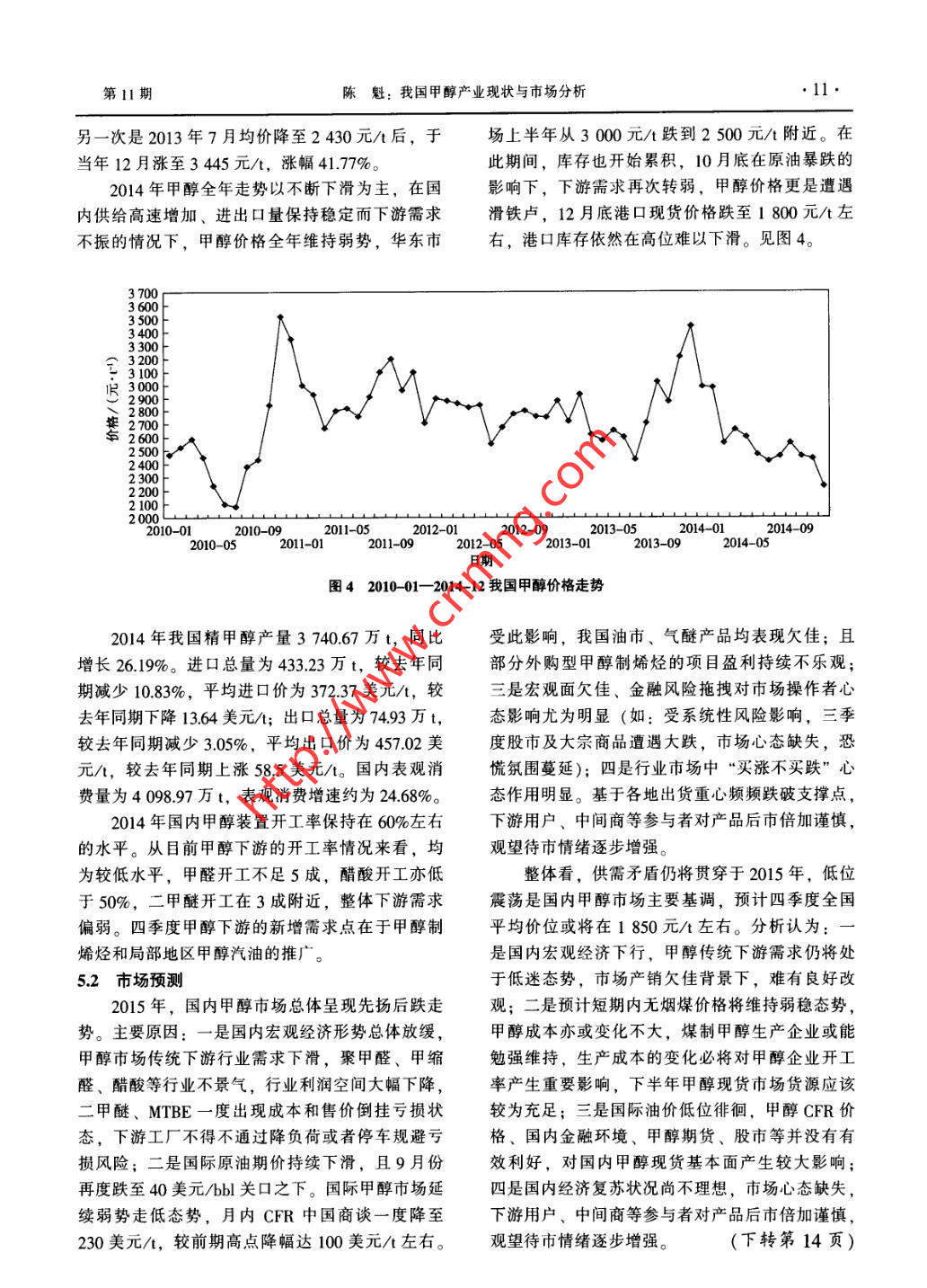 化學(xué)工業(yè)第33卷第11期●8.CHEMICAL INDUSTRY2015年11月我國甲醇產(chǎn)業(yè)現(xiàn)狀與市場分析陳魁(河南能源化工集團(tuán)中原大化公司,濮陽457004)摘要:分析了我國甲醇產(chǎn)能和產(chǎn)量變化、生產(chǎn)布局與原料比例、生產(chǎn)能耗與成本.以及2010年以來國內(nèi)甲醇市場變化。預(yù)計(jì)未來兩年隨著我國甲醇制烯烴、芳烴等新興下游行業(yè)集中開工,屆時(shí)巨大的需求量將使甲醇行業(yè)步人新的發(fā)展機(jī)遇期。關(guān)鍵詞:甲醇;市場調(diào)查;市場需求分析;技術(shù)經(jīng)濟(jì)與企業(yè)管理文章編號(hào): 1673- 9647 (2015) 11-0008-05中圖分類號(hào): TQ223.12*1文獻(xiàn)標(biāo)識(shí)碼: A1我國甲醇產(chǎn) 業(yè)現(xiàn)狀醇產(chǎn)能基數(shù)龐大,但裝置開工率不足60%。尤其1.1 產(chǎn)能、產(chǎn)量自2008年四季度起,在全球金融危機(jī)席卷下,國我國甲醇工業(yè)發(fā)展迅速。2002- 2009 年期間內(nèi)甲醇行情出現(xiàn)大跳水后,使得國內(nèi)甲醇產(chǎn)能出我國甲醇產(chǎn)能的年均增長速度為34%;尤其是現(xiàn)嚴(yán)重閑置。近三年來,隨著產(chǎn)業(yè)結(jié)構(gòu)調(diào)整,國2003年,國家鼓勵(lì)發(fā)展煤化工,國內(nèi)產(chǎn)能暴漲家加大淘汰落后產(chǎn)能力度,甲醇裝置利用率正在66%。甲醇行業(yè)在2007- -2013 年進(jìn)入高速發(fā)展逐步提高,產(chǎn)業(yè)結(jié)構(gòu)趨于合理。見圖1。期,規(guī)?;略黾状冀ㄔO(shè)項(xiàng)目大批涌現(xiàn),我國甲據(jù)統(tǒng)計(jì),2014年我國甲醇產(chǎn)能增加1 030萬白70000.760000.6.5。40000.3哥5 30000.2斗.1¥20000.0曼100nnnDu.n.Ih.h-0.2-0.31997 1999 2001 2003 2005 2007 2009 2011 201 31998200020022004 2006 200820102012 2014口產(chǎn)能;口產(chǎn)量; - -產(chǎn)量增長率;產(chǎn)能增長率圖1 1997- -2014年我國甲醇產(chǎn)能和產(chǎn)量t/a,年底達(dá)到6644萬t/a; 2014 年國內(nèi)甲醇產(chǎn)位居全國第一,占比約29%,西北約占全國產(chǎn)能量共3 740.67萬t,累計(jì)同比增加26.19%。2014的25%,華東占17%,華中則占到了13%。見圖年全年國內(nèi)甲醇開工率在55%左右,相比2013年2。提高4個(gè)百分點(diǎn)。從省市來看,我國甲醇裝置分布廣泛,除北1.2產(chǎn)能分布京、廣東和西藏之外,其他省份均有甲醇裝置。我國甲醇裝置主要分布在煤炭、天然氣資源甲醇年生產(chǎn)能力在百萬噸以上的省市有12個(gè),其豐富的區(qū)域,集中在華北、華東、華中、西北地收稿日期: 2015-09-18區(qū)。2013 年這四個(gè)地區(qū)甲醇裝置的總產(chǎn)能占到全作者簡介:陳魁(1977-). 男.河南省人,經(jīng)濟(jì)學(xué)碩士,經(jīng)濟(jì)國總產(chǎn)能的84%。其中,華北地區(qū)甲醇裝置產(chǎn)能師,現(xiàn)從事煤化工產(chǎn)業(yè)市場研究。第11期東魁:我國甲醇產(chǎn)業(yè)現(xiàn)狀與市場分析.9.西南,85/,,華南,1.3原料比例12%年152萬/a.2%華東,1 169.86萬當(dāng)前,我國的甲醇生產(chǎn)正走向規(guī)?;?。2014東北,t/a, 17%160萬i/a, 2%年我國甲醇生產(chǎn)企業(yè)330家,較去年新增18家,新增產(chǎn)能超900萬t/a。2012- -2014 年50萬t/a .以上的企業(yè)比重較前期相比出現(xiàn)小幅增加,且已西北,1 695.5萬華北, 1980.2萬逐漸形成河南能源、遠(yuǎn)興能源、久泰、兗礦、中t/a, 25%華中, 906.5萬t/a,t/a, 29%?;瘜W(xué)等年產(chǎn)量百萬噸級(jí)以上規(guī)模企業(yè),而從烯圖2我國甲醇產(chǎn) 能地區(qū)分布烴配套百萬噸級(jí)以上甲醇裝置來看,神華、大唐、寧煤、寶豐、延長等企業(yè)甲醇產(chǎn)能均在150萬/a中內(nèi)蒙古產(chǎn)能1 145萬Va,位居第一;其次是河以上。南省700萬t/a、山東省660萬t/a、陜西省6002014年以煤為原料甲醇產(chǎn)能4310萬t/a,占.萬/a、山西省588萬l/a。這五個(gè)地區(qū)合計(jì)產(chǎn)能總產(chǎn)能的64.87%;以天然氣為原料甲醇產(chǎn)能1 205約3693萬V/a,占全國總產(chǎn)能的55.58%。見圖3。萬t/a,占總產(chǎn)能的18.14%; 以焦?fàn)t氣為原料產(chǎn)能1 129萬t/a,新增75萬t/a,占總產(chǎn)能的其它_內(nèi)蒙古山東16.99%。四川24%717% 10%3%2生產(chǎn)能耗分析海南目前國內(nèi)煤制甲醇能耗為50~60 GJ/t。生產(chǎn)1 t甲醇耗煤1.6t左右,耗水20~30t; 以天然氣為原料生產(chǎn)的甲醇能耗約為40 GJ/t。生產(chǎn)1 t甲新疆河南醇耗天然氣900~1 150m', 耗水16~20 t;我國6%重慶9%10%小型聯(lián)醇裝置能耗則高達(dá)70GJ/t。國外大型甲河北陜西醇裝置基本都以天然氣為原料,以中東和南美洲圖3我國甲醇產(chǎn)能按省分布為代表的國外甲醇裝置普遍規(guī)模較大,如目前國際上最大規(guī)模的甲醇裝置產(chǎn)能已達(dá)到170萬Va,從近年來的發(fā)展不難看出,借助豐富的煤炭大型設(shè)備能耗降低,平均能耗只有25~30 GJ/t,資源、天然氣資源以及政府的政策支持,“十一生產(chǎn)1 t甲醇耗天然氣760~920 m,耗水10~15 t。五”期間中國西北地區(qū)甲醇產(chǎn)能增長迅速,占全我國因?yàn)楦髌髽I(yè)工藝和管理水平不同,甲醇國總產(chǎn)能近5成。西北地區(qū)擁有豐富的煤炭、天的能耗差距較大。從整體情況看, 2014 年甲醇單然氣資源,僅內(nèi)蒙、陜西、寧夏三地煤炭、石油、位產(chǎn)品平均綜合能耗(折標(biāo)煤)為1 454kg/t,較天然氣等石化能源折標(biāo)準(zhǔn)煤儲(chǔ)量就達(dá)到2萬億t,2013年降低2.5%。見表1。約占全國40%,加上新疆、青海、甘肅地區(qū)儲(chǔ)表1 2014 年合成