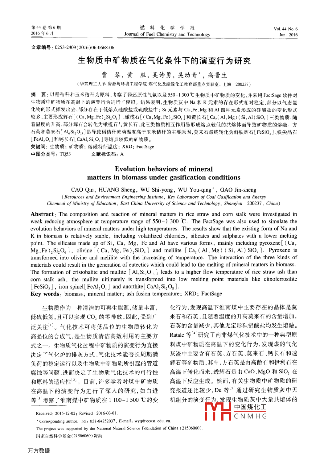第44卷第6期然料化學(xué)學(xué)報Vol 44 No 62016年6月oumal of Fuel Chemistry and TechnologyJun.2016文章編號:0253-2409(2016)06066806生物質(zhì)中礦物質(zhì)在氣化條件下的演變行為研究曹琴,黃勝,吳詩勇,吳幼青,高晉生(華東理工大學(xué)資源與環(huán)境T程學(xué)院煤氣化及能源化工教育部重點實驗室,上海200237)摘要:以稻秸稈和玉米秸稈為原料,考察了弱還原性氣氛以及550-1300℃生物質(zhì)中礦物質(zhì)的變化,并采用 FactSage軟件對生物質(zhì)中礦物質(zhì)在高溫下的演變行為進行了模擬。結(jié)果表明,生物質(zhì)灰中Na和K元素的存在形式相對穩(wěn)定,部分以氣態(tài)氯化物的形式揮發(fā)出去,部分存在于低熔點硅酸鹽或硫酸鹽中;Si元素與Ca、Fe、Mg和Al四種元素形成的硅酸鹽的變化形式較多,主要形成輝石[(Ca,Mg,Fe)Si2O。]、橄欖石[(Ca,Mg,Fe)2SO.]和黃長石[Ca2(A1,Mg)(Si,AI)SO,]三類物質(zhì),隨著溫度的升高,部分輝石會轉(zhuǎn)化為橄欖石與黃長石,此三類物質(zhì)相互作用易形成熔點較低的共熔體而導(dǎo)致礦物質(zhì)的熔融。方石英和莫來石[ALSi2O1]是導(dǎo)致稻秸稈流動溫度高于玉米秸稈的主要原因,莫來石最終轉(zhuǎn)化為斜鐵輝石[ FeSi3]、鐵尖晶石FeAl2O4]和鈣長石[CaA2Si2O]等熔點較低的礦物質(zhì)關(guān)鍵詞:生物質(zhì);礦物質(zhì);熔融特征溫度;XRD; FactSage中圖分類號:TQ53文獻標(biāo)識碼Evolution behaviors of mineralmatters in biomass under gasification conditionsCAO Qin, HUANG Sheng, wU Shi-yong, wU You-qing, GAO Jin-shengResources and Environment Engineering Institute, Key Laboratory of Coal Gasification and EnergyChemical of Ministry of Education, East China Universiry of Science and Technology, Shanghai 200237, China)Abstract: The composition and reaction of mineral matters in rice straw and corn stalk were investigated inweak reducing atmosphere at temperature range of 550-1 300 C. The FactSage was also used to simulate theevolution behaviors of mineral matters under high temperatures. The results show that the existing form of Na andK in biomass is relatively stable, including volatilized chlorides, silicates and sulphates with a lower meltingpoint. The silicates made up of Si, Ca, Mg, Fe and Al have various forms, mainly including pyroxene[(CaMg, Fe ) Si, O], olivine [( Ca, Mg, Fe), Sio. and melilite Ca,(Al, Mg )( Si, Al)SiO,]. Pyroxene istransformed into olivine and melilite with the increasing of temperature. The interaction of the three kinds ofmaterials could result in the generation of eutectics which could lead to the melting of mineral matters in biomassThe formation of cristobalite and mullite Al Si, O, leads to a higher flow temperature of rice straw ash thancorn stalk ash, the mullite ultimately is transformed into low melting point materials like clinoferrosiliteFeSiO,, iron spinel[ FeAl, 0] and anorthite[ CaAl, Si, OgKey words: biomass; mineral matter; ash fusion temperature; XRD; FactSage生物質(zhì)作為一種清潔的可再生能源,儲量豐富,化行為,發(fā)現(xiàn)高溫下淮南煤中主要存在的晶體是莫低硫低氮,且可以實現(xiàn)CO2的零排放,因此,受到廣來石和石英,且隨著溫度的升高莫來石的含量增加,泛關(guān)注。氣化技術(shù)可將低品位的生物質(zhì)轉(zhuǎn)化為石英的含量減少,其他無定形硅鋁酸鹽均發(fā)生熔融。高品位的合成氣,是生物質(zhì)清潔高效利用的主要方 Natale等‘研究了南非煤氣化技術(shù)中的一種典型原式之一。生物質(zhì)氣化過程中礦物質(zhì)的演變行為直接料煤中礦物質(zhì)在高溫下的變化行為,發(fā)現(xiàn)煤的氣化決定了氣化爐的排灰方式、氣化技術(shù)能否長周期滿灰渣中主要含有石英、方石英、莫來石鈣長石和透負荷的穩(wěn)定運行以及生物質(zhì)中礦物質(zhì)所引起的管道輝石等礦物質(zhì),其中,方石英是由高齡石和伊利石在腐蝕等問題,進而決定了生物質(zhì)氣化技術(shù)的可行性高溫下轉(zhuǎn)化而來,透輝石是由CaO、MgO和SiO2在和原料的適應(yīng)性2。目前,許多學(xué)者對煤中礦物質(zhì)高溫下反應(yīng)生成。然而,有關(guān)生物質(zhì)中礦物質(zhì)的研在高溫下的演變行為進行了深入的研究,如白進究報道還比較少,Du等”通過研究生物質(zhì)灰中無等3考察了淮南煤中礦物質(zhì)在11041500℃的變機組分的演變行為發(fā)現(xiàn)生物質(zhì)灰中大量共熔體的中國煤化工Received: 2015-12-02: Revised: 2016-03-01CNMHGCorresponding author. Tel: 021-64252037, E-mail: wyqe ecust. edu. cnThe project was supported by the National Natural Science Foundation of China(21506060國家自然科學(xué)基金(21506060)資助第6期曹琴等:生物質(zhì)中礦物質(zhì)在氣化條件下的演變行為研究產(chǎn)生會顯著降低其灰熔融溫度。實驗部分實驗選取中國常見的兩種生物質(zhì)作為研究對1.1實驗原料象,利用XRD和AFr(灰熔融特征溫度)分析等手研究選用稻秸稈(DJG)和玉米秸稈(YMJG)作段,并結(jié)合 FactSage模擬計算,考察了氣化條件下為原料,其工業(yè)分析和元素分析見表1。由表!可兩種生物質(zhì)中礦物質(zhì)的演變行為,以期能夠為生物知,與煤相比,生物質(zhì)的揮發(fā)分含量較高,C、S和N質(zhì)氣化技術(shù)的大規(guī)模工業(yè)化應(yīng)用提供基礎(chǔ)數(shù)據(jù)和理含量較低論依據(jù)。表1生物質(zhì)的工業(yè)分析與元素分析Table I Proximate and ultimate analysis of biomassProximate analysis wo/%Ultimate analysis wa/%SampleAHDJG20.1472.87.0543.90.15YMG4.2772.0023.7346.95.240.121.281.2實驗樣品的制備質(zhì)灰及其高溫灰樣中的礦物