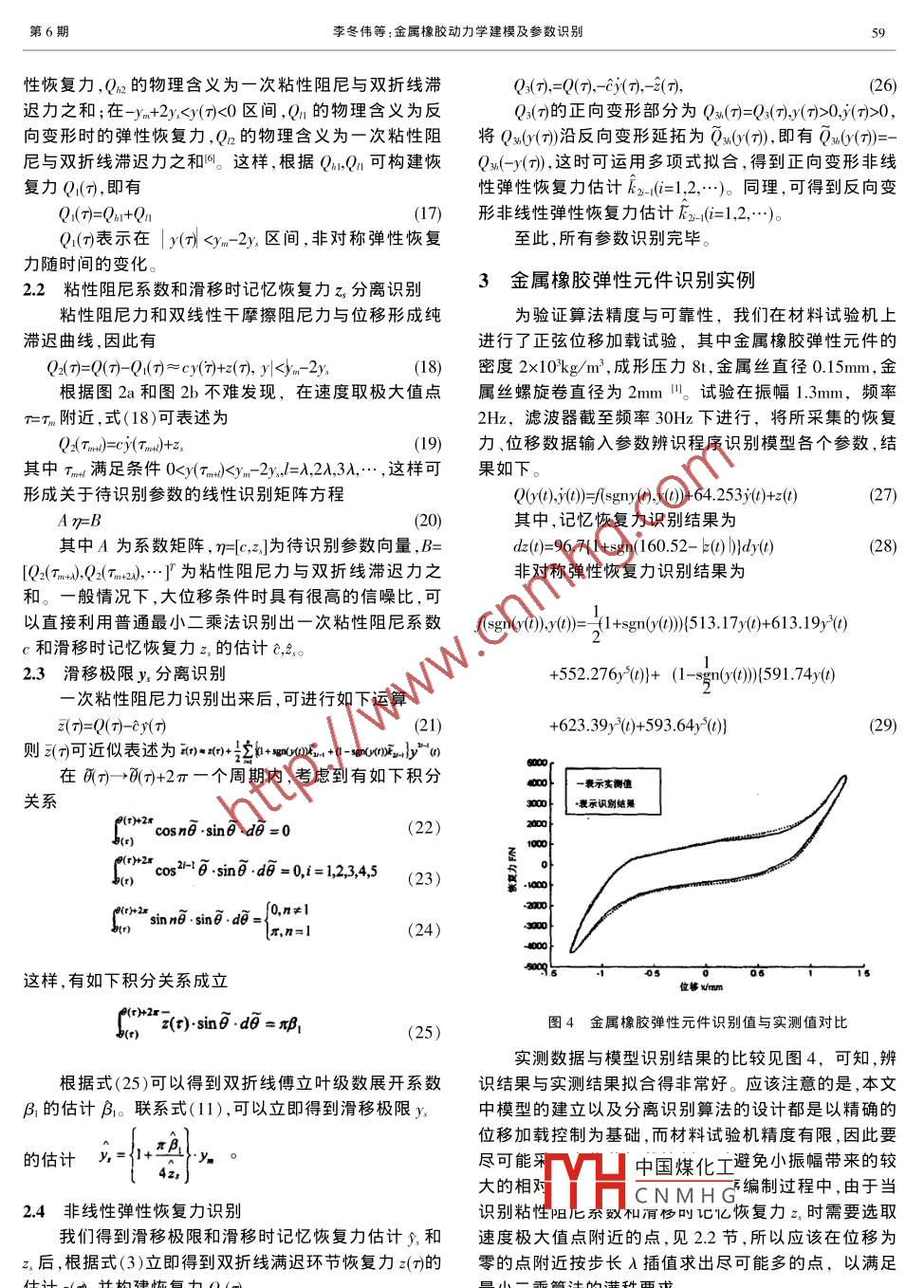 振動(dòng)與沖擊第24卷第6期JOURNAL OF VIBRATION AND SHOCKVol.24No.62005金屬橡膠動(dòng)力學(xué)建模及參數(shù)識(shí)別李冬偉白鴻柏楊建春劉英杰(軍械工程學(xué)院自行火炮教研室,石家莊050003摘要根據(jù)金屬橡膠材料的作用機(jī)理,提出了一種非對(duì)稱彈性粘性阻尼雙折線遲滯恢復(fù)力的模型,利用材料試驗(yàn)機(jī)的位移加載控制原理,對(duì)其進(jìn)行了傳立葉級(jí)數(shù)展開(kāi),并設(shè)計(jì)了一種分離參數(shù)的識(shí)別算法,經(jīng)過(guò)對(duì)實(shí)測(cè)數(shù)據(jù)的計(jì)算,識(shí)別精度較高,能滿足工程上分析金屬橡膠彈性元件動(dòng)態(tài)特性的需要關(guān)鍵詞:金屬橡膠,遲滯模型,參數(shù)識(shí)別中圖分類號(hào):TB535,TH113.1文獻(xiàn)標(biāo)識(shí)碼:A恢復(fù)力與變形歷史之間具有所謂的記憶特性,且其彈0引言性恢復(fù)力是正反不對(duì)稱的,因此本文提出非對(duì)稱彈性金屬橡膠材料是以不同規(guī)格的金屬絲為原材料,粘性阻尼雙折線遲滯恢復(fù)力模型。經(jīng)螺旋纏繞、拉伸、模壓等特殊制備工藝成型的,該種此模型認(rèn)為金屬橡膠彈性阻尼元件的恢復(fù)力由記材料在高低溫、腐蝕環(huán)境等特種工況下具有良好的阻憶環(huán)節(jié)和無(wú)記憶環(huán)節(jié)并聯(lián)而成尼隔振性能,因此,建立一套反映金屬橡膠材料作用Q0(t), y()=f(sony(t), y())+cy(t)+(t)機(jī)理,精度高、適用性強(qiáng)的理論與實(shí)驗(yàn)方法是十分必要()——彈性元件的位移的彈性元件的速度常規(guī)的研究阻尼材料動(dòng)態(tài)特性的自由衰減法、半其中,無(wú)記憶恢復(fù)力又由僅與位移有關(guān)的非對(duì)稱功率法主要用于系統(tǒng)近似為線性的情況,而金屬橡膠高次彈性力f(sgmy(,y()和僅與速度有關(guān)的粘性阻尼力材料為大阻尼非線性材料,故不易采用此類方法測(cè)cy()兩部分構(gòu)成,前者為關(guān)于各階正反向剛度系數(shù)k,k試。另一方面,一些學(xué)者對(duì)具有類似金屬橡膠的干摩的線性模型擦阻尼特性材料進(jìn)行了探討,并建立了相應(yīng)的數(shù)學(xué)模型,如文獻(xiàn)[提出了基于曲線擬合分解的復(fù)合型阻尼八(gn()y()=-2(1+sgn0y02力模型以,對(duì)于大位移時(shí)的鋼絲繩等遲滯系統(tǒng)有比較高(2)的精度,但此模型中提出的復(fù)合型阻尼力概念有些模+(1-sgmy(O)k2-y2+(糊,不能滿足需要精確得到各種阻尼成分的要求,且從z()表示與整個(gè)變形歷史有關(guān)的雙折線關(guān)系記憶恢實(shí)測(cè)結(jié)果可知金屬橡膠元件的恢復(fù)力-位移遲滯回線復(fù)力,其增量方程為是上下不對(duì)稱的,即高次彈性力是正反不對(duì)稱的,故不能用此模型來(lái)描述。文獻(xiàn)[2]應(yīng)用 Masing模型,通過(guò)對(duì)dz(0)=m[1+sgn(e-z(olly()金屬橡膠隔振器的最初加載曲線進(jìn)行坐標(biāo)變換,得到了變形與力的非線性關(guān)系,但這種建模方法不適于分k,=—是未產(chǎn)生滑移時(shí)的線性剛度;z是滑移時(shí)析金屬橡膠彈性元件承受動(dòng)態(tài)載荷時(shí),恢復(fù)力與振幅和振動(dòng)頻率的關(guān)系的記憶恢復(fù)力;y.是金屬絲間發(fā)生宏觀滑移的變形極利用電液伺服材料試驗(yàn)杋精確的位移加載控制,限,簡(jiǎn)稱滑移極限,圖2是雙折線本構(gòu)關(guān)系。依據(jù)雙折線遲滯模型的傅立葉展開(kāi)形式,設(shè)計(jì)了一種設(shè)y為材料試驗(yàn)機(jī)位移控制下彈性元件的變形分離參數(shù)的識(shí)別算法,識(shí)別精度較高,能滿足工程上分量析金屬橡膠彈性元件動(dòng)態(tài)特性的需要。y=sin(at+o)雙折線遲滯模型的傅立葉級(jí)數(shù)展開(kāi)引入坐標(biāo)變換Tl-l6 ls理論與實(shí)驗(yàn)分析表明,由于用于制作金屬橡膠的鋼絲間的摩擦、擠壓、滑移等細(xì)觀力學(xué)作用,這種材料則(4)式EACH中國(guó)煤化工宏觀上會(huì)呈現(xiàn)出類似彈塑性的本構(gòu)關(guān)系,如圖1,導(dǎo)致根據(jù)關(guān)CNMHG(7)國(guó)家自然科學(xué)基金(項(xiàng)目批準(zhǔn)號(hào):50105021),國(guó)家教育部《高等學(xué)校骨干教師資助計(jì)劃》以及軍械工程學(xué)院創(chuàng)新人才啟動(dòng)基金聯(lián)合資助項(xiàng)目收稿日期:2004-08-23修改稿收到日期:2004-11-12第一作者秀務(wù)鬟數(shù)據(jù)博士生,1979年生振動(dòng)與沖擊2005年第24卷恢復(fù)力Q2參數(shù)的分離識(shí)別方法由恢復(fù)力模型的傅立葉展開(kāi)表達(dá)式(12)可知,總的恢復(fù)力遲滯回線(見(jiàn)圖3a),是由非對(duì)稱高次彈性恢復(fù)力(見(jiàn)圖3b),一次粘性阻尼力(見(jiàn)圖3c),雙折線恢位移y復(fù)力(見(jiàn)圖3d)迭加而成的。從圖中可知,整個(gè)遲滯回線加載部分與卸載部分關(guān)于橫軸是不對(duì)稱的,這主要是由于高次彈性力的上下不對(duì)稱引起;粘性阻尼力關(guān)于橫軸對(duì)稱;雙折線恢復(fù)力在0