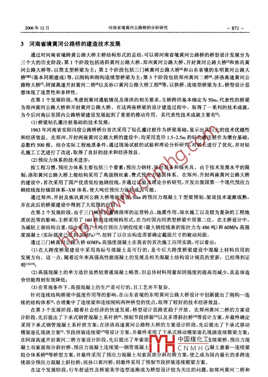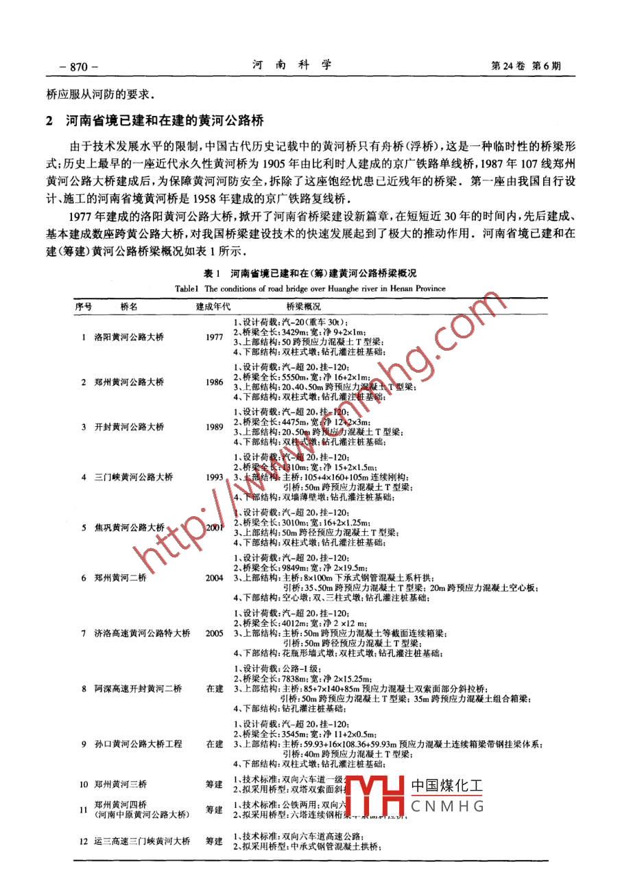 第24卷第6期河南科學(xué)Vol.24 No.62006年12月HENAN SCIENCEDec. 2006文章編號(hào): 1004- -3918 (2006)06 -0869-05河南省境黃河公路橋的分析研究趙卓1,王健2,孟磊3,王用中2(1.鄭州大學(xué)土木工程學(xué)院,鄭州450002; 2. 河南省交通規(guī)劃勘察設(shè)計(jì)院,鄭州450052;3.河南海威工程咨詢(xún)有限公司,鄭州450002)摘要:近年來(lái),隨著我國(guó)交通運(yùn)輸事業(yè)及中部地區(qū)國(guó)民經(jīng)濟(jì)等的快速發(fā)展,河南省境內(nèi)黃河公路橋的建設(shè)又進(jìn)入了一個(gè)新的階段,各地黃河公路橋的建造步伐逐漸加快.本文對(duì)河南省境內(nèi)已建和在建的黃河公路橋概況進(jìn)行了系統(tǒng)的分類(lèi)分析研究,對(duì)其技術(shù)發(fā)展水平進(jìn)行了總結(jié)分析,為今后同類(lèi)橋梁的建設(shè)提供了經(jīng)驗(yàn)和依據(jù).關(guān)鍵詞:河南;黃河;橋梁中圖分類(lèi)號(hào): TU 442.5文獻(xiàn)標(biāo)識(shí)碼: A黃河是貫穿河南省中北部最大的河流,將河南省分為南北兩部分.為跨越中原腹地的黃河天塹,河南人民歷來(lái)十分重視跨越黃河的橋梁建設(shè)。近年來(lái),隨著我國(guó)交通運(yùn)輸事業(yè)的快速發(fā)展、中原地區(qū)的城市群建設(shè)以及沿黃河兩岸的經(jīng)濟(jì)大開(kāi)發(fā),河南省境內(nèi)黃河公路橋的建設(shè)又進(jìn)入了一個(gè)新的階段,各地黃河公路橋的建造步伐逐漸加快,且建造規(guī)模越來(lái)越高.本文對(duì)河南省境內(nèi)已建和在建的黃河公路橋概況進(jìn)行了系統(tǒng)的分類(lèi)綜述,對(duì)其技術(shù)發(fā)展水平進(jìn)行了總結(jié)分析,為今后同類(lèi)橋梁的建設(shè)提供了經(jīng)驗(yàn)和依據(jù).1河南 省境黃河概況黃河在河南省境內(nèi)干流總長(zhǎng)達(dá)700多km,先后流經(jīng)河南省的三門(mén)峽、洛陽(yáng)、濟(jì)源、焦作、鄭州、新鄉(xiāng)、開(kāi)封和濮陽(yáng)等8市.黃河自陜西潼關(guān)進(jìn)入河南省,首先流進(jìn)中條山和崤山峽谷之間,此段黃河河床較窄,水流湍急,水利資源豐富;黃河自河南孟津縣以東進(jìn)入平原地區(qū),河道驟然變寬,由于泥沙運(yùn)動(dòng),更突出了它的強(qiáng)烈堆積性和游蕩性,河床逐年淤高,主槽擺動(dòng),邙山以下漸成懸河,特別自鄭州桃花峪進(jìn)入下游后更為突出.黃河自出峽谷至河南洛陽(yáng)吉利黃河大橋之間河道,地層主要分為三大層"第一大層,上部為沖積淺黃色粉細(xì)砂、粉土、砂壤土,局部為輕粉質(zhì)壤土,其厚度2~7m;下部主要為沖積砂卵石層其厚度約5~18m,局部夾淺黃色薄層中細(xì)砂層.第二大層為沖洪積層砂卵石層,分布于河床、河漫灘覆蓋層中下部。厚度- -般為10~15m,最厚達(dá)30m.第三大層為下伏基巖,河床河漫灘覆蓋層之下,以紫紅色泥質(zhì)粉砂巖與粘土巖石層為主,局部夾薄層灰黃色鈣泥質(zhì)砂巖.砂巖、粉砂巖大部分膠結(jié)較差,局部呈松散狀.本河段存在著深度20~50 m的河床深槽,河床深槽基本呈寬緩U形狀.根據(jù)107線(xiàn)鄭州黃河公路大橋、106線(xiàn)開(kāi)封黃河公路大橋、106線(xiàn)東明黃河公路大橋凹、阿深高速公路開(kāi)封黃河公路大橋、孫口黃河公路大橋等數(shù)座跨黃大橋的工程地質(zhì)勘探資料分析,該段黃河河床地質(zhì)類(lèi)型基本相同,均處于黃河沖積扇平原的中部.中新生代沉積地層,在百米深的勘探范圍內(nèi),地層為典型的游蕩型河流沉積,主要由粉、細(xì)紗、中砂、亞粘土、輕亞粘土及粘土層等組成,300om深處未見(jiàn)基巖.隨著小浪底等特大水利樞紐工程的投入使用,使黃河下游沿線(xiàn)的防洪、防凌、減淤、灌溉和發(fā)電綜合利用等起到了極大的改善、推動(dòng)作用,使黃河下游防洪標(biāo)準(zhǔn)從目前不足百年- -遇, 提高到千年一遇;小浪底水庫(kù)的20億防凌庫(kù)容與三門(mén)峽水庫(kù)的15億防凌庫(kù)容聯(lián)合運(yùn)用,將基本解除山東河段的凌汛威脅;小浪底水庫(kù)的淤沙庫(kù)容可使下游河道20年內(nèi)不淤積,下游1396km的河堤20年內(nèi)不加高.但由于黃河治理的長(zhǎng)期性,加之黃河下游多泥砂、多淤積的特殊工程地質(zhì)條件,在黃河上建橋,仍然要明確黃河安全第--的原則,建中國(guó)煤化工收稿日期: 2006-08-18基金項(xiàng)目:國(guó)家自然科學(xué)基金(50508040)MHCNMHG作者簡(jiǎn)介:趙卓(1970-),男,河南鄭州人,鄭州大學(xué)土木工程學(xué)院副教授,工學(xué)博士,主要從事高強(qiáng)混凝土、橋粱結(jié)構(gòu)理論、耐久性分析方面的研究.-870-河南科學(xué)第24卷第6期橋應(yīng)服從河防的要求.2河南省境已建和在建的黃河公路橋由于技術(shù)發(fā)展水平的限制,中國(guó)古代歷史記載中的黃河橋只有舟橋(浮橋),這是一種臨時(shí)性的橋梁形式;歷史上最早的一座近代永久性黃河橋?yàn)?905年由比利時(shí)人建成的京廣鐵路單線(xiàn)橋, 1987年107線(xiàn)鄭州黃河公路大橋建成后,為保障黃河河防安全,拆除了這座飽經(jīng)憂(yōu)患已近殘年的橋梁。第-座由我國(guó)自行設(shè)計(jì)、施工的河南省境黃河橋是1958年建成的京廣鐵路復(fù)線(xiàn)橋.1977年建成的洛陽(yáng)黃河公路大橋,掀開(kāi)了河南省橋梁建設(shè)新篇章,在短短近30年的時(shí)間內(nèi),先后建成、基本建成數(shù)座跨黃公路大橋,對(duì)我國(guó)橋梁建設(shè)技術(shù)的快速