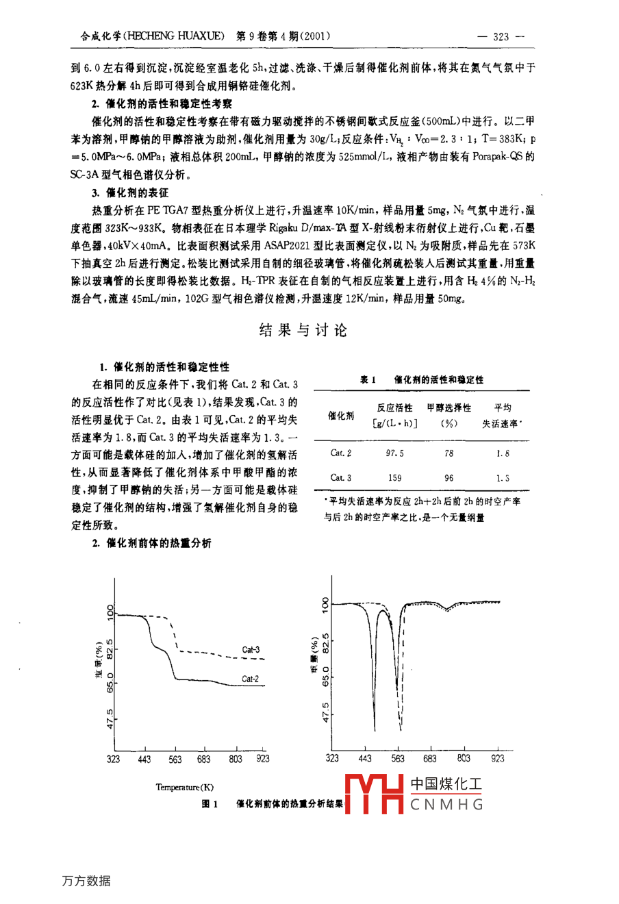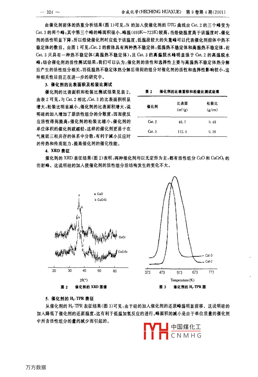 合成化學( HECHENG HUAXUE)第9卷第4期(2001)低溫液相合成甲醇用銅鉻硅催化劑的制備與表征何川華,儲偉,王奎鈴,羅仕忠,吳玉塘,邱發(fā)禮(中國科學院成都有機化學研究所四川成都610041)摘要;采用共沉淀方法制備了一種含C,Cr,S三種組分的復(fù)合氧化物催化劑用于低溫液相合成甲醇用TGDTG對催化劑前體做了表征,用XRD,BETH2TPR,松裝比測試等方法對合成用催化劑作了系列表征并在間歌式高壓反應(yīng)釜中考察了催化劑的活性選擇性和穩(wěn)定性,結(jié)果表明:銅鉻硅催化劑的反應(yīng)活性選擇性和穩(wěn)定性都明顯優(yōu)于銅鉻催化劑其前體中只具有一個高溫熱不穩(wěn)定體,而銅鉻催化劑中具有低溫和高溫兩個熱不穩(wěn)定體,兩種催化劑都以無定型形存在:加入硅后得到的銅鉻硅催化劑結(jié)構(gòu)更加疏松、比表面積更大,其H2TPR的還原溫度更低關(guān)詞:低溫液相合成甲醇;催化劑;銅;鉻;硅;復(fù)合氧化物中圖分類號:T2140643.36文獻標識碼;A章編號:1005-1511(2001)04-322-04世界上兩次能源危機的出現(xiàn)使煤、天然氣等能源的開發(fā)與利用越來越引起人們的廣泛重視。天然氣的開發(fā)與利用由于受氣體難于儲存和運輸、小分子碳氫鍵難于活化等因素的影響而受到限制。目前,天然氣的利用主要是先部分氧化制成合成氣,合成氣再通過F一T合成制得高級烴或由合成氣制成甲醇再發(fā)展其下游化工產(chǎn)品,甲醇本身也可用于車用燃料和燃料電池的燃料。因此,天然氣(甲烷)經(jīng)由合成氣制甲醇的工藝路線已越來越受到廣泛重視由合成氣制甲醇的反應(yīng)是一個強放熱反應(yīng)現(xiàn)有工業(yè)上的高、中壓法由于高溫反應(yīng)使QO的單程轉(zhuǎn)化率較低(約20%),合成氣不得不進行多次循環(huán)從而提高了能耗和產(chǎn)品成本。因此,近十年來,世界上許多發(fā)達國家都很重視低溫液相合成甲醇工藝的研究與開發(fā)-,該工藝可使O單程轉(zhuǎn)化率達90%以上;產(chǎn)品構(gòu)成好,產(chǎn)物可不經(jīng)過醇水分離而直接作為燃料使用。低溫液相合成甲醇的催化劑體系主要有N系和Cu系兩類:Cu系催化劑由于克服了N系催化劑有毒及價格較貴的缺點而受到廣泛重視(-。吳玉塘等6,1開發(fā)的Cu-Cr氧化物超細粉催化劑具有較高的反應(yīng)初活性和較好的產(chǎn)品構(gòu)成,但該催化劑實現(xiàn)工業(yè)化的主要難點在于催化劑體系較易失活。為了克服該催化劑穩(wěn)定性差的不足,本文研制了摻雜第三種組分S的CuCr-S復(fù)合氧化物催化劑,以期能提高催化劑在甲醇合成反應(yīng)中的催化活性和穩(wěn)定性實驗部分1.催化劑的制備銅鉻催化劑(moo:mobo=1:1)(Ca.2)采用銅氨絡(luò)合法制備6。銅鉻硅催化劑(mol:molols=1:1:0.4)Cat3)采用共沉淀法制備10:將定量的NaSO·9HO和(NH)2Cr2O分別溶于水后再混合制得含鉻硅的混合溶液。按一定比例稱取定量的Cu(NO)2·3HO溶于濃氨水中制得銅氨溶液,然后將其慢慢滴加到含鉻硅的混合溶液中,在323K充分攪拌45min后用1:1的稀硝酸調(diào)節(jié)pH值收稿日割:2001-01-18修訂日期:2001-05-28薔金項目:國家自然科學基金(2993011),“973°計劃國家重點基礎(chǔ)研究,四川省青年科技基金會青年學術(shù)帶頭人培養(yǎng)計劃(459)資助項目作者簡介:何川華(1974-)男漢族四川岳池人中國科學院成都有中國煤化工有機催化和催化新材料方面的研究CNMHG通聯(lián)系人:儲偉,研究員博士生導(dǎo)師:e:028-522842, E-mail:chuwei合成化學( HECHENG HUAXUE)第9卷第4期(2001)323一到6.0左右得到沉淀,沉淀經(jīng)室溫老化5h,過濾、洗滌、干燥后制得催化劑前體,將其在氮氣氣氛中于623K熱分解4h后即可得到合成用銅鉻硅催化劑。2.催化劑的活性和穩(wěn)定性考察催化劑的活性和穩(wěn)定性考察在帶有磁力驅(qū)動攪拌的不銹鋼間歇式反應(yīng)釜(500mL)中進行。以二甲苯為溶劑,甲醇鈉的甲醇溶液為助劑,催化劑用量為30g/L;反應(yīng)條件:V1:Vo=23:1;T=383K;p5.0MPa~6.0MPa;液相總體積200mL,甲醇鈉的濃度為525mmd/L,液相產(chǎn)物由裝有 Porapak-QS的SC3A型氣相色譜儀分析3.催化劑的表征熱重分析在 PE IGA7型熱重分析儀上進行,升溫速率10K/min,樣品用量5mg,N2氣氛中進行,溫度范圍32K~933K。物相表征在日本理學 Rigaku d/max-型X射線粉末衍射儀上進行,Cu靶,石墨單色器,40kV×40mA。比表面積測試采用ASAP2021型比表面測定儀,以N為吸附質(zhì),樣品先在573kK下抽真空2h后進行測定。松裝比測試采用自制的細徑玻璃管,將催化劑疏松裝人后測試其重量,用重量除以玻璃管的長度即得松裝比數(shù)據(jù)。H2TPR表征在自制的氣相反應(yīng)裝置上進行,用含H24%的N2-H2混合氣,流速45mL/min,102G型氣相色譜儀檢測,升溫速度12K/min,樣品用量50mg結(jié)果與討論1.催化劑的活性和穩(wěn)定性性在相同的反應(yīng)條件下我們將Ca.2和Cat.3表1催化劑的活性和穩(wěn)定性的反應(yīng)活性作了對比(見表1),結(jié)果發(fā)現(xiàn),Cat.3的活性明顯優(yōu)于Ca.,2。由表1可見,Can.2的平均失催化劑反應(yīng)活性甲醇選擇性平均g/(L·h)](%)活速率活速率為1.8,而Cat3的平均失活速率為1.3方面可能是載體硅的加人,增加了催化劑的氫解活at. 2性,從而顯著降低了催化劑體系中甲酸甲酯的濃Cat. 3度,抑制了甲醇鈉的失活;另一方面可能是載體硅穩(wěn)定了催化劑的結(jié)構(gòu),增強了氫解催化劑自身的穩(wěn)平均失活速率為反應(yīng)2h+2h后前2b的時空產(chǎn)率