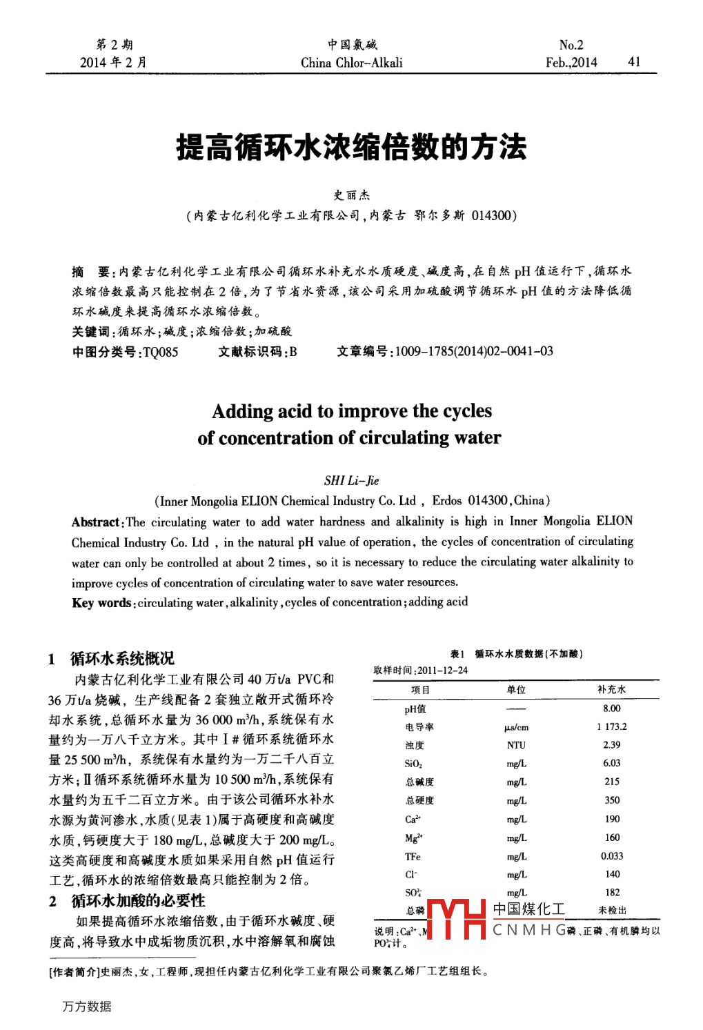 第2期中國(guó)氯堿No. 22014年2月China Chlor-AlkaliFeb,201441提高循環(huán)水濃縮倍數(shù)的方法史麗杰(內(nèi)蒙古億利化學(xué)工業(yè)有限公司,內(nèi)蒙古鄂爾多斯014300)摘要:內(nèi)蒙古億利化學(xué)工業(yè)有限公司循環(huán)水補(bǔ)充水水質(zhì)硬度、堿度高,在自然pH值運(yùn)行下,循環(huán)水濃縮倍數(shù)最高只能控制在2倍,為了節(jié)省水資源,該公司采用加硫酸調(diào)節(jié)循環(huán)水pH值的方法降低循環(huán)水堿度來(lái)提高循環(huán)水濃縮倍數(shù)。關(guān)鍵詞:循環(huán)水;堿度;濃縮倍數(shù);加硫酸中圖分類(lèi)號(hào):TQ085文獻(xiàn)標(biāo)識(shí)碼:B文章編號(hào):1009-1785(2014)02-0041-03Adding acid to improve the cyclesof concentration of circulating waterSHi Li-Jie(Inner Mongolia ELION Chemical Industry Co Ltd, Erdos 014300, China)Abstract: The circulating water to add water hardness and alkalinity is high in Inner Mongolia ELIONChemical Industry Co Ltd, in the natural ph value of operation, the cycles of concentration of circulatingwater can only be controlled at about 2 times, so it is necessary to reduce the circulating water alkalinity toimprove cycles of concentration of circulating water to save water resourcesKey words: circulating water, alkalinity, cycles of concentration; adding acid1循環(huán)水系統(tǒng)概況表1循環(huán)水水質(zhì)數(shù)據(jù)(不加酸)取樣時(shí)間:2011-12-24內(nèi)蒙古億利化學(xué)工業(yè)有限公司40萬(wàn) ta Pvc和單位36萬(wàn)ta燒堿,生產(chǎn)線配備2套獨(dú)立敞開(kāi)式循環(huán)冷項(xiàng)目補(bǔ)充水卻水系統(tǒng),總循環(huán)水量為36000m沿h,系統(tǒng)保有水電導(dǎo)率1173.2量約為一萬(wàn)八千立方米。其中Ⅰ#循環(huán)系統(tǒng)循環(huán)水NTU2.39量25500m3h,系統(tǒng)保有水量約為一萬(wàn)二千八百立6.03方米;Ⅱ循環(huán)系統(tǒng)循環(huán)水量為10500m/h,系統(tǒng)保有總堿度水量約為五千二百立方米。由于該公司循環(huán)水補(bǔ)水總硬度水源為黃河滲水,水質(zhì)(見(jiàn)表1)屬于高硬度和高堿度水質(zhì),鈣硬度大于180mg/L,總堿度大于200mg/L。這類(lèi)高硬度和高堿度水質(zhì)如果采用自然pH值運(yùn)行TFe工藝,循環(huán)水的濃縮倍數(shù)最高只能控制為2倍。2循環(huán)水加酸的必要性總磷中國(guó)煤化工未檢出如果提髙循環(huán)水濃縮倍數(shù),由于循環(huán)水堿度、硬YH度高,將導(dǎo)致水中成垢物質(zhì)沉積,水中溶解氧和腐蝕說(shuō)明:Ca2CNMHG磷、正磷、有機(jī)膦均以作者簡(jiǎn)介史麗杰,女,工程師現(xiàn)擔(dān)任內(nèi)蒙古億利化學(xué)工業(yè)有限公司聚氯乙烯廠工藝組組長(zhǎng)。中國(guó)氟堿2014年第2期性離子的增加以及滋生的菌藻所產(chǎn)生的生物黏泥成達(dá)1082mg,正好接近控制指標(biāo)的上限,而且,碳倍增加,對(duì)循環(huán)水換熱設(shè)備污堵、腐蝕、結(jié)垢危害嚴(yán)酸鈣穩(wěn)定指數(shù)RSI為322,小于330,已經(jīng)到了加酸重輕則被動(dòng)停車(chē)清洗,重則使設(shè)備腐蝕穿孔而報(bào)調(diào)pH值范圍。所以,如果采用pH值自然平衡而不廢,給安全生產(chǎn)帶來(lái)極大隱患。為了保證2套循環(huán)水加酸調(diào)節(jié)pH值,系統(tǒng)能夠承受的最高濃縮倍數(shù)為系統(tǒng)中水冷設(shè)備的長(zhǎng)期、高效、穩(wěn)定運(yùn)行,解決循環(huán)水系統(tǒng)中普遍存在的腐蝕、結(jié)垢和菌藻黏泥的危害,根據(jù)GB500502007的要求及從節(jié)約用水降釆用水質(zhì)穩(wěn)定劑對(duì)循環(huán)冷卻水進(jìn)行化學(xué)處理顯得十低運(yùn)行成本等綜合考慮,加酸降低循環(huán)水堿度,系統(tǒng)分重要。能夠承受的最高濃縮倍數(shù)可以提高到5倍。目前采用加硫酸(一般為98%硫酸)降低循環(huán)4加酸的經(jīng)濟(jì)性水的堿度和pH值、使Ca2、Mg2碳酸鹽轉(zhuǎn)化為硫酸41節(jié)水和節(jié)約藥劑減少的費(fèi)用鹽,是解決循環(huán)水系統(tǒng)不結(jié)垢而普遍采用的方法。循按照設(shè)計(jì)規(guī)范,循環(huán)水不加酸調(diào)節(jié)pH值,濃縮環(huán)水濃縮倍數(shù)要求在40倍以上,加酸是保證循環(huán)倍數(shù)只能在30倍以下運(yùn)行,計(jì)算基準(zhǔn)采用3倍濃水系統(tǒng)安全運(yùn)行的必要保證之縮倍數(shù),加酸后,濃縮倍數(shù)可以在5倍以上運(yùn)行,計(jì)3水質(zhì)穩(wěn)定性判斷算基準(zhǔn)采用5倍濃縮倍數(shù)。不同濃縮倍數(shù)時(shí)各種水循環(huán)冷卻水投入運(yùn)行后,要進(jìn)行結(jié)垢腐蝕性判量的理論計(jì)算值見(jiàn)表3斷,通常采用碳酸鈣飽和指數(shù)及穩(wěn)定指數(shù)來(lái)判斷。在(1)濃縮倍數(shù)由30提高到50時(shí),節(jié)水量的計(jì)算循環(huán)水運(yùn)行中,飽和指數(shù)只能說(shuō)明一種傾向,是一個(gè)系統(tǒng)設(shè)計(jì)參數(shù)定性趨勢(shì),有較大的局限性;穩(wěn)定指數(shù)是在飽和指數(shù)循環(huán)水量:36000mh;保有水量:15000m3;回基礎(chǔ)上發(fā)展起來(lái)的指數(shù),是根據(jù)化學(xué)分析測(cè)出循環(huán)出水溫差:32-42℃;濃縮倍數(shù):4倍;系統(tǒng)材質(zhì):碳水系統(tǒng)中的鈣硬度、堿度、pH值、固形物以及現(xiàn)場(chǎng)實(shí)鋼、不銹鋼銅合金際溫度來(lái)計(jì)算。目前,許多水處理工作者都采用其作每年節(jié)約的補(bǔ)充水量:(2.6-22)%x循環(huán)水量為生產(chǎn)現(xiàn)場(chǎng)的一個(gè)控制