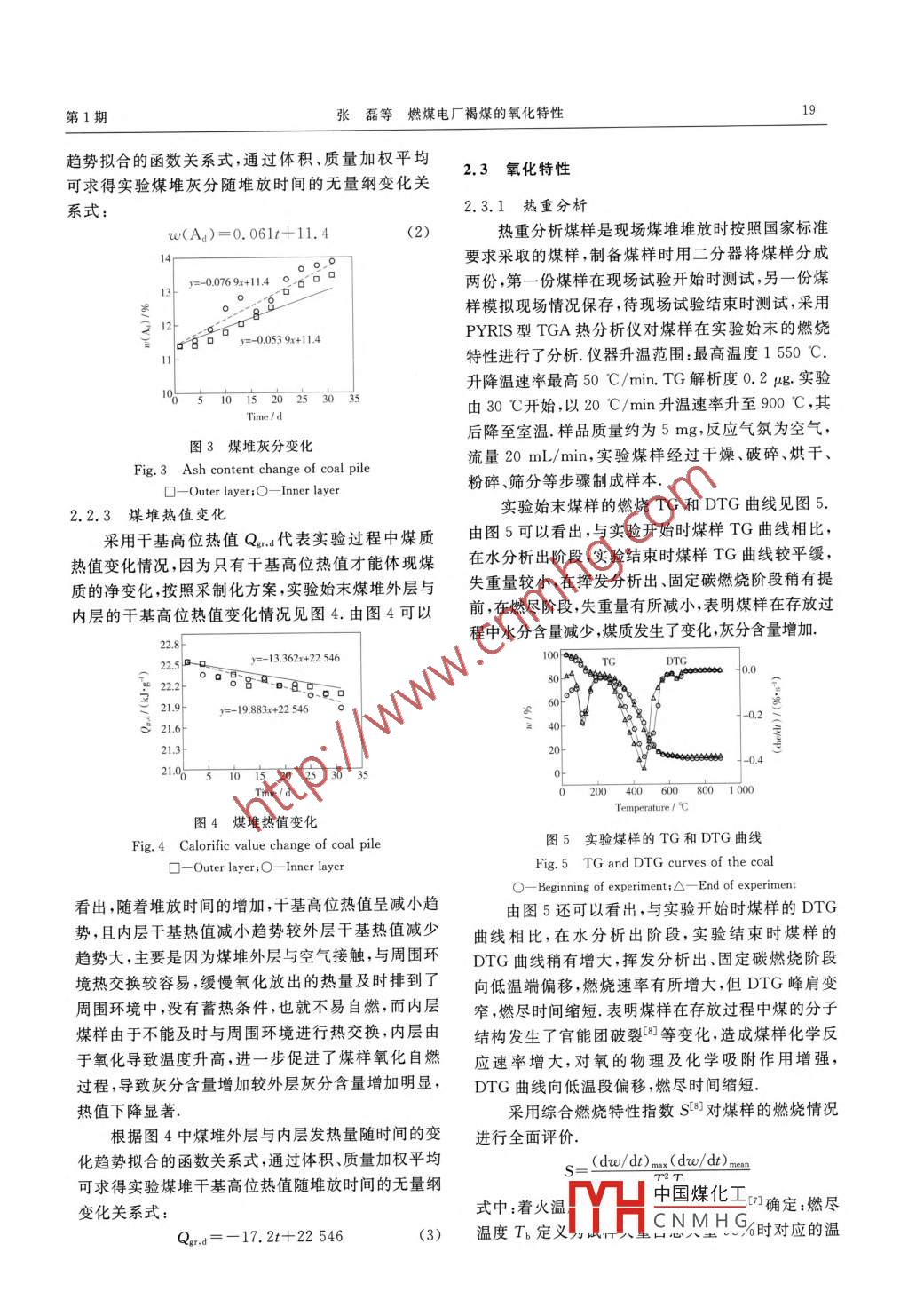 第39卷第1期煤炭轉(zhuǎn)化Vol,39 No. 12016年1月COAL CONVERSIONJan. 2016燃煤電廠褐煤的氧化特性張磊曾彬]秦嶺2)陸超”汪后港3)李小江”摘要針對(duì)燃煤電廠煤場(chǎng)燃料損耗,在電廠煤場(chǎng)和實(shí)驗(yàn)室開(kāi)展了褐煤存儲(chǔ)氧化特性的實(shí)驗(yàn)研究.煤場(chǎng)實(shí)驗(yàn)結(jié)果表明,隨著現(xiàn)場(chǎng)煤堆堆放時(shí)間增加,煤的熱值和水分含量減小,灰分含量增大;煤的大顆粒減小,小顆粒增加,平均粒度減小;實(shí)驗(yàn)室實(shí)驗(yàn)結(jié)果表明,隨著褐煤存放時(shí)間增加,TG曲線變化趨勢(shì)與現(xiàn)場(chǎng)實(shí)驗(yàn)結(jié)果相一致,DTG曲線向低溫段偏移,失重峰值增大,動(dòng)力學(xué)參數(shù)表觀活化能E減小,頻率因子A增大.關(guān)鍵詞燃煤電廠 ,褐煤,煤質(zhì),氧化特性,熱重分析中圖分類(lèi)號(hào)TQ531. 6.云南某電廠常用褐煤在正常堆放下煤堆粒度、水分、0引言灰分和熱值的變化進(jìn)行測(cè)定,另在實(shí)驗(yàn)室中將少量褐煤在相同條件下存放,并用熱重分析法研究其氧為防止缺煤停機(jī)的危險(xiǎn),發(fā)電企業(yè)通常在煤場(chǎng)化燃燒特性,為電廠獲取真實(shí)的煤炭?jī)?chǔ)存過(guò)程中的存儲(chǔ)一定量的煤炭,但是煤炭在存儲(chǔ)過(guò)程中易造成煤質(zhì)變化情況及存儲(chǔ)過(guò)程中氧化燃燒特性變化情況損失,使得發(fā)電成本升高.特別是褐煤具有煤化程度提供參考,以期為電站合理存儲(chǔ)褐煤、降低存儲(chǔ)損失低、熱穩(wěn)定性差、易風(fēng)化等特點(diǎn),在儲(chǔ)存過(guò)程中更易及改善鍋爐燃燒效率提供指導(dǎo).因氧化而發(fā)熱、自燃,對(duì)發(fā)電企業(yè)造成經(jīng)濟(jì)損失,導(dǎo)致煤場(chǎng)存在安全隱患.蘇攀等[1對(duì)褐煤存儲(chǔ)自燃及1實(shí)驗(yàn)部分升溫特性進(jìn)行了實(shí)驗(yàn)研究,李春艷等[2]對(duì)煤存儲(chǔ)過(guò)程中升溫特性及煤質(zhì)變化做了大量實(shí)驗(yàn),王繼仁1.1 實(shí)驗(yàn)煤樣等0對(duì)煤自燃氧化過(guò)程中水分生成機(jī)理進(jìn)行了研究,還有學(xué)者對(duì)褐煤燃燒特性進(jìn)行了大量研究[4+7],實(shí)驗(yàn)煤樣為該廠設(shè)計(jì)常用煤種,實(shí)驗(yàn)時(shí)間為一但是對(duì)褐煤存儲(chǔ)過(guò)程中緩慢氧化特性與燃燒特性之個(gè)月(31 d) ,實(shí)驗(yàn)煤樣的工業(yè)分析.元素分析及發(fā)熱間的相互關(guān)系研究較少.本實(shí)驗(yàn)對(duì)褐煤在煤場(chǎng)堆放量等煤質(zhì)數(shù)據(jù)見(jiàn)表1.由表1可以看出,實(shí)驗(yàn)煤樣在.及實(shí)驗(yàn)室存放過(guò)程中的氧化特性開(kāi)展研究,通過(guò)對(duì)存放過(guò)程中煤質(zhì)發(fā)生了變化,對(duì)比實(shí)驗(yàn)始末,煤樣的表1實(shí)驗(yàn)煤堆煤質(zhì)數(shù)據(jù)Table 1 Coal quality analysis dataProximate analysis(ad) w/%Ultimate analysis(ad) w/%StateQr.a/(J.g-1)MAVFCCHNS0Beginning13.9310. 9731.61 43. 491.0151. 985.06 1. 2414. 8122 546Completion13. 2312. 5036.470.9749. 983.121.213. 2220 718空氣干燥基水分、空氣干燥基固定碳含量減小,空氣1.2實(shí)驗(yàn)煤堆干燥基揮發(fā)分和空氣干燥基灰分增加.元素分析結(jié)果顯示,隨著堆放時(shí)間增加,碳、氫元素比例減少,而對(duì)實(shí)驗(yàn)場(chǎng)地進(jìn)行清理平整,確保實(shí)驗(yàn)場(chǎng)地沒(méi)有煤的發(fā)熱量主要來(lái)源就是煤的碳、氫元素,故發(fā)熱量陳舊煤.為排除天氣下雨等原因?qū)?shí)驗(yàn)的影響,將煤隨著堆放時(shí)間增加而減小.煤質(zhì)發(fā)生變化表明煤樣堆置于干煤棚內(nèi),煤樣粒度大于100 mm,質(zhì)量分?jǐn)?shù)在存放過(guò)程中發(fā)生了緩慢氧化.不大于5%.實(shí)驗(yàn)煤的堆放形狀見(jiàn)第18頁(yè)圖1.煤堆中國(guó)煤化工。國(guó)際科技合作專項(xiàng)項(xiàng)目I (2013DFG61490).MYHCNMHG1)碩士、助理工程師;2)高級(jí)工程師;3)工程師;4)博士.教授級(jí)高級(jí)工程師,華電電;收稿日期:2015-05- 04;修回日期:2015-09-07.18煤炭轉(zhuǎn)化2016年四面梯形,組成底部約為20 mX20 m,按自然堆積置.初次采樣完成后,對(duì)采樣點(diǎn)進(jìn)行標(biāo)記,下一次的角(約60°)堆放,高度為6 m,頂部平整.實(shí)驗(yàn)用煤量采樣點(diǎn)位置應(yīng)位于上一次采樣點(diǎn)的附近,但兩次采大約為1 000 t.樣點(diǎn)不能重復(fù),采樣坑及時(shí)覆蓋.實(shí)驗(yàn)煤堆在實(shí)驗(yàn)過(guò)程中每3 d采樣1次,每次采樣時(shí),分別采集外層(深度0.2 m~1.0 m)煤樣和內(nèi)層(深度2.0 m~4.0 m)煤樣,將采集相同深度的子樣合并成一個(gè)總樣.采集完的樣品立即密封保存,按要求進(jìn)行樣品的6m編碼.采集完的煤樣當(dāng)天完成制樣工作.依據(jù),GB474-2008進(jìn)行制樣,首先應(yīng)進(jìn)行全水分煤樣的_20m制取,后制取一般分析煤樣.圖1實(shí)驗(yàn)用煤組堆示意圖2結(jié)果與討論Fig. l Schematie diagram of experimental coal pile2.1粒度分析1.3煤樣采集與 制備現(xiàn)場(chǎng)實(shí)驗(yàn)煤堆在實(shí)驗(yàn)始末的粒度分布情況見(jiàn)表2.按GB475-2008的采樣要求進(jìn)行采樣點(diǎn)的布由表2可以看出,實(shí)驗(yàn)褐煤的較大顆粒煤樣與堆放表2實(shí)驗(yàn)煤堆粒度分析Table 2 Coal particle size analysis of experimental coal pileDitribution of particle size/%State>25mm13 mm~25 mm6 mm~13 mm 3 mm~6 mm<3mmAverage particle size/ mmBeginning29.1414. 8816. 8613. 2825. 8421