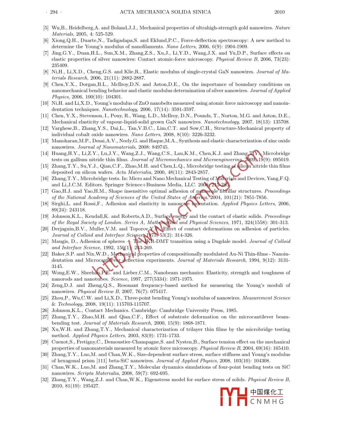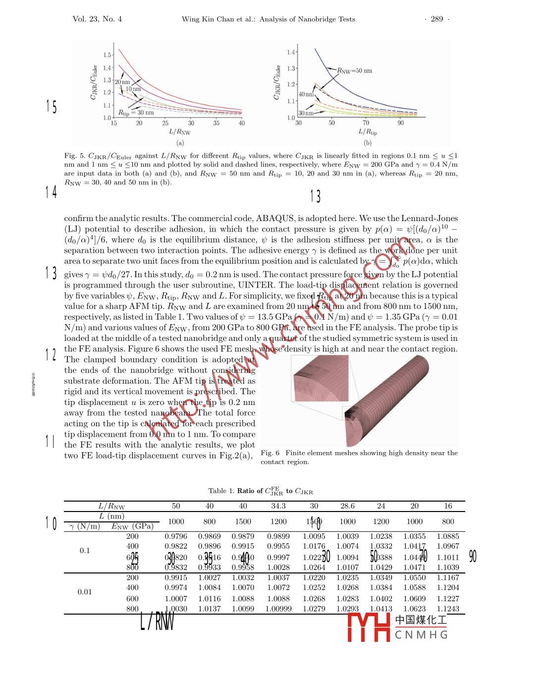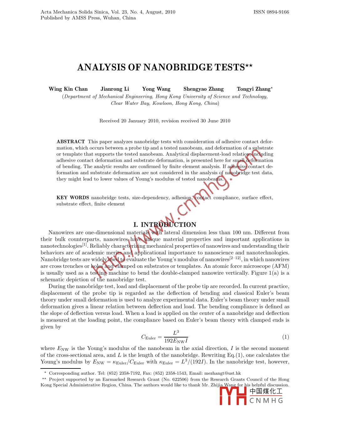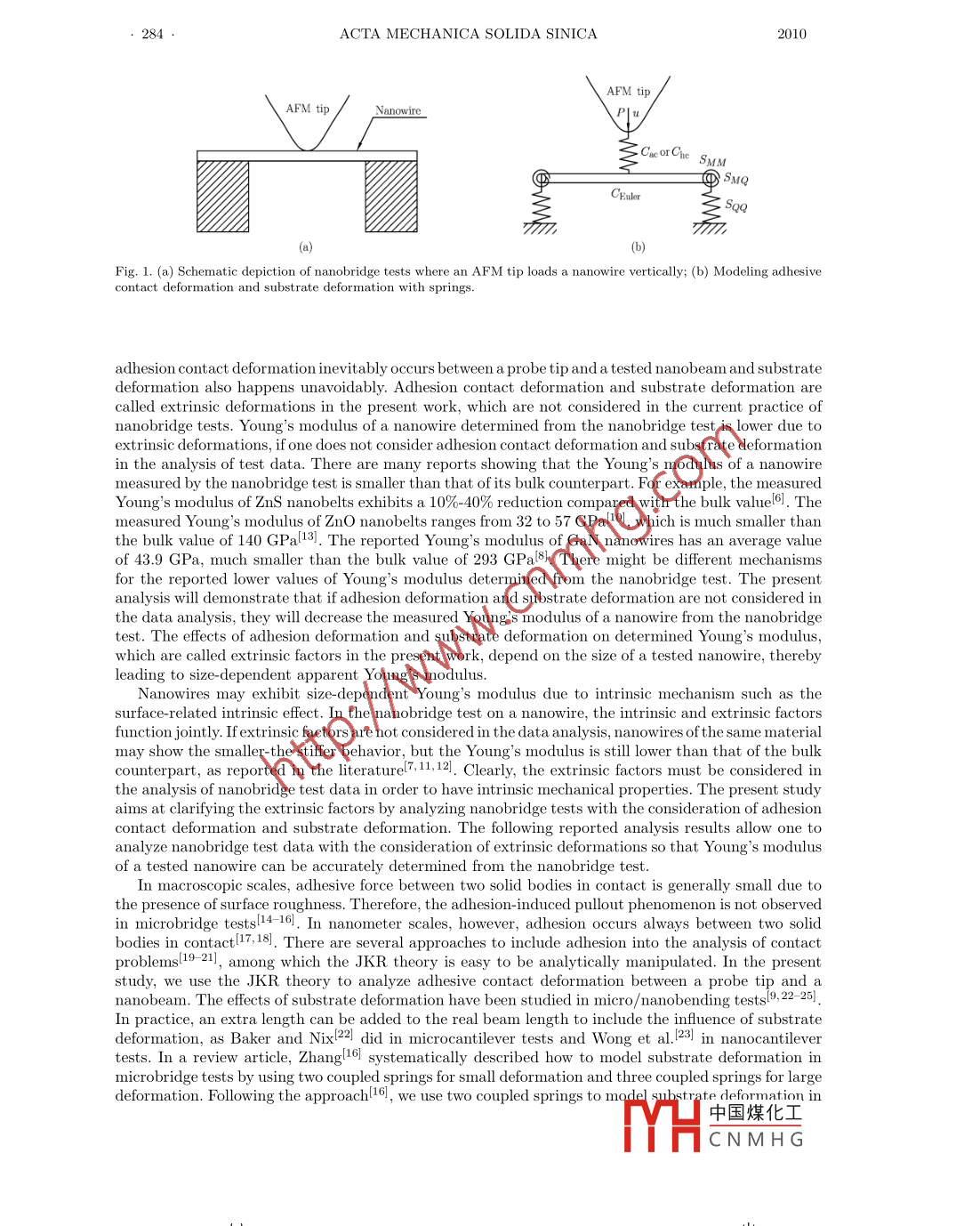 Acta Mechanica Solida Sinica, Vol. 23, No. 4, August, 2010ISSN 0894-9166Published by AMSS Press, Wuhan, ChinaANALYSIS OF NA NOBRIDGE TESTS**Wing Kin ChanJianrong LiYong WangShengyao ZhangTongyi Zhang*(Department of Mechanical Engineering, Hong Kong University of Science and Technology,Clear Water Bay, Kowloon, Hong Kong, China)Received 20 January 2010, revision received 30 June 2010ABSTRACT This paper analyzes nanobridge tests with consideration of adhesive contact defor-mation, which occurs between a probe tip and a tested nanobeam, and deformation of a substrateor template that supports the tested nanobeam. Analytical displacement- load relation, includingadhesive contact deformation and substrate deformation, is presented here for small deformationof bending. The analytic results are confirmed by finite element analysis. If adhesive contact de-formation and substrate deformation are not considered in the analysis of nanobridge test data,they might lead to lower values of Young's modulus of tested nanobeams.KEY WORDS nanobridge tests, size-dependency, adhesion, contact compliance, surface effect,substrate effect, finite elementI. INTRODUCTIONNanowires are one-dimensional materials with lateral dimension less than 100 nm. Different fromtheir bulk counterparts, nanowires have unique material properties and important applications innanotechnologies1. Reliably characterizing mechanical properties of nanowires and understanding theirbehaviors are of academic merits and applicational importance to nanoscience and nanotechnologies.Nanobridge tests are widely used to evaluate the Young s modulus of nanowiresl2 -12), in which nanowiresare cross trenches or holes and clamped on substrates or templates. An atomic force microscope (AFM)is usually used as a testing machine to bend the double- clamped nanowire vertically. Figure 1(a) is aschematic depiction of the nanobridge test.During the nanobridge test, load and displacement of the probe tip are recorded. In current practice,displacement of the probe tip is regarded as the deflection of bending and classical Euler's beamtheory under small deformation is used to analyze experimental data. Euler's beam theory under smalldeformation gives a linear relation between deflection and load. The bending compliance is defined asthe slope of deflection versus load. When a load is applied on the center of a nanobridge and deflectionis measured at the loading point, the compliance based on Euler's beam theory with clamped ends isgiven by3Ceuler = 192EwwI(1where ENw is the Young's modulus of the nanobeam in the axial direction, I is the second momentof the cross-sectional area, and L is the length of the nanobridge. Rewriting Eq.(1), one calculates theYoung's modulus by ENw = KEuler/CEuler with KEuler = L*/(192I). In the nanobridge test, however,★Corresponding author. Tel: (852) 2358-7192, Fax: (852) 2358 1543, Email: mezhangt@ust.hk** Project supported by an Earmarked Research Grant (No. 622506) from the Research GrantsKong Special Administrative Region, China. The authors would like to thank Mr. Zis helpful discussion.中國(guó)煤化工fHCNM HG284.ACTA MECHANICA SOLIDA SINICA2010AFM tip'ln/≤CmorCme SuyMI@傘SsQCEuler(a(bFig. 1. (a) Schematic depiction of nanobridge tests where an AFM tip loads a nanowire vertically; (b) Modeling adhesivecontact deformation and substrate deformation with springs.adhesion contact deformation inevitably occurs between a probe tip and a tested nanobeam and substratedeformation also happens unavoidably. Adhesion contact deformation and substrate deformation arecalled extrinsic deformations in the present work, which are not considered in the current practice ofnanobridge tests. Young s modulus of a nanowire determined from the nanobridge test is lower due toextrinsic deformations, if one does not consider adhesion contact deformation and substrate deformationin the analysis of test data. There are many reports showing that the Young's modulus of a nanowiremeasured by the nanobridge test is smaller than that of its bulk counterpart. For example, the measuredYoung' s modulus of ZnS nanobelts exhibits a 10%-40% reduction compared with the bulk valuel6l. Themeasured Young's modulus of ZnO nanobelts ranges from 32 to 57 GPal10), which is much smaller thanthe bulk value of 140 GPa[13]. The reported Young's modulus of GaN nanowires has an average valueof 43.9 GPa, much smaller than the bulk value of 293 GPal8l. There might be different mechanismsfor the reported lower values of Young's modulus determined from the nanobridge test. The presentanalysis will demonstrate that if adhesion deformation and substrate deformation are not considered inthe data analysis, they will decrease the measured Young' s modulus of a nanowire from the nanobridgetest. The effects of adhesion deformation and substrate deformation on determined Young's modulus,which are called extrinsic factors in the present work, depend on the size of a tested nanowire, therebyleading to size-dependent apparent Young s modulus.Nanowires may exhibit size-dependent Young's modulus due to intrinsic mechanism such as thesurface related intrinsic effect. In the nanobridge test on a nanowire, the intrinsic and extrinsic factorsfunction jointly. If extrinsic factors are not considered in the data analysis, nanowires of the same materialmay show the smaller-the stiffer behavior, but the Young 's modulus is still lower than that of the bulkcounterpart, as reported in the literaturel7,11,121. Clearly, the extrinsic factors must be considered inthe analysis of nanobridge test data in order to have intrinsic mechanical properties. The present studycontact deformation and substrate deformation. The following reported analysis results allow one toanalyze nanobridge test data with the consideration of extrinsic deformations so that Young s modulusof a tested nanowire can be accurately determined from the nanobridge test.In macroscopic scales, adhesive force between two solid bodies i