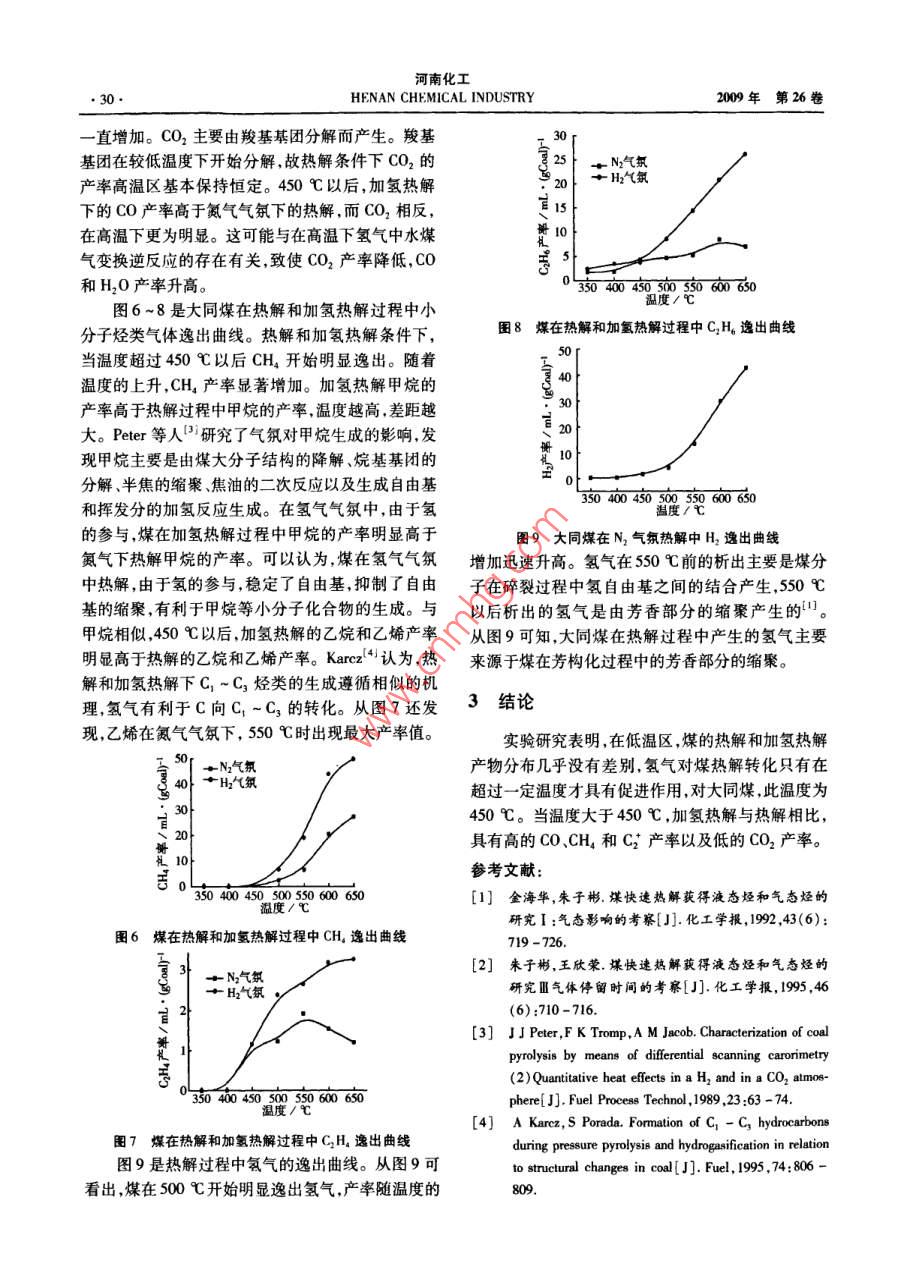 河南化工HENAN CHEMICAL INDUSTRY009年第26卷開發(fā)與研究·大同煤熱解和加氫熱解過程中產(chǎn)物生成規(guī)律的研究劉全潤,胡浩權(quán)(1河南理工大學(xué)材料科學(xué)與工程學(xué)院,河南焦作454000;2.大連理工大學(xué)煤化工研究所,遼寧大連116012)摘要:在壓力2MPa,溫度350~650℃范圍內(nèi),對(duì)比研究了大同煤分別在氪氣和氬氣氣氛下熱解過程中產(chǎn)物的分布和氣體生成規(guī)律。研究教明,煤的熱解和加氫熱解轉(zhuǎn)化率和水產(chǎn)率都隨溫度上升而增加;在熱解條件下,焦油產(chǎn)率在500℃出現(xiàn)最大值。氣對(duì)煤熱解轉(zhuǎn)化只有超過一定溫度才具有促進(jìn)作用,此時(shí)與熱解相比具有較高的COCH4和C產(chǎn)率以及較低的CO2產(chǎn)率。關(guān)鍵詞:煤;熱解;加氨熱解;產(chǎn)物分布中圖分類號(hào):TQ530.2文獻(xiàn)標(biāo)識(shí)碼:A文章編號(hào):1003-3467(2009)12-0028-03Study on Product Generating Ruleof Datong Coal Pyrolysis and HydropyrolysisLIU Quan-run, HU Hao-quan(1. School of Materials Science and Engeering, Henan Polytechnic University, Jiaozuo 454000,Chi-na: 2. Institute of Coal Chemical Engineering, Dalian University of Technology, Dalian 116012China)Abstract: Product distribution and gas generating rule of datong coal pyrolysis at N, and H, atmosphere isstudied at pressure 2 MPa, temperature 350-650C. The result shows, the coal conversion rate and wateryield during pyrolysis and hydropyrolysis increases with temperature increasing tar yield occurs maximumat 500C, hydrogen has promotion to coal pyrolysis only over certain temperature, at the same time, thereaction shows higher yield of CO, CH,, C? and lower yield of CO2 than general pyrolysiKey words: coal pyrolysis; hydropyrolysis product distribution煤的熱解是煤燃燒、氣化和液化等熱轉(zhuǎn)化技術(shù)表l大同煤樣分析數(shù)據(jù)(質(zhì)量分?jǐn)?shù))的基礎(chǔ),煤在惰性氣氛下的熱解和氫氣存在下的熱近似值元素分析解在過去經(jīng)常被分別研究。事實(shí)上,將相同條件下 Me A, va C H N S 0°的熱解和加氫熱解對(duì)比研究可以深入認(rèn)識(shí)煤的加氫912.931.876.94.10.51.616.9熱解機(jī)理,了解氫氣在煤熱解反應(yīng)過程中的作用。注:差值法求得。本文在350-650℃的溫度范圍內(nèi),在氮?dú)鈿夥蘸蜌?2實(shí)驗(yàn)裝置和方法氣氣氛下,對(duì)大同煤的熱解和加氫熱解產(chǎn)物生成規(guī)熱解實(shí)驗(yàn)在加壓固定床熱解反應(yīng)器中進(jìn)行,每律進(jìn)行了系統(tǒng)研究次實(shí)驗(yàn)用煤5g放入反應(yīng)器中央,氮?dú)饣驓錃馔ㄟ^氣體質(zhì)量流量計(jì)控制在0.5Lmin(常壓下)從反應(yīng)1實(shí)驗(yàn)部分器上部進(jìn)入,系統(tǒng)壓力保持2MPa。從室溫加熱到1.1煤樣設(shè)定的熱解溫度約需要10min,熱解產(chǎn)物經(jīng)-20℃選用120目的大同煤其工業(yè)分析和元素分析冷令阱冷卻氣液分離后氣體經(jīng)濕式流量計(jì)計(jì)量后進(jìn)見表1。入氣柜收集,由氣相色譜(天美7890T,TCD檢測收稿日期:200909-28基金項(xiàng)目:河南省教育廳科技攻關(guān)項(xiàng)目(200PB4400河南理工大學(xué)博士基金(648516)作者簡介:劉全潤(1974-),博士,主要從事煤化學(xué)工程和環(huán)境保護(hù)的教學(xué)和研究工作電話:1365391735。第12期劉全潤等:大同煤熱解和加氫熱解過程中產(chǎn)物生成規(guī)律的研究器)分析氣體組成;液體產(chǎn)物用 ASTM D5-83解水)產(chǎn)率才高于熱解的。很多研究者在研究煤的1990)法分離焦油和水。加氫熱解和液化時(shí)都發(fā)現(xiàn),總是在溫度大于某一臨界值(取決于溫度一時(shí)間歷程和煤的性質(zhì),大同煤2實(shí)驗(yàn)結(jié)果和討論為450℃)時(shí),氫氣對(duì)煤的轉(zhuǎn)化才顯現(xiàn)出促進(jìn)作用。2.1熱解和加氫熱解產(chǎn)物分布一般認(rèn)為,煤在熱解過程中,分子之間的橋鍵斷裂形圖1和圖2分別是煤熱解和加氫熱解轉(zhuǎn)化率以成小分子化合物和自由基它們通過擴(kuò)散進(jìn)入氣相。及焦油產(chǎn)率隨溫度的變化情況。由圖可知隨著溫?cái)U(kuò)散過程同時(shí)伴隨反應(yīng)由于自由基極不穩(wěn)定易相度的升高煤的裂解程度加深轉(zhuǎn)化率相應(yīng)增加。熱互結(jié)合縮聚形成焦油和半焦或與氫結(jié)合生成小分解和加氫熱解轉(zhuǎn)化率在450℃以下差別不大,在此子氣態(tài)烴。氫的存在可減少自由基間的相互聚合之后,大同煤的加氫熱解轉(zhuǎn)化率高于一般熱解轉(zhuǎn)化因此有學(xué)者認(rèn)為氫是自由基的穩(wěn)定劑。在煤的率在650℃時(shí)比氮?dú)庀碌臒峤廪D(zhuǎn)化率高97%,加氫熱解過程中,因氫的參與降低了膠質(zhì)體固化和此時(shí)的熱解和加氫熱解的轉(zhuǎn)化率分別為25.2%和自由基縮聚的機(jī)會(huì),有利于轉(zhuǎn)化率的提高。359%。同樣地,在450℃以后加氫熱解焦油產(chǎn)率11開始高于熱解焦油產(chǎn)率。熱解過程中,低溫區(qū)焦油之N氣氫產(chǎn)率隨著溫度的升高而升高,500℃時(shí)出現(xiàn)最大值,此后焦油產(chǎn)率略有下降。在加氫熱解過程中,焦油產(chǎn)率隨溫度的升高而升高,60℃以后變化不大。在氮?dú)鈿夥障聼峤?500℃時(shí)的焦油收率為10.3%,5如如如動(dòng)動(dòng)在氫氣氣氛下熱解,650℃時(shí)焦油產(chǎn)率為14.1%。溫度/℃圖3煤熱解和加氫熱解過程中水的產(chǎn)率“如B氣數(shù)2.2熱解和加氫熱解氣體生成規(guī)律H2氣氛?qǐng)D4和圖5是熱解和加氫