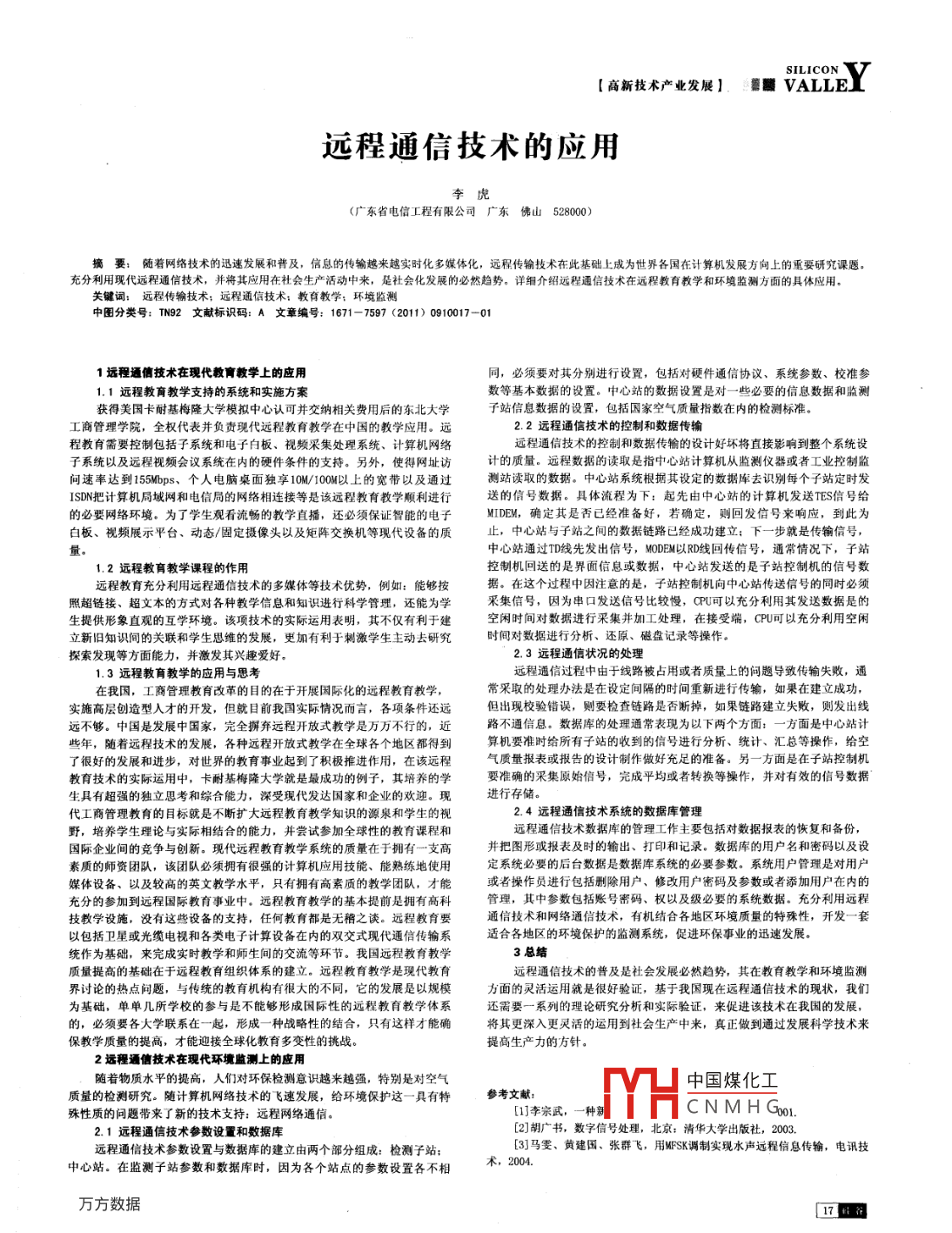 SILICONEY【高新技術(shù)產(chǎn)業(yè)發(fā)展】器國(guó)ALLE遠(yuǎn)程通信技術(shù)的應(yīng)用李虎(廣東省電信工程有限公司廣東佛山528000摘要:隨著網(wǎng)絡(luò)技術(shù)的迅速發(fā)展和普及,信息的傳輸越來(lái)越實(shí)時(shí)化多媒體化,遠(yuǎn)程傳輸技術(shù)在此基礎(chǔ)上成為世界各國(guó)在計(jì)算機(jī)發(fā)展方向上的重要研究課題充分利用現(xiàn)代遠(yuǎn)程通信技術(shù),并將其應(yīng)用在社會(huì)生產(chǎn)活動(dòng)中來(lái),是社會(huì)化發(fā)展的必然趨勢(shì)。詳細(xì)介紹遠(yuǎn)程通信技術(shù)在遠(yuǎn)程教育教學(xué)和環(huán)境監(jiān)測(cè)方面的具體應(yīng)用關(guān)鍵詞:遠(yuǎn)程傳輸技術(shù);遠(yuǎn)程通信技術(shù);教育教學(xué);環(huán)境監(jiān)測(cè)中圖分類(lèi)號(hào):TN92文獻(xiàn)標(biāo)識(shí)碼:A文章編號(hào):1671-7597(2011)0910017-011運(yùn)程通信技術(shù)在現(xiàn)代教育教學(xué)上的應(yīng)用同,必須要對(duì)其分別進(jìn)行設(shè)置,包括對(duì)硬件通信協(xié)議、系統(tǒng)參數(shù)、校準(zhǔn)參1.1遠(yuǎn)程教育教學(xué)支持的系統(tǒng)和實(shí)施方案數(shù)等基本數(shù)據(jù)的設(shè)置。中心站的數(shù)據(jù)設(shè)置是對(duì)一些必要的信息數(shù)據(jù)和監(jiān)測(cè)獲得美國(guó)卡耐基梅隆大學(xué)模擬中心認(rèn)可并交納相關(guān)費(fèi)用后的東北大學(xué)子站信息數(shù)據(jù)的設(shè)置,包括國(guó)家空氣質(zhì)量指數(shù)在內(nèi)的檢測(cè)標(biāo)準(zhǔn)。工商管理學(xué)院,全權(quán)代表并負(fù)責(zé)現(xiàn)代遠(yuǎn)程教育教學(xué)在中國(guó)的教學(xué)應(yīng)用。遠(yuǎn)2.2遠(yuǎn)程通信技術(shù)的控制和數(shù)據(jù)傳輸程教育需要控制包括子系統(tǒng)和電子白板、視頻采集處理系統(tǒng)、計(jì)算機(jī)網(wǎng)絡(luò)遠(yuǎn)程通信技術(shù)的控制和數(shù)據(jù)傳輸?shù)脑O(shè)計(jì)好壞將直接影響到整個(gè)系統(tǒng)設(shè)子系統(tǒng)以及遠(yuǎn)程視頻會(huì)議系統(tǒng)在內(nèi)的硬件條件的支持。另外,使得網(wǎng)址訪計(jì)的質(zhì)量。遠(yuǎn)程數(shù)據(jù)的讀取是指中心站計(jì)算機(jī)從監(jiān)測(cè)儀器或者工業(yè)控制監(jiān)問(wèn)速率達(dá)到155bps、個(gè)人電腦桌面獨(dú)享10M/100N以上的寬帶以及通過(guò)測(cè)站讀取的數(shù)據(jù)。中心站系統(tǒng)根據(jù)其設(shè)定的數(shù)據(jù)庫(kù)去識(shí)別每個(gè)子站定時(shí)發(fā)ISDN把計(jì)算機(jī)局域網(wǎng)和電信局的網(wǎng)絡(luò)相連接等是該遠(yuǎn)程教育教學(xué)順利進(jìn)行送的信號(hào)數(shù)據(jù)。具體流程為下:起先由中心站的計(jì)算機(jī)發(fā)送TE信號(hào)給的必要網(wǎng)絡(luò)環(huán)境。為了學(xué)生觀看流暢的教學(xué)直播,還必須保證智能的電子 MIDEV,確定其是否已經(jīng)準(zhǔn)備好,若確定,則回發(fā)信號(hào)來(lái)響應(yīng),到此為白板、視頻展示平臺(tái)、動(dòng)態(tài)/固定攝像頭以及矩陣交換機(jī)等現(xiàn)代設(shè)備的質(zhì)止,中心站與子站之間的數(shù)據(jù)鏈路已經(jīng)成功建立;下一步就是傳輸信號(hào)中心站通過(guò)TD線先發(fā)出信號(hào), MODEM以RD線回傳信號(hào),通常情況下,子站1.2遠(yuǎn)程教育教學(xué)課程的作用控制機(jī)回送的是界面信息或數(shù)據(jù),中心站發(fā)送的是子站控制機(jī)的信號(hào)數(shù)遠(yuǎn)程教育充分利用遠(yuǎn)程通信技術(shù)的多媒體等技術(shù)優(yōu)勢(shì),例如:能夠按據(jù)。在這個(gè)過(guò)程中因注意的是,子站控制機(jī)向中心站傳送信號(hào)的同時(shí)必須照超鏈接、超文本的方式對(duì)各種教學(xué)信息和知識(shí)進(jìn)行科學(xué)管理,還能為學(xué)集信號(hào),因?yàn)榇诎l(fā)送信號(hào)比較慢,CPU可以充分利用其發(fā)送數(shù)據(jù)是的生提供形象直觀的互學(xué)環(huán)境。該項(xiàng)技術(shù)的實(shí)際運(yùn)用表明,其不僅有利于建空閑時(shí)間對(duì)數(shù)據(jù)進(jìn)行采集并加工處理,在接受端,CP可以充分利用空閑立新舊知識(shí)間的關(guān)聯(lián)和學(xué)生思維的發(fā)展,更加有利于刺激學(xué)生主動(dòng)去研究時(shí)間對(duì)數(shù)據(jù)進(jìn)行分析、還原、磁盤(pán)記錄等操作。探索發(fā)現(xiàn)等方面能力,并激發(fā)其興趣愛(ài)好2.3遠(yuǎn)程通信狀況的處理1.3遠(yuǎn)程教育教學(xué)的應(yīng)用與思考遠(yuǎn)程通信過(guò)程中由于線路被占用或者質(zhì)量上的問(wèn)題導(dǎo)致傳輸失敗,通在我國(guó),工商管理教育改革的目的在于開(kāi)展國(guó)際化的遠(yuǎn)程教育教學(xué)常采取的處理辦法是在設(shè)定間隔的時(shí)間重新進(jìn)行傳輸,如果在建立成功實(shí)施高層創(chuàng)造型人才的開(kāi)發(fā),但就目前我國(guó)實(shí)際情況而言,各項(xiàng)條件還遠(yuǎn)但出現(xiàn)校驗(yàn)錯(cuò)誤,則要檢查鏈路是否斷掉,如果鏈路建立失敗,則發(fā)出線遠(yuǎn)不夠。中國(guó)是發(fā)展中國(guó)家,完全摒棄遠(yuǎn)程開(kāi)放式教學(xué)是萬(wàn)萬(wàn)不行的,近路不通信息。數(shù)據(jù)庫(kù)的處理通常表現(xiàn)為以下兩個(gè)方面:一方面是中心站計(jì)些年,隨著遠(yuǎn)程技術(shù)的發(fā)展,各種遠