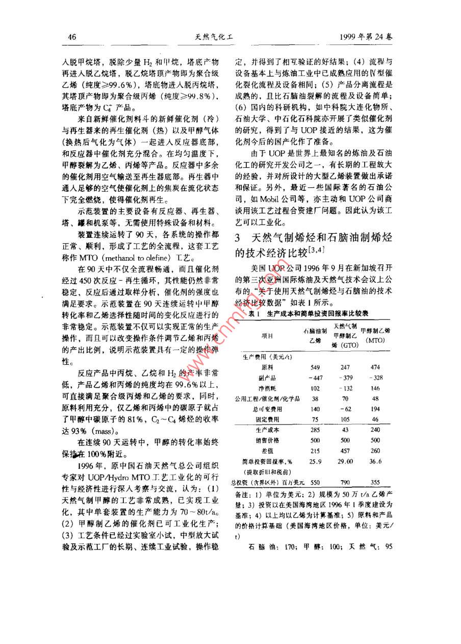 天然氣化工1999年第24卷天然氣制烯烴及GSMTO工藝進(jìn)展齊勝遠(yuǎn)(中國石化蘭州設(shè)計(jì)院蘭州730060)摘要:介紹了天然氣制烯烴的3種研究方向,天然氣直接制烯烴;天然氣經(jīng)合成氣制烯烴;天然氣經(jīng)甲醉制烯烴(GSMTO), 簡介了(GSMTO工藝技術(shù),比較了天然氣制烯烴與石腦油制烯烴的經(jīng)濟(jì)性,并介紹了GSM.TO工藝實(shí)現(xiàn)工業(yè)化的難點(diǎn)。關(guān)鍵詞:天然氣;烯烴;開發(fā)研究; (GSMTUO工藝中圖分類號(hào): TQ22I. 21; TE646文獻(xiàn)標(biāo)識(shí)碼: A .文章編號(hào): 1001-9219 (1999) 0444-04都進(jìn)行了天然氣化工利用的研究開發(fā)工作,并0引言且取得了令世界屬目的成果。尤其是以天然氣1994年第二次全國油氣資源評(píng)價(jià)結(jié)果,為原料經(jīng)甲醇制烯烴的工藝技術(shù)(簡 稱GSM-天然氣資源量38萬億n',到1996年底累計(jì)探TO)基本具備了大型工業(yè)化的條件。如果天明天然氣地質(zhì)儲(chǔ)量15276 億m',探明程度僅為然氣制烯烴裝置建成,它必將為天然氣化工的資源量的4%,今后具有很大的發(fā)展?jié)摿發(fā)展開辟新途徑,有助于天然氣資源的大規(guī)模天然氣是一種高效優(yōu)質(zhì)清潔能源,因用途開發(fā)利用,是解決石油資源持續(xù)短缺的重大舉.越來越廣,需求量不斷增加。1995 年世界天.措。因此,實(shí)現(xiàn)天然氣制烯烴的工業(yè)化具有重然氣消費(fèi)結(jié)構(gòu)中化工原料用氣儀占5%,可見,大的意義,發(fā)展天然氣化工勢(shì)在必行?;ぴ嫌脷馑急壤苄?,主要用于生產(chǎn)合.1天然氣制烯烴的研究開發(fā)方向成氨、甲醇、乙炔等產(chǎn)品及下游化工產(chǎn)品。而目前占基礎(chǔ)有機(jī)化工原料消耗第--和第二位的天然氣制烯烴的研究開發(fā)主要集中在如下乙烯和丙烯主要以石腦油、輕柴油等為原料。3個(gè)方面S)。由于石油資源的持續(xù)短缺,以及近年來可持續(xù)1.1 天然氣直接制烯烴發(fā)展戰(zhàn)略的要求,世界上的一些著名石油公司天然氣中含有95%左右甲烷,用甲烷制取烯烴是最佳的工藝路線,但技術(shù)復(fù)雜,難度大。收稿日期: 1999-01-28目前主要有以下幾種方法。eEecEE eeeeeceeceeeeeeseeeeeeeeeeeseeeeetseeceeeeeeeececccseeeee石油化工,199, 28 (2): 73~77.nese Academy of Sciences, Dalian 116023)[22]李東風(fēng).張吉瑞.異丙苯合成失活FX-01催化The development in process and catalyst for劑的燒炭再生[J]. 石油化工,1997, 26 (11):production of isopropylbenzene by alkylation of764 - 769.benzene with propylene is described. CatalyticResearch progress in sieve catalysts for alkyla-distillation technology has been appied to thetion of benzene with propyleneprocess. A series of mordenite, ZSM Y, β andMCM zeolites were used as catalysts, and someXIF Su-juan, WANG Qing-riapositive results have been obtained.(Dalian Institute of Chemistry & Physics, Chi-Key words: isopropylbenzene; sieve cata-lvsts第4期齊勝遠(yuǎn):天然氣制烯烴及GSMTO工藝展望451.1.1甲烷-氯氣高溫反應(yīng)1.3天然氣經(jīng) 甲醇制烯烴(2.3]美國南加利福尼亞大學(xué)烴研究所Benson天然氣制取甲醇的單系列、大規(guī)模工業(yè)化教授首先研究開發(fā)此項(xiàng)工藝。采用甲烷和氯氣的技術(shù)十分成熟。而由甲醇制取烯烴的工業(yè)化在1700~ 2000C的高溫下以極短接觸時(shí)間研究也已進(jìn)行了多年。國際上的一些著名的大(10~ 80ms)進(jìn)行反應(yīng)。此法可使85%的甲烷石油和化學(xué)公司都投入了大量的力量,如美孚原料轉(zhuǎn)化為乙烷、乙烯、乙炔和其它化合物,石油公司(Mobil)、 巴斯夫公司(BASF)、 埃生成約2.5% (mass) 的較高級(jí)烯烴和一些芳克森石油公司(Exxon)、 環(huán)球油品公司烴,此項(xiàng)工藝由于某些技術(shù)難點(diǎn)難以突破,尚(UOP)和海德羅公司(Norsk Hydro)等均進(jìn)無工業(yè)化的可能。.行了多年的研究。1.1.2氯催化氧化法甲醇制烯烴的工藝過程主要分為反應(yīng)系美國伊利諾斯工學(xué)院研究發(fā)現(xiàn),甲烷在氯統(tǒng)、分離凈化系統(tǒng)和催化劑再生系統(tǒng)。這幾個(gè)催化作用下,可氧化熱解生成乙烯和乙炔,經(jīng)工藝過程的原理和機(jī)理均比較成熟,因此研究美國氣體研究所和動(dòng)力學(xué)技術(shù)公司評(píng)價(jià),認(rèn)為的重點(diǎn)在催化劑的篩選和制備技術(shù)方面。該方法具有良好經(jīng)濟(jì)性,比一-般方法成本低Mobil公司提出了一種使用ZSM-5催化20%,但目前仍只處于實(shí)驗(yàn)室研究階段。劑,在列管式反應(yīng)器中進(jìn)行甲醇轉(zhuǎn)化制烯烴的1.1.3熱擴(kuò) 散反應(yīng)管法工藝流程,但催化劑的壽命尚不理想。BASF該法是日本千葉工業(yè)大學(xué)開發(fā)的一種方公司采用沸石催化劑,初步試驗(yàn)結(jié)果是C2 -法。采用內(nèi)熱式(管中裝有鎢絲加熱)熱擴(kuò)散C4烯烴的收率為50% ~60% (mass), 收率太反應(yīng)管為反應(yīng)器,在常壓和1200進(jìn)行反應(yīng),低。UOP公司也進(jìn)行了多年的研究,該公司在反應(yīng)器下部生成乙烯,最高轉(zhuǎn)化率為篩選出的催化劑稱作MTO- 100,其主要成分10.8%,乙烯收率為7.6% (mass), 選擇性是SAPO-34(即硅、鋁、磷),這種催化劑的為91%,所得C2餾分大部分為乙烯、乙烷、選擇性高于ZSM-5類催化劑,Cr~Ca烯烴乙炔含量極少。此工藝轉(zhuǎn)化率低、收率低,工的收率達(dá)93% (mass)。 可以看出,MTO -業(yè)化意義不大。.100催化劑的收率最高。1.1.4甲烷催化氧化