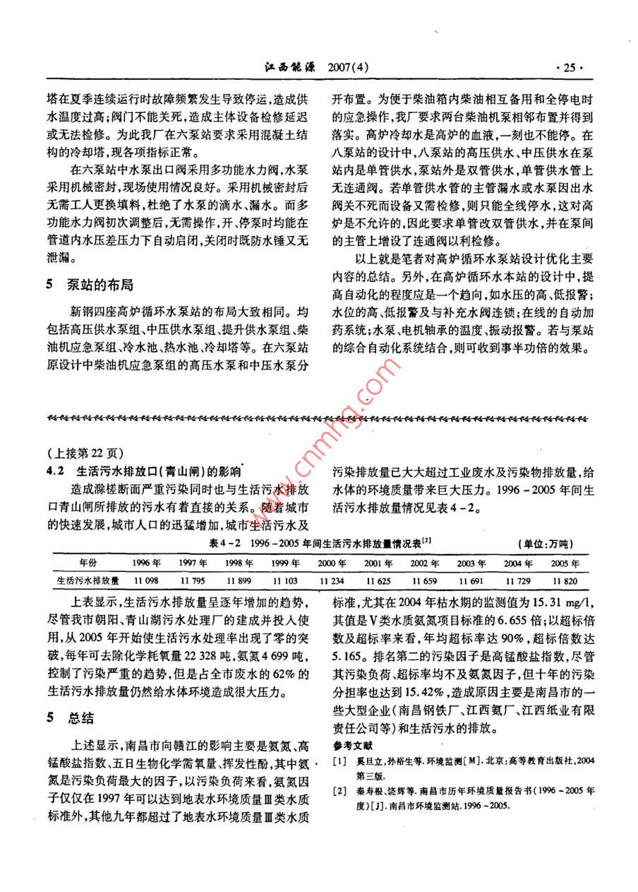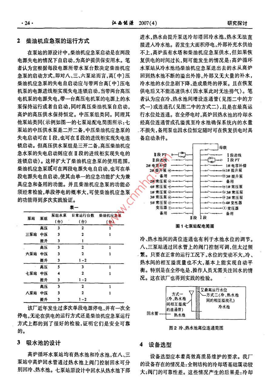 江西能縹2007(4)23高爐循環(huán)水泵站的設計優(yōu)化鄒穎戈文金(江西新余鋼鐵有限責任公司第一動力廠江西新余338001)摘要:高爐冷卻水泵站是高爐的重要配套設施。文章總結了新鋼已建三個循環(huán)水泵站的建設經(jīng)驗,對新建的6#高爐循環(huán)水泵站的設計方面作了較全面的優(yōu)化。在循環(huán)水泵站的設計和管理方面有很好的借鑒意義關鍵詞:高爐循環(huán)水泵站;設計運行方式;優(yōu)化中圖分類號:T284.7文獻標識碼:B文章編號:10057676(200)040303Abstract: The circulating-water pump house of blast fumace is the important accessorial facilities. The construction expe-rience of three circulating- water pump houses which has been built are summarized in this paper. The design for the newlybuilt circulating-water pump house of the No, 6 blast fumace is overall optimized. These design and management can be usedKey words: circulating-water pump house of blast fumace: desigthod; optimization新余鋼鐵公司近幾年新建了五座高爐配套設計備即一段電源帶泵站所有的負荷另一段備用,在建設了4個高爐循環(huán)水泵站。按高爐建設的先后順用電失電時,通過電源柜自切實現(xiàn)安全供電。序泵站名分別為八泵站、三泵站、七泵站、六泵站。筆者認為該供電方式有欠妥之處,主要原因有除了三泵站對應1#2#爐外,其他泵站名稱均與高爐若在用電源失電備用電源自投回路故障不能自投,名稱對應。這四個循環(huán)水泵站均由第一動力廠負責則泵站全面失電;若電機發(fā)生故障電機柜發(fā)生拒跳,管理或電氣故障發(fā)生在母線上,引起在用電源跳閘失電在新建的四個高爐循環(huán)水泵站中以最后投運的而備用電源自投會造成備用電源再次跳閘失電則泵六泵站最為完善。這主要是該廠通過在總結八站全面失電;若泵站外部電氣故障,在用電源失電,而七泵站投運的經(jīng)驗,逐步對高爐循環(huán)水泵站的設計進該電源進線柜拒跳,造成備用電源不能自投,則泵站行完善和優(yōu)化的結果。下面就安全運行方式設計、吸全面失電?!沧?該廠中置式高壓斷路器因機械電氣水池設計、泵站布局等方面的完善和優(yōu)化做簡要介等原因多次出現(xiàn)不能動作的故障〕以上情況均嚴重紹影響到高爐的正常供水。筆者認為七泵站兩段電源1安全運行方式設計都應投入且分段運行(七泵站配電簡圖見圖一,八、三、六泵站的配電與七泵站類同),I段帶高壓泵組三、六、七、八泵站均是高爐水系統(tǒng)自循環(huán)的泵中的二臺,中壓泵組中的兩臺提升泵組中的一臺;Ⅱ站,運行模式相近且都相對平穩(wěn)。三六、八泵站高壓段帶高壓泵組中的三臺,中壓泵組中的二臺,提升泵泵、中壓泵、提升泵各三臺,七泵站高壓泵五臺、中壓組中的兩臺。泵組內(nèi)的水泵間設定備自投。同一泵泵四臺、提升泵三臺。每個泵站有高壓、中壓供水柴組內(nèi)的水泵事故跳閘則該泵組內(nèi)備用泵自啟動。當油機應急供水泵各一臺。各泵站水泵日常運行情況一段電源失電時,備用泵或柴油機應急泵自啟動,然見表一。后查明原因決定是否倒換電源這樣高爐的正常供1.1供電及運行方式水不受單段電源失電的影響提高了供水的安全性。在七泵站的原設計中,原設計是兩段供電,一用收稿日期:20070806作者簡介:鄒穎(1972-)男湖南醴陵人,畢業(yè)于包頭鋼鐵學院給排水專業(yè),工程師現(xiàn)從事給排水專業(yè)技術及管理工作24江西能縹2007(4)研究探討2柴油機應急泵的運行方式進水,熱水由提升泵送冷卻塔回冷水池,熱水無法直接進入冷水池。若發(fā)生大面積停電,外部補充水供給在泵站的原設計中,柴油機應急泵啟動是在兩段不上,高爐雖有水塔和柴油機應急泵供水,但如果恢電源失電的情況下自啟動,為高爐提供保安用水。筆復供電的時間過長,則可能發(fā)生的情況是:高爐循環(huán)者認為宜根據(jù)每段電源所帶水泵臺數(shù)決定柴油機應水泵站從冷水池經(jīng)柴油機應急泵送出去的水從高爐急泵的啟動方式,即對八、三、六泵站而言高〔中〕壓回到熱水池不斷的溢出外排,外部又無大量的補水,柴油機應急泵的失電自啟動應與帶兩臺高[中〕壓電冷水池的水位急劇下降,造成最終的停泵。且在恢復機泵的電源進線柜實現(xiàn)失電連鎖啟動,當帶兩臺高壓供電后又不能迅速供水(因水泵此時無法排氣)。筆電機泵的電源失電,帶一臺高壓電機泵的電源上的水者認為應在冷、熱水池間增設連通管(見圖二中的方泵保持運行或者自啟動,同時高壓柴油機泵自啟動,式一)或連通孔(見圖二中的方式二),且是在最高運高爐的高壓供水保持恒定。中壓泵組類同。同理其行水位處連通。在全停電時,高爐回熱水池的冷卻水他泵站類同(示例如圖一的七泵站配電簡圖所示:七經(jīng)高位連通管或孔溢流至冷水池確保系統(tǒng)內(nèi)的水量泵站的中壓供水泵是二開二備中壓柴油機應急泵的不損失,備用泵也因水位恒定隨時可在恢復供電時具失電啟動可在I段,也可在Ⅱ段的進線柜實現(xiàn)失電連備啟動條件。鎖啟動。但高壓供水泵組是三開二備,高壓柴油機應母聯(lián)急水泵的失電啟動則應在Ⅱ段的進線柜實現(xiàn)失電的Ⅱ段PTI段進線連鎖啟動)。這樣擴大了柴油機應急泵的使用范圍,Ⅱ段進線I段PT柴油機應急泵既可在兩段電源失電自啟動,也可在單2#電容補償1#電容補償2#提升泵問】#提升泵段電源失電自啟動