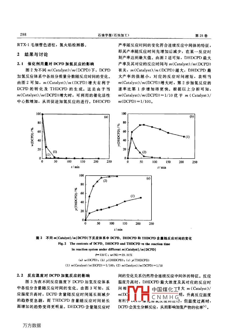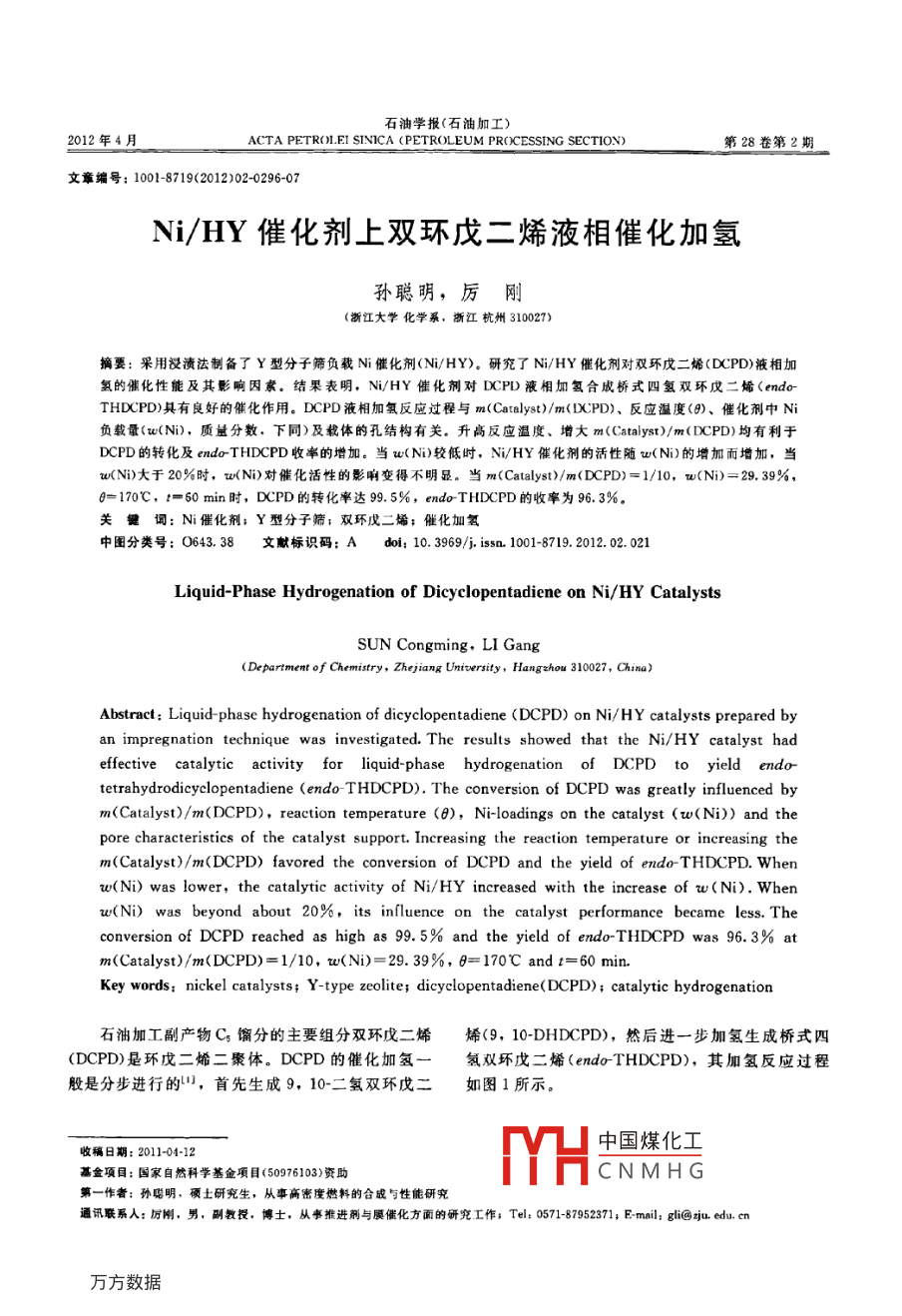 石油學(xué)報(bào)(石油加工)2012年4月ACTA PETROLEI SINICA (PETROLEUM PROCESSING SECTION)第28卷第2期文章編號(hào):1001-8719(2012)02-0296-07Ni/HY催化劑上雙環(huán)戊二烯液相催化加氫孫聰明,厲剛(浙江大學(xué)化學(xué)系,斷江杭州310027)摘要:采用浸漬法制備了Y型分子篩負(fù)載Ni催化劑(Ni/HY)。研究了Ni/HY催化劑對(duì)雙環(huán)戊二烯(DCPD)液相加氫的催化性能及其影響因素。結(jié)果表明,Ni/HY催化劑對(duì)DCPD液相加氫合成橋式四氫雙環(huán)戊二烯(endoTHDCPD)具有良好的催化作用。DCPD液相加氫反應(yīng)過(guò)程與m( Catalyst)/m(DCPD)、反應(yīng)溫度(8)、催化劑中Ni負(fù)載量(w(N),質(zhì)量分?jǐn)?shù),下同)及載體的孔結(jié)構(gòu)有關(guān)。升高反應(yīng)溫度、增大m( Catalyst)/m(DCPD)均有利于DCPD的轉(zhuǎn)化及 endo-THDCPD收率的增加。當(dāng)w(N)較低時(shí),Ni/HY催化劑的活性隨v(Ni)的增加而增加,當(dāng)w(Ni)大于20%時(shí),w(N)對(duì)催化活性的影響變得不明顯。當(dāng)m( Catalyst)/m(DCPD)=1/10,w(Ni)=29.39%,=170℃,t=60min時(shí),DCPD的轉(zhuǎn)化率達(dá)99.5%, endo-THDCPD的收率為96.3%關(guān)鍵詞:N催化劑;Y型分子篩;雙環(huán)戊二烯;催化加氫中圖分類號(hào):O643.38文獻(xiàn)標(biāo)識(shí)碼:Adoi:10.3969/j.issn.1001-8719.2012.02,021Liquid-Phase Hydrogenation of Dicyclopentadiene on Ni/HY CatalystsSUN Congming, LI Gang(Department of Chemistry, Zhejiang University, Hangshou 310027, China)Abstract: Liquid-phase hydrogenation of dicyclopentadiene(DCPD)on Ni/HY catalysts prepared byan impregnation technique was investigated. The results showed that the Ni/HY catalyst hadeffective catalytic activity for liquid-phase hydrogenation of dCpd to yield endo-tetrahydrodicyclopentadiene (endo- THDCPD). The conversion of DCpD was greatly influenced bym(Catalyst)/m(DCPD), reaction temperature (0), Ni-loadings on the catalyst (w(Ni))and thepore characteristics of the catalyst support. Increasing the reaction temperature or increasing them(Catalyst)/m(DCPD) favored the conversion of DCPD and the yield of endo-THDCPD. Whenw(Ni)was lower, the catalytic activity of Ni/hY increased with the increase of w(Ni). Whenw(Ni) was beyond about 20%, its influence on the catalyst performance becameconversion of DCPD reached as high as 99. 5% and the yield of endo-THDCPD wasm(Catalyst)/m(DCPD)=1/10, w(Ni)=29. 39%, 8=170C and t=60 minKey words: nickel catalysts; Y-type zeolite; dicyclopentadiene( DCPD); catalytic hydrogenation石油加工副產(chǎn)物Cs餾分的主要組分雙環(huán)戊二烯烯(9,10 DHDCPD),然后進(jìn)一步加氫生成橋式四(DCPD)是環(huán)戊二烯二聚體。DCPD的催化加氫一氫雙環(huán)戊二烯( endo-THDCPD),其加氫反應(yīng)過(guò)程般是分步進(jìn)行的,首先生成9,10-二氫雙環(huán)戊二如圖1所示。收稿日期:2011-04-12中國(guó)煤化工基盒項(xiàng)目:國(guó)家自然科學(xué)基金項(xiàng)目(50976103)資助CNMHG第一作者;孫聰明,碩土研究生,從事高密度燃料的合成與性能研究通訊聯(lián)系人:厲剛,男,副教授,博士,從事推進(jìn)劑與膜催化方面的研究工作;Tel:0571-87952371; E-mail: gli@icdu,cm第2期Ni/HY催化劑上雙環(huán)戊二烯液相催化加氫297CatalystH29.10.DHDCPDendo-THDCPD圖1雙環(huán)戊二烯催化加氫示意圖Fig 1 Schematic representation for hydrogenation of dicyclopentadieneendoTHDCPD是一種性能優(yōu)良的固體高密度國(guó)藥集團(tuán)化學(xué)試劑有限公司產(chǎn)品:NHY分子篩,燃料,另外也可以異構(gòu)化生成掛式四氫雙環(huán)戊二烯工業(yè)級(jí),上海欣年石化助劑有限公司產(chǎn)品;雙環(huán)( exo ThDCPD)(2或金剛烷, ero- THDCPD是一戊二烯(DCPD),工業(yè)級(jí),杭州楊利石化有限公司種性能優(yōu)良的液體高密度燃料,而金剛烷則是一種產(chǎn)品重要的精細(xì)化工原料。由此可見,DCPD加氫是一1.2催化劑制備與表征個(gè)具有重要應(yīng)用價(jià)值的合成反應(yīng)采用浸漬法制備Ni/HY催化劑。將一定量的般采用金屬催化劑,包括貴金屬(或稀有金乙酸鎳溶于無(wú)水乙醇中,加入NH1Y分子篩,攪拌屬)和非貴金屬催化劑催化DCPD加氫反應(yīng)。貴金2h,旋蒸除去乙醇,得到綠色粉末。將綠色粉末在屬催化劑的催化活性往往大于非貴金屬的,如H2馬福爐中600℃焙燒4h,得灰色N/HY樣品,分壓為2。MPa、反應(yīng)溫度為150℃時(shí),以正已烷然后在450℃速率為30mL/min的H2流中活化為溶劑,金屬催化劑的催化活性按照元素從大到小2h,得到Ni/HY催化劑樣品。活化結(jié)束后,將的順序?yàn)?Os,Ru,Rbh,lr,Pd,Pt,N,Co,Ni/HY置于真空干燥箱中備用Cu,Fe。但由于貴金屬價(jià)格高昂、來(lái)源較少,應(yīng)采用日本 Rigaku d/ max-rA轉(zhuǎn)靶多晶X射線衍用受到一定限制。為了降低生產(chǎn)成本,工業(yè)上更青射儀(XRD)分析樣品物相(CuKa射線,管電壓睞價(jià)格低廉的非貴金屬作為加氫催化劑,其中N催40kV,管電流40mA,掃描步長(zhǎng)0.02°,速率化劑最受關(guān)注。 Raney N催化劑是目前唯一工業(yè)化0.2°/min)的DCPD加氫催化劑,但該催化劑使用壽命較短在 Micromeritics ASAP2020全自動(dòng)吸附儀上重復(fù)使用后活性迅速下降,不易再生使用。米鎮(zhèn)濤等發(fā)現(xiàn),Ni/yAl2O3催化劑對(duì)DCPD加氫反應(yīng)也用N2靜態(tài)(-196℃)吸附容量法表征載體孔結(jié)有較好的催化性能,但由于N前軀體NO與構(gòu).所有樣品分析前均在30℃抽真空條件下,預(yù)yAl2O3易發(fā)生相互作用生成NA2O4,因而催化活處理12b。分別用BET法計(jì)算比表面積(S),用性受到限制t-plot法計(jì)算外比表面積(S)和微孔