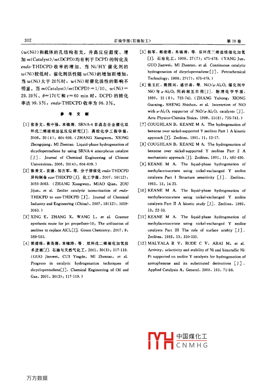 Ni/HY催化劑上雙環(huán)戊二烯液相催化加氫