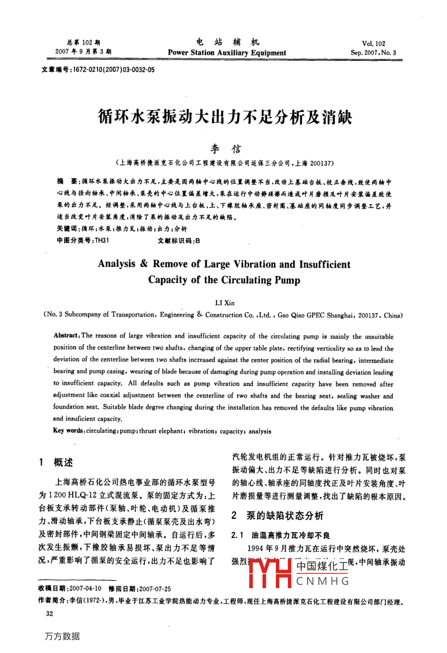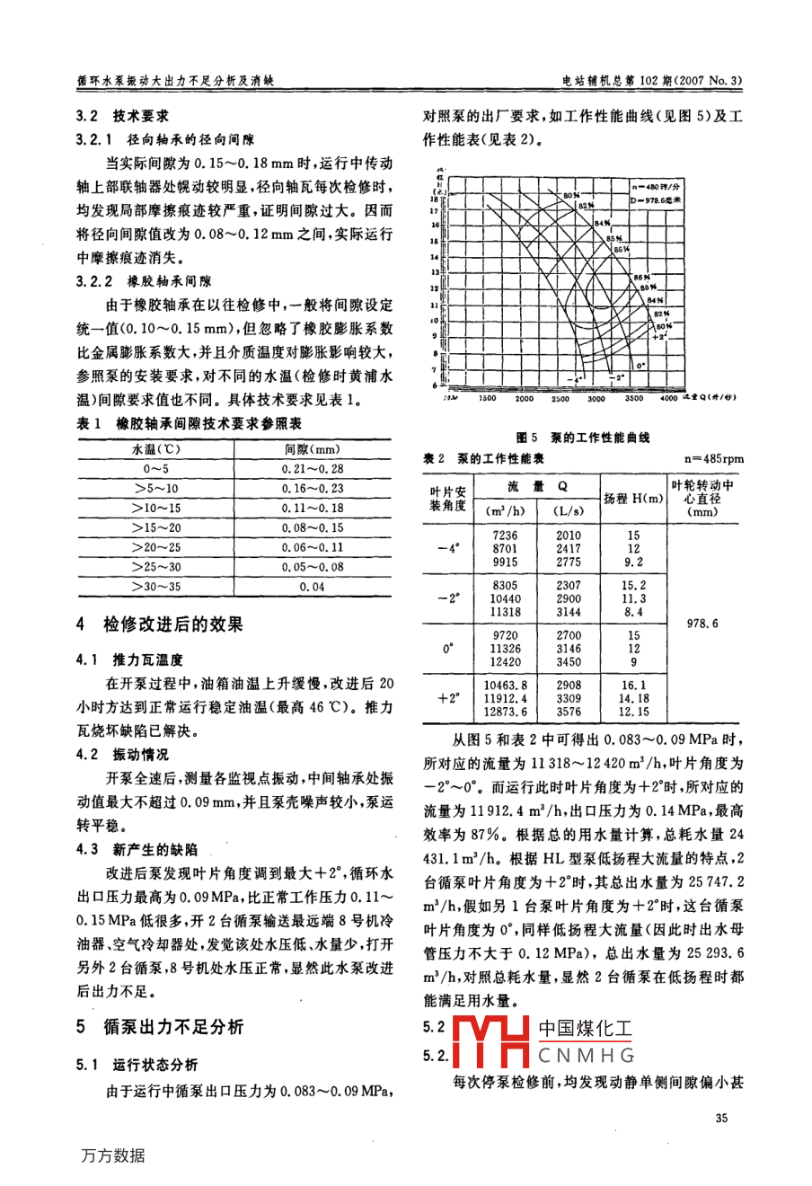 總第102期電站輔機(jī)VoL, 1022007年9月第3期Power Station Auxiliary EquipmentSep. 2007 ,No.3文章編號: 1672-0210(2007)03-0032-05循環(huán)水泵振動大出力不足分析及消缺李信(上海高橋捷派克石化公司工程建設(shè)有限公司運(yùn)保三分公司,上海200137)摘要:循環(huán)水泵振動大出力不足,主要是因兩軸中心線的位置調(diào)整不當(dāng),改動上基礎(chǔ)臺板、校正垂線,致使兩軸中心線與徑向軸承、中間軸承、泵殼的中心位置偏差增大,泵在運(yùn)行中動靜磋擦而造成葉片磨損及葉片安裝偏差致使乘的出力不足。經(jīng)調(diào)整,采用兩軸中心線與上臺板、上、下橡膠軸承座、密封圈、基礎(chǔ)座的同軸度同步調(diào)整工藝,并適當(dāng)改變?nèi)~片安裝角度,消除了泵的振動及出力不足的缺陷。關(guān)鍵詞:循環(huán);水泵;推力瓦;振動;出力;分析中圍分類號:TH31文獻(xiàn)標(biāo)識碼:BAnalysis & Remove of Large Vibration and InsufficientCapacity of the Circulating PumpLI Xin(No. 3 Subcompany of Transportation, Engineering & Construction Co. ,Ltd. , Gao Qiao GPEC Shanghai, 200137, China)Abstract:The resons of large vibration and inuficient capacity of the crculaing pump is mainly the unsuitableposition of the centerline between two shafts, changing of the upper table plate, rectifying verticality so as to lead thedeviation of the centerine between two shafts increased against the center position of the radial bearing, intermediatebearing and pump casing, wearing of blade because of damaging during pump operation and intalling deviation leadingto insufcient capacity. All defaults such as pump vibration and insuficient capacity have been removed afteradjustment like coaxial adjustment between the centerline of two shafts and the bearing seat, sealing washer andfoundation seat. Suitable blade degree changing during the insallation has removed the defaults like pump vibrationand insuficient capacity.Key words:circulating;pump;thrust elephant; vibration; capacity; analysis汽輪發(fā)電機(jī)組的正常運(yùn)行。針對推力瓦被燒壞,泵1概述振動偏大.出力不足等缺陷進(jìn)行分析。同時也對泵上海高橋石化公司熱電事業(yè)部的循環(huán)水泵型號的軸心線.軸承座的同軸度找正及葉片安裝角度、葉為1 200 HLQ-12立式混流泵。泵的固定方式為:上片磨損量等進(jìn)行測量調(diào)整,找出了缺陷的根本原因。臺板支承轉(zhuǎn)動部件(泵軸、葉輪、電動機(jī))及循泵推.2泵的缺陷狀態(tài)分析力、滑動軸承,下臺板支承靜止(循泵泵殼及出水彎)及密封部件,中間鋼梁固定中間軸承。自運(yùn)行后,多2.1 油溫高推力瓦冷卻不良次發(fā)生振顫,下橡膠軸承易損壞、泵出力不足等情.1994年9月推力瓦在運(yùn)行中突然燒壞,泵殼處況,嚴(yán)重影響了循泵的安全運(yùn)行,出力不足也影響了強(qiáng)烈中國煤化工現(xiàn),中間軸承振動TYHCNMHG收稿日期:2007-04-10修回日期:007-07-25作者簡介:李信(1972-),男,畢業(yè)于江蘇工業(yè)學(xué)院熱能動力專業(yè),工程師,現(xiàn)任上海高橋捷派克石化工程建設(shè)有限公司部門經(jīng)理。32循環(huán)水泵振動大出力不足分析及消缺電站輔機(jī)總第102期(2007 No. 3)偏大,推力瓦油溫升高,停泵解體檢查,推力瓦已磨上橡膠軸承座損嚴(yán)重,更換新瓦后再開泵,無振動。但油箱油溫迅.速上升(0.33 C/min)。檢查運(yùn)行操作過程均屬正常。9.42油箱油溫異常,可能由于軸幌動大,推力瓦烏金接觸西9.12 1.04東不良,油箱冷卻不良或斷水,油質(zhì)差等因素引起的。2.2循泵振動偏大10.30連續(xù)3次推力瓦燒壞時,中間軸承處晃動分別南為0.16mm、0.15mm、0.12mm。第2次泵殼處有下橡膠軸承座異常水撞擊聲并且振動振幅達(dá)0.19mm,但振頻低。1997年8月,運(yùn)行中泵下半部分發(fā)生強(qiáng)烈振動,中9.31間軸承處振幅0.25mm,泵殼處振幅0.32mm,伴有.9612.09金屬磨擦刺耳聲。1997年11月泵殼再次振動,振幅達(dá)0.35 mm,伴有金屬磨擦聲。1998年11 月泵中10.6間軸幌動大,中間軸承振幅0. 37 mm,振頻較低。以上所發(fā)生振動前運(yùn)行均無操作,振動出現(xiàn)比較突然。圄2橡膠軸承內(nèi)孔偏移量突然產(chǎn)生振動大的原因是軸承間隙過大或橡膠軸承脫落,軸彎或軸幌大,轉(zhuǎn)動部件動不平衡,葉片根據(jù)圖1中下橡膠軸承座和向西偏離中心點(diǎn)角度變動(不-致)、動靜間隙單側(cè)過大等因素造成2.065mm,已遠(yuǎn)遠(yuǎn)超過出廠>0.5mm的要求值,必須重新進(jìn)行調(diào)整。由于上臺板屬不可調(diào)整安裝臺的。板,故采用加裝對稱2塊2160X260X55基礎(chǔ)臺板2.3檢修工藝推力瓦檢修是在各部調(diào)整工作結(jié)束后進(jìn)行的,的方法,重新進(jìn)行安裝調(diào)整垂直度,使徑向軸承、上研刮均按要求進(jìn)行,修刮后推力盤與推力瓦塊接觸下橡膠軸承座同軸度均達(dá)到出廠安裝要求,此工藝面積應(yīng)大于70%,分布應(yīng)均勻。雖已按正常工藝進(jìn)雖達(dá)到了安裝要求,但忽略了泵的軸線中心值與同行修刮工作,但對泵軸未作徑向定位,在盤動轉(zhuǎn)子時軸度可能產(chǎn)生較大的誤差。修刮出的接觸點(diǎn)與運(yùn)行狀態(tài)下的實(shí)際接觸點(diǎn)不一傳動軸(上軸)支承由推力瓦承受,徑向由假軸承定位(見圖3 A點(diǎn))。泵軸由專用支承工具承重.致對泵體作垂直度測量調(diào)整,由于泵房是整體水.徑向由上下2個假軸承定位(見圖3B點(diǎn),C點(diǎn)),同泥結(jié)構(gòu),進(jìn)口側(cè)重載荷大于出口側(cè)。泵房經(j