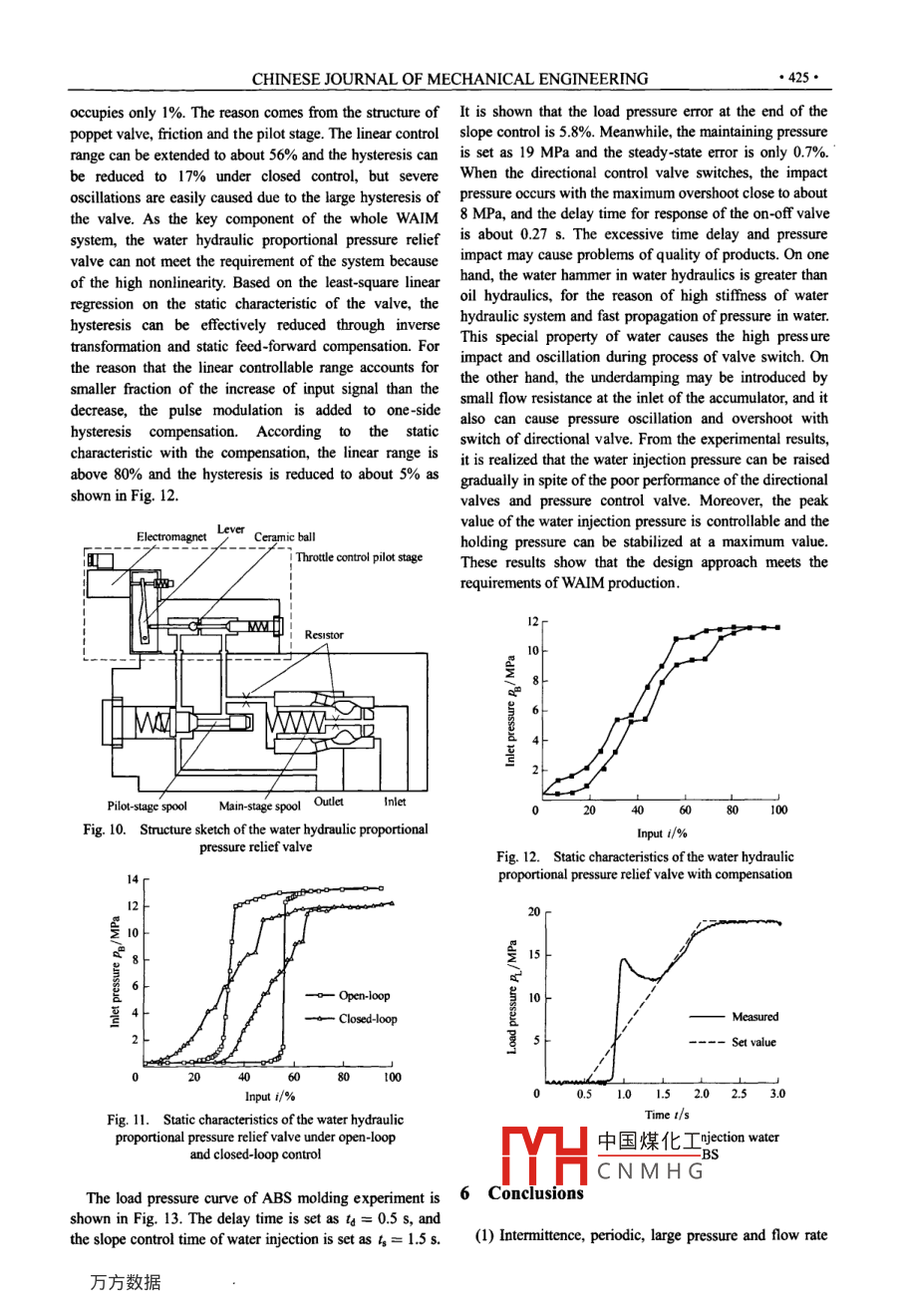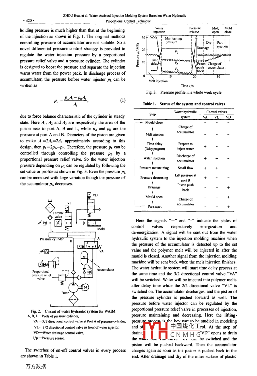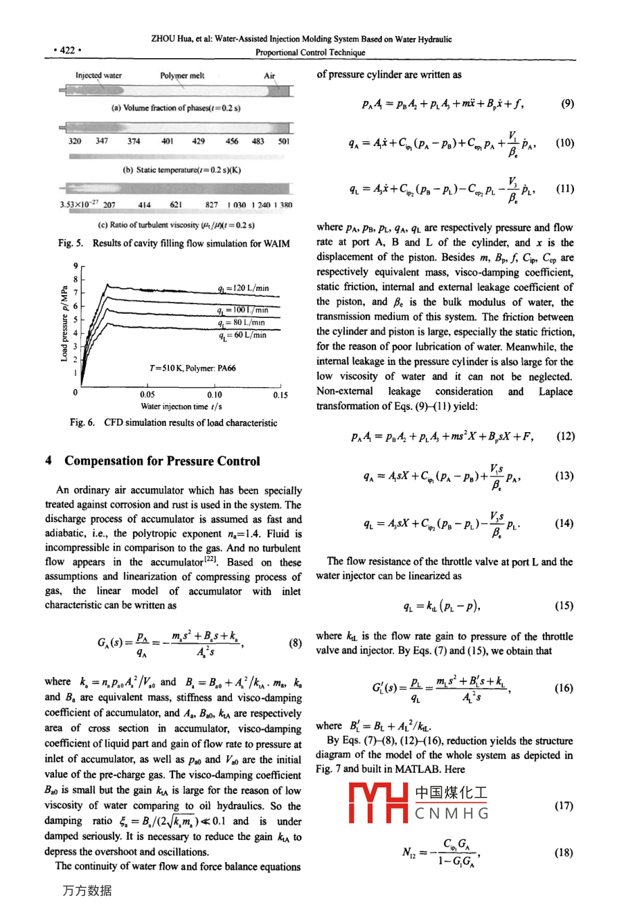 CHINESE JOURNAL OF MECHANICAL ENGINEERING●418●Vol. 23, No. 4, 2010DOI: 10.3901/CIME 2010.04.418, available online at www cjmenet.com; www.cjmenet.cm.cnWater-Assisted Injection Molding System Based on Water HydraulicProportional Control TechniqueZHOU Hua' , ZHANG Zengmeng'"* , GAO Yuan' an' , and YANG Huayong'1 The State Key Lab ofFluid Power Transmission and Control, Zhejiang Universit, Hangzhou 310027, China2 Jiujiang Branch of 707 Research Institute, China Shipbuilding Industry Corporation, Jiujiang 332007, ChinaReceived July 4, 2009; revised April 30, 2010; accepted May 17, 2010; published ectronicall August 20, 2010Abstract: Water-assisted injection molding(WAIM), an innovative process to mold plastic parts with hollow sections, is characterizedwith intermittent, periodic process and large pressure and flow rate variation. Energy savings and injection pressure control can not beattained based on conventional valve control system. Moreover, the injection water can not be supplied directly by water bhydraulicproportional control system. Poor efficiency and control performance are presented by current trial systems, which pressurize injectionwater by compressed air. In this paper, a novel water hydraulic system is developed applying an accumulator for energy saving. And anew differential pressure control method is proposed by using pressure cylinder and water hydraulic proportional pressure relief valvefor back pressure control. Aiming at design of linear contollr for injection water pressure regulation, a linear load model isapproximately built through computational fluid dynamics(CFD) simulation on two-phase flow cavity flling process with variabletemperature and viscosity, and a linear model of pressure control system is built with the load model and linearization of water hydrauliccomponents. According to tbe simulation, model based feedback is brought forward to compensate the pressure decrease duringaccumulator discharge and eliminate the derivative element of the system. Meanwhile, the steady-state error can be reduced and thecapacity of resisting disturbance can be enhanced, by closed-loop control of load pressure with integral compensation. Through thedeveloped experimental system in the State Key Lab of Fluid Power Transmission and Control, Zhejiang University, China, the staticcharacteristic of the water hydraulic proportional relief valve was tested and output pressure control of the system in AcrylonitrileButadiene Styrene(ABS) parts molding experiments was also studied. The experiment results show that the dead band and hysteresis ofthe water hydraulic proportional pressure relief valve are large, but the control precision and linearity can be improved withfeed-forward compensation. With the experimental results of injection water pressure control, the applicability of this WAIM systemand the effect of its linear controller are verified. The novel proposed process of WAIM pressure control and study on characteristics ofcontrol system contribute to the application of waler hydraulic proportional control and WAIM technology.Key words: water-assisted injectio molding, water bydraulics, proportional pressure control, linear control, load characteristicof elongated parts, for example, automotive industry, white1 Introductiongoods, office equipment, medical products and consumergoods, etcl4!.Water-assisted injection molding(WAIM), generallyHowever, the WAIM process is complicated becausesimilar to gas-assisted injection molding(GAIM), is thethere are many factors influencing molding patterm andnewest way to mold hollow or partly hollow plastic parts.quality. The load characteristic is coupling with pressureWater can be supplied by water hydraulic system andand flow. And it is necessary to control the pressure, flowinjected into the molten regions in mould. Then cavities arerate and temperature of injection water5-6]. In addition, thegenerated and polymer melt is displaced to mold a hollowtemperature and flling percent of polymer melt andcore. So the substitution of filtered water for pure nitrogentemperature of mould need to be regulated by injectionsed in GAIM brings many advantages, such as shortmachinel6-9. So the molding process and system arecooling cycle time, high quality of products and low cost.designed to make injection water supplier work well withinjection machineland if the injection waterEspecially, WAIM can produce larger void spaces andlonger hollow sections in parts than GAIM(I-3). All thepressu中國煤化Iddy and inerfacialadvantages lead the applications of WAIM to a broad fieldinstabiHCN MH GS reason to controlpressure mcicasuug sICp uy sIcp. The injection water●Corresponding author. E-mail: zzm. zju@gmail.comflow rate is large and the compensation flow rate replacingThis project is supported by National Basic Research Program of Chinamelt shrinkage is small. The energy saving and control(973 Program, Grant No. 2006CB705405). National Natural Scienceperformance are required in system design based on theFoundation of China (Grant No. 50775199). and Zhcjiang ProvincialScience and Technology Plan Program of China (Grant No. 2007C21057).CHINESE JOURNAL OF MECHANICAL ENGINEERING●419●intermittent periodic work cycle of WAIM. The presentexperimental and commercial WAIM systemsreDesign of the System and Pressure Controldeveloped from GAIM and water is pressurized bycompressed gas. The pressure and flow control ofThe WAIM process totally contains five steps marked byinjection water are low-stiffiness and slow-response. Alsonumbers in Fig. 1, i.e., polymer melt injection, waterlow eficicy is induced by the aditional air compresser inection, maintaining pessure, drainage and part eciono7.and exhaust valves. These problems can be solved whenthe The water hydraulic system is in ready mode beforeinjcetion water is supplied by water hydraulic systempolymer melt injection is finished. The delay time,directly.generally no more than 3s, is decided by polymerThe wate