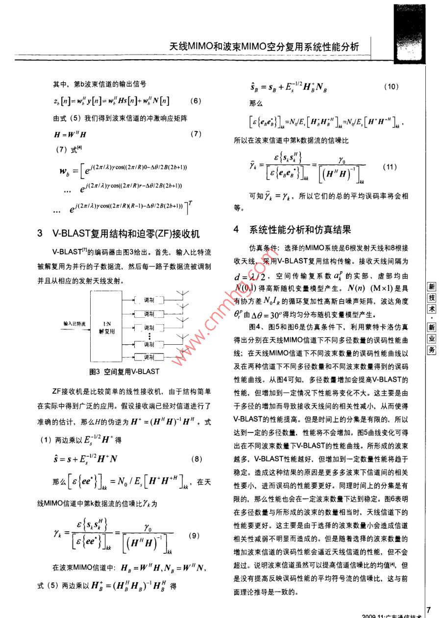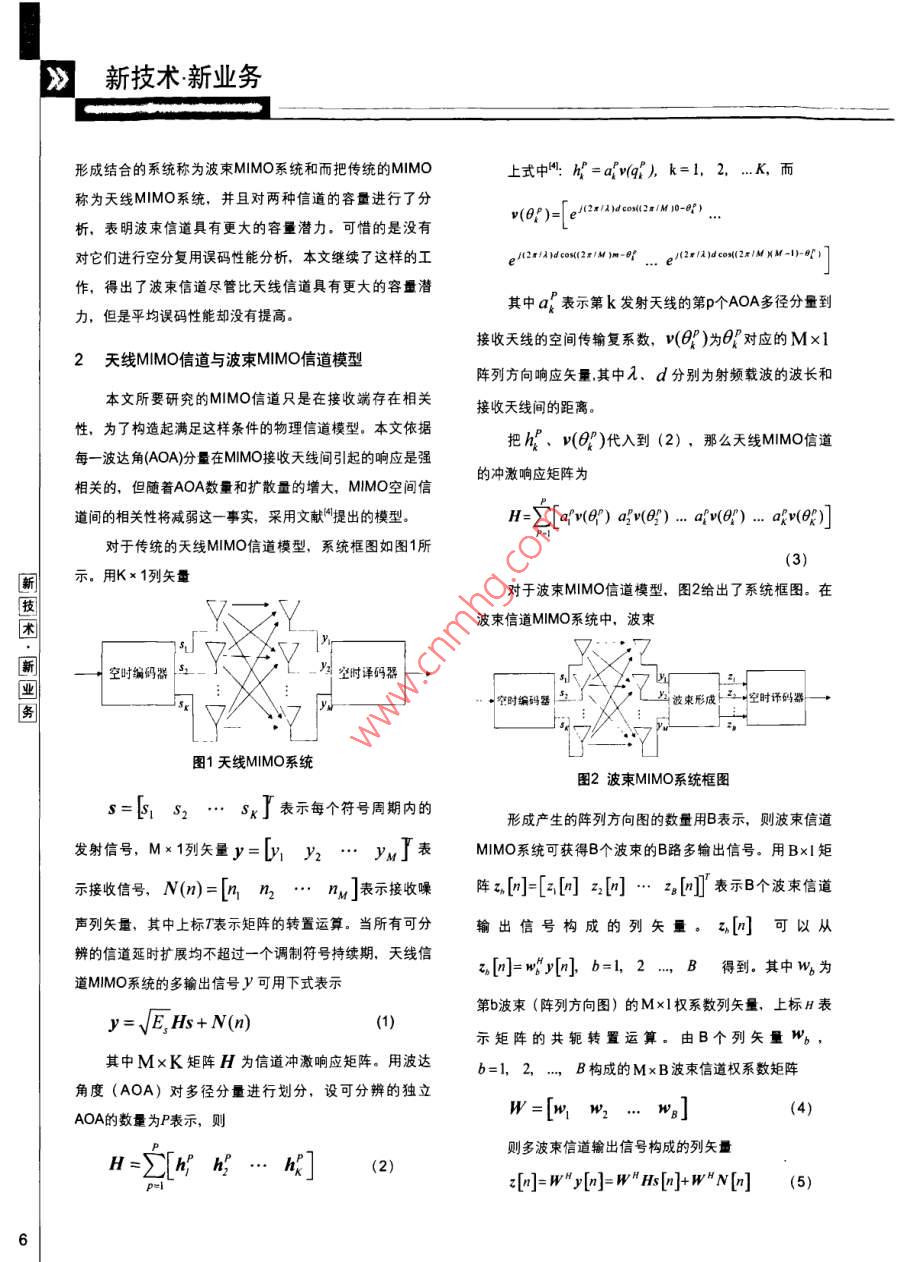 天線MMO和波束MMO空分復(fù)用系統(tǒng)性能分析[諶開元姜永權(quán)黃鵬林元模]L摘要文章通過仿真分析了多徑數(shù)量以及波東數(shù)量分別在天線信道和波來信道下對(duì)空分復(fù)用結(jié)枃( V-BLAST)誤碼性能的影響,進(jìn)而得出多徑數(shù)量和波束數(shù)量都會(huì)各自影響信道天線間相關(guān)性的結(jié)論.并且比較了同樣條件下 V-BLAST結(jié)構(gòu)在天線信道以及波柬信遒下的誤碼性能,得出它們的平均誤碼性能是一樣的結(jié)論關(guān)鍵詞:波來信道天線信道多徑數(shù)量波束數(shù)量空分結(jié)構(gòu)汕頭大學(xué)研究生,主要研究方向?yàn)闊o線通信中MMO技術(shù)、空時(shí)編碼技術(shù)姜永權(quán)汕頭大學(xué)教授、碩士生導(dǎo)師,主要研究方向?yàn)楦咝阅軣o線通信中的智能天線、OFDM、MMO技術(shù)黃爵汕頭大學(xué)研究生,主要研究方向?yàn)橐苿?dòng)通信中的MMO分集技術(shù)林元模汕頭大學(xué)研究生,主要研究方向?yàn)橐苿?dòng)通信中的OFDM資源分配技術(shù),認(rèn)知無線電技術(shù)1引言列元素之間的相關(guān),而對(duì)鏈路另一端的陣列元素沒有影多翰入多輸出(MMo)技術(shù)在不增加功率和帶寬消響。但是它們忽略了分析擴(kuò)散量也就是所接收到的多徑數(shù)耗的情況下具有大幅度提高容量和無線鏈路覆蓋面的潛量對(duì)陣列元素之間相關(guān)性的影響,本文運(yùn)用文獻(xiàn)提出的力。傳統(tǒng)的MMO系統(tǒng)模型是在相互獨(dú)立的平坦瑞利衰落MMO天線信道模型分析了多徑數(shù)量對(duì)M|MO系統(tǒng)的誤碼信道假設(shè)條件下進(jìn)行的,但在實(shí)際傳輸信道環(huán)境中,天性能的影響,進(jìn)而得出相應(yīng)的結(jié)論。線之間的距離和天線周圍散射體分布往往不能滿足這個(gè)條考慮到智能天線諸多優(yōu)點(diǎn),有很多學(xué)者嘗試在MMO件。文獻(xiàn)詳細(xì)論述了天線間距離、擴(kuò)散角分布對(duì)MM系統(tǒng)中采用波束形成天線技術(shù)。具有代表性的文獻(xiàn)是信道容量的影響,而且證明只有相鄰的天線環(huán)境產(chǎn)生陣國內(nèi)也有一些相關(guān)的文獻(xiàn),其中文獻(xiàn)把MMO與波束》新技術(shù)新業(yè)務(wù)形成結(jié)合的系統(tǒng)稱為波束MMO系統(tǒng)和而把傳統(tǒng)的MMO上式中:=avq",k=1,2,…K,而稱為天線MMO系統(tǒng),并且對(duì)兩種信道的容量進(jìn)行了分析,表明波束信道具有更大的容量潛力,可惜的是沒有w(0p)=e/(x/4)dcose對(duì)它們進(jìn)行空分復(fù)用誤碼性能分析,本文繼續(xù)了這樣的工2r/ANd cesc(2r/M)m-or/A)d cos((2x/MXM-l)-il作,得出了波束信道盡管比天線信道具有更大的容量潛力,但是平均誤碼性能卻沒有提高其中a表示第k發(fā)射天線的第p個(gè)AOA多徑分量到接收天線的空間傳輸復(fù)系數(shù),w()為7對(duì)應(yīng)的Mx12天線MMO信道與波束MMO信道模型陣列方向響應(yīng)矢量其中λ、d分別為射頻載波的波長和本文所要研究的MMO信道只是在接收端存在相關(guān)接收天線間的距離。性,為了構(gòu)造起滿足這樣條件的物理信道模型。本文依據(jù)把k、v(O)代入到(2),那么天線MMO信道每一波達(dá)角(AOA分量在MM接收天線間引起的響應(yīng)是強(qiáng)的沖激響應(yīng)矩陣為相關(guān)的,但隨著AOA數(shù)量和擴(kuò)散量的增大,MMO空間信道間的相關(guān)性將減弱這一事實(shí),采用文獻(xiàn)提出的模型H∑[av(e)av()…av(e)…以叫對(duì)于傳統(tǒng)的天線MMO信道模型,系統(tǒng)框圖如圖1所示。用Kx1列矢量對(duì)于波束MMO信道模型,圖2給出了系統(tǒng)框圖。在波束信道MMO系統(tǒng)中,波束空吋編碼器空時(shí)譯碼器空時(shí)編碼器波束形成空時(shí)譯碼器圖1天線MMO系統(tǒng)圖2波束MMO系統(tǒng)框圖[Sx」表示每個(gè)符號(hào)周期內(nèi)的形成產(chǎn)生的陣列方向圖的數(shù)量用B表示,則波束信道發(fā)射信號(hào),M×1列矢量y=y1y2y,丁表MMo系統(tǒng)可獲得B個(gè)波束的B路多輸出信號(hào),用Bxl矩示接收僖號(hào),N(m)=[n2…n,]表示接收噪陣[…回表示B個(gè)波束信道聲列矢量,其中上標(biāo)7表示矩陣的轉(zhuǎn)置運(yùn)算。當(dāng)所有可分輸出信號(hào)構(gòu)成的列矢量。z[小]可以從辨的信道延時(shí)擴(kuò)展均不超過一個(gè)調(diào)制符號(hào)持續(xù)期,天線信z[=w"y{b=1,2…,B得到。其中W為道M|MO系統(tǒng)的多輸出信號(hào)y可用下式表示第b波束(陣列方向圖)的Mx1權(quán)系數(shù)列矢量,上標(biāo)H表y=√EHs+N(n)示矩陣的共軛轉(zhuǎn)置運(yùn)算。由B個(gè)列矢量形b,其中MxK矩陣H為信道沖激響應(yīng)矩陣。用波達(dá)b=1,2,…,B構(gòu)成的MxB波束信道權(quán)系數(shù)矩陣角度(AOA)對(duì)多徑分量進(jìn)行劃分,設(shè)可分辨的獨(dú)立WAOA的數(shù)量為P表示,則則多波束信道輸出信號(hào)構(gòu)成的列矢量z[n]=W"[n]=WHs/]+WN[] (5)天線MMO和波束MMO空分復(fù)用系統(tǒng)性能分析其中,第b波束信道的輸出信號(hào)SB=sp+E-H:Nz[小]=wy[小]=wB[小+wN[](6)那么由式(5)我們得到波束信道的沖激響應(yīng)矩陣[eaei)=.[HH"]NJE[HH."]H=WH所以在波束信道中第k數(shù)據(jù)流的信噪比(7)式(2rl2)ycos(2r/R)0-△6/2B(2b+1)Ye(11)age)(2*/)cos(2x/R)r-A0/2B(26+1))可知yk=yk,所以它們的總的平均誤碼率將會(huì)相(2r/)ycos(2r/RNR-1)-△6/2B(2b+1)等3 V-BLAST復(fù)用結(jié)構(gòu)和迫零(zF接收機(jī)4系統(tǒng)性能分析和仿真結(jié)果V-BL
