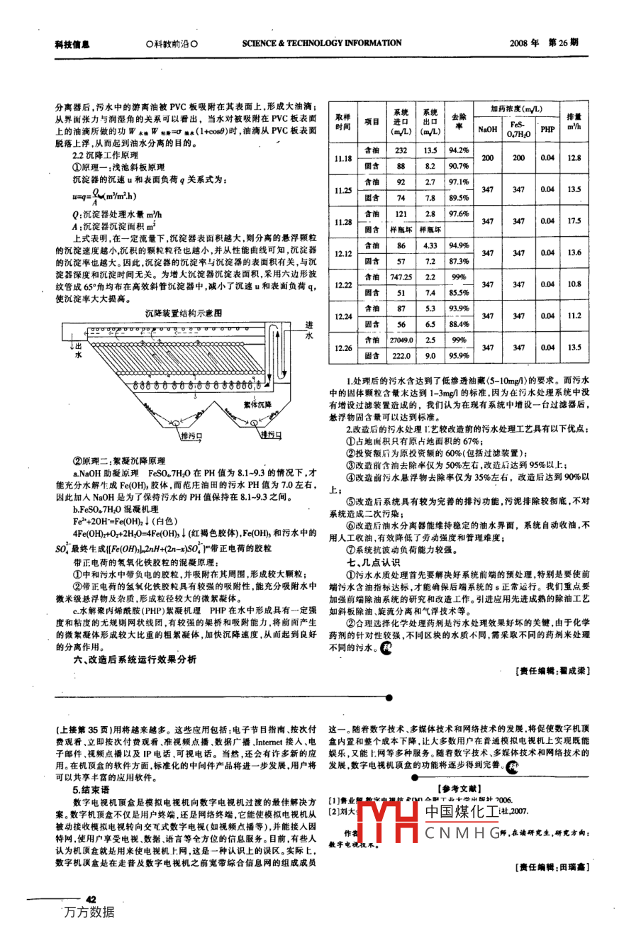 科技信息O科教前沿OSCIENCE & TECHNOLOGY NFORMATION2008年第26期新型污水處理裝置在FZ油田的應(yīng)用邵建林(浙江杭州310003)[摘要]小斷塊油田產(chǎn)出污水量少,投入大型處理設(shè)備效率低,小型化的普通裝置處理水質(zhì)又達(dá)不到注水要求,本文通過所介紹的新型污水處理裝置采用獨(dú)特的結(jié)構(gòu),通過優(yōu)化處理過程,優(yōu)選化學(xué)藥劑,達(dá)到了較好的處理效果。并具有一定的推廣使用價值。,[關(guān)鍵詞]污水處理;石油;化工工藝-.FZ油田注水概況.鹽還原菌,對鋼板的腐蝕非常嚴(yán)重,故采用PVC制作。FZ油用探明含油面積1.2Km2.地質(zhì)儲量195x10*噸.平均空歐度2.污水處理系統(tǒng)化學(xué)藥劑選擇21.8%,平均滲透率192x10~μum2,屬中低滲透油藏。該塊91年4月投針對Fz油用含油污水乳化油較多(30mng/左右)、污水中粘土膠人試采:93年7月全面開發(fā);93年8月開始試注,由于地層屬于強(qiáng)水體顆粒帶 負(fù)電的性質(zhì),我們優(yōu)選的破乳劑為FeSO.7H0.助凝劑為敏地層.注水方式為清行混注以確保礦化度。NaOH,混凝劑為FeSO,.7H20, 絮艇劑為水解聚丙婚酰胺(PHP),利用二、FZ污水處理系統(tǒng)改造前運(yùn)行狀況油水分離器和沉淀器的特殊結(jié)構(gòu)對污油和懸浮物進(jìn)行分離。1.改造前污水處理工藝流程示意圖五、污水處理系統(tǒng)改造后系統(tǒng)功能及工作原理一)、油水分離 器結(jié)構(gòu)及工作原理200m!1.油水分離器結(jié)枸示意圖注水罐8o進(jìn)水2.改造前水質(zhì)狀況日處理污水址約300-350m'd,沉降罐出口污水含油量一般情況收袖收油槽:為100 -300mg/,懸浮物固含一般30- 60mg/L,污水水型為NaHCO3,總礦為9371.8mg/1,2005年水質(zhì)監(jiān)測數(shù)據(jù)表明,處理后含油和懸浮物均嚴(yán)重超標(biāo)。3.改造前污水處理系統(tǒng)存在的問題①系統(tǒng)前端除油效率低,導(dǎo)致后端三合一及壓力濾罐超負(fù)荷運(yùn);轉(zhuǎn)。主要原因是,沉降脫出污水含油指標(biāo)超過三合一和壓力濾罐的承受能力,謔料容易被污染,起不到過濾作用。②污水懸押物固含超標(biāo)主要是因為系統(tǒng)污泥及機(jī)雜無法外排,導(dǎo)致水質(zhì)二次污染和污泥惡性循環(huán)。高效聚結(jié)除油器結(jié)構(gòu)示意圖③砂謔罐攔馘性能低,再生能力差.反沖洗效果不明顯。④三合-及壓力除油罐更換填料勞動強(qiáng)度大,排油靠人工進(jìn)行,2.油水分離器工作原理:不利于現(xiàn)場管理.可操作性不強(qiáng)。⑤污水處理工藝中求加的化學(xué)劑的針對性不強(qiáng),絮凝劑效果較2.1除油工作原理①原理-:電力除油差,不能有效發(fā)揮作用.導(dǎo)致濾罐機(jī)雜的截留能力降低。根據(jù)流體力學(xué)中的斯托克斯油珠上浮定律(右式為斯托克斯公三、污水系統(tǒng)改造思想與目標(biāo)式)可知:當(dāng)污水中的游離油滴密度小于污水的密度時,油水通過重力1.污水系統(tǒng)改造思路差進(jìn)行分離.達(dá)到除油的目的。法除污水中大_、 加藥破乳,加高效混凝、絮凝部分游離油除 去乳化油劑,提高沉降效σ袖水2.污水系統(tǒng)改造目標(biāo)處理后系統(tǒng)未端污水含油≤10m/L,懸浮物固含≤10m/L1日油四、改造方案及系統(tǒng)特點σ水板PC板表面-)、改造方案結(jié)合Fz污水處理系統(tǒng)實際特點和現(xiàn)狀,我們制定了以下方案。主界面張力與潤濕角的關(guān)系圖要工作量:新建DYF油水分離器.混凝器和高效斜板沉降罐;宿D(zhuǎn)YF地污水沉淀曲線污水. [注水罐下娃水纂規(guī)過地]二)、系統(tǒng)特點中國煤化工1.特點及功能DYF油水分離器末要特點:無需動力;除油率高,性能穩(wěn)定;操作YHCNMHG簡單;占地面積小,只有隔油池的1/3;分離出的油能集中自動收集。允②原理二:粗粒化聚結(jié)除油許污水的流速可達(dá)150-250mm/s。考慮本油田含油污水中含有亞硫酸除油斜板采用親油性能極強(qiáng)的PVC板制作,含油污水進(jìn)人油水4科技信息O科教前沿口SCIENCE & TECHNOLOGY NFORMATION2008年第26期分離器后,污水中的游離油被PVC板吸附在其表面上,形成大油滴:統(tǒng)|系統(tǒng)加藥濃度(myL)從界面張力與潤濕角的關(guān)系可以看出,當(dāng)水對被吸附在PVC板表面取樣|項目進(jìn)口出口去除排量|上的油滴所做的功W物w陸≈σ me(+o0)時,油滴從PVC板表面時間.(m/L)| (m/L)串 NaOHPHP mYh脫落上浮,從而起到油水分離的目的。11.18含油232| 13.5| 94.2%200 200 | 0.04| 128 |①原理- :淺池斜板原理固含沉淀器的沉速u和友面負(fù)荷q關(guān)系式為:11.25含曲n227 97.1%34347 | 0.04| 13.5|uzq=fm/m:h)9.5%Q:沉淀器處理水景m?h含油2128|97.6%11.28347347| 0.04 17.3|A:沉淀器沉淀面積mi圖含樣瓶壞樣瓶壞上式表明,在一定流量下,沉淀器表面積越大.則分離的懸浮顆粒36| 4.33 | 94.9%的沉淀速度越小,沉積的顆粒粒徑也越小,并從性能曲線可知,沉淀器12.12固含57.2| 87.3%347 | 0.04 13.6 |淀器深度和沉淀時間無關(guān)。為增大沉淀器沉淀表面積,采用六邊形波12.22含油747.25 2.2| 99%347| 0.04 10.8|紋管成65角均布在高效斜管饑淀器中,減小了沉速u和表面負(fù)荷q,圊含| 51| 74 | 85.5使試淀率大大提高。37.3| 93.9%沉降裝置結(jié)構(gòu)示意圖12.24.固含 56 6588.4%347| 0.04 11.2|12.26肅油| 27049.0 2.5| 99%347| 0.04 13.5|固含| 220 9.0| 95.9%1.處現(xiàn)后的污水含達(dá)到了低滲透油藏(5- -10mpg1)的要求。而污水中的固體顆粒含量木達(dá)到1-3mg/l 的標(biāo)準(zhǔn
