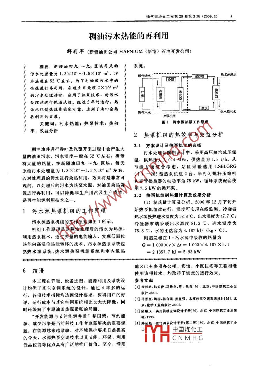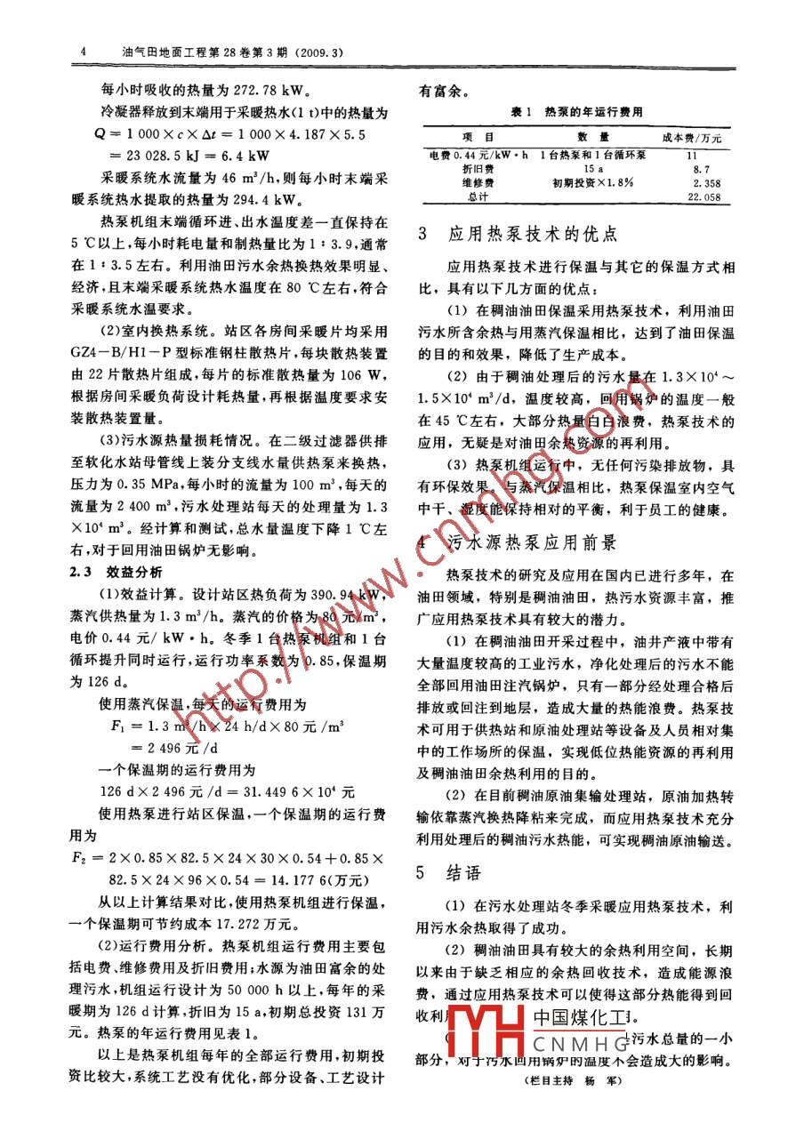油氣田地面工程第28卷第3期(2009. 3)3稠油污水熱能的再利用解利軍(新疆油田公司HAFNIUM (新港)石油開發(fā)公司)摘要:新疆油田九:~九s區(qū)塊每天的系統(tǒng)。污水處理量為1.3X10*~1.5X10* m',污暖氣進(jìn)水熱水源進(jìn)水水溫度在52 C左右。為了對(duì)油田污水中的余熱進(jìn)行再利用,在建立日處理2X10* m'的污水處理站時(shí),應(yīng)用了熱泵技術(shù),對(duì)污水.房處理站進(jìn)行保溫試驗(yàn)。經(jīng)過2年的運(yùn)行,熱泵機(jī)組制熱性能穩(wěn)定可靠,達(dá)到了油田余熱曖氣出水.熱水源出水再利用的效果。熱泵機(jī)組關(guān)鍵詞:污水熱能;熱泵技術(shù);熱效團(tuán)1污水源熱泵工作原理率;效益分析2熱泵機(jī)組的熱效率與效益分析稠油油井進(jìn)行吞吐及汽驅(qū)開采過程中會(huì)產(chǎn)生大2.1方 案設(shè)計(jì)及熱泵機(jī)組的選擇量的油田污水,污水溫度- -般在52 C左右,攜帶污水處理站前期設(shè)計(jì)中,采用高壓蒸汽減壓保有大量的熱量。在新疆油田九~九s區(qū)塊,每天溫,供熱壓力為0.4 MPa,供熱量為1.3 t/h.從原油污水處理量為1.3X10*~1.5X10* m3左右,節(jié)能方面綜合考慮,站區(qū)采暖選用LSBLGRG若對(duì)處理后的污水進(jìn)行余熱利用,效果將是非???I) -285型熱泵機(jī)組2臺(tái),半封閉螺桿壓縮機(jī)觀的。以處理后的污水為熱泵水源,對(duì)油田余熱資和殼管換熱器的電功率為75kW,循環(huán)系統(tǒng)配套使源進(jìn)行再利用,可以降低非生產(chǎn)用汽及生產(chǎn)成本,2.2熱泵機(jī)組制熱量 計(jì)算及效果分析用7.5 kW的循環(huán)泵。是再生能源利用技術(shù)之一-。(1) 制熱量計(jì)算及分析。2006年12月下旬開1污水源熱泵機(jī)組的工作原理始熱泵機(jī)組試運(yùn)行,溫度可實(shí)現(xiàn)在線監(jiān)測(cè)。冷凝器熱水源換熱進(jìn)水溫度為52.8 C,出水溫度為47.7 C;污水源熱泵機(jī)組的工作原理如圖1所示。冷凝器末端采暖出水溫度81.3 C,進(jìn)水溫度為機(jī)組工作原理是以稠油處理后的污水為熱源,75.8 C,水的比熱容為4.187 kJ/ (kg* "C)。利用熱泵技術(shù),通過少量的電能輸入,實(shí)現(xiàn)低溫位則蒸發(fā)器在1t污水源中吸收的熱量為熱能向高溫位熱能轉(zhuǎn)移的技術(shù)。污水源熱泵系統(tǒng)包Q= 1 000XcX△t= 1 000X4.187X5.1括熱水源系統(tǒng)、熱水源熱泵機(jī)組系統(tǒng)和室內(nèi)散熱=2 1357.7kJ = 5.93 kW地區(qū)已有多項(xiàng)辦公樓、賓館、小區(qū)住宅等工程相繼6結(jié)語使用該項(xiàng)技術(shù),均取得了滿意的運(yùn)行效果。本工程在節(jié)能、設(shè)備選型、能源利用及系統(tǒng)設(shè)參考文獻(xiàn)計(jì)均優(yōu)于其它空調(diào)系統(tǒng)的設(shè)計(jì),通過4年多的運(yùn)[1]徐邦裕,陸亞俊,馬景良,等.熱泵[M].北京:中國(guó)建筑工業(yè)出行,各項(xiàng)技術(shù)指標(biāo)均達(dá)到設(shè)計(jì)要求,深得用戶的好[2]馬景良,姚楊,楊自強(qiáng),姜益強(qiáng)。水環(huán)熱泵空調(diào)系統(tǒng)設(shè)計(jì)[M].北版社2000.評(píng),運(yùn)行成本與其它空調(diào)系統(tǒng)相比也大大降低,同京:化學(xué)工業(yè)出版杜.2005.時(shí)還緩解了中原油田熱源緊張的局面。[3]陸耀慶.實(shí)用供暖空調(diào)設(shè)計(jì)手冊(cè)[M].北京:中國(guó)建筑工業(yè)出版“開發(fā)能源與節(jié)約能源并重”是國(guó)策,節(jié)約能社.1993.源、減少污染是當(dāng)前科技工作者急需解決的重要課[4]路延魁??諝庹{(diào)節(jié)設(shè)計(jì)手冊(cè)(第二版)[M].北京:中國(guó)建筑工業(yè)題。在能源越來越緊缺、對(duì)環(huán)境保護(hù)要求日益提高中國(guó)煤化工的今天,水源熱泵空調(diào)技術(shù)以其節(jié)能、環(huán)保、利用CNMH G低品位能等優(yōu)點(diǎn)具有廣泛的推廣價(jià)值.至今,濮陽油氣田地面工程第28卷第3期(2009. 3)每小時(shí)吸收的熱量為272.78kW.有富余。冷凝器釋放到末端用于采暖熱水(1 t)中的熱量為表1熱泵的年運(yùn)行費(fèi)用Q≈1 000XcXOt= 1 000X4.187 X5.5頁目數(shù)量成本費(fèi)/萬元=23028.5kJ=6.4kW電費(fèi)0.44元/kW.h 1 臺(tái)熱泵和1臺(tái)循環(huán)泵1折舊費(fèi)采暖系統(tǒng)水流量為46 m*/h,則每小時(shí)末端采維修費(fèi)初期投資X11.8%2. 358暖系統(tǒng)熱水提取的熱量為294.4 kW??傆?jì)22. 058熱泵機(jī)組末端循環(huán)進(jìn)、出水溫度差一直保持在.3應(yīng)用熱泵技術(shù)的優(yōu)點(diǎn)5 C以上,每小時(shí)耗電量和制熱量比為1 : 3.9,通常在1 :3.5左右。利用油田污水余熱換熱效果明顯、應(yīng)用熱泵技術(shù)進(jìn)行保溫與其它的保溫方式相經(jīng)濟(jì),且末端采暖系統(tǒng)熱水溫度在80 C左右,符合比,具有以下幾方面的優(yōu)點(diǎn):采曖系統(tǒng)水溫要求。(1)在稠油油田保溫采用熱泵技術(shù),利用油田(2)室內(nèi)換熱系統(tǒng)。站區(qū)各房間采暖片均采用污水所含余熱與用蒸汽保溫相比,達(dá)到了油田保溫GZ4- B/H1-P型標(biāo)準(zhǔn)鋼柱散熱片,每塊散熱裝置的目的和效果,降低了生產(chǎn)成本。由22片散熱片組成,每片的標(biāo)準(zhǔn)散熱量為106 W,(2)由于稠油處理后的污水量在1.3X 10*~根據(jù)房間采暖負(fù)荷設(shè)計(jì)耗熱量,再根據(jù)溫度要求安.1.5X10' m'/d,溫度較高,回用鍋爐的溫度-般裝散熱裝置量。在45 C左右,大部分熱量白白浪費(fèi),熱泵技術(shù)的(3)污水源熱量損耗情