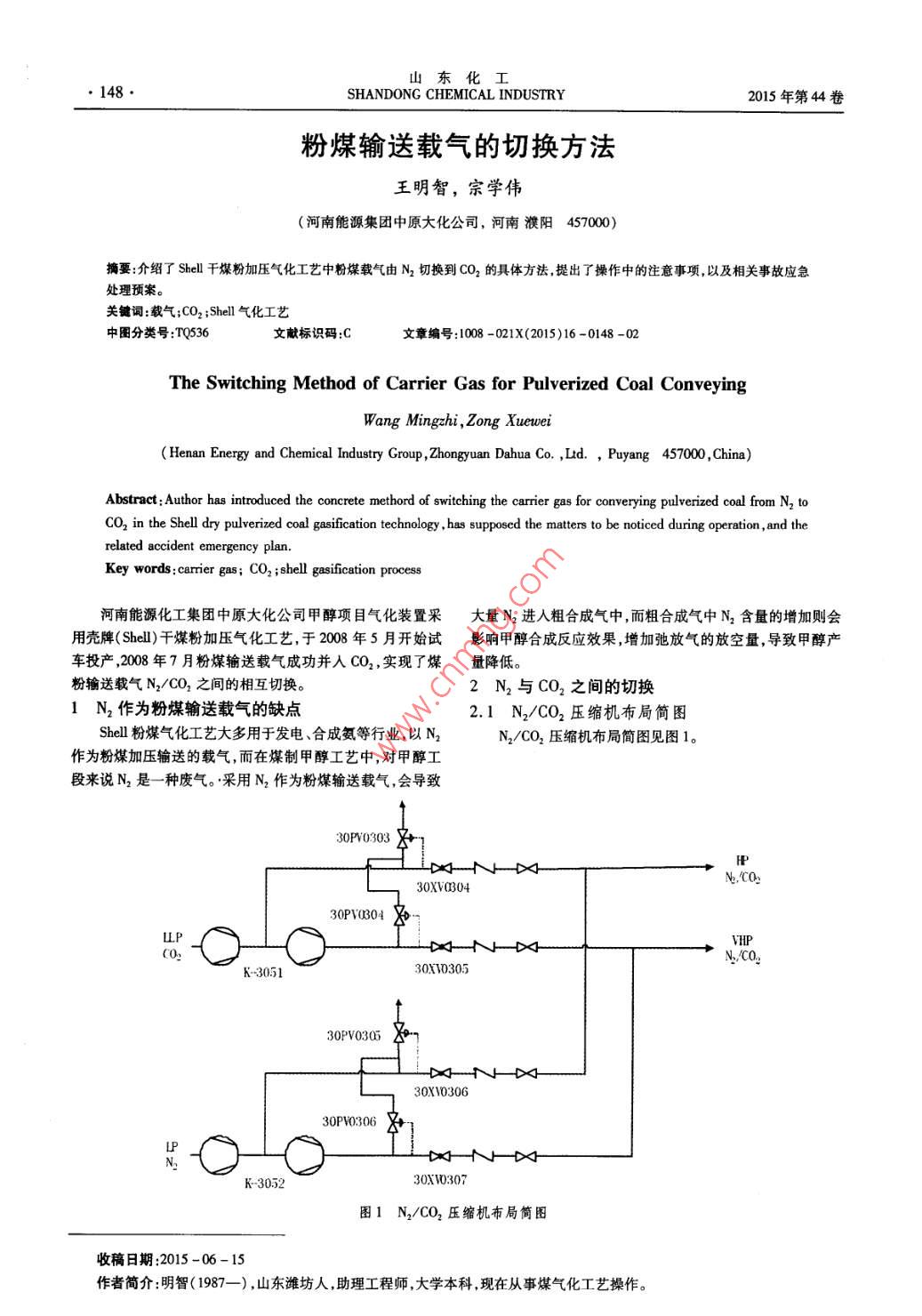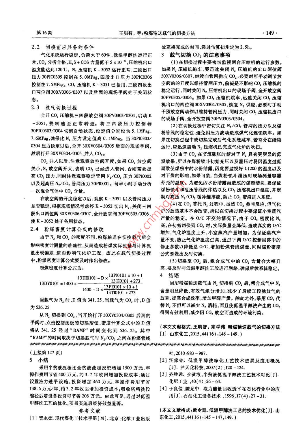 山東化工148SHANDONG CHEMICAL INDUSTRY2015年第44卷粉煤輸送載氣的切換方法王明智,宗學偉(河南能源集團中原大化公司,河南濮陽457000)摘要:介紹了She千煤粉加壓氣化工藝中粉煤載氣由N2切換到CO2的具體方法提出了操作中的注意事項以及相關(guān)事故應(yīng)急處理預(yù)案。關(guān)鍵詞:載氣;CO2;She'氣化工藝中圖分類號:TQ36文獻標識碼:C文章編號:1008-021X(2015)16-0148-02The Switching Method of Carrier Gas for Pulverized Coal ConveyingWang Mingzhi,Zong互t( Henan Energy and Chemical Industry Group, Zhongyuan Dahua Co, Ltd., Puyang 457000, China)Abstract: Author has introduced the concrete methord of switching the carrier gas for converying pulverized coal from N, toCO, in the Shell dry pulverized coal gasification technology, has supposed the matters to be noticed during operation, and therelated accident emergency planKey words: carmer gas; CO,; shell gasification process河南能源化工集團中原大化公司甲醇項目氣化裝置采大量N2進入粗合成氣中,而粗合成氣中N2含量的增加則會用殼牌($hl)千煤粉加壓氣化工藝,于2008年5月開始試影響甲醇合成反應(yīng)效果,增加弛放氣的放空量,導(dǎo)致甲醇產(chǎn)車投產(chǎn),208年7月粉煤輸送載氣成功并入CO2,實現(xiàn)了煤量降低。粉輸送載氣N2CO2之間的相互切換。2N2與CO2之間的切換N2作為粉煤輸送載氣的缺點2.1N2/CO2壓縮機布局簡圖shel粉煤氣化工藝大多用于發(fā)電、合成氨等行業(yè),以N2N2CO2壓縮機布局簡圖見圖1。作為粉煤加壓輸送的載氣,而在煤制甲醇工藝中,對甲醇工段來說N2是一種廢氣。采用N2作為粉煤輸送載氣,會導(dǎo)致30FV0303H30Xv030430PY0304LLP30513030530PV030- H30XV030630PV0306PK-305230AW.307圖1N2/CO2壓縮機布局簡圖收稿日期:2015-06-15作者簡介:明智(1987—),山東濰坊人,助理工程師,大學本科現(xiàn)在從事煤氣化工藝操作。第16期王明智,等:粉煤輸送載氣的切換方法1492.2切換前應(yīng)具備的條件處互換完成的時間,經(jīng)過估算初步定為2.5h氣化系統(tǒng)運行穩(wěn)定負荷大于60%低溫甲醇洗運行正3載氣切換CO2的注意事項常,CO2分析合格,H2S+COS含量低于5×106,壓縮機出口(1)在切換過程中要密切監(jiān)視兩臺壓縮機的運行參數(shù)。溫度能達到120℃。N2壓縮機K-3052運行正常,三段出口如果N2壓縮機跳車,要迅速關(guān)閉N2壓縮機的出口兩位閥壓力30P05控制在50MP嗎,四段出口壓力30P030630XV0060307,繼續(xù)向管網(wǎng)供應(yīng)CO2,必要時可手動調(diào)節(jié)放控制在7.5MPag。CO2壓縮機K-3051已備用,三段四段出空閥的的開度以維持管網(wǎng)壓力前提是不影響CO2壓縮機的口兩位閥30XV03060307以及后面的現(xiàn)場手閥處于關(guān)閉狀穩(wěn)定運行,同時關(guān)閉N2壓縮機出口的現(xiàn)場手閥全開放空閥態(tài)。30PV3050306。如果CO2壓縮機跳車,迅速關(guān)閉CO2壓縮2.3載氣切換過程機出口的兩位閥30Xv0304/0305,恢復(fù)N2供應(yīng),必要時手動全開CO2壓縮機三四段放空閥30PV0303/0304,啟動K干預(yù)放空閥動作以維持管網(wǎng)壓力,同時關(guān)閉CO2壓縮機出口的現(xiàn)場手閥,全開放空閥30PV0303/0304。3051,提轉(zhuǎn)速至正常轉(zhuǎn)速。將三四段壓力控制器(2)在切換過程中密切關(guān)注N2CO2管網(wǎng)的壓力以及煤30PIC0303/0304切到自動狀態(tài),設(shè)定值分別設(shè)為5.IMP嗎g、粉管線的穩(wěn)定性,避免因壓力波動造成煤氣化連鎖跳車。如7.6MPg,確保比N2壓力設(shè)定值高0. I MPag。當30P20303′果在切換過程中或切換完成后氣化系統(tǒng)跳車,若空分在繼續(xù)0304壓力穩(wěn)定以后,全開30X03040305后面的現(xiàn)場手閥,運行應(yīng)迅速啟動N2壓縮機已完成氣化爐的吹掃。然后打開30XV304/0305,并入CO2。(3)由于CO2在節(jié)流膨脹時相對于N2具有更明顯的低CO2并人以后,注意觀察放空閥開度如果CO2放空閥溫效果所以在煤粉鎖斗初始充壓以及泄壓時易因溫度過低關(guān)小,N2放空閥開大,表明CO2已經(jīng)進入管網(wǎng),否則需要提而致使煤粉中的水份結(jié)露因此要監(jiān)視好U1200的溫度以及高CO2壓力同時注意觀察穩(wěn)定管網(wǎng)N2/CO2壓力30P002對下煤的影響,如果可能,當煤粉鎖斗泄壓時現(xiàn)場測量容器以及超高壓N2CO2管網(wǎng)壓力30P001每半小時手動分析外殼的溫度。為避免因水份結(jié)露而造成的煤粉結(jié)塊要保證次混合氣體中CO2含量。煤粉鎖斗和泄壓管線的伴熱以及CO2壓縮機出口溫度并定在放空閥的開度穩(wěn)定以后,觀察K-3051以及管網(wǎng)壓力期對高壓NCO2緩沖罐排液,防止CO2帶液進入系統(tǒng)。是否穩(wěn)定,根據(jù)現(xiàn)場情況考慮停K-3052切出N2,關(guān)閉三四4)在CO2替代N2過程中,雖然CO2參與反應(yīng),但氣化段出口兩位閥30Xv030/0307,全開放空閥30PV0305/0306,爐的放熱基本不會改變,所以在切換過程中要保證小室蒸汽使K-3052處于備用狀態(tài)。產(chǎn)量的穩(wěn)定。在O/C不變的情況下,由于CO2密度比N2高,在初始切換到CO2時,實際煤量會降低,造成真實的O/C2.4粉煤密度計算公式的修改增加,氣化爐溫度上升,小室蒸汽產(chǎn)量增加。為保證蒸汽產(chǎn)由于N2和CO2的密度不同粉煤輸送在切換載氣后會量不變,防止氣化爐溫度過高,通過下調(diào)OC控制回路中的影響密度計測量的準確性,從而造成粉煤實際流量與計算流修正參數(shù)以降低總OC,增加粉煤管線煤量同時煤粉密度量出現(xiàn)偏差進而影響氣化爐工況。因此在載氣切換過程公式要做出及時切換。中,粉煤