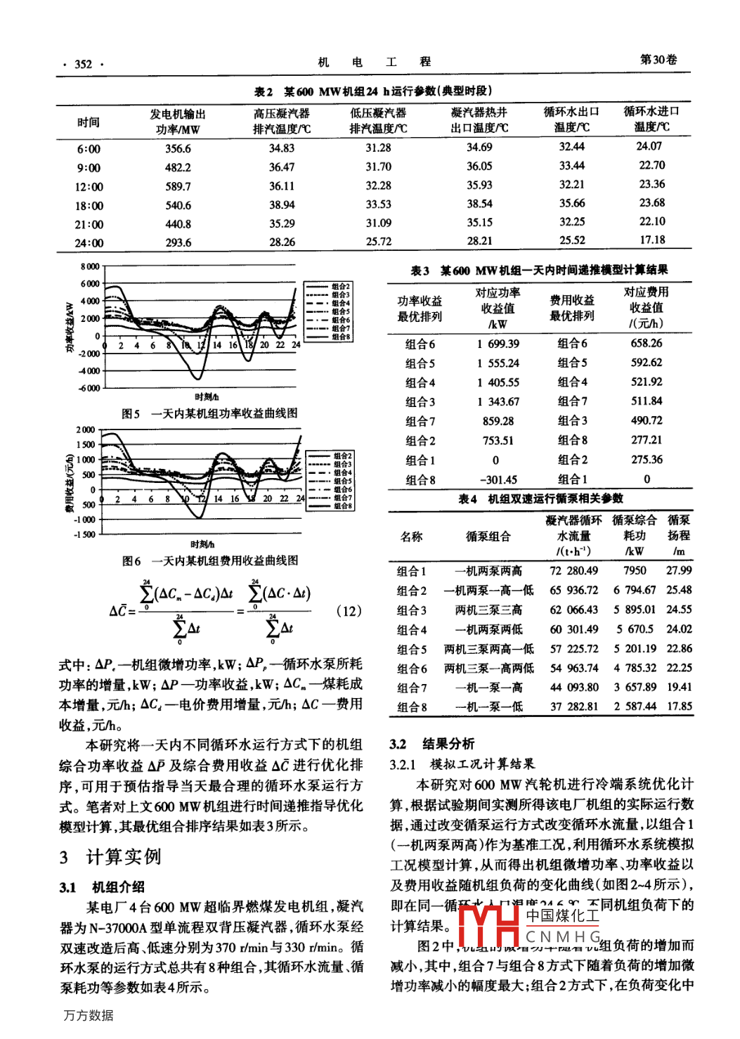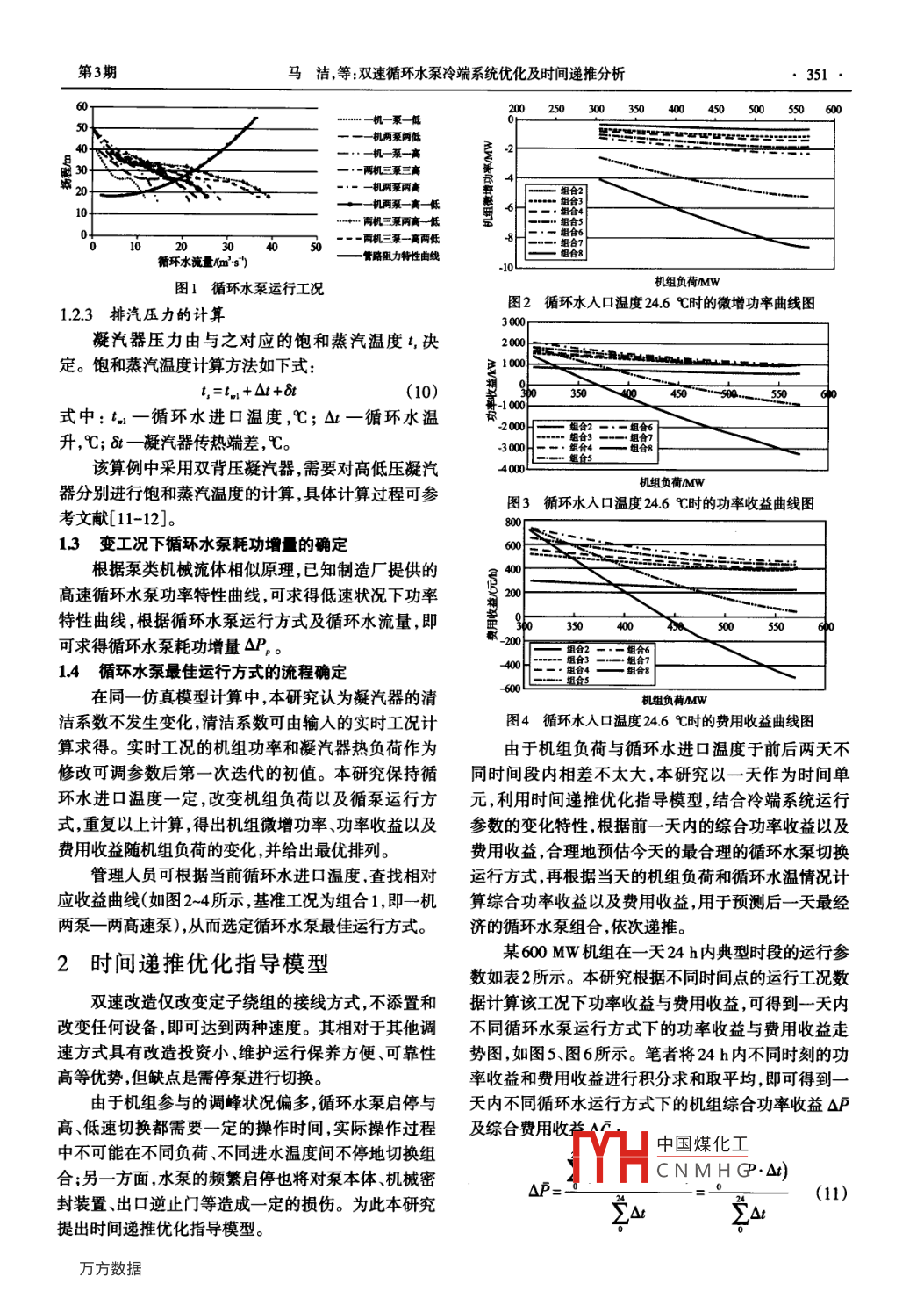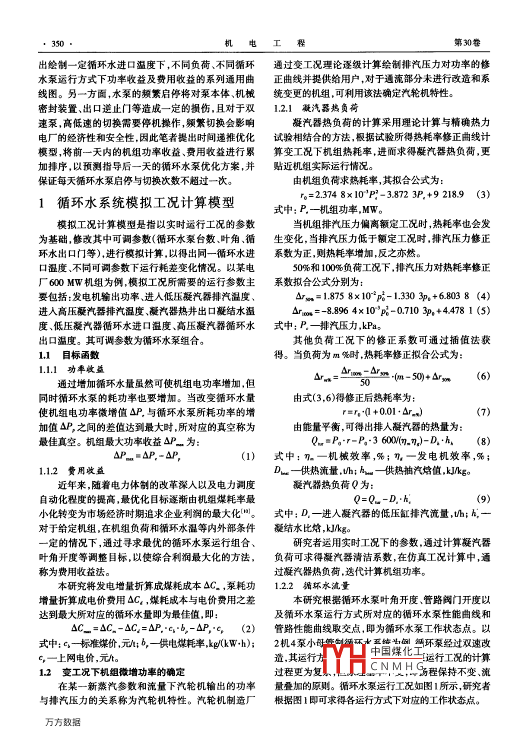 第30卷第3期機電工程Vol. 30 No.32013年3月Jourmal of Mechanical & Electrical EngineeringMar. 2013DOI: 10.3969/j.issn.1001- -4551 .2013.03.024雙速循環(huán)水泵冷端系統(tǒng)優(yōu)化及時間遞推分析馬潔',孫永平”,盛德仁",吳文健,李 蔚',陳堅紅'(1.浙江大學熱工與動力系統(tǒng)研究所,浙江杭州310027;2.浙江省電力公司電力科學研究院,浙江杭州310014)摘要:為探究雙速泵循環(huán)水系統(tǒng)優(yōu)化運行問題,對冷端系統(tǒng)模擬工況計算模型進行了分析建立了在- -定循環(huán)水進口溫度與不同負荷不同循環(huán)水泵運行方式下的功率收益及費用收益通用特性曲線;另外,為避免水泵啟停以及高低速切換過于頻繁,提出了時間遞推優(yōu)化模型,利用前一-天的綜合功率收益 、費用收益來預測后- -天的循環(huán)水泵優(yōu)化方案。 最后,以某電廠600 MW機組為例,利用以上分析模型進行了計算。研究結果表明:經優(yōu)化后的綜合機組功率收益可達1 699.39 kw ,運行費用收益可達每小時658.26元。關鍘詞:循環(huán)水系統(tǒng);雙速泵;優(yōu)化;時間遞推中圖分類號: TM621文獻標志碼:A文章編號:1001- 4551(2013)03- 0349-05Optimal operation and time recursion analysis of tw0- -speedcirculating water pump unitMA Jie', SUN Yong -ping', SHENG De -ren', WU Wen-jian', LI Wei', CHEN Jian-hong'(1. Institute of Thermal Science and Power System, Zhejiang University, Hangzhou 310027, China;2. Electric Power Research Institute, Zhejiang Electric Power Corporation, Hangzhou 310014, China)end system under the simulation working condition was investigated with the analysis of the general features of power income and expenseincome in a certain circulating water inlet temperature , difterent load and different water circulating pump operation. Otherwise, to avoidthe frequency of water pump's powering on, powering off and switching between high and low speed,a time recursion optimization modelwas put forward, which can predict the optimal operation mode a day after using the comprehensive power income and expense incomethe day before. Taking a 600 MW power plant as an example, it was caculated using these two models. The results indicate that thecomprehensive power income is up to 1 699.39 kW and the comprehensive expense income is up to 658.26 Yuan per hour.Key words: circulating water system; two -speed pump; optimization; time recursion重視循環(huán)水系統(tǒng)的優(yōu)化運行,并提出和采用了一一些優(yōu)0引言化方案,也取得了一-定的經濟效益[0-7]。循環(huán)水系統(tǒng)的優(yōu)化運行是指在滿足凝汽器最佳筆者從經濟性角度出發(fā),以某電廠600MW機組水量的前提下,尋找最優(yōu)的并聯(lián)水泵運行組合和調速為例,建立循環(huán)水系統(tǒng)模擬工況計算模型,以功率收比,使整個泵組處于最優(yōu)運行狀態(tài),以提高火電廠的益及費用收益作為目標函數,闡述微增功率和循環(huán)水經濟效益"。對于在100%額定負荷運行時的600 MW泵耗功的計算過程,考慮到機組經過雙速改造后,循機組,采用優(yōu)化計算之后的電能收益高達1482 kW ,環(huán)水泵的運行方式更多,采用傳統(tǒng)的等效益曲線圖[0-9]1占主機功率的0.25%2。長期以來許多發(fā)電廠都非常不能直觀與中國 煤化工,為此本研究提*YHCNM HG收稿日期: 2012-11-16作者簡介:馬潔(1989-),女 ,江蘇靖江人,主要從事火電及核電廠熱力性能計算等方面的研究. E- mail:21027079@zju.cdu.cn通信聯(lián)系人:盛德仁,男,教授. E-mail:shengdr@zju.edu.cn350 .機電工程第30卷出繪制- -定 循環(huán)水進口溫度下,不同負荷、不同循環(huán)通 過變工況理論逐級計算繪制排汽壓力對功率的修水泵運行方式下功率收益及費用收益的系列通用曲正曲線并提供給用戶,對于通流部分未進行改造和系線圖。另一方面,水泵的頻繁啟停將對泵本體、機械統(tǒng)變更的機組,可利用該法確定汽輪機特性。密封裝置、出口逆止門等造成- -定的損傷,且對于雙1.2.1 凝汽器熱 負荷速泵,高低速的切換需要停機操作,頻繁切換會影響凝汽器熱負荷的計算采用理論計算與精確熱力電廠的經濟性和安全性,因此筆者提出時間遞推優(yōu)化試驗相結合的方法,根據試驗所得熱耗率修正曲線計模型,將前一天內的機組功率收益、費用收益進行累算變工況下機組熱耗率,進而求得凝汽器熱負荷,更加排序,以預測指導后一天的循環(huán)水泵優(yōu)化方案,并貼近機組實際運行情況。保證每天循環(huán)水泵啟停與切換次數不超過一一次。由機組負荷求熱耗率,其擬合公式為:r。=2.374 8x10*P2 - 3.872 3P.+9 218.9 (3)1循環(huán)水系統(tǒng)模擬工況計算模型式中: P.- -機組功率, MW。模擬工況計算模型是指以實時運行工況的參數當機組排汽壓力偏離額定工況時,熱耗率也會發(fā)為基礎,修改其中可調參數(循環(huán)水泵臺數、葉角、循生變化, 當排汽壓力低于額定工況時,排汽壓力修正環(huán)水出口門等) ,進行模擬計算,以得出同- -循環(huán)水進系數為正,則熱耗率增加,反之亦然??跍囟取⒉煌烧{參數下運行耗差變化情況。以某電50%和100%負荷工況下,排汽壓力對熱耗率修正廠600 MW機組為例,模擬工況所需要的運行參數主系數擬合公式分別為:要包括:發(fā)電機輸出功率、進人低壓凝汽器排汽溫度、Or50on=1.875 8x 10~pζ- 1.330 3p.+6.803 8 (4)進入高壓凝汽器排汽溫度、凝汽器熱井出口凝結水溫r0on=-8.896 4x 10~p2-0.710 3po +4.478 1 (5)度、低壓凝汽器循環(huán)水進口溫度、高壓凝汽器循環(huán)水式中:P.-排汽壓力,kPao出口溫