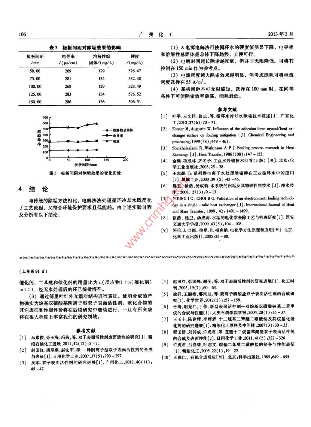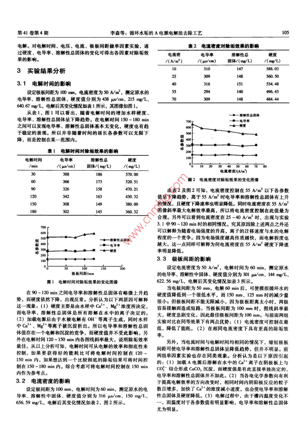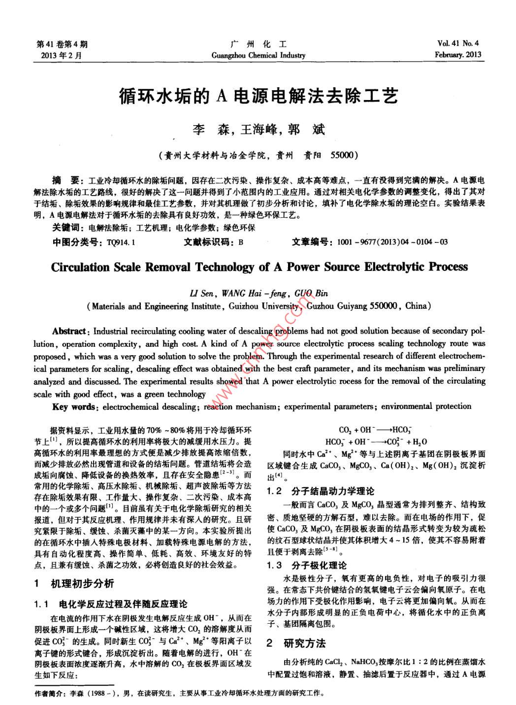 第41卷第4期廣州化工Vol.41 No.42013年2月Guangzhou Chemical IndustryFebruary. 2013循環(huán)水垢的A電源電解法去除工藝?yán)钌?,王海峰?郭斌(貴州大學(xué)材料與冶金學(xué)院,貴州貴陽(yáng)55000)摘要:工業(yè)冷卻循環(huán)水的除垢問(wèn)題,因存在二次污染、操作復(fù)雜、成本高等難點(diǎn),一直有沒(méi)得到完滿(mǎn)的解決。A電源電解法除水垢的工藝路線,很好的解決了這-問(wèn)題并得到了小范圍內(nèi)的工業(yè)應(yīng)用。通過(guò)對(duì)相關(guān)電化學(xué)參數(shù)的調(diào)整變化,得出了其對(duì)于結(jié)垢、除垢效果的影響規(guī)律和最佳工藝參數(shù),并對(duì)其機(jī)理做了初步分析和討論,填補(bǔ)了電化學(xué)除水垢的理論空白。實(shí)驗(yàn)結(jié)果表明,A電源電解法對(duì)于循環(huán)水垢的去除具有良好功效,是-一種綠色環(huán)保工藝。關(guān)鍵詞:電解法除垢;工藝機(jī)理;電化學(xué)參數(shù);綠色環(huán)保中圖分類(lèi)號(hào): TQ914. 1文獻(xiàn)標(biāo)識(shí)碼: B文章編號(hào): 100 -9677(2013)04 -0104 -03Circulation Scale Removal Technology of A Power Source Electrolytic Processu Sen, WANG Hai -feng, GUO Bin( Materials and Engineering Institute , Guizhou University , Guzhou Guiyang 550000 , China)Abstract: Industrial recirculating cooling water of descaling problems had not good solution because of secondary pol-lution, operation complexity, and high cost. A kind of A power source electrolytic process scaling technology route wasproposed,which was a very good solution to solve the problem. Through the experimental research of different electrochem-cal parameters for scaling, descaling effect was obtained with the best craft parameter, and its mechanism Was preliminaryanalyzed and discussed. The experimental results showed that A power electrolytic rocess for the removal of the circulatingscale with good effect, was a green technologyKey words : electrochemical descaling; reaction mechanism; experimental parameters ; environmental protection據(jù)資料顯示,工業(yè)用水量的70% ~ 80%將用于冷卻循環(huán)環(huán)CO2 + 0H-→HCO;節(jié)上川,所以提高循環(huán)水的利用率將極大的減緩用水壓力。提HCO; +0H"--→CO3° +H20高循環(huán)水的利用率最理想的方式便是減少排放提高濃縮倍數(shù),同時(shí)水中Ca2*、Mg2* 等與上述陰離子基團(tuán)在陰極板界面而減少排放必然出現(xiàn)管道和設(shè)備的結(jié)垢問(wèn)題。管道結(jié)垢將會(huì)造區(qū)域鍵 合生成CaCO3、MgCO3、Ca(OH)2、Mg( 0H)2沉淀析成垢向腐蝕、降低設(shè)備的換熱效率,且存在安全隱患(-31。 而出4。常用的化學(xué)除垢、高壓水除垢、機(jī)械除垢、超聲波除垢等方法1.2 分子結(jié)晶動(dòng)力學(xué)理論存在除垢效果有限、工作量大、操作復(fù)雜、二次污染、成本高-般而言CaCO3及MgCO,晶型通常為排列整齊、結(jié)構(gòu)致中的一個(gè)或多個(gè)問(wèn)題”。目前雖有關(guān)于電化學(xué)除垢研究的相關(guān)密、質(zhì)地堅(jiān)硬的方解石型,難以去除。而在電場(chǎng)的作用下,促報(bào)道,但對(duì)于其反應(yīng)機(jī)理、作用規(guī)律并未有深人的研究。且研使CaCO,及MgCO,在陰極板表面的結(jié)晶形式轉(zhuǎn)變?yōu)檩^為疏松究緊限于除垢、緩蝕、殺菌滅藻中的某-方向。 本實(shí)驗(yàn)所提出.的在循環(huán)水中插人特殊電極材料、加載特殊電源電解的方法,的紋石 型球狀結(jié)晶并使其體積增大4-15倍,使其不容易附著具有自動(dòng)化程度高、操作簡(jiǎn)單、低耗、高效、環(huán)境友好的特且便于剝離去除[' 8。點(diǎn),且兼有緩蝕、殺菌之功效,必將創(chuàng)造良好的社會(huì)效益。1.3 分子極化理論水是極性分子,氧有更高的電負(fù)性,對(duì)電子的吸引力很1機(jī)理初步分析強(qiáng)。在常態(tài)下共價(jià)鍵結(jié)合的氫氧鍵電子云會(huì)偏向氧原子。在電1.1電化學(xué)反應(yīng)過(guò)程及伴隨反應(yīng)理論場(chǎng)力的作用下受極化作用影響,電子云將更加偏向氧。從而在在電流的作用下水在陰極發(fā)生電解反應(yīng)生成0H~,從而在水分子內(nèi)部形成明顯的正負(fù)電荷中心,將循化水中的正負(fù)離陰極板界面上形成-一個(gè)堿性區(qū)域,這將增大CO2的溶解度從而子、基團(tuán)隔離包圍。促進(jìn)CO5的生成。同時(shí)新生CO3-與Ca*、Mg*等陽(yáng)離子以2研究方法 .離子鍵的形式鍵合,形成沉淀析出。隨著電解的進(jìn)行,OH在陰極板表面濃度逐漸升高,水中溶解的CO2在極板界面區(qū)域發(fā)由分析純的CaCl2、NaHCO,按摩爾比1 :2的比例在蒸餾水生如下反應(yīng):中配置過(guò)飽和溶液,靜置、抽濾后置于反應(yīng)器中,通過(guò)A電源作者簡(jiǎn)介:李森(1988-), 男,在讀研究生,主要從事工業(yè)冷卻循環(huán)水處理方面的研究工作。05第41卷第4期李森等:循環(huán)水垢的A電源電解法去除工藝電解。對(duì)電解時(shí)間、電壓、電流、極板間距做單因素實(shí)驗(yàn),通表2電流密度對(duì)除垢效果的影響過(guò)硬度、電導(dǎo)率、溶解性總固體的變化可得出各因素對(duì)除垢效電流密電導(dǎo)率溶解性總硬果的影響。/(Nm2)/(μv/em)固體/(mg/L)/(mg/L)03147588. 033實(shí)驗(yàn)結(jié)果分析253048560. 503.1電解時(shí)間的影響1o51534. 485529440496.45設(shè)定極板間距為100 mm,電流密度為s0 Nm',測(cè)定原水的電導(dǎo)率、溶解性總固體、硬度值分別為438 uμs/cm、215 mg/L、704