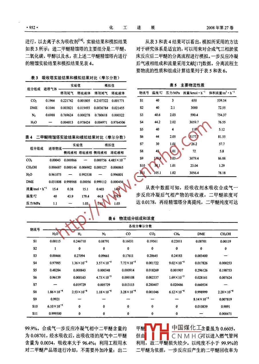 化工進(jìn)展2008年第27卷第6期CHEMICAL INDUSTRY AND ENGINEERING PROGRESS應(yīng)用技術(shù)合成氣一步法制二甲醚的一種分離流程韓媛媛1,張海濤’,應(yīng)衛(wèi)勇,房鼎業(yè)1(華東理工大學(xué)化學(xué)工程聯(lián)合國家重點(diǎn)實(shí)驗(yàn)室,大型工業(yè)反應(yīng)器工程教育部工程研究中心,上海200372華僑大學(xué)化工系,福建泉州362021)摘要:針對(duì)合成氣一步法制備二甲醚的工藝略線,在進(jìn)行了二甲醚吸收和精餾的實(shí)驗(yàn)基礎(chǔ)上,提出了用水吸收一步反應(yīng)冷凝后氣相產(chǎn)物中的二甲醚的分離工藝流程:反應(yīng)冷凝液相與吸收后的液體混合后進(jìn)入二甲醚精餾塔二甲醚產(chǎn)品從精餾塔側(cè)線引岀,塔底甲醇和水去甲醇精餾塔.在實(shí)驗(yàn)教據(jù)的基礎(chǔ)上,對(duì)二甲醚分離工藝流程進(jìn)行了模擬計(jì)算關(guān)鍵詞:合成氣一步法;二甲醚;分離;模擬計(jì)算中圖分類號(hào):TQ013文獻(xiàn)標(biāo)識(shí)碼:A文章編號(hào):1000-6613(2008)06-0949-05eparation process of dimethyl ether synthesized by one-step methodfrrom syngasHAN Yuanyuan 2, ZHANG Haitao, YING Weiyong, FANG Dingye( State Key Laboratory of Chemical Engineering, Engineering Research Center of Large Scale Reactor Engineering andTechnology, Ministry of Education, East China University of Science and Technology, Shanghai 200237, China;Department of Chemical Engineering, Huaqiao University, Quanzhou 362021, Fujian, China)Abstract: Based on the experiment of absorption and distillation of dimethyl ether (DME), theseparation process for high purity dMe was proposed for the one-step synthesis of DME from syngasThe gas mixture of condensedstep reaction resultants was absorbed by deionized water, and themixture stream of liquid from absorber and liquid stream of condensed one-step reaction resultants wasfed into the DME rectifyer. DMe was drawn from the side stream of the DME rectifier. The bottomstream containing water and methanol was then fed into the methanol rectifyer. with the experimentaldata, simulation calculation of the separation process was made for referenceKey words: one-step methed from syngas; dimethyl ether(DME); separation; simulation calculation中國是一個(gè)煤炭資源豐富而石油儲(chǔ)量相對(duì)短缺復(fù)雜。開發(fā)中的分離工藝主要采用吸收和精餾等化的國家,因此開發(fā)基于煤的液體燃料而避免對(duì)石油工單元操作過程得到純度較高的二甲醚產(chǎn)品。一種產(chǎn)品的嚴(yán)重依賴是非常必要地叫。在煤基可替代燃分離工藝是一步反應(yīng)后產(chǎn)物分為氣液兩相。Kohl料中,二甲醚由于卓越的性能而成為理想的替代燃等提出氣相產(chǎn)物被吸收劑吸收后送入解吸裝置料2。二甲醚有含氧較短的分子式,沒有CC鍵,部分二甲醚根據(jù)要求的純度,從第二精餾塔加入。有高的十六烷值和低的自燃點(diǎn)。與二甲醚有關(guān)的可 Voss Bodi等的工藝主要是液相產(chǎn)物進(jìn)入第一精替代燃料技術(shù)吸引了世界范圍內(nèi)越來越多的目光。收稿日其目前,制取二甲醚的最新技術(shù)是從合成氣直接菡建項(xiàng)中國煤化工01E02B02)及國家973制取,相比較甲醇脫水制二甲醚而言,一步法合計(jì)劃項(xiàng)目CNMHG成二甲醚因?yàn)轶w系存在有未反應(yīng)完的合成氣以及二第一作者簡介:韓媛媛(1972-),女,博士研究生。聯(lián)系人:應(yīng)衛(wèi)勇,教授,博士生導(dǎo)師,研究方向?yàn)樘家换?。電?1-6425219氧化碳,要得到純度較高的二甲醚,分離過程比較E- mail wing @ecusteducT化工進(jìn)展2008年第27卷餾塔,塔釜餾分進(jìn)入第二精餾塔,塔頂?shù)募状颊魵獠加?個(gè)可裝熱電偶的開口和5個(gè)液相取樣裝置,引入清洗系統(tǒng)來洗滌氣相產(chǎn)物,將反應(yīng)產(chǎn)物與從第見圖1。分別對(duì)應(yīng)6個(gè)溫度樣品點(diǎn)和5個(gè)組分樣品精餾塔頂?shù)玫降酿s分混合,即為燃料級(jí)二甲醚。點(diǎn)。精餾塔外部用保溫材料保溫,再沸器采用電加Sosa等的工藝是液相產(chǎn)物通過二步精餾,氣相產(chǎn)熱并裝有調(diào)節(jié)器,塔頂氣相出口裝有背壓閥,采用物與閃蒸氣一起被吸收劑洗滌除去其中的二甲醚, Agilent6820色譜儀分析氣相及液相組成。原料液經(jīng)含有二甲醚的吸收劑被送入第一個(gè)精餾塔。唐宏青計(jì)量泵從塔中部加入,調(diào)整加熱釜熱量,控制背壓等的分離流程與Kohl等相類似。Peng等提出的閥和冷凝器液相流率,使精餾過程在一定的操作壓一步反應(yīng)后分離二甲醚的改進(jìn)工藝是在洗滌塔中用力下穩(wěn)態(tài)運(yùn)行。溶劑洗滌包括二甲醚、甲醇、二氧化碳以及未反應(yīng)的合成氣混合物,回收洗滌后的洗滌液,進(jìn)行多步處理。另外的分離工藝是一步反應(yīng)混合物直接用溶劑進(jìn)行洗滌吸收,洗滌液送去精餾以獲得二甲醚產(chǎn)塔頂氣相物流品,董岱峰例、鄭丹星、田原宇等作了相關(guān)研/·塔頂液相物流究和報(bào)道。此外,美國 Air products公司2和日本NKK公司①成功地開發(fā)了用漿態(tài)床反應(yīng)器由合成氣一步法合成二甲醚的新工藝國內(nèi)研究的重點(diǎn)在催化劑和反應(yīng)器結(jié)構(gòu)方面,有關(guān)流程的研究很少。本文作者在對(duì)合成氣一步法生產(chǎn)二甲醚冷凝后氣相產(chǎn)物進(jìn)行吸收分離實(shí)驗(yàn)研究的基礎(chǔ)上1,對(duì)含二甲醚、二氧化碳、甲醇和水的進(jìn)料物流四組分溶液進(jìn)行精餾實(shí)驗(yàn)