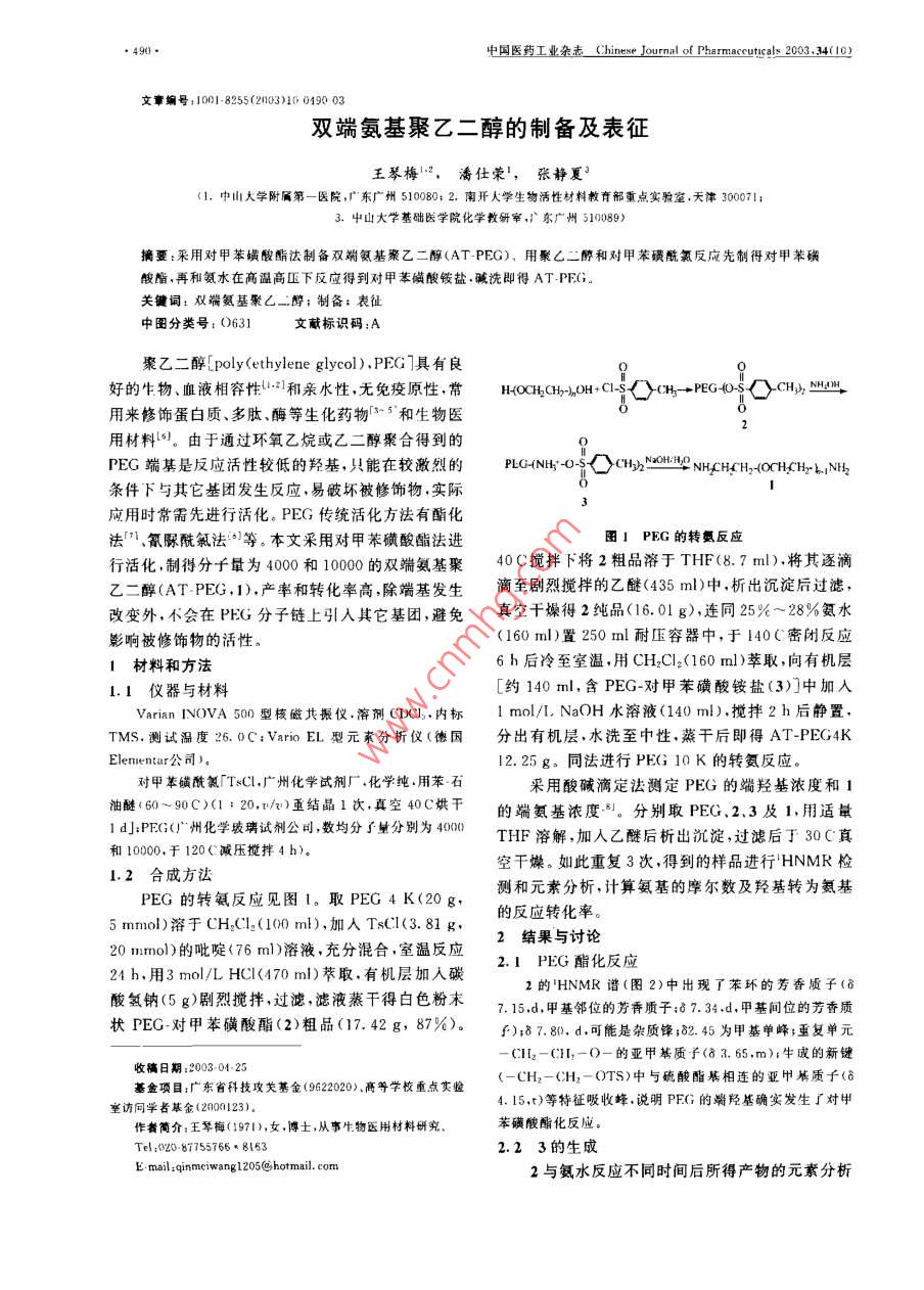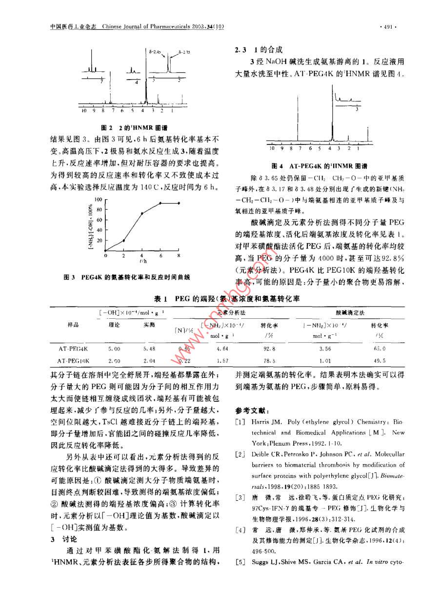 中國醫(yī)藥工業(yè)雜志 Chinese journal of pharmaceuticals2003,34(10)文章編號:100-8255(203)10019003雙端氨基聚乙二醇的制備及表征王琴梅2,潘仕榮,張靜夏(1,中山大學附屬第一醫(yī)院,廣東廣州51008;2.南開大學生物活性材料教育郁重點實驗室,天津300071;3屮山大學基礎醫(yī)學院化學教研宰,;東廣州510089)擴要:釆用對甲苯磺酸酯法制備雙端氨基聚乙二醇(AT-PEG),用聚乙二酵和對甲苯磺酰氯反應先制得對甲苯碳酸酯,再和氨水在高溫高壓下反應得到對甲苯磺酸銨鹽,堿洗即得 AT-PEO關鍵詞:雙端氨基聚乙二醇;制備;表征中圖分類號:0631文獻標識碼:A聚乙二醇[poly( ethylene glycol),PFG門具有良好的牛物、血液相容性和親水性無免疫原性常H40 H,CHp),OH+CI-SOCHS→P45○cH叫用來修飾蛋白質(zhì)、多肽、酶等生化藥物5和生物醫(yī)用材料。由于通過環(huán)氧乙烷或乙二醇聚合得到的PEG端基是反應活性較低的羥基,只能在較激烈的 PLG- NH; -O-SOCH3邊“ NHCHCH2HOCH-CH2kN條件下與其它基團發(fā)生反應,易破壞被修飾物,實際應用時常需先進行活化。PEG傳統(tǒng)活化方法有酯化法、氰脲酰氯法等。本文采用對甲苯磺酸酯法進圖IPEG的轉(zhuǎn)氨反應行活化制得分f量為4000和1000雙端氨基聚40C攪拌下將2粗品溶于THF(87m1),將其逐滴乙二醇( AT- PEG,1),產(chǎn)率和轉(zhuǎn)化率高除端基發(fā)生滴至劇烈攪拌的乙醚(435m)中,析出沉淀后過濾,改變外,不會在PEG分子鏈上引入其它基團,避免真空干燥得2純品(16.01g),連同25%~28%氨水影響被修飾物的活性(160ml)置250ml耐壓容器中,于140C密閉反應材料和方法6h后冷至室溫,用CH2Cl2(160ml)萃取,向有機層L.1儀器與材料[約140ml,含PEG-對甲苯磺酸銨鹽(3)]中加入Varian INOVA500型核磁共振儀,溶劑CLCl,內(nèi)標1mol/L.NaOH水溶液(140ml),攪拌2h后靜置,TMS,測試溫度26.0C; Vario El型元素分析儀(德國分出有機層,水洗至中性,蒸干后即得AT-PEG4K12.25g。同法進行PEG10K的轉(zhuǎn)氨反應。對甲苯磺酰氯「TsCl,廣州化學試劑廠,化學純用苯石采用酸堿滴定法測定PEG的端羥基濃度和1油醚(60~90)(1:20,()重結(jié)品1次,真空40C烘干的端氨基濃度。分別取PEG、2、3及1,用適量1d」;PEG(廣¨州化學玻璃試劑公司,數(shù)均分了量分別為400THF溶解,加人乙醚后析出沉淀,過濾后于30C真和10000,于120C減壓攪拌4h)空干燥。如此重復3次,得到的樣品進行HNMR檢l.2合成方法測和元素分析,計算氨基的摩爾數(shù)及羥基轉(zhuǎn)為氨基PEG的轉(zhuǎn)氨反應見圖1。取PEG4K(20g5mmol)溶于CH2Cl2(100m1),加入TsCl(3.81g,的反應轉(zhuǎn)化率室溫反應2結(jié)果與討論20mmol)的吡啶(76m1)溶液,充分混合,室溫反應2.IPEG酯化反應24h,用3mol/LHCl(470ml)萃取,有機層加入碳2的"HNMR譜(圖2)中出現(xiàn)了苯環(huán)的芳香質(zhì)子(酸氫鈉(5g)劇烈攪拌,過濾,濾液蒸干得白色粉末15d,甲基鄰位的芳香質(zhì)子:713,d,甲基間位的芳香質(zhì)狀PEG對甲苯磺酸酯(2)粗品(17.42g,87%)。f);87.80,d,可能是雜質(zhì)鋒;82.45為甲基單峰;重復單元CI2-CI2-O-的亞甲基質(zhì)子(83.65,m);牛成的新鍵收稿日期:2003-0425基魚項目:廣東省科技攻關金(9622高學校重點實驗(-CH;-CH2-OTs)中與硫酸酯轄相連的亞甲基質(zhì)子(6訪問學者基金(20123)4.15,)等特征吸收峰,說明PFG的端羥基確實發(fā)生了對甲作者簡介:王琴梅(1971),女,博士,從事生物醫(yī)用村料研究苯磺酸酯化反應Te}:02087755766·81632.23的生成Email:qinmeiwangl205@hotmail.com2與氨水反應不同時間后所得產(chǎn)物的元素分析中國醫(yī)藥工業(yè)雜志 Chinese Journal of Pharmaceuticals2003,34(10)!5-248-235231的合成3經(jīng)NQH堿洗生成氨基游離的1反應液用量水洗至中性。 AT-PEG4K的HNMR譜見圖4。圖22的HNMR圖譜結(jié)果見圖3。由圖3可見,6h后氨基轉(zhuǎn)化率基本不變。高溫高壓下,2極易和氨水反應生成3,隨著溫度上升,反應速率增加,但對耐壓容器的要求也提高。圖4AI-PEG4K的NMR圖譜為得到較高的反應速率和轉(zhuǎn)化率又不致使成本過除83.65處仍保留一CH2CH2-O-中的亞甲基質(zhì)高,本實驗選擇反應溫度為140C,反應時間為6h。子峰外,在83.17和83,48處分別出現(xiàn)了生成的新鍵(NHCH2-C12-0-)中與端氨基相連的亞甲某質(zhì)子峰及與氧相連的亞甲基質(zhì)子峰酸堿滴定及元素分析法測得不同分子量PEG的端羥基濃度、活化后端氨基濃度及轉(zhuǎn)化率見表對甲苯磺酸酯法活化PEG后,端氨基的轉(zhuǎn)化率均較高,當PEG的分子量為4000時,甚至可達92.8%(元素分析法)。PEG4K比PEG10K的端羥基轉(zhuǎn)化圖3PEG4K的氨基轉(zhuǎn)化率和反應時間曲線率高,可能的原因是:分子量小的聚合物更易溶解,表IPEG的端羥(氨)基濃度和氨基轉(zhuǎn)化率[-OH]X10-/molg I元素分析法酸堿滴定法理論N4-NH×10-轉(zhuǎn)化半-NH2]×104轉(zhuǎn)化率mol·gAT-PFG4KAT- PEGIOK1.5778.5其分子鏈在溶劑中完全舒展開,端羥基都暴露在外;并測定端氨基的轉(zhuǎn)化率。結(jié)果表明本法確實可以得分子量大的PEG則可能因為分子間的相互作用力到端基為氨基的PEG,步驟簡單,原料易得太大而使鏈相互纏繞成線團狀,端羥基有可能被包埋起來減少了參與反應的幾率;另外,分子量越大,參考文獻空間位阻越大,TsCl越難接近分子鏈上的端羥基,[1] Harris jM.Poly( ethylene glycol) ChemisTry:Bin即分子量增加后·宮能團之間的碰捶反應幾率降低technical and Biomedical Applications LM. New因此反應轉(zhuǎn)化率降低。York: Plenum Press, 1992.1-10另外從表中還可以看出,元素分析法得到的反[23 Deible CR, Petrosko 