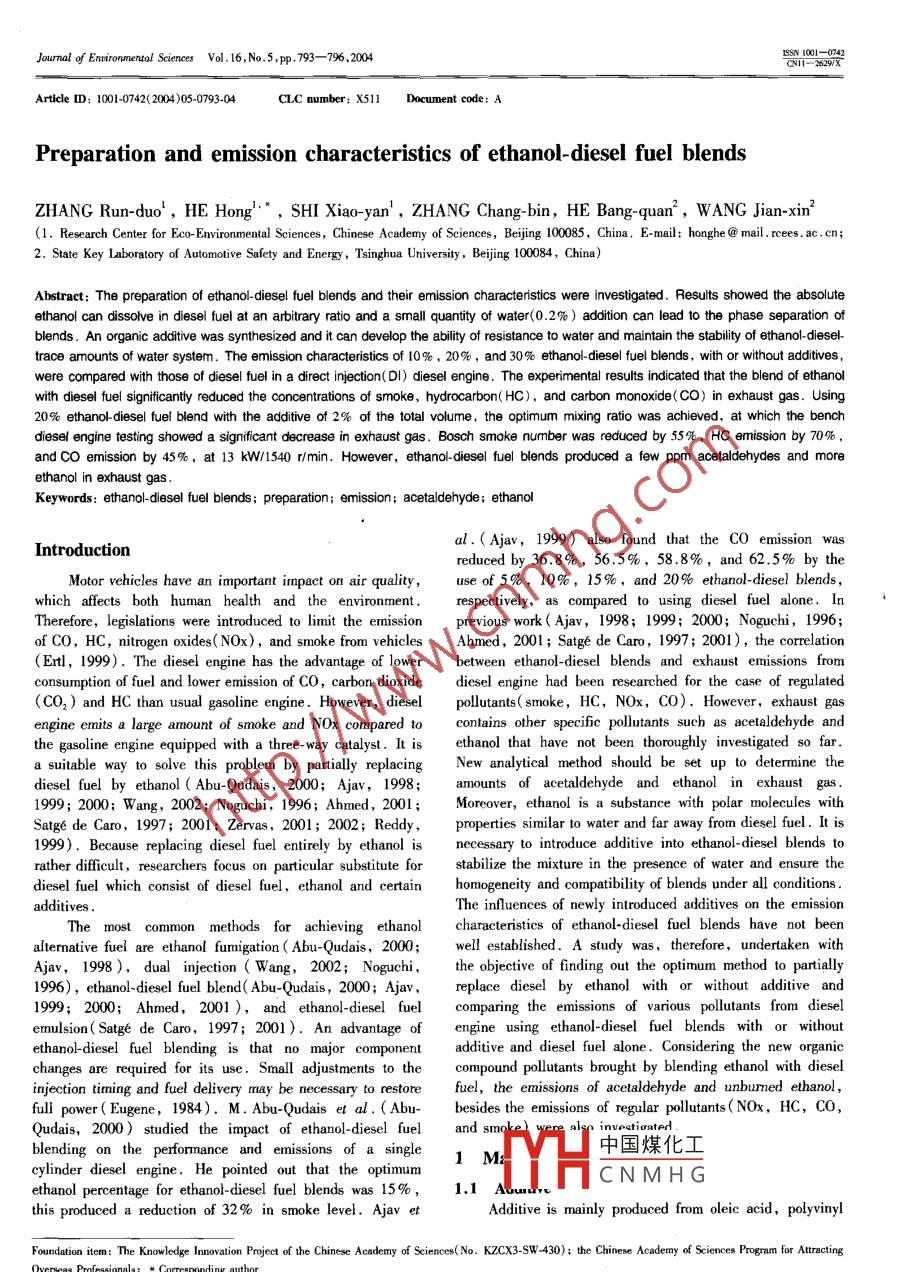 Journal of Enuironmental Sciences Vol 16, No 5, Pp. 793--796 2004Article nl:1001-0742(2004)050793-04CLC number: x511 Document code: APreparation and emission characteristics of ethanol-diesel fuel blendsZHANG Run-duo, HE Hong", SHI Xiao-yan, ZHANG Chang-bin, HE Bang-quan,WANG Jian-xin(1. Research Center for Eco-Environmental Sciences, Chinese Academy of Sciences, Beijing 100085, China. E-mail: honghe mail rcees ac cn;2. State Key Laboratory of Automotive Safety and Energy, Tsinghua University, Beijing 100084, China)Abstract: The preparation of ethanol-diesel fuel blends and their emission characteristics were investigated. Results showed the absoluteethanol can dissolve in diesel fuel at an arbitrary ratio and a small quantity of water (0. 2% )addition can lead to the phase separation ofblends. An organic additive was synthesized and it can develop the ability of resistance to water and maintain the stability of ethanol-diesel-trace amounts of water system The emission characteristics of 10%, 20%, and 30% ethanol-diesel fuel blends, with or without additiveswere compared with those of diesel fuel in a direct injection( Di)diesel engine. The experimental results indicated that the blend of ethanolwith diesel fuel significantly reduced the concentrations of smoke hydrocarbon( HC), and carbon monoxide( CO)in exhaust gas. Using20% ethanol-diesel fuel blend with the additive of 2% of the total volume, the optimum mixing ratio was achieved at which the benchdiesel engine testing showed a significant decrease in exhaust gas. Bosch smoke number was reduced by 5596, HC emission by 70%0and CO emission by 45 %, at 13 kW/1540 r/min. However, ethanol-diesel fuel blends produced a few ppm acetaldehydes and moreethanol in exhaust gasKeywords: ethanol-diesel fuel blends: preparation; emission; acetaldehyde; ethanolIntroduction(Ajav, 1999 )also found that the COreduced by 36.8%,56.5%,58.8%, and 62.5% by theMotor vehicles have an important impact on air quality, use of 5%,10%6, 15%,anehich affects both human health and the environment. respectively, as compared to using diesel fuel alone. Inlegislations were introduced to limit the emission previous work( ajav, 1998; 1999; 2000; Noguchi, 1996;of CO, HC, nitrogen oxides( NOx), and smoke from vehicles Ahmed, 2001; Satge de Caro, 1997; 2001), the correlation(Ertl, 1999). The diesel engine has the advantage of lower between ethanol-diesel blends and exhaust emissions fromconsumption of fuel and lower emission of CO, carbon dioxide diesel engine had been researched for the case of regulated( Co,)and HC than usual gasoline engine. However, diesel pollutants(smoke, HC, NOx, CO). However, exhaust gasengine emits a large amount of smoke and NOx compared to contains other specific pollutants such as acetaldehydethe gasoline engine equipped with a three-way catalyst. It is ethanol that have not been thoroughly investigated soa suitable way to solve this problem by partially replacing New analytical method should be set up to determinediesel fuel by ethanol( Abu-Qudais, 2000; Ajav, 1998; amounts of acetaldehyde and ethanol in exhaust gas1999; 2000; Wang, 2002; Noguchi, 1996; Ahmed, 2001; Moreover, ethanol is a substance with polar molecules withSatge de Caro, 1997; 2001; Zervas, 2001; 2002; Reddy, properties similar to water and far away from diesel fuel. It is1999). Because replacing diesel fuel entirely by ethanolnecessary to introduce additive into ethanol-diesel blends torather difficult, researchers focus on particular substitute for stabilize the mixture in the presence of water and ensure thediesel fuel which consist of diesel fuel, ethanol and certain homogeneity and compatibility of blends under all conditionsdditivesThe influences of newly introduced additives on the emissionThe most common methods for achieving ethanol characteristics of ethanol-diesel fuel blends have not beenalternative fuel are ethanol fumigation( Abu-Qudais, 2000; well established. A study was, therefore, undertakenAjav, 1998), dual injection( Wang, 2002; Noguchithe objective of finding out the optimum method to par1996), ethanol-diesel fuel blend( Abu-Qudais, 2000; Ajavreplace diesel by ethanol with or without additive1999; 2000; Ahmed, 2001), and ethanol-diesel fuel comparing the emissions of various pollutants from dieselemulsion( Satge de Caro, 1997: 2001). An advantage of engine using ethanol-diesel fuel blends with or withoutethanol-diesel fuel blending is that no major component additive and diesel fuel alone. Considering the new organicchanges are required for its use. Small adjustments to the compound pollutants brought by blending ethanol with dieselinjection timing and fuel delivery may be necessary tofuel, the emissions of acetaldehyde and unbumed ethanolfull power( Eugene, 1984). M. Abu-Qubesides the emissions of regular pollutants( NOx, HC, COQudais, 2000 )studied the impact of ethanol-diesandblending on the performance and emissions of a single中國煤化工1M:cylinder diesel engine. He pointed out that the optimumCNMHGthanol percentage for ethanol-diesel fuel blends was 15 %, 1.1 athis produced a reduction of 32 in smoke level. Ajav elAdditive is mainly produced from oleic acid, polyvinylitem: The Knowledge Innovation Project of the Chinese Academy of Sciences( No. KZCX3-SW-430): the Chinese Academy of Sciences Program for AttractingOverseas Professionals; Corresponding author794ZHANG Run-duo et alVol. 16alcohol and lecithin. Oleic acid, polyvinyl alcohol, xyleand tetrabutyl phthalate were mixed together in the ratio of 2 Results and discussion15: 5: 3: 1. After stirring completely, this mixture was pourinto a rotary evaporator and evaporated at 70 C for 10 h under 2.1 Ethanol-diesel fuel blendsvacuum condition. 2% lecithin in the volume of preparedthanol is a hydrophilic organic compound containingmixture was added and mixed continuously, and then a hydroxyl functional group and can dissolve in water. Dieselyellow and viscousadditive was preparedfuel is a sort of prod
