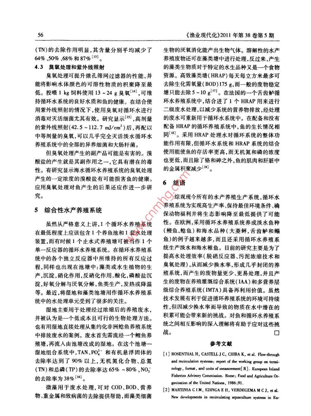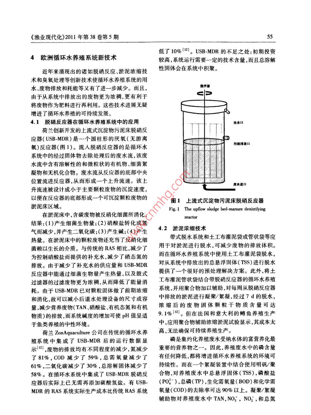 《漁業(yè)現(xiàn)代化》2011年第38卷第5期53歐洲循環(huán)水養(yǎng)殖系統(tǒng)研究進(jìn)展丁建樂(lè),鮑旭騰,梁澄(中國(guó)水產(chǎn)科學(xué)研究院漁業(yè)機(jī)械儀器研究所,上海200092)摘要:歐洲循環(huán)水養(yǎng)殖系統(tǒng)技術(shù)隨著歐盟和歐洲各國(guó)環(huán)保法規(guī)的加強(qiáng)而不斷創(chuàng)新和發(fā)展。本文對(duì)歐洲正在使用生命周期法對(duì)循環(huán)水養(yǎng)殖進(jìn)行環(huán)境影響評(píng)估的狀況,以及歐洲應(yīng)用獨(dú)特的循環(huán)水養(yǎng)殖系統(tǒng)技術(shù)增加了養(yǎng)殖的品種進(jìn)行了介紹和分析。并著重介紹了歐洲循環(huán)水養(yǎng)殖系統(tǒng)新技術(shù)的應(yīng)用及其發(fā)展?fàn)顩r,特別闡述了脫硝反應(yīng)技術(shù)、淤泥濃縮技術(shù)和臭氧技術(shù)等新技術(shù)在循環(huán)水養(yǎng)殖系統(tǒng)的應(yīng)用情況。在此基礎(chǔ)上,指出了循環(huán)水養(yǎng)殖可能面臨的新挑戰(zhàn)。關(guān)鍵詞:循環(huán)水養(yǎng)殖系統(tǒng);生命周期評(píng)估法;脫硝反應(yīng)器;淤泥濃縮;臭氧處理;歐洲水產(chǎn)養(yǎng)殖中圖分類號(hào):S969.38文獻(xiàn)標(biāo)識(shí)碼:A文章編號(hào):10079580(2011)055305的換水量約為9000L5。1概述據(jù)報(bào)道,歐洲水產(chǎn)孵化生產(chǎn)也正轉(zhuǎn)向使用循環(huán)水養(yǎng)殖系統(tǒng)( Recirculating Aquaculture循環(huán)水養(yǎng)殖系統(tǒng)。在法羅群島,00年以后,大System,RAS)是一種將系統(tǒng)中的水經(jīng)過(guò)處理后重西洋二齡鮭魚已全部從流水式養(yǎng)殖生產(chǎn)轉(zhuǎn)向循環(huán)都是為了在滿足養(yǎng)殖系統(tǒng)對(duì)廢物控制要求的前提b生產(chǎn)其養(yǎng)成尺寸也從流水式養(yǎng)殖系統(tǒng)中復(fù)使用的養(yǎng)殖系統(tǒng)。系統(tǒng)中的每一步水處理水養(yǎng)~70g增加到循環(huán)水養(yǎng)殖系統(tǒng)中的140下,減少系統(tǒng)的水交換量。按不同的水交換率分108這種轉(zhuǎn)向的原因來(lái)自于:(1)預(yù)計(jì)未來(lái)可類養(yǎng)殖系統(tǒng)又可分為流水式( low through)養(yǎng)殖能存在水源短缺,用水質(zhì)量會(huì)有所降低,以及水的系統(tǒng)(每投喂1kg飼料換水量>50m3)、水再利季節(jié)性溫差大等因素;(2)用循環(huán)系統(tǒng)生產(chǎn)的二用(re-ue)養(yǎng)殖系統(tǒng)(每投喂1kg飼料換水量1齡鮭魚質(zhì)量更佳(轉(zhuǎn)到海中養(yǎng)殖后生長(zhǎng)和存活情50m3)和傳統(tǒng)型循環(huán)水養(yǎng)殖系統(tǒng)(每投喂1kg況好)切。在挪威,采用循環(huán)水養(yǎng)殖系統(tǒng)生產(chǎn)的二齡鮭魚預(yù)計(jì)將達(dá)8500萬(wàn)尾1。飼料換水量01~1.0m3),以及下一代( next gen目前,采用循環(huán)水養(yǎng)殖系統(tǒng)的歐洲國(guó)家越來(lái)eration))或創(chuàng)新型( Innovative)循環(huán)水養(yǎng)殖系統(tǒng)越多。但總體而言,與網(wǎng)箱養(yǎng)殖、流水式養(yǎng)殖或池(每投喂1kg飼料換水量<01m3)2)。塘養(yǎng)殖等養(yǎng)殖方式相比,循環(huán)水養(yǎng)殖系統(tǒng)在歐洲歐洲建立起循環(huán)水養(yǎng)殖生產(chǎn)技術(shù)的國(guó)家主要的應(yīng)用仍顯緩慢。循環(huán)水養(yǎng)殖方式對(duì)養(yǎng)殖生產(chǎn)的是荷蘭和丹麥。在荷蘭,幾乎全封閉的、典型的室貢獻(xiàn)份額仍只占小部分。原因之一是建設(shè)循環(huán)水內(nèi)循環(huán)水養(yǎng)殖系統(tǒng)(每投喂1kg飼料每天換水30養(yǎng)殖系統(tǒng)需要高昂的初期資金投入;另一重要原300L),主要用于生產(chǎn)淡水品種的非洲鯰魚因是如何控制系統(tǒng)中魚類疾病的爆發(fā)。和鰻魚;丹麥則是室外的半封閉式的循環(huán)水養(yǎng)殖隨著歐洲各國(guó)環(huán)保法規(guī)的愈加嚴(yán)厲,歐盟水系統(tǒng),主要用于鱒魚的養(yǎng)成生產(chǎn),投喂千克飼料的管理法令的頒布實(shí)施歐洲循環(huán)水養(yǎng)殖系統(tǒng)的研換水量約3900L,是傳統(tǒng)鱒魚養(yǎng)殖換水率的1/發(fā)和應(yīng)用也得到了很好的創(chuàng)新和發(fā)展。盡管歐盟134。而在法國(guó),按照丹麥模式循環(huán)水養(yǎng)殖系統(tǒng)水管理法令并沒(méi)有直接涉及水產(chǎn)養(yǎng)殖業(yè)的條款建造運(yùn)行的一個(gè)鱒魚養(yǎng)殖場(chǎng),投喂千克飼料每天但它對(duì)促進(jìn)環(huán)境友好型水產(chǎn)養(yǎng)殖生產(chǎn)系統(tǒng)的發(fā)展收稿日期:20110821修回日期:201109-10基金項(xiàng)目:國(guó)家鲆鰈類產(chǎn)業(yè)技術(shù)體系( nyhyzx50)作者簡(jiǎn)介:丁建樂(lè)(1963-)男,工程師,主要從事漁業(yè)裝備信息研究。E-mail;dingjian@fmin.ac.cn《漁業(yè)現(xiàn)代化》2011年第38卷第5期具有推動(dòng)作用。歐洲再循環(huán)水產(chǎn)養(yǎng)殖系統(tǒng)在技個(gè)鱒魚養(yǎng)殖場(chǎng)將飼料轉(zhuǎn)化率減少30%,結(jié)果可導(dǎo)術(shù)、環(huán)境可持續(xù)發(fā)展以及生態(tài)層面上均有新的進(jìn)致該養(yǎng)殖場(chǎng)對(duì)環(huán)境的影響減少幾乎20%9。而展循環(huán)水養(yǎng)殖系統(tǒng)能夠全年為魚類提供最佳的環(huán)境2生命周期評(píng)估法(LCA)的應(yīng)用條件,有利于魚類福利和飼料轉(zhuǎn)化率的最小化,最終提高了飼料效率。生命周期評(píng)估法( Life Cycle Assessment,根據(jù)LCA計(jì)算,循環(huán)水養(yǎng)殖系統(tǒng)的耗能(每LCA)是設(shè)計(jì)用于評(p