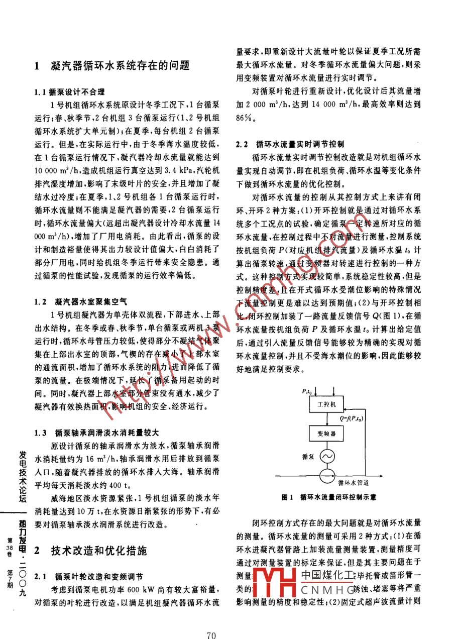 凝汽器循環(huán)水系統(tǒng)節(jié)能節(jié)水優(yōu)化改遣譚旭東,王中偉華能威海發(fā)電有限責任公司,山東威海264205[摘要]華能威海發(fā)電有限責任公司 125 MW 1號機組循環(huán)水系統(tǒng)存在循環(huán)水泵出力設計裕量偏大、效率偏低、凝汽器水室聚集空氣、循環(huán)水泵淡水潤滑消耗水量較大浪費水資源等問題,影響了機組運行經(jīng)濟性。通過對循環(huán)水系統(tǒng)進行優(yōu)化技術改造后,機組夏季可無煤增功率約500 kW,循環(huán)水泵冬季節(jié)約廠用電量約22.5萬kW●h,年節(jié)約淡水約10萬t,綜合效益約120萬元/年。[關鍵詞] 125 MW機組;凝汽器;循環(huán)水泵;變頻調(diào)速;節(jié)能節(jié)水[中圖分類號] TK264.1[文獻標識碼] B[文章編號] 1002 - 3364(2009)07 - 0069 - 03[D0I編號10. 3969/j. issn. 1002 - 3364.2009. 07. 069RETROFIT FOR OPTIMIZING THE CONSERVATION OF ENERGYAND WATER IN CIRCULATING WATER SYSTEMTAN Xu - dong, W ANG Zhong - weiHuaneng Weihai Power Plant, Weihai 264205 ,Shandong Province,PRC ;Abstract: The problems existing in circulating water system of condenser for unit no. 1 in HuanengWeihai Power Plant, such as the large allowance of output capacity for the circulating water pump,lower efficiency of the said pump, the air accumulation in water chamber of the condenser,as well asgreater consumption of fresh water used for lubricating the water pump , etc. ,affect economic efficiencyof the unit in operation. After optimized technical retrofit carried out for the circulating water system,發(fā)the unit can additionally generate electric power about 500 kW in summer, can save service power for電circulating water pump about 150 kW in winter , the daily average - water saving being 400 t.Key words:125 MW unit ; condenser ;circulating water pump; frequency converting speed regulation;en-診ergy and water - saving華能威海發(fā)電有限責任公司(華能威海發(fā)電廠)中,1 號機組循環(huán)水泵(循泵)和循環(huán)水系統(tǒng)存在較多恐125MW1號機組循環(huán)水系統(tǒng)配套2臺立式循環(huán)水.問題,影響了機組運行經(jīng)濟性,為此,對1號機組循環(huán)備查泵,凝汽器采用直流供水冷卻,冷卻介質(zhì)為海水。運行水 系統(tǒng)進行了優(yōu)化改造。中國煤化工作者簡介:譚旭東(1965 -),男,華能威海發(fā)電廠安全生產(chǎn)部汽輪機專工。YHCNMHG九;E- mail;TXD_ 58@ 163. com69量要求,即重新設計大流量葉輪以保證夏季工況所需1凝汽器循環(huán)水系統(tǒng)存在的問題最大循環(huán)水流量。對冬季循環(huán)水流量偏大問題,則采用變頻裝置對循環(huán)水流量進行實時調(diào)節(jié)。1.1循泵設計不合理對循泵葉輪進行重新設計,優(yōu)化設計后其流量增.1號機組循環(huán)水系統(tǒng)原設計冬季工況下,1臺循泵加2 000 m'/h,達到14 000 m*/h,最高效率則達到運行;春、秋季節(jié),2臺機組3臺循泵運行(1.2號機組36%。循環(huán)水系統(tǒng)擴大單元制);在夏季,每臺機組2臺循泵運行。但是,在實際運行中,由于冬季海水溫度較低,2.2循環(huán)水流實時調(diào)節(jié)控制在1臺循泵運行情況下,凝汽器冷卻水流量就能達到循環(huán)水流量實時調(diào)節(jié)控制改造就是對機組循環(huán)水10 000 m3 /h,造成機組運行真空達到3. 4 kPa,汽輪機量實現(xiàn)自動調(diào)節(jié),即在機組負荷、循環(huán)水溫等變化條件排汽濕度增加,影響了末級葉片的安全,并且增加了凝下做到循環(huán)水流量的優(yōu)化控制。結水過冷度;在夏季,1.2號機組各1臺循泵運行時,對循環(huán)水流量的控制從其控制方式上來講有閉循環(huán)水流量則不能滿足凝汽器的需要,2臺循泵運行環(huán)、開環(huán)2種方案:(1)開環(huán)控制就是通過對循環(huán)水系時,循環(huán)水流量偏大(遠超出凝汽器設計冷卻水流量14統(tǒng)多個工況點的試驗,確定循泵一定轉(zhuǎn)速所對應的循000 m*/h),增加了廠用電消耗。由此看出,循泵的設環(huán)水流量,在控制過程中不對流量進行測量,控制系統(tǒng)計和制造裕量使得其出力較設計值偏大,白白消耗了按機組負荷P(對應機組排汽流量)及循環(huán)水溫to計部分廠用電,同時給機組冬季運行帶來安全隱患。通算出循泵轉(zhuǎn)速,通過變頻器對轉(zhuǎn)速進行控制的一種方過循泵的性能試驗,發(fā)現(xiàn)循泵的運行效率偏低。式。這種控制方式實現(xiàn)較簡單,系統(tǒng)穩(wěn)定性較高,但是控制精度差,且在開式循環(huán)水受潮位影響的特殊情況1.2 凝汽器水室聚集空氣下流量控制更是難以達到預期值;(2)與開環(huán)控制相1號機組凝汽器為單殼體雙流程,下部進水、上部.比,閉環(huán)控制加裝了一路流量反饋信號Q(圖1),在循.出水結構。在冬季或春、秋季節(jié),單臺循泵或兩機3泵環(huán)水流量按機組負荷P及循環(huán)水溫t。計算出給定值運行時,循環(huán)水母管壓力較低,使得部分不凝結氣體聚后,通過引人流量反饋信號能夠較為精確的實現(xiàn)對循集在上部出水室的頂部,氣楔的存在減小了上部水室環(huán)水流量控制,并且不受海水潮位的影響,因此能夠較的通流面積,增加了循環(huán)水系統(tǒng)的阻力,進而降低了循好地滿足控制要求。泵的流量。在極端情況下,延長了循泵備用起動的時間。同時,凝汽器上部水室部分管束沒有通水,減少了Pg↓凝汽器有效換熱面積,影響機組的安全、經(jīng)濟運行。工控機Q-(P.1)1.3循泵軸承潤滑淡水消耗 量較大變頻器原設計循泵的軸承潤滑水為淡水,循泵
