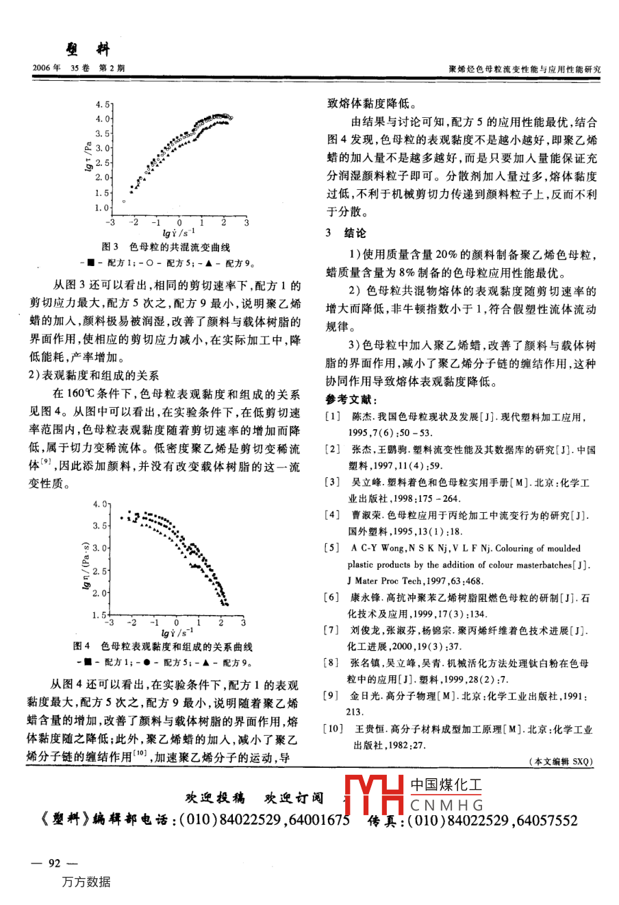 塑料2006年35卷第2期聚烯烴色母粒流變性能與應用性能研究原料與助劑陳逢剛,喬輝,吳立峰(北京化工大學材料科學與工程學院,北京10029)摘要:采用國產(chǎn)顏料制備色母粒,并測試其分散性能,找到了聚乙烯蠟含量為8%的最優(yōu)配方,針對該性能優(yōu)異的色母粒,測試其表觀黏度、非牛頓指數(shù)等流變參數(shù),并重點討論了其流變性能。實驗結果表明:色母粒共混物熔體的表觀黏度隨剪切速率的增大而降低,非牛頓指數(shù)小于1,符合假塑性流體流動規(guī)律,色母粒共混物熔體是假塑性流體。這些影響色母粒應用性能的流變數(shù)據(jù)可為色母粒配方設計和改進提供依據(jù)。關鍵詞:色母粒;轉矩流變儀;流變性能中圉分類號:TQ325.1文獻標識碼:A 文章編號 :1001 - 9456(2006)02 -0090 -03Rheological Property and Application of Polyolefin Color MasterbatchCHEN Feng-gang, QIAO Hui, WU Li-feng(Institute of Material Science and Engineering, Bejing University of Chemical Technology , Bejig 100029 ,China)Abstract :Color masterbatch was prepared using a domestic pigment. Through testing the dispersibility ,thebest formulation was found to be 8wt% of PE wax. The apparent viscosity and non-Newton index of theexcellent color masterbatch were determined, and the rheological property of the blend was focused on in thestudy. The results showed that the apparent viscosity of color masterbatch melt decreased with the increase ofshearing rate at the given temperature. The non-Newton index was less than 1 , which confirmed pseudoplasticflow characterstics. The color masterbatch melt was pseudoplastic flow. These rheological data , which influencethe application property of color masterbatch , can give reference for designing and improving color masterbatchformulation.Key words : color masterbatch ; torsion rheometer ; rheological propety色母粒作為獲得高質量塑料著色制品的著色手分散,至今仍然是一個技術難題。曹淑榮'*研究丙綸段,8益受到人們的關注,目前已成為廣泛采用的塑料色母粒認為,色母粒和著色樹脂的流變性能一致,產(chǎn)品著色方法"。流變性能是高聚物合金最重要的加工質量較好。A. C-Y. Wang等[$]用SAN為載體的色母性能,因為大部分高聚物都要利用其黏流態(tài)下的流變粒著色ABS發(fā)現(xiàn),色母粒的MFR越大,注塑制品的顏行為進行加工成型(2]。同樣,色母粒大多利用熔融態(tài)色均勻性越好。大多研究文獻普遍認為,色母粒的流加工B1 ,和高聚物熔體一樣,其流變性是聯(lián)系色母粒變性能優(yōu)于著色樹脂,制品的著色質量較好。但是,兩生產(chǎn)、加工行為與產(chǎn)品最終性能的重要紐帶。因此深者差多少最好還是未知數(shù)??陶J識色母粒的流變性對其產(chǎn)品設計,確定工藝條件,關于流變性能的研究手段很多,如熔融指數(shù)儀、毛以及應用性能研究具有重要意義。但是,色母粒與著細管流本儀。轉矩流亦儀等。舊是,由于共混物的復相.色樹脂的流變性能滿足何種關系才有利色母粒的良好結構中國煤化工互影響,其流變性能IHCNMHG●收稿日期:2005-11 -30作者簡介:陳逢剛(1979 -),男,碩士研究生,研究方向為色母粒的流變性能研究。.塑料聚烯烴色母粒流變性能與應用性能研究2006年3S卷第2期尚有自身的特點,再加上高分子形態(tài)結構的變化和破2.1 色母粒分散性測試壞,因此難以獲得材料狀態(tài)的準確信息。傳統(tǒng)生產(chǎn)研1)薄膜光密值究人員習慣用MFR和轉矩來表征色母粒的流變性用色母粒和著色樹脂吹膜,用分光光度計測試薄能[(6-9]。這里應用性能優(yōu)異的色母粒,測試其流變性膜的透過率,然后換算為光密度值進行比較。用光密能,得到了大量影晌色母粒應用性能的流變數(shù)據(jù),為色度值可以評價顏料分散的好壞,光密值越大,顏料的分母粒配方設計和改進提供依據(jù)。散性越好。圖1是不同配方的光密值曲線。1實驗0. 17]1.1 原料.0. 16-低密度聚乙烯:1F7B,北京燕山石化公司;0. 15+聚乙烯蠟:LPE4[F] ,北京化工大學精細化工廠;0.14|顏料黃191:國產(chǎn)。米o.13+.2 實驗設備及分析儀器0.12-雙輥混煉機:SK-160Bφ160 x320,上海橡膠設備廠;0.1157276101418擠出吹膜機組: Brabender PID651 ,德國Brabender分散劑含量/%公司;圖1不同配方的光密值曲線光電分光光度計:722型,上海分析儀器廠;由圖1可以看出,8%的分散劑用量時,薄膜的光掃描電鏡:S-250 ,英國劍橋公司;密度值最大,因而其顏料分散最好。色母粒中添加分轉矩流變儀:RS-150,德國哈克公司。散劑,顏料易被潤濕,有利于顏料分散;分散劑含量過1.3母粒的制備多,熔體黏度太低,剪切力不易傳遞,顏料不易破碎分先將雙輥開煉機溫度升到100C ,然后加人載體散。樹脂,混煉3~5min(目測樹脂熔融即可),隨即加入分2)電鏡照片分析散劑(聚乙烯蠟),混煉5 ~6min后加人顏料,混煉采用配方1和配方5作掃描電鏡,放大7000倍, .8min左右,然后下料、造粒、備用。各樣品的組成見表1。照片如圖2所示。圖中,配方1的顏料顆粒很大,顏料表1樣品的組成分散很差;配方5的顏料顆粒不到2μm,分散良好。配方?3,4,5.6789顏料/%20202020202020 20 20.樹脂/%807876747270686664分散劑/%0246810121416注:質量百分比。1.4薄膜的制備配方1配方5稱取150g LDPE樹脂,加人預先準備好的色母圖2不同配方的電鏡照片粒,混合均勻(薄膜中鈦白粉含量1%),然后吹膜、取通過對樣品的分散性能測試可知,使用含量20%樣。工藝參數(shù)如表2所示。的顏料制備色母粒,配方5制備的色母粒性能最優(yōu)。表2吹膜工藝參數(shù)2.2色母粒