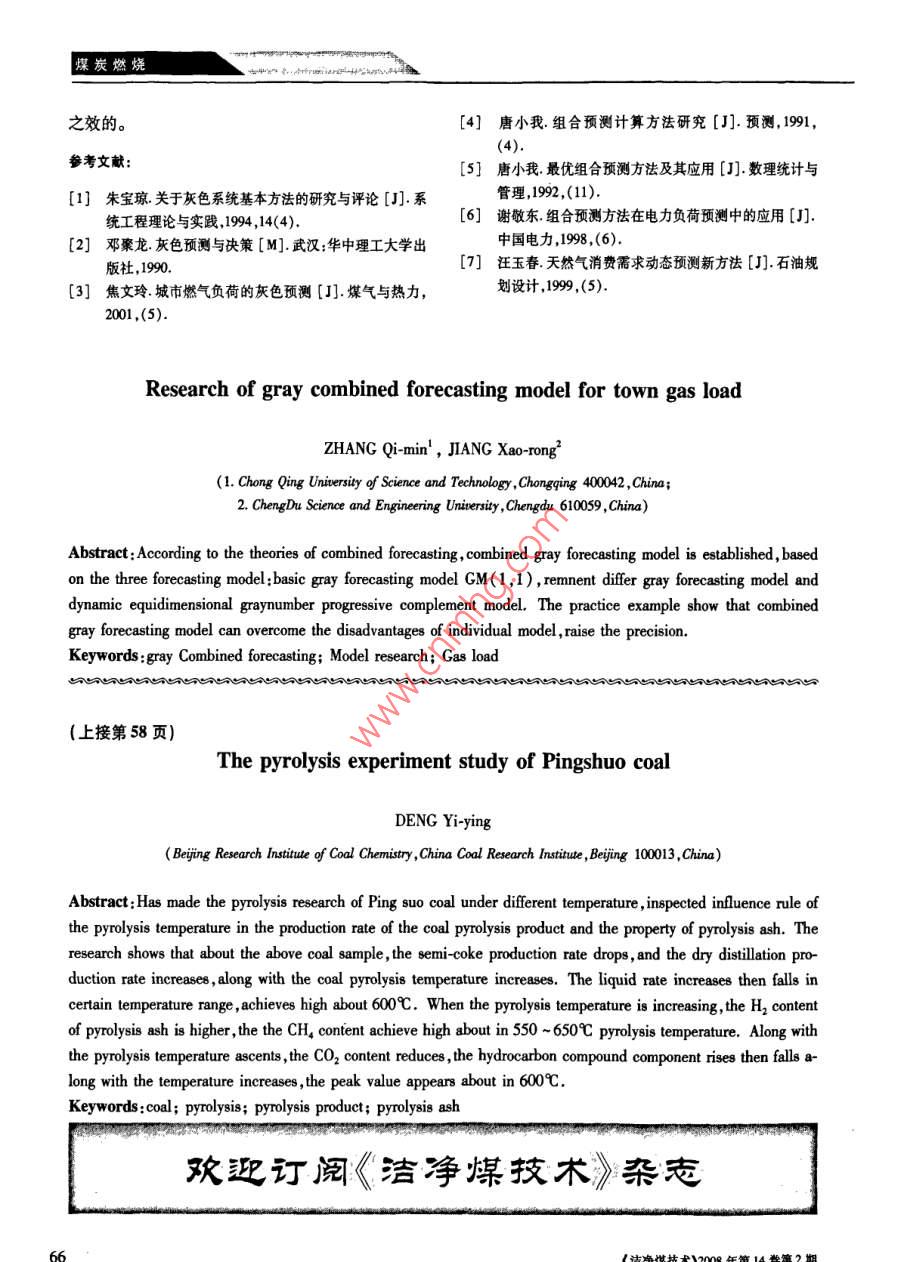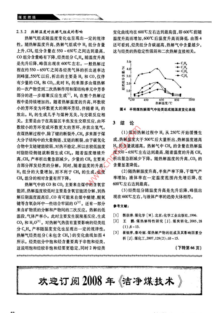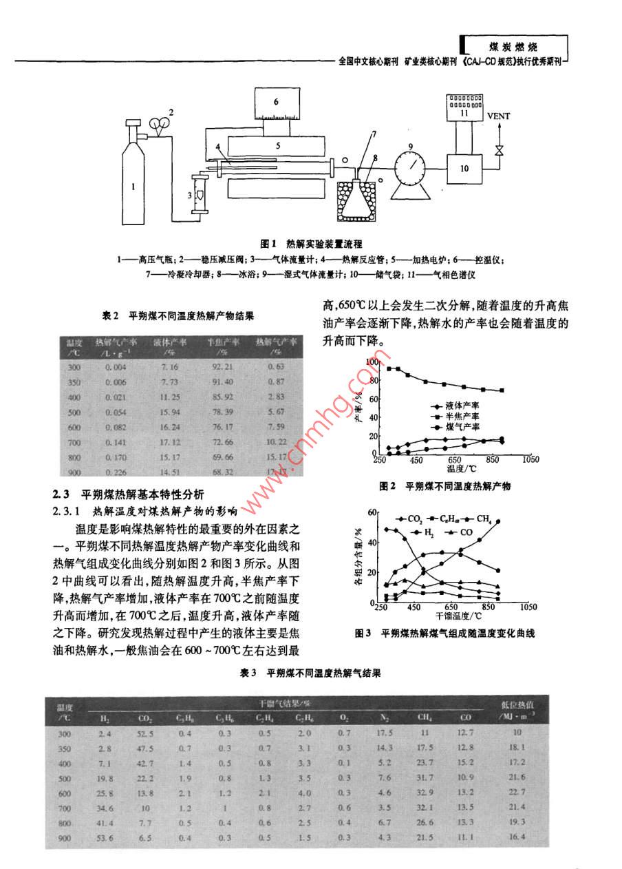 是化學(xué)鍵的斷裂。隨著溫度的升高煤中有機(jī)物逐漸分解,生成氣態(tài)的熱解氣、液態(tài)的煤焦油和固態(tài)的半焦。熱解是氣化和燃燒的前期階段,對(duì)煤的氣化和燃燒有著重要的影響,因此,研究煤的熱解反應(yīng)直是煤化學(xué)研究的熱點(diǎn)問(wèn)題之一。北京煤化工研究平朔煤的熱解試驗(yàn)研究分院工程所氣化室對(duì)平朔煤進(jìn)行了熱解試驗(yàn)研究,鄧煤炭科學(xué)研究總院北京煤化工研究分院北京取得了平朔煤的熱解基礎(chǔ)特性數(shù)據(jù)。1平朔煤的煤質(zhì)基本特性平朔煤的煤質(zhì)基礎(chǔ)特性數(shù)據(jù)見(jiàn)表1。表1平朔煤的煤質(zhì)基礎(chǔ)特性數(shù)據(jù)英元素分析%工業(yè)分析61.323.7610.710.670.475.4017.6830.064686從平朔煤煤質(zhì)的基礎(chǔ)特性數(shù)據(jù)可以看出,平朔煤具有低中灰分、中高揮發(fā)份、低固定碳、特低硫份,屬較年輕的煤種。由于煤較年輕,該煤熱解相對(duì)易進(jìn)行2熱解試驗(yàn)結(jié)果2.1試驗(yàn)流程平朔煤的熱解試驗(yàn)是在外熱式熱解臺(tái)架裝置上摘要:對(duì)平朔煤在不同溫度下進(jìn)行了熱解研究,進(jìn)行的試驗(yàn)流程如圖1所示。一定量的平朔煤裝考察了熱解溫度對(duì)煤熱解產(chǎn)物產(chǎn)率和熱解氣性質(zhì)的入特制不銹鋼熱解反應(yīng)管內(nèi),然后將其置入高溫管影響規(guī)律。研究表明對(duì)上述煤樣隨煤的熱解溫度式爐中,通過(guò)溫控器設(shè)定熱解溫度,煤熱解釋放出的升高,半焦產(chǎn)奉下降,干餾氣產(chǎn)率增加;液體率在一高溫?zé)峤鈿怏w經(jīng)不銹鋼管導(dǎo)出,依次進(jìn)入盤(pán)管式冷定溫度范圍內(nèi)先增后降,在600℃左右達(dá)到最高。卻器和氣液分離器。在冰水浴中熱解氣體得到冷熱解溫度升高,熱解氣中玨2的含量就越高,熱解氣卻。氣液兩相分離后的干餾氣經(jīng)濕式流量計(jì)計(jì)量中CH4的含量在熱解溫度550~650左右達(dá)到最后送入儲(chǔ)氣袋。將氣體樣品進(jìn)入氣相色譜儀進(jìn)行高。隨熱解溫度的升高,CO2的含量顯著降低,烴類組成分析化驗(yàn)。熱解過(guò)程結(jié)束以后,開(kāi)啟熱解爐,取組分隨溫度升高是先升后降,峰值出現(xiàn)在600℃左出半焦,計(jì)量并取樣進(jìn)行分析化驗(yàn)。氣液分離器中右。殘留的液體物質(zhì)(包括冷卻水,油品及石蠟等)經(jīng)計(jì)關(guān)鍵詞:煤;熱解;熱解產(chǎn)物;熱解氣量并取樣進(jìn)行分析化驗(yàn)。2.2試驗(yàn)結(jié)果中圖分類號(hào):TQ530.2文獻(xiàn)標(biāo)識(shí)碼:A熱解試驗(yàn)溫度在300350、400、500、600、700文章編號(hào):10066772(2008)020056-03800、900℃的條件下進(jìn)行,各個(gè)溫度下的熱解產(chǎn)物結(jié)果見(jiàn)表2。不同熱解終溫時(shí)的熱解煤氣組成見(jiàn)表3煤的熱解是將煤置于隔絕空氣的密閉反應(yīng)器熱解煤氣組成隨溫度變化曲線圖為簡(jiǎn)化起見(jiàn)將內(nèi)在無(wú)催化作用的條件下持續(xù)加熱升溫,而發(fā)生一O2、N2這些與熱解無(wú)關(guān)的氣體省略將C3H3、C3H6系列化學(xué)和物理變化的過(guò)程。這一過(guò)程的基本行為C2H4、C2H合并為CH。收稿日期:2007-11-28作者簡(jiǎn)介:鄧一英(955-),女北京人,工程師現(xiàn)工作于煤s科學(xué)研究總院。煤炭燃燒全國(guó)中文核心期刊礦業(yè)類核心期刊 (CAHCD規(guī)范)執(zhí)行優(yōu)秀期刊ⅤENT圖1熱解實(shí)驗(yàn)裝置流程一高壓氣瓶;2—穩(wěn)壓減壓閥;3—?dú)怏w流量計(jì);4—熱解反應(yīng)管;5—加熱電爐;6控溫儀;7—冷凝冷卻器;8—冰浴;9—濕式氣體流量計(jì);10—儲(chǔ)氣袋;1l—?dú)庀嗌V儀高,650℃以上會(huì)發(fā)生二次分解隨著溫度的升高焦表2平朔煤不同溫度熱解產(chǎn)物結(jié)果油產(chǎn)率會(huì)逐漸下降,熱解水的產(chǎn)率也會(huì)隨著溫度的升高而下降。3000.00492.210.o060.870.111.2585922.8350078.395.67液體產(chǎn)率半焦產(chǎn)率0.08216.2476.17759煤氣產(chǎn)率17.1272.6615.174502.3平朔煤熱解基本特性分析圖2平朔煤不同溫度熱解產(chǎn)物2.3.1熱解溫度對(duì)煤熱解產(chǎn)物的影響→CO,·CH?!鶴溫度是影響煤熱解特性的最重要的外在因素之A-+H+CO。平朔煤不同熱解溫度熱解產(chǎn)物產(chǎn)率變化曲線和熱解氣組成變化曲線分別如圖2和圖3所示。從圖斷細(xì)爾2中曲線可以看出,隨熱解溫度升高,半焦產(chǎn)率下降熱解氣產(chǎn)率增加液體產(chǎn)率在700℃之前隨溫度020-406508501050升高而增加,在700℃之后,溫度升高,液體產(chǎn)率隨之下降。研究發(fā)現(xiàn)熱解過(guò)程中產(chǎn)生的液體主要是焦圖3平朔煤熱解煤氣組成隨溫度變化曲線油和熱解水,一般焦油會(huì)在600~700℃左右達(dá)到最表3平朔煤不同溫度熱解氣結(jié)果低位熱值1270.717.51810.833015.223.715217.219.82221.90.830.3731.721.625.81.224.63290.613.521.48026900530.30.50.34.321.5.16.4燃燒2.3.2熱解溫度對(duì)熱解氣組成的影響變化曲線均在600℃左右達(dá)到最高值,即600℃前隨熱解氣組成隨溫度變化也呈現(xiàn)出一定的規(guī)律溫度升高而增加,600℃后溫度升高而降低由圖4性。隨熱解溫度升高熱解氣組成中H2組分含量還可看到,烴類組分含碳越高熱解氣中含量越少,上升,CH4組分含量在550~60℃之間達(dá)到最高,這與烴類的熱穩(wěn)定性強(qiáng)弱和二次熱解直接相關(guān)CO組分含量略有下降烴類組分CnHn隨溫度升高是