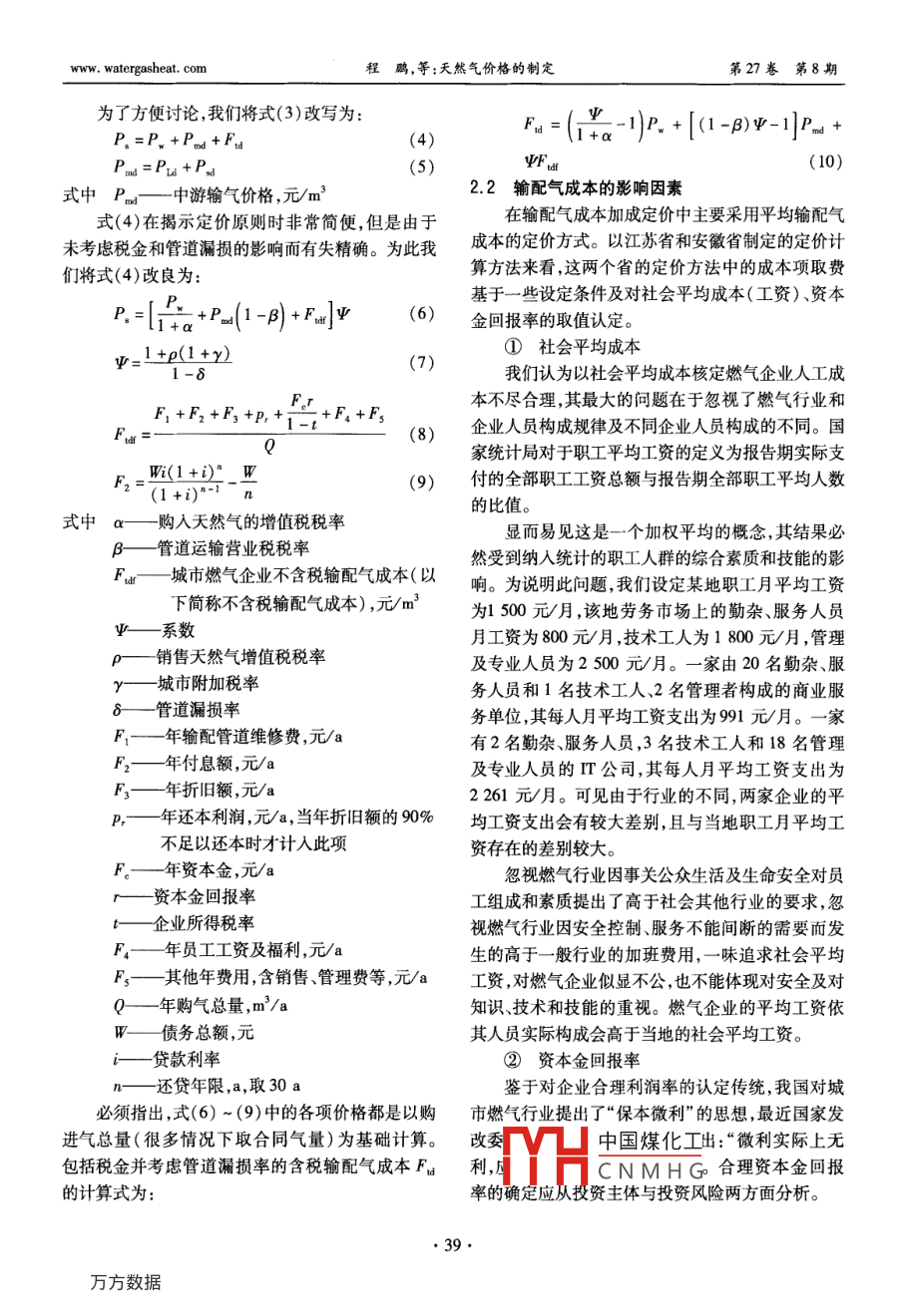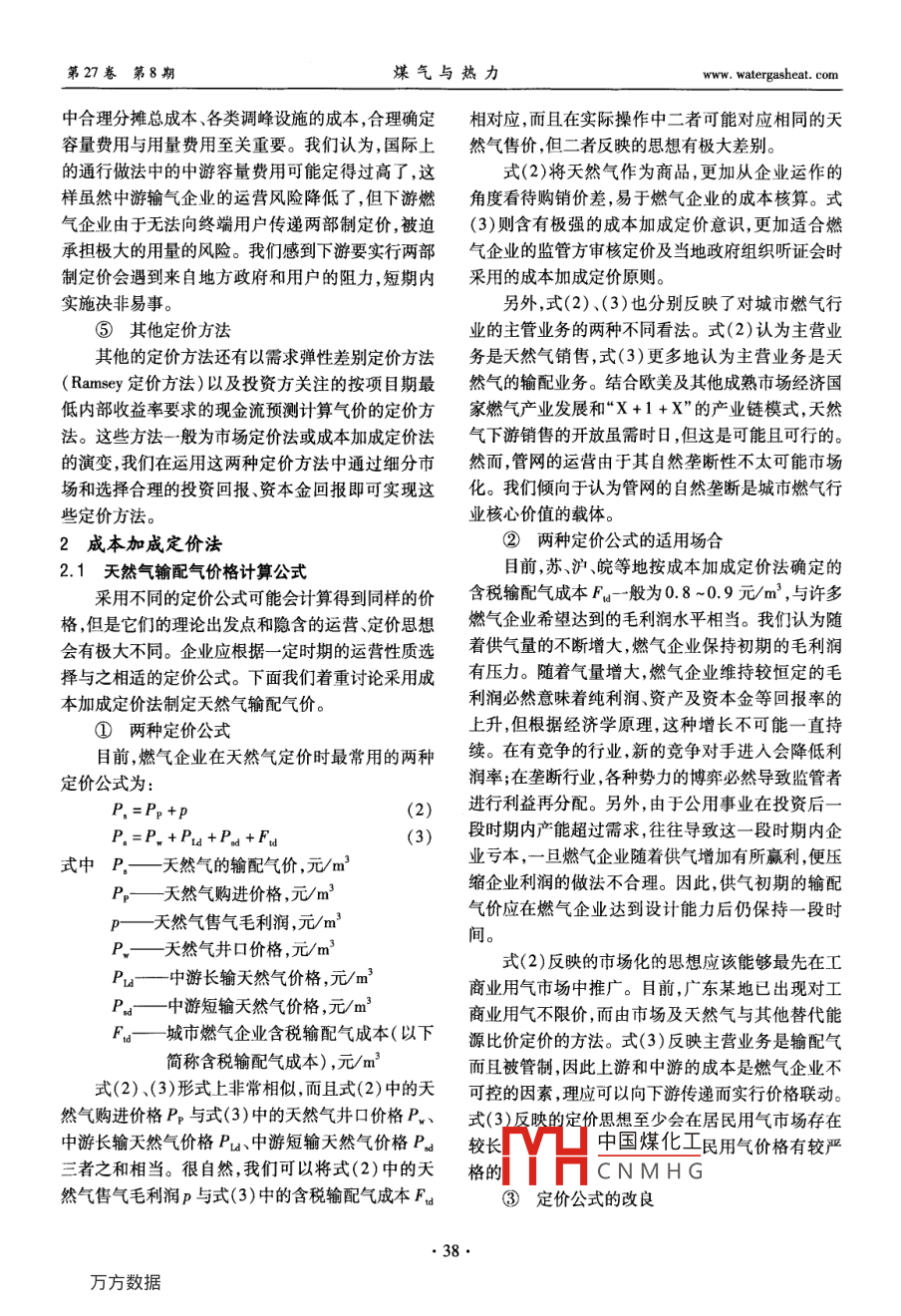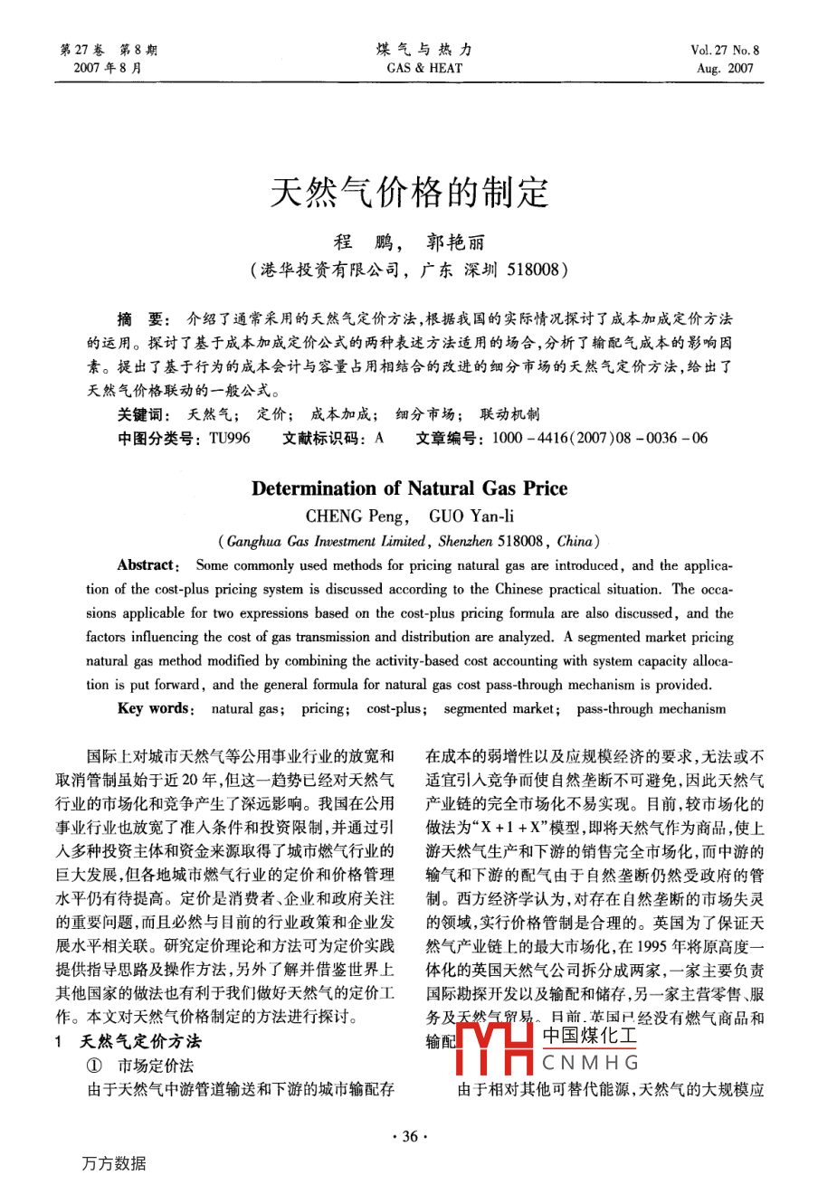 第27卷第8期煤氣與熱力Vol 27 No 82007年8月gas heat天然氣價格的制定程鵬,郭艷麗(港華投資有限公司,廣東深圳518008)摘要:介紹了通常采用的天然氣定價方法,根據(jù)我國的實(shí)際情況探討了成本加成定價方法的運(yùn)用。探討了基于成本加成定價公式的兩種表述方法適用的場合,分析了輸配氣成本的影響因素。提出了基于行為的成本會計與容量占用相結(jié)合的改進(jìn)的細(xì)分市場的天然氣定價方法,給出了天然氣價格聯(lián)動的一般公式關(guān)鍵詞:天然氣;定價;成本加成;細(xì)分市場;聯(lián)動機(jī)制中圖分類號:TU996文獻(xiàn)標(biāo)識碼:A文章編號:1000-416(2007)08-0036-06Determination of Natural gas priceCHENG Peng, GUO Yan-liGanghua Gas Investment Limited, Shenzhen 518008, China)Abstract: Some commonly used methods for pricing natural gas are introduced, and the application of the cost-plus pricing system is discussed according to the Chinese practical situation. The occa-sions applicable for two expressions based on the cost-plus pricing formula are also discussed, and thefactors influencing the cost of gas transmission and distribution are analyzed. A segmented market pricingnatural gas method modified by combining the activity-based cost accounting with system capacity allocation is put forward, and the general formula for natural gas cost pass-through mechanism is providedKey words: naturalcing; cost-plus; segmented market; pass-through mechanism國際上對城市天然氣等公用事業(yè)行業(yè)的放寬和在成本的弱增性以及應(yīng)規(guī)模經(jīng)濟(jì)的要求,無法或不取消管制雖始于近20年,但這一趨勢已經(jīng)對天然氣適宜引入競爭而使自然壟斷不可避免,因此天然氣行業(yè)的市場化和競爭產(chǎn)生了深遠(yuǎn)影響。我國在公用產(chǎn)業(yè)鏈的完全市場化不易實(shí)現(xiàn)。目前,較市場化的事業(yè)行業(yè)也放寬了準(zhǔn)入條件和投資限制,并通過引做法為“X+1+X”模型,即將天然氣作為商品,使上入多種投資主體和資金來源取得了城市燃?xì)庑袠I(yè)的游天然氣生產(chǎn)和下游的銷售完全市場化,而中游的巨大發(fā)展,但各地城市燃?xì)庑袠I(yè)的定價和價格管理輸氣和下游的配氣由于自然壟斷仍然受政府的管水平仍有待提高。定價是消費(fèi)者、企業(yè)和政府關(guān)注制。西方經(jīng)濟(jì)學(xué)認(rèn)為,對存在自然壟斷的市場失靈的重要問題,而且必然與目前的行業(yè)政策和企業(yè)發(fā)的領(lǐng)域,實(shí)行價格管制是合理的。英國為了保證天展水平相關(guān)聯(lián)。研究定價理論和方法可為定價實(shí)踐然氣產(chǎn)業(yè)鏈上的最大市場化,在1995年將原高度提供指導(dǎo)思路及操作方法,另外了解并借鑒世界上體化的英國天然氣公司拆分成兩家,一家主要負(fù)責(zé)其他國家的做法也有利于我們做好天然氣的定價工國際勘探開發(fā)以及輸配和儲存,另一家主營零售、服作。本文對天然氣價格制定的方法進(jìn)行探討務(wù)及日前英國尸經(jīng)沒有燃?xì)馍唐泛?天然氣定價方法輸配中國煤化工①市場定價法CNMHG由于天然氣中游管道輸送和下游的城市輸配存由于相對其他可替代能源,天然氣的大規(guī)模應(yīng)www.watergasheat.com程鵬,等:天然氣價格的制定第27卷第8期用較晩,市場開拓從置換其他能源市場開始,因此天貼、平均成本定價、兩部制定價等方法??紤]在國際然氣作為商品根據(jù)替代能源定價就不足為奇了。歐上燃?xì)庑袠I(yè)的使用普遍程度,這里主要討論平均成洲國家的政府在管制天然氣配氣價格時也一定程度本定價和兩部制定價兩種方法上考慮加入配氣價格后天然氣總價格與可替代能源目前,我國城市燃?xì)庑袠I(yè)采用最多的是平均成的市場價格相當(dāng)。其實(shí),國家發(fā)改委也在力推這一本定價方法。在定價時將企業(yè)供氣服務(wù)作為整體考思想,在2005年底對天然氣出廠價調(diào)整時指出:我慮,得到對所有用戶服務(wù)的加權(quán)平均成本。由企業(yè)國天然氣價過低,為原油的30%左右;成熟的市場和政府在保持平均成本不變的前提下,確定各細(xì)分經(jīng)濟(jì)國家天然氣與原油比價通常為0.84~1.21。市場的價格。必須指出的是如何確定各成本組成項(xiàng)由于整個天然氣產(chǎn)業(yè)鏈并非由同一級政府管制,這目的費(fèi)率,尤其是各類資金的回報率與利率,這對合思想并未被各地定價部門領(lǐng)會。理定價十分必要。認(rèn)識到自然壟斷行業(yè)企業(yè)所在經(jīng)③最高限價法營地域的運(yùn)作情況缺乏可比性,而一個企業(yè)自身的認(rèn)識到自然壟斷的存在并考慮到對公眾利益的歷史數(shù)據(jù)對未來最有預(yù)示性,美國聯(lián)邦能源監(jiān)管委保護(hù),1994年后,英國對輸氣和儲氣業(yè)務(wù)采取了最員會(FERC)規(guī)定服務(wù)總成本按以往12個月的歷高限價的方式實(shí)行政府的價格干預(yù),定價原則為史成本對隨后9個月的可預(yù)見變化做調(diào)整。對于壟P,=(1+/-x)P1,mx+K(1)斷行業(yè)只可微利的觀點(diǎn),美國聯(lián)邦最高法院早在式中P—第t年天然氣的最高能源價格,英鎊/1944年的聯(lián)邦動力委員會對希望天然氣公司一案中即判定:“(被監(jiān)管企業(yè)的)股東回報應(yīng)與有相似兩年間天然氣零售價格指數(shù)的變化率險的其他行業(yè)內(nèi)企業(yè)的投資回報相當(dāng)”,從而明x—管制者制定的一定時期