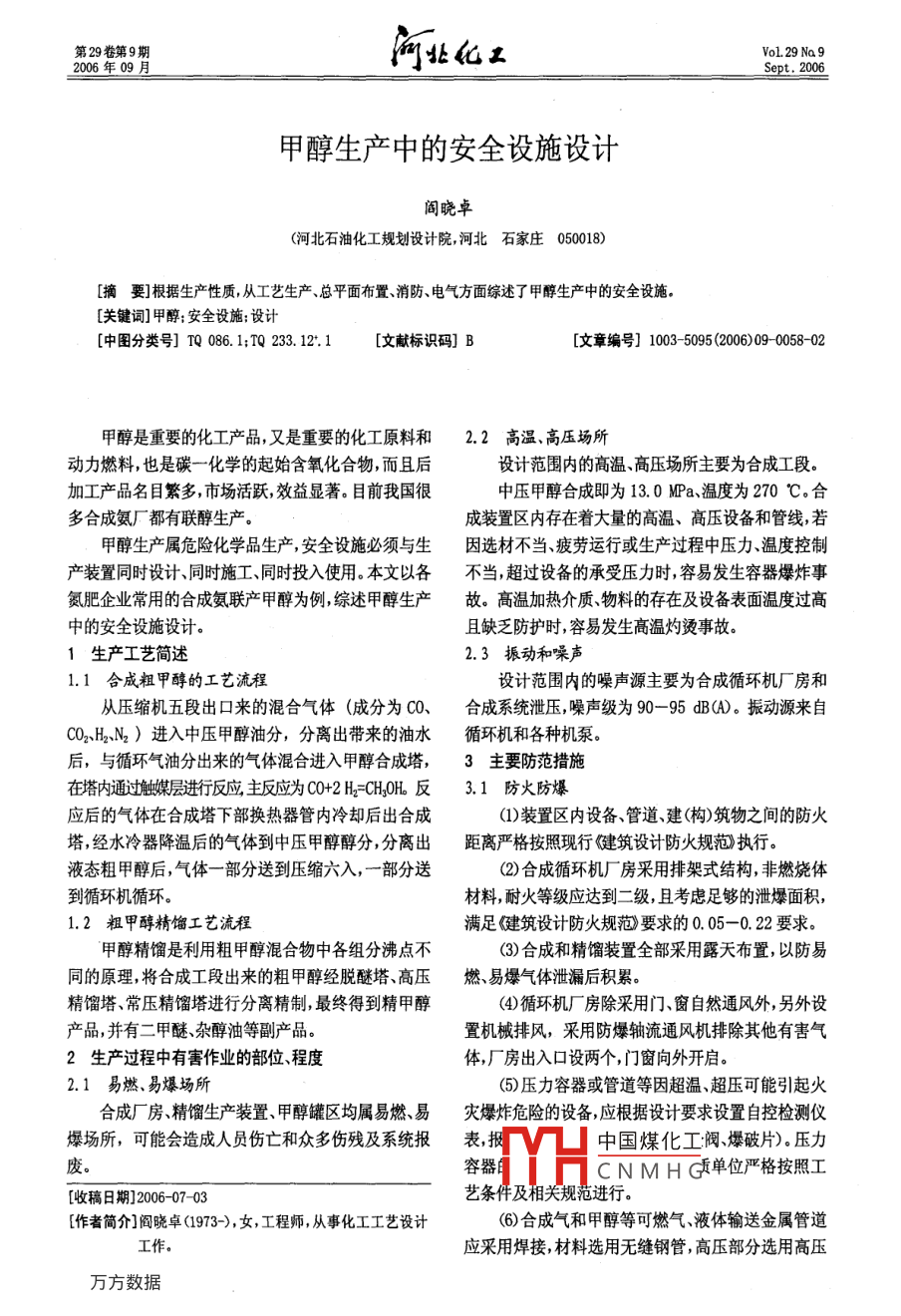 第29卷第9期Vol 29 Na 9006年09月甲醇生產中的安全設施設計間曉卓(河北石油化工規(guī)劃設計院,河北石家莊050018)摘要]根據生產性質,從工藝生產、總平面布置、消防、電氣方面綜述了甲醇生產中的安全設施。[關鍵詞]甲醇;安全設施;設計[中圖分類號]TQ086.1;TQ23312.1[文獻標識碼]B[文章編號]1003-5095(2006)090058-02甲醇是重要的化工產品,又是重要的化工原料和2.2高溫、高壓場所動力燃料,也是碳一化學的起始含氧化合物,而且后設計范圍內的高溫、高壓場所主要為合成工段加工產品名目繁多,市場活躍,效益顯著。目前我國很中壓甲醇合成即為130Ma、溫度為270℃合多合成氨廠都有聯(lián)醇生產。成裝置區(qū)內存在著大量的高溫、高壓設備和管線,若甲醇生產屬危險化學品生產,安全設施必須與生因選材不當、疲勞運行或生產過程中壓力溫度控制產裝置同時設計、同時施工、同時投入使用。本文以各不當超過設備的承受壓力時,容易發(fā)生容器爆炸事氮肥企業(yè)常用的合成氨聯(lián)產甲醇為例綜述甲醇生產故。高溫加熱介質物料的存在及設備表面溫度過高中的安全設施設計。且缺乏防護時,容易發(fā)生高溫灼燙事故1生產工藝簡述2.3振動和噪聲1.1合成粗甲醇的工藝流程設計范圍內的噪聲源主要為合成循環(huán)機廠房和從壓縮機五段出口來的混合氣體(成分為C0、合成系統(tǒng)泄壓,噪聲級為90-95dB(A。振動源來自C0Q2H2N2)進入中壓甲醇油分,分離出帶來的油水循環(huán)機和各種機泵。后,與循環(huán)氣油分出來的氣體混合進入甲醇合成塔,3主要防范措施在塔內通過觸媒層進行反應主反應為C0+2H2=CH3OH反3.1防火防爆應后的氣體在合成塔下部換熱器管內冷卻后出合成(1)裝置區(qū)內設備、管道建(構)筑物之間的防火塔,經水冷器降溫后的氣體到中壓甲醇醇分,分離出距離嚴格按照現(xiàn)行健筑設討防火規(guī)范執(zhí)行。液態(tài)粗甲醇后,氣體一部分送到壓縮六入,一部分送(2)合成循環(huán)機廠房采用排架式結構,非燃燒體到循環(huán)機循環(huán)。材料,耐火等級應達到二級且考慮足夠的泄爆面積,1.2粗甲醇精餾工藝流程滿足健建筑設計防火規(guī)范要求的005-022要求。甲醇精餾是利用粗甲醇混合物中各組分沸點不(3)合成和精餾裝置全部采用露天布置,以防易同的原理,將合成工段出來的粗甲醇經脫醚塔、高壓燃、易爆氣體泄漏后積累。精餾塔、常壓精餾塔進行分離精制,最終得到精甲醇(4)循環(huán)機廠房除采用門、窗自然通風外,另外設產品,并有二甲醚、雜醇油等副產品。置機槭排風,采用防爆軸流通風機排除其他有害氣2生產過程中有害作業(yè)的部位、程度體,廠房出入口設兩個,門窗向外開啟。2.1易燃、易爆場所(5)壓力容器或管道等因超溫、超壓可能引起火合成廠房、精餾生產裝置、甲醇罐區(qū)均屬易燃、易災爆炸危險的設備,應根據設計要求設置自控檢測儀爆場所,可能會造成人員傷亡和眾多傷殘及系統(tǒng)報表報V凵中國煤化工閥煙破片)壓力廢李4NMHG我單位嚴格數照工[收稿日期]2006-07-03氾作者簡介]閻曉卓(1973-),女,工程師,從事化工工藝設計(6)合成氣和甲醇等可燃氣、液體輸送金屬管道工作應采用焊接,材料選用無縫鋼管,高壓部分選用高壓第9期閻曉卓:甲醇生產中的安全設施設計無縫鋼管。高壓管件(法蘭、彎頭、三通、螺栓墊片等)(2操作人員應根據各崗位不同的危險特性,分均選用化肥專用H系列,甲醇精餾及甲醇罐區(qū)工藝管別穿戴相應合適的防護用具,作業(yè)時對其毒害、腐蝕件按GB50292選用。法蘭應用金屬導線跨接以消除性等更應加強注意。防護用具包括工作服、橡皮圍裙靜電橡皮袖罩、橡皮手套、長筒膠靴、防毒面具、濾毒口罩、⑦)設備區(qū)內的放空管,高于附近有人操作的最紗口罩、紗手套和護目鏡等。操作前應由專人檢查用高設備的2m以上,緊靠建筑物或在其內部布置的放具是否妥善穿戴是否合適。操作后應進行清洗或消空管高出建(構)筑物2m以上。工藝管道放空均加阻毒,放在專用的箱柜中保管?;鹌鳌Qh(huán)機進出口管設置安全閥(3)原料運輸時,采用安全可靠的運輸車輛,并懸(8)精餾裝置的冷凝器設計足夠的冷卻面積和可掛“危險品標志,符合險貨物運輸規(guī)定》的規(guī)定??康墓┧O施,以保證物料蒸汽充分冷凝回流并冷卻(4)高溫場所充分利用自然通風輔以機械通風到安全的出料溫度發(fā)熱設備和管道嚴格按照設備及管道保溫技術通則9)甲醇罐區(qū)設防火堤、管墩等,均采用非燃燒材計算確定保溫層厚度。料。設置蒸汽保安系統(tǒng)、固定式水噴淋冷卻裝置和呼3.3防噪聲和震動吸閥一阻火器系統(tǒng)。儲罐設置靜電接地系統(tǒng)、固定式噪聲大的崗位,要求配備防護耳罩、耳塞等個體水噴淋冷卻裝置和呼吸閥一阻火器系統(tǒng)。防護用品。振動源來自壓縮機和各種機泵,采取單獨10)合成廠房、甲醇罐區(qū)及精餾裝置區(qū)均設置可基礎隔振措施。產生噪聲較大的設備采用設置消聲燃氣體檢測報警裝置器。操作室設計為隔音操作室(11)按國家相關規(guī)范要求設計消防設施,包括設3.4防機械和墜落傷害置室內外消火栓和移動式滅火設備(1)裝置區(qū)內有發(fā)生墜落危險的操作崗位,如合12罐區(qū)設置固定泡沫滅火站和水噴淋冷卻成塔精餾塔等按規(guī)定設計符合相應規(guī)范要求的便于操作、巡檢和維