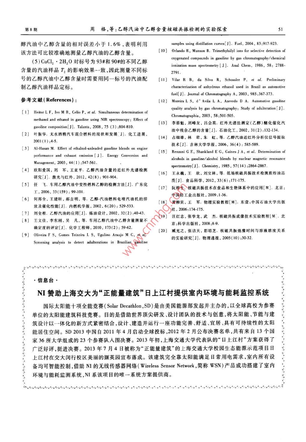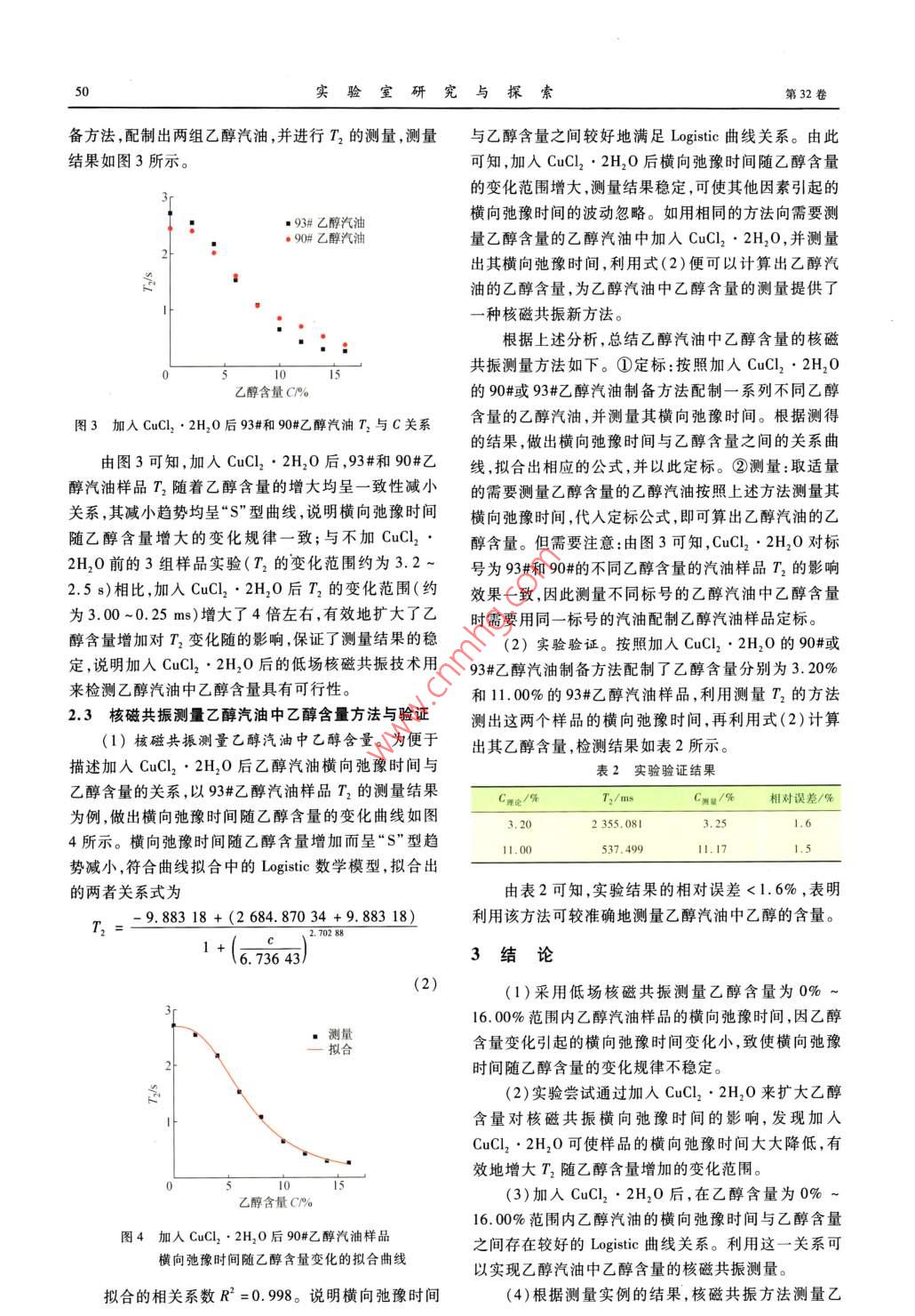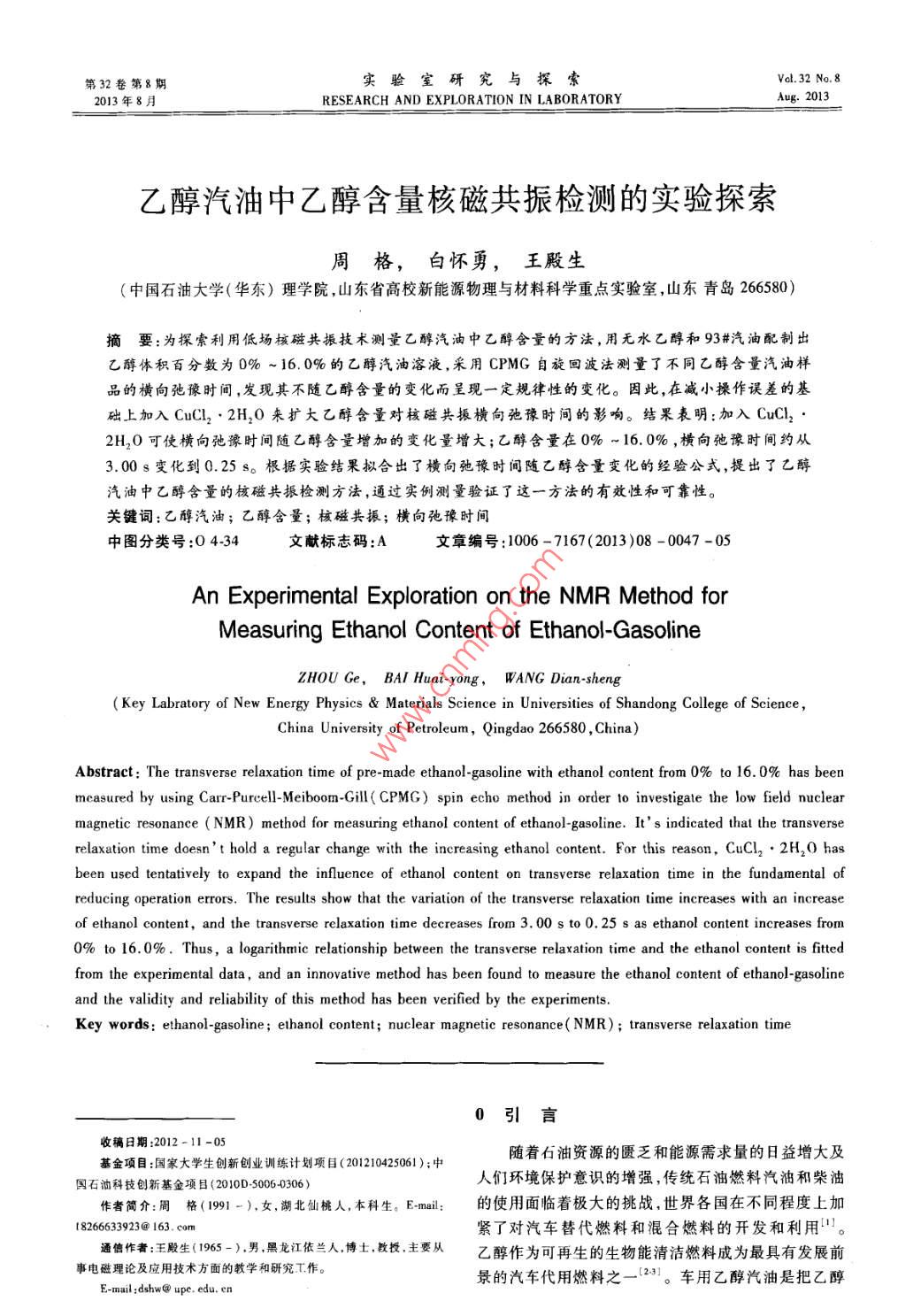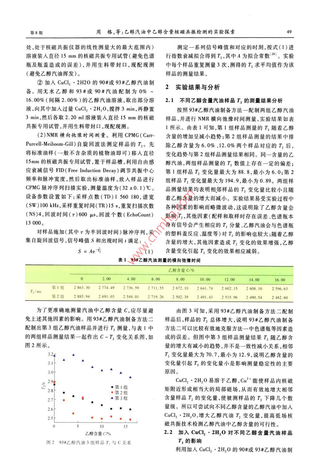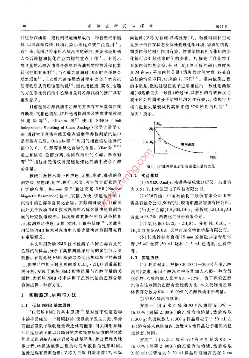 第32卷第8期實驗室研究與探索VaL 32 No 82013年8月RESEARCH AND EXPLORATION IN LABORATORYAug.2013乙醇汽油中乙醇含量核磁共振檢測的實驗探索周格,白懷勇,王殿生(中國石油大學(華東)理學院,山東省高校新能源物理與材料科學重點實驗室,山東青島266580)摘要:為探索利用低場核磁共振技術測量乙醇汽油中乙醇含量的方法,用無水乙醇和93#汽油配制出乙醇體積百分數(shù)為0%~16.0%的乙醇汽油溶液,采用CPMG自旋回波法測量了不同乙醇含量汽油樣品的橫向弛豫時間,發(fā)現(xiàn)其不隨乙醇含量的變化而呈現(xiàn)一定規(guī)律性的變化。因此,在減小操作誤差的基礎上加入CuC2·2H2O來擴大乙醇含量對核磁共振橫向弛豫時間的影響。結果表明:加λCuCl22H2O可使橫向弛豫時間隨乙醇含量增加的變化量增大;乙醇含量在0%-16.0%,橫向弛豫時間約從3.00s變化到0.25s。根據(jù)實驗結果擬合出了橫向弛豫時間隨乙醇含量變化的經(jīng)驗公式,提出了乙醇汽油中乙醇含量的核磁共振撿測方法,通過實例測量驗證了這一方法的有效性和可靠性。關鍵詞:乙醇汽油;乙醇含量;核磁共振;橫向弛豫時間中圖分類號:0434文獻標志碼:A文章編號:1006-7167(2013)08-0047-05An Experimental Exploration on the NMR Method forMeasuring Ethanol Content of Ethanol-GasolineZHOU Ge, BA/ Huai-yong, WANG Dian-shengKey Labratory of New Energy Physics Materials Science in Universities of Shandong College of ScienceChina University of Petroleum, Qingdao 266580, China)Abstract: The transverse relaxation time of pre-made ethanol-gasoline with ethanol content from 0% to 16.0% has beenmeasured by using Carr-Purcell-Meiboom-Gill( CPMG)spin echo method in order to investigate the low field nuclearmagnetic resonance( NMR)method for measuring ethanol content of ethanol-gasoline. It's indicated that the transverselaxation time doesnt hold a regular change with the increasing ethanol content. For this reason, CuCl,. 2H, O hasbeen used tentatively to expand the influence of ethanol content on transverse relaxation time in the fundamental ofreducing operation errors. The results show that the variation of the transverse relaxation time increases with an increaseof ethanol content and the transverse relaxation time decreases from 3. 00s to 0. 25 s as ethanol content increases fromO% to 16. 0%. Thus, a logarithmic relationship between the transverse relaxation time and the ethanol contfrom the experimental data, and an innovative method has been found to measure the ethanol content of ethanol-gasoliand the validity and reliability of this method has been verified by the experimentsKey words: ethanol-gasoline; ethanol content; nuclear magnetic resonance(NMR); transverse relaxation time0引言收稿日期:2012-11-05基金項目:國家大學生創(chuàng)新創(chuàng)業(yè)訓練計劃項目(201210425061);中隨著石油資源的匱乏和能源需求量的日益增大及國石油科技創(chuàng)新基金項目(2010D50060306)人們環(huán)境保護意識的增強,傳統(tǒng)石油燃料汽油和柴油作者簡介:周格(1991-),女,湖北仙桃人,本科生。Emil:的使用面臨著極大的挑戰(zhàn),世界各國在不同程度上加t8266633923@163.cm緊了對汽車替代燃料和混合燃料的開發(fā)和利用山通作者:王殿生(1965-),男熙龍江依蘭人,博土,教投,主要從乙醇作為可再生的生物能清潔燃料成為最具有發(fā)展前事電磁理論及應用技木方面的教學和研究工作E-mail: dshw@ upe. edu. en景的汽車代用燃料之車用乙醇汽油是把乙醇實驗室研究與探索第32卷和組分汽油按一定比例混配而形成的一種新型汽車燃向弛豫(又稱為自旋-晶格弛豫)T。弛豫時間長短與料,以其高辛烷值、環(huán)境污染小等優(yōu)點被廣泛應用*。氫質子的存在狀態(tài)及所處物理化學環(huán)境物質的結構近年來,我國已將車用乙醇汽油的研究、開發(fā)和應用列物質內(nèi)部的相互作用有關。物質結構和相互作用的變?nèi)虢窈笳{(diào)整和優(yōu)化產(chǎn)業(yè)結構的重點工作。不同乙化都可以引起弛豫時間的變化。T2描述了自旋粒子醇含量的乙醇汽油混合燃料對汽油機的排放及催化器系統(tǒng)內(nèi)部能量交換,是M、M,(原子核的磁化強度矢轉化性能有影響,當乙醇含量超過10%時油耗也會量M在oxy平面內(nèi)的分量)消失的時間常數(shù),各處自隨之增加7,且乙醇汽油在燃燒過程中也會產(chǎn)生有機旋核的情況不同,對應的T2不同。橫向弛豫過程酸等物質從而腐蝕發(fā)動機。,因此用便捷、高效準確的本質是,激勵過程使質子進動相位的一致性逐漸散的方法來檢測汽油中乙醇含量對乙醇汽油的推廣具有相(即逐漸失去一致性)的過程,其散相的有效程度與重要意義。質子所處的周圍分子結構的均勻性有關,12值規(guī)定為目前檢測乙醇汽油中乙醇的方法有常壓蒸餾曲線橫向磁化矢量衰減到其原來值37%所用的時間,判斷法、氣相色譜法、紅外光譜檢測法及核磁共振波譜如圖1所示測定法等。 Oliveira等使用 SIMCA(SoftIndependent Modeling of Class Analogy)化學計量學方法,通過常壓蒸餾曲線回收點溫度等參數(shù)判斷汽油中是否摻有乙醇。 Orlando等利用氣相色譜法檢測汽037M-油中的C1~C4醇等含氧化合物的含量。Viar等12橫向弛豫通過預濃縮、色譜分離,檢測汽油中的乙醇。李添魁時間等134用紅外光譜儀測定醚化催化汽油中殘余乙醇的含量。圖190°脈沖停止后宏觀磁化矢量的變化核磁共振技術是一種快速、無損、高效、準確的檢1.2實驗器材測方法,在物理、化學、醫(yī)療、水文、考古等方面獲得了(1)NM20- Analyst核磁共振成像分析