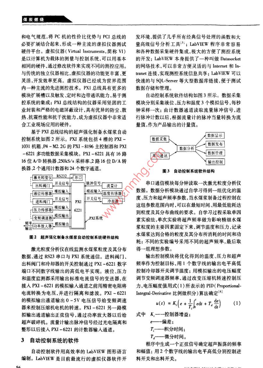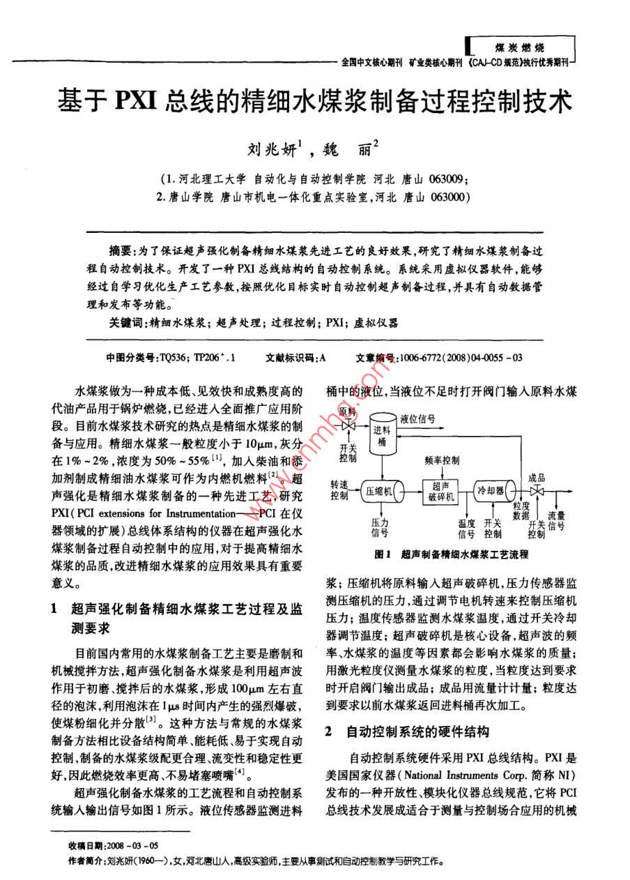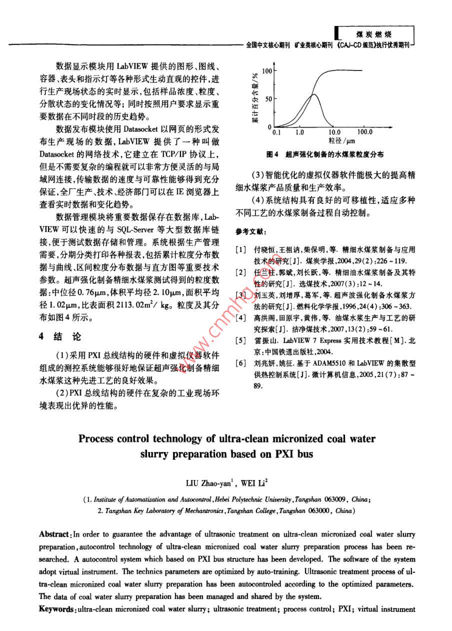 煤炭燃燒全國中文核心期刊礦業(yè)類核心期刊《cAcD規(guī)范》執(zhí)行優(yōu)秀期刊基于PⅪI總線的精細水煤漿制備過程控制技術劉兆妍',魏麗(1.河北理工大學自動化與自動控制學院河北唐山063009;2.唐山學院唐山市機電一體化重點實驗室,河北唐山063000摘要:為了保證超聲強化制備精細水煤漿先進工藝的良好效果,研究了精細水煤漿制備過程自動控制技術。開發(fā)了一種PⅪI總線結構的自動控制系統(tǒng)。系統(tǒng)采用虛擬儀器軟件,能夠經(jīng)過自學習優(yōu)化生產(chǎn)工藝參數(shù),按照優(yōu)化目標實時自動控制超聲制備過程,并具有自動數(shù)據(jù)管理和發(fā)布等功能。關鍵詞:精細水煤漿;超聲處理;過程控制;PⅪI;虛擬儀器中圖分類號:TQ536;TP206·.1文獻標識碼:A文章編號:100646772(2008)040055-03水煤漿做為一種成本低、見效快和成熟度高的桶中的液位,當液位不足時打開閥門輸入原料水煤代油產(chǎn)品用于鍋爐燃燒已經(jīng)進入全面推廣應用階原料段。目前水煤漿技術研究的熱點是精細水煤漿的制→液位信號備與應用。精細水煤漿一般粒度小于10μm,灰分在1%-2%,濃度為50%-55%1,加入柴油和添頻率控制聲化麥精細濃裝的六內(nèi)先楚藝亮-0.m@mPXI( PCI extensions for Instrumentation—-PCI在儀器領域的擴展)總線體系結構的儀器在超聲強化水溫度開關數(shù)據(jù)信號控制控制煤漿制備過程自動控制中的應用,對于提高精細水圖1超聲制備精細水煤漿工藝流程煤漿的品質(zhì),改進精細水煤漿的應用效果具有重要意義。漿;壓縮機將原料輸入超聲破碎機,壓力傳感器監(jiān)1超聲強化制備精細水煤漿工藝過程及監(jiān)測壓縮機的壓力,通過調(diào)節(jié)電機轉速來控制壓縮機壓力;溫度傳感器監(jiān)測水煤漿溫度,通過開關冷卻測要求器調(diào)節(jié)溫度;超聲破碎機是核心設備,超聲波的頻目前國內(nèi)常用的水煤漿制備工藝主要是磨制和率、水煤漿的溫度等因素都會影響水煤漿的質(zhì)量機械攪拌方法,超聲強化制備水煤漿是利用超聲波用激光粒度儀測量水煤漿的粒度,當粒度達到要求作用于初磨攪拌后的水煤漿形成100μm左右直時開啟閥門輸出成品;成品用流量計計量;粒度達徑的泡沫,利用泡沫在Iμs時間內(nèi)產(chǎn)生的強烈爆破,到要求以前水煤漿返回進料桶再次加工。使煤粉細化并分散。這種方法與常規(guī)的水煤漿2自動控制系統(tǒng)的硬件結構制備方法相比設備結構簡單能耗低、易于實現(xiàn)自動控制制備的水煤漿級配更合理流變性和穩(wěn)定性更自動控制系統(tǒng)硬件采用PXI總線結構。PXI是好,因此燃燒效率更高、不易堵塞噴嘴。美國國家儀器( National Instruments Corp.簡稱N)超聲強化制備水煤漿的工藝流程和自動控制系發(fā)布的一種開放性、模塊化儀器總線規(guī)范,它將PCI統(tǒng)輸入輸出信號如圖1所示。液位傳感器監(jiān)測進料總線技術發(fā)展成適合于測量與控制場合應用的機械牧稿日期:2008-03-05作者簡介:劉兆妍(1960-)女河北唐山人高級實驗師主要從事測試和自動控制教學與研究工作。炭燃燒和電氣規(guī)范將PC機的性價比優(yōu)勢與PCI總線的發(fā)環(huán)境提供了幾乎所有經(jīng)典信號處理的函數(shù)和大必要擴展結合起來形成一種主流的虛擬儀器測試量高級信號分析工具3; LabVIEW程序非常容易硬件平臺。虛擬儀器( Virtual Instruments,簡稱Ⅵ)和各種數(shù)據(jù)采集硬件集成,極大的方便了測控系統(tǒng)是以計算機為載體的測量與控制系統(tǒng),可以用基本的開發(fā);LabⅤEW本身提供了一種叫做 Datasocket相同的硬件,通過修改軟件來實現(xiàn)不同的測控應用。的網(wǎng)絡技術,可以非常方便靈活的與 Internet和In與傳統(tǒng)的獨立儀器相比,虛擬儀器的功能更豐富、更 tranet連接,實現(xiàn)測控系統(tǒng)信息共享; LabVIEW可以靈活,開發(fā)效率更髙。虛擬儀器已經(jīng)成為世界范圍快速的與 SQL-Server等大型數(shù)據(jù)庫鏈接,便于測試內(nèi)一種主流的先進測控技術。PXI總線具有更多的數(shù)據(jù)存儲和管理。模塊擴展槽以及觸發(fā)、定時和邊帶通訊能力,易于測自動控制系統(tǒng)軟件結構如圖3所示。數(shù)據(jù)采集控系統(tǒng)的集成;PXI總線結構的儀器采用堅固的工模塊分別采集液位、壓力和溫度3個模擬信號,每秒業(yè)封裝和嚴格的電磁屏蔽設計,具有優(yōu)異的防塵散鐘采樣一次;由計數(shù)器通道讀取流量脈沖信號,進熱、抗震性能和抗干擾能力,成為虛擬儀器中非常適行脈沖計數(shù)以后,根據(jù)流量計的脈沖當量轉換為流合工業(yè)現(xiàn)場應用的硬件。量值,作為產(chǎn)品輸出的計量值。基于PXI總線結構的超聲強化制備水煤漿自動數(shù)據(jù)顯控制系統(tǒng)如圖2所示。PⅪI系統(tǒng)包括4槽的PXI數(shù)據(jù)采集1031機箱、P4-M2.2G的PXI-8196主控制器和PXI數(shù)據(jù)發(fā)布622l1多功能數(shù)據(jù)采集模塊。PXI-6221具有16路據(jù)分析串口通散據(jù)管理16位AD轉換器、250kS/s釆樣率2路16位D/A轉輸出控制換器2個通用計數(shù)器和24個數(shù)字通道。圖3自動控制系統(tǒng)軟件結構激光拉度僅322串口出料閥門升關仙號脈沖信匚流量計串口通信模塊每分鐘讀取一次激光粒度分析儀液位傳感器慢型輸入溫度傳感器數(shù)據(jù)。數(shù)據(jù)分析模塊通過自學習得到一組優(yōu)化的溫A開位開位工a度