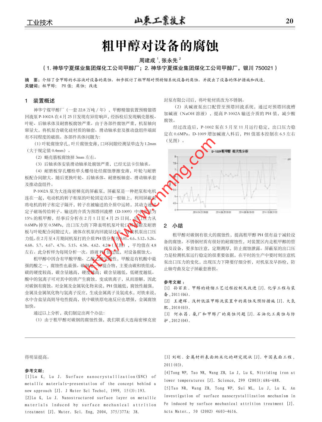 工業(yè)技術山柬工業(yè)技術20粗甲醇對設備的腐蝕周建成,張永先2. ( 1.神華寧夏煤業(yè)集團煤化工公司甲醇廠; 2.神華寧夏煤業(yè)集團煤化工公司甲醇廠,銀川750021 )摘要:介紹了含甲醇的水溶液對設備的腐蝕,初步探討了粗甲醇對預精餾系統(tǒng)設備的腐蝕,并提出了設備的保護措施和改造。關鍵詞:粗甲醇;陽值; 腐蝕;改造1裝置概述封泵有限公司后,將葉輪材質改為不銹鋼。神華寧煤甲醇廠(- 套2.萬噸/年),甲醇精餾裝置預精餾塔(2)從堿液泵出口配管至預塔回流系統(tǒng),通過對預塔回流槽回流泵P- 1002A在4月25日發(fā)現有異常響聲,經拆檢后發(fā)現蝸殼筋板、加堿液(NaOH溶液),提高P. 1002A輸送介質的PH值,減少酸葉輪、后軸承體及耐磨板腐蝕嚴重。由于各部件腐蝕嚴重,機泵軸向腐蝕。竄量大,將機系含碳化硅材質的軸套、滑動軸承套及推動盤組件墻面經過改造后, P-1002 泵在5月至11月運行穩(wěn)定,出口壓力穩(wěn)定在0.6MPa。D-1009 增加堿液入料后,PH值基本控制在6.5左右有不同程度的破損。各部件具體問題為:(1)葉輪腐蝕穿孔,葉片腐蝕變薄,口環(huán)間隙經測量單邊為1.2mm(見圖)。(大于規(guī)定值0.4mm)。100平密模關性分析(2) 蝸殼筋板腐蝕掉3mm左右。(3)后軸承體安裝滑動軸承處腐蝕嚴重,已經無法卡住軸承。(4)耐磨板穿孔螺栓單頭螺母處經腐蝕摩擦變薄,葉輪與耐磨板配合間隙大。隨后更換葉輪、后軸承體、耐磨板軸套、滑動軸承套及推動盤組件。P-1002A泵為大連海密梯克的屏蔽泵,屏蔽泵是一種把泵和電機連在一一起,電動機的轉子和泵的葉輪固定在同-根軸上,利用屏蔽套將電機的轉子和定子隔開,轉子在被輸送的介質中運轉,其動力通過定子磁場傳給轉子。輸送的介質為預塔回流槽(D- 10)中水含量為15%的粗甲醇,經事后分析在2月1日至4月25日間,出口壓力從0.6MPa 掉至0.5MPa,出口壓力的下降表明機泵葉輪口環(huán)間隙及耐磨2小結板與葉輪配合間隙過大,液體在機泵內回流量過大,導致機泵出口壓粗甲醇對碳鋼有很大的腐蝕性,提高粗甲醇PH值有益于減輕設力低。在2月至4月期間機泵打的介質PH值分別為5.01. 4.6、5.12.5.26、備的腐蝕。不銹鋼材質有很好的耐腐蝕性,對裝置區(qū)內走粗甲醇的管4.68、5.7、 4.67、 4.76、 5.15、 4.58、 4.62、 4.24 (見圖),平均值在4.8線及設備,要多加注意,定期測厚,防止腐蝕泄露。屏蔽泵的出口壓左右。此分析樣為每周分析-一次。 溶液PH值過低,對設備腐蝕大。力是檢測機泵運行穩(wěn)定的很重要依據,在平時的生產中要時刻注意機粗甲醇中因含有甲酸甲酯、乙酸乙酯呈酸性,甲酸是有機酸中最泵出口壓力的變化,出現壓力下降要仔細分析,對機泵及早拆檢,防強的酸之一一, 腐蝕性也最強。碳鋼是一種混合物, 主要由碳和鐵組成。止軸彎曲及定子屏蔽套磨損。碳的硬度較高,碳含量越高,硬度越高;碳含量越低,低硬度越低。酸中的氫離子可對其中的鐵產生腐蝕,變成鐵離子,從而溶解,因此參考文獻:對碳鋼有腐蝕。對金屬及金屬氧化物來說,PH值越低,腐蝕性越強,[1] 孫百亞。甲醇的精餾工藝過程控制及改進[J]. 化學工程與裝金屬及金屬氧化物與氫離子反應,生成金屬離子及氫或水,對鐵來說,備, 2011 (06).水中含鹽量高則導電性提高,鐵中碳鐵原電池反應也增強,金屬腐蝕[2] 王建輝。淺析低溫甲醇洗裝置中的腐蝕及預防措施[J].大氮加快。肥, 2010(03).通過以上分析,我們制定出兩個辦法:[3] 何永昌.氨廠和甲醇廠的腐蝕問題[J].石油化工腐蝕與防(1)由于粗甲醇對碳鋼的腐蝕性強,我們聯(lián)系大連海密梯克密護 ,2012(04).得明顯提高。[3]劉剛。金屬材料表面納米化的研究現狀[J].中國表面工程,2011 (03).[4]Tong WP,Tao NR,Wang ZB, Lu J,Lu K,Nitriding iron atmetallic materials-presentation of the concept behind alower temperatures [J]. Sciene, 299 (2003): 686-688.. [S]Tao NR, Wang ZB, Tong WP, Sui ML, Lu J,Lu K,Annew approach [J]. J Mater Sci Techol, 1999, 15 (3): 193.[2]Lu K,Lu J. Nanostructured surface layer on metal1icinvestigation of surface nanocrystallization mechanism inmaterials induced by surface mechanical attrition FPe induced by surface mechanical attrition treatment [J].treatment [J]. Mater. Sci. Eng, 2004, 375/377A: 38.Acta Mater., 50 (2002) 4603-4616.