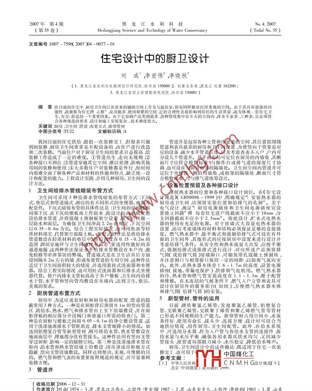 2007年第4期黑龍江水利科技No.4. 2007(第35卷)HeilongjiangScience and Teclnologyof W ater Conservancy( Todal No. 35 )文章編號(hào):1007 -7596( 2007 )04 -0077 -01住宅設(shè)計(jì)中的廚衛(wèi)設(shè)計(jì)劉成',李宏偉”,李曉秋”(1.黑龍江省水利水電勘測(cè)設(shè)計(jì)研究院哈爾濱1500802. 杜蒙水務(wù)局黑龍江杜蒙162200 ;3.黑龍江省國(guó)土資源勘測(cè)規(guī)劃院哈爾濱150001 )摘要在目前的住宅中廚房衛(wèi)生間已從原來(lái)的輔助空間上升為與起居室、臥室同樣被居民所重視的空間。由于其具有很強(qiáng)的功能性故被稱為住宅的心臟”是功能多使用頻繁的空間它的合理性直接影響到居民的生活質(zhì)量成為體現(xiàn)- -套住宅衛(wèi)生安全、舒適的求個(gè)重要因素。由于它容納產(chǎn)品類別最多各種管線集中在不大的空間內(nèi)涉及專業(yè)多工種多、且必須待關(guān)鍵詞廚房:衛(wèi)生間管道布置方式新型管材你人。中圖分類號(hào):TU22文獻(xiàn)標(biāo)識(shí)碼碼我國(guó)目前的住宅供給提倡一次裝修交工,但很多只做.管道井是包容各種立管和計(jì)量表的空間其位置擬圍繞到初裝修廚房衛(wèi)生間常常是不配設(shè)備的,由住戶進(jìn)行改造管道和表具最多的廚房和衛(wèi)生間設(shè)置為使豎向干管靠近對(duì)和二次裝修。當(dāng)前住戶對(duì)于廚房衛(wèi)生間的要求日益提高給應(yīng)的設(shè)備減少水平管道長(zhǎng)度,以及考慮查表不人戶,戶內(nèi)可裝修工作造成了一一定的難度。①管道叢生走向無(wú)規(guī)則②分設(shè)幾個(gè)管道井。其平面布局可定位在廚房的內(nèi)墻角其斷各種接口不到位③管道穿越其它空間,難以處理影響其他面尺寸應(yīng)符合模數(shù)標(biāo)準(zhǔn)與操作臺(tái)或排氣道的深度尺寸協(xié)房間的裝修和使用;④大多數(shù)住戶對(duì)裝修都是外行,,短時(shí)間調(diào)也可設(shè)在與廚房相鄰的隔墻處。衛(wèi)生間空間內(nèi)管道井可內(nèi)很難全面了解各種產(chǎn)品和材料的性能和特點(diǎn)缺乏統(tǒng)-一設(shè)定位于坐便器一側(cè)的 內(nèi)墻角,或相鄰的隔墻處,斷面尺寸符計(jì)和配置的能力。工程設(shè)計(jì)實(shí)踐介紹幾種廚房、衛(wèi)生間的設(shè)合模數(shù)標(biāo)準(zhǔn)可與排氣道統(tǒng)籌設(shè)計(jì)。計(jì)方法。4設(shè)備位置預(yù)留及各種接口設(shè)計(jì)衛(wèi)生間給排水管線暗裝布管方式預(yù)留熱水器的位置和各種接口設(shè)十到位。在《住宅設(shè)衛(wèi)生間可采用3種給排水管線暗裝的布管方式:下沉計(jì)規(guī)范》( GB50096- 1999 )中明確規(guī)定”。安裝熱水器的式、墊層式和管道墻式相應(yīng)的有不同形式的坐便器地漏等廚房或衛(wèi)生間應(yīng)預(yù)留安裝位置和給排氣的孔洞”。關(guān)于配套件。下沉式暗裝布管的具體作法是衛(wèi)生間的結(jié)構(gòu)樓板電氣設(shè)計(jì)規(guī)定”廚房電源插座和衛(wèi)生間電源插座宜設(shè)局部下沉在下沉的樓板面上作防水按設(shè)計(jì)標(biāo)高和坡度敷置獨(dú)立回路”和每套住宅進(jìn)戶線截面不應(yīng)小于10mm 分設(shè)給排水管道并將混凝土預(yù)制板架空設(shè)置找平后再做一i支回路截面不應(yīng)小于2. 5mm"。按此設(shè)計(jì)貯水式電熱水層防水和面層。為確保衛(wèi)生間凈高2.2m的規(guī)定下沉空間器的使用有充足的電源。對(duì)于掛墻式大容量電熱水器的以0.35~0.4m為宜。結(jié)合工程實(shí)際情況也可用焦渣等輕設(shè)置,還應(yīng)考慮墻體的材料和結(jié)構(gòu)必須保證足夠的連接強(qiáng)質(zhì)材料填實(shí)代替架空混凝土板。墊層式的作法是將給排水度。燃?xì)鉄崴髦谐胶馐胶蛷?qiáng)制給排氣式可設(shè)在有外管道敷設(shè)在輕質(zhì)材料的墊層中墊層高度在0. 15 ~0. 2m的窗的衛(wèi)生間外其他形式的應(yīng)按廚房中設(shè)置來(lái)進(jìn)行設(shè)計(jì)并范圍即居室地坪與衛(wèi)生間地坪有高差要選用性能好的多考慮給排氣條件。從安全性和熱水流量大出發(fā)應(yīng)按平衡通道地漏這兩種作法保證水平給排水管敷設(shè)在本戶內(nèi)避式、強(qiáng)制給排式或強(qiáng)排式進(jìn)行設(shè)計(jì),對(duì)應(yīng)所選產(chǎn)品預(yù)留排免檢修等牽涉鄰居的弊端。管道墻式是在衛(wèi)生潔具后方加氣筒( 或給排氣筒)穿墻洞口,可 砌筑帶孔混凝土預(yù)制塊,設(shè)間隔0.2m左右的墻形成布置管道的專用空間這種作法并注意洞口與相鄰窗口保持-一定的間距,以防廢氣流向室適宜于衛(wèi)生間面積較大的情況并選用懸掛式洗面器和坐便內(nèi)。此外,在熱水器本體旁1.6~1.7m的高度,設(shè)置電源器。結(jié)合工程實(shí)際情況,也可用柱式洗面器和后排水式坐便插座( 接地、帶漏電保護(hù)) ,供排煙氣電機(jī)用。燃?xì)鉄崴髌鞔?。使戶?nèi)排水支管標(biāo)高高于本戶樓板衛(wèi)生間內(nèi)給排的冷、熱水管和燃?xì)夤馨惭b高度在1. l ~1.3m ,便于配管水干管、水平管和豎向管均敷設(shè)在夾墻內(nèi)達(dá)到衛(wèi)生、整潔、和維修。在無(wú)凍結(jié)的氣候條件下燃?xì)馊藨袅⒐芎捅砭呖擅烙^的要求。.設(shè)計(jì)在廚房外的服務(wù)陽(yáng)臺(tái)(封閉)方便燃?xì)鉄崴鞅倔w2廚房 管道布置方式和排氣簡(jiǎn)(給排氣筒)的安裝。廚房中為適應(yīng)成套廚柜和廚