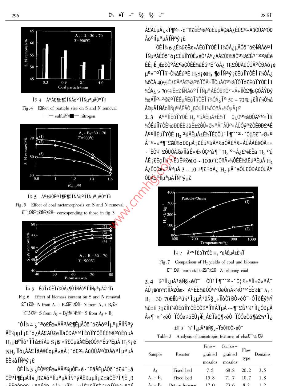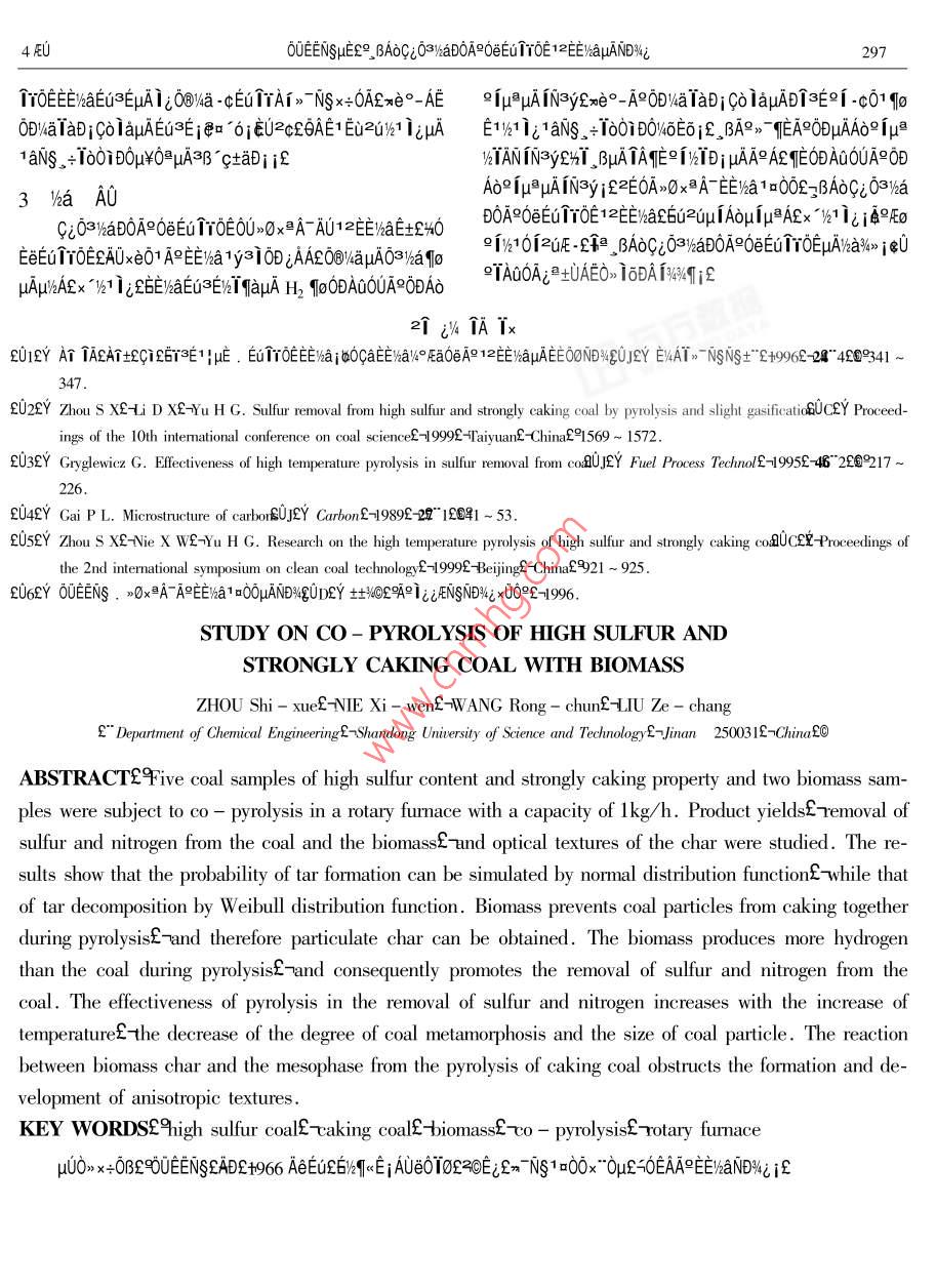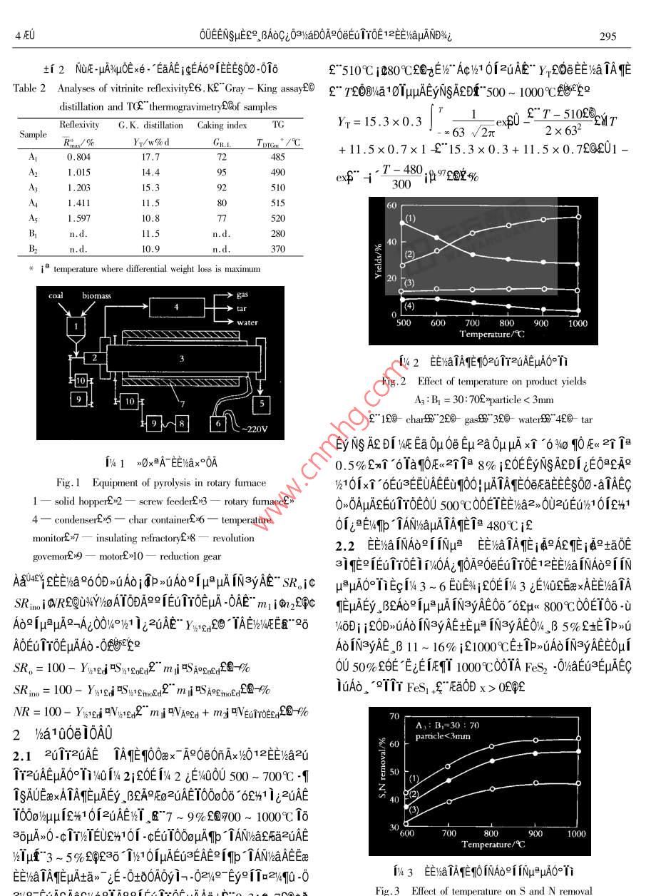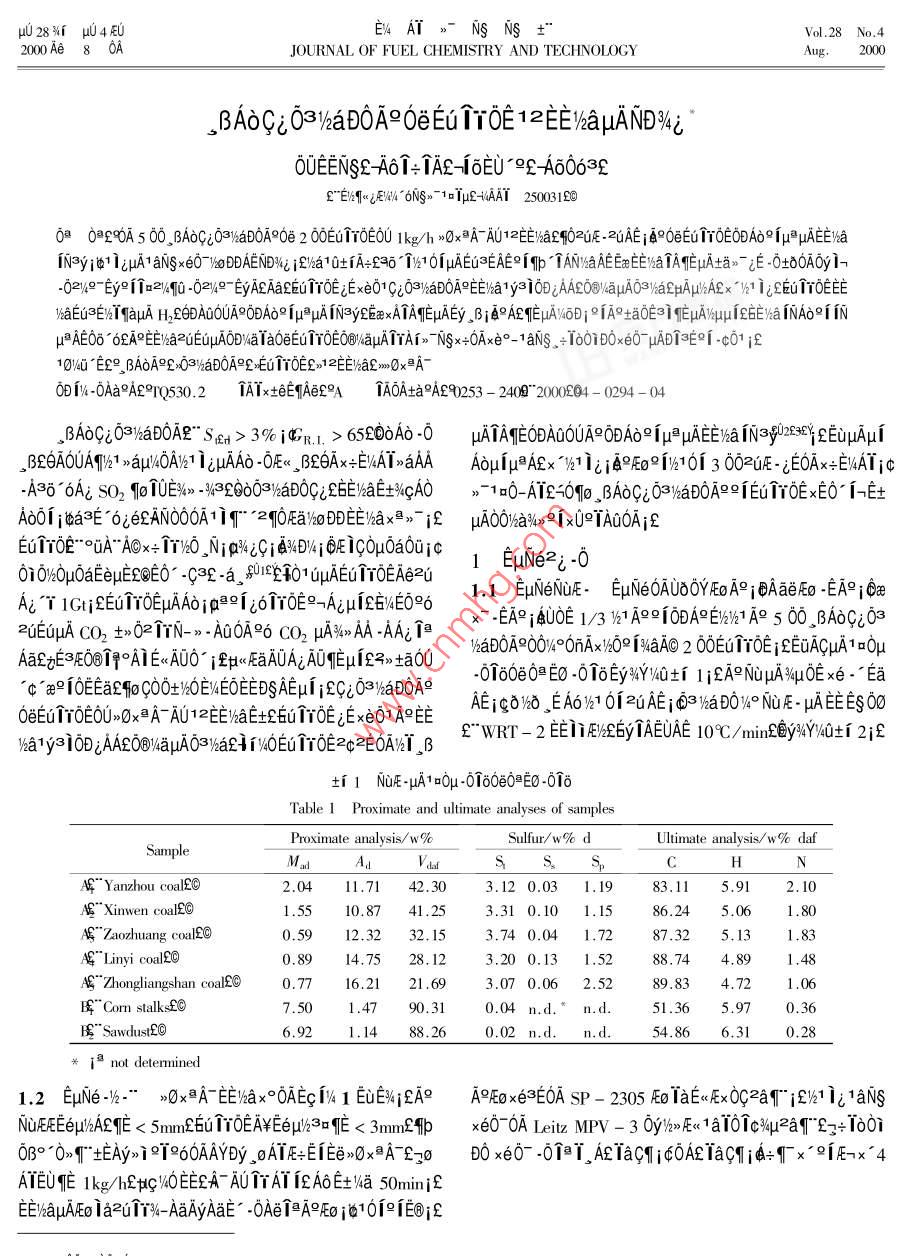 μ028%r μ04EUEV4AT>-NsNs+°Vol.28 No.42000Ae 8 oJOURNAL OF FUEL CHEMISTRY AND TECHNOLOGYAug.2000。βAoCi03VaD0A90eEu TYOE 12EE/aμAN%i°OUEENSE- A61+ TAE-16EU*9L A60632f"EIS9wgEWN4*6NSs=51=[μu-tAAY 250031200a 00OA5 00 BAδCiO3WaD0A90e 2 00EuTrOE0O 1kg/h >0xA AUI2E!aE:02UE .2uAE i@9O∈EOTrOE0ODAoefμAuEE%aIN3yiφ1jμA1aNS xe0~)aDDAENDWi i/a10+1A-230 T/10fμAEG≥EAE∞[ TANWAEEENaTAMEuAta》~ i白 -00y1-02/9 Ey9↑2/q0 -021/9- EyAEAaLEUTrOE iExe01CiO3/aD0A=EE/a1y3i0DjAAEO@WaμAO3/atμAμ%AEx1)21 igEEuTYOEEwaEu≥EwHqaμA H29DAQ00A90DAoe IμβμAIN3yEE∞xATATEμAEy βjB°A°qEμA∞6Dj°[A°aOEa1∈μμiEE%a INAδ?i INμ AEOo 6EAREEWhE2UEUpADvaTaOBEuTEO@WGuATTA>) TNSx+0Axe0-1 aiNs。+1601D0x60 μADT≈∈°1-c01 f10/40 "E9 BAOAS:03/haD0A Er1TOE>E)%L>0xA-0D1W-0AaA89IQ530.2TA1xt∈EqAef9ATA0Ata9A£90253 - 240”" 2004 - 0294-04。BAδG;O3WaD0AR" S&u> 3% iGp.1. > 65E00Ao -0μATAMEODAQ0UA9ODAδ≌1μPμAEEyha NJ302E389EuμAμ1,BE6A0OUATh1 >qμ%:OA11 ijμAAo -O0Ex_ BEAx∈E%AT>aAAoμIμAEx ~%h1 izja9E9%101 3 002uE - εEOAx≈EIWATjφ-A36 6Ai SO2 910 TUE%> -V632003%aD0CiS6E%aE+x%GAO》 1a0-AT26010 ,BAOCi δ3WaDOA≤≌IEuTrOExEO° i-EtAo01 ia3∈6;EAN00OA1ir" 2q0EaWoDDEE%ax》- i& μA0OYha%>9[x0TA0OA;EEuTroe"°uA~ AOx+1T20_ N: Q%zCia4D%i氏iCOμoa0ujc1 EμN(yùn)e2i-00i0%θμOaEeμESQE0° -C3C -a。0IEHO1oμAEuTTOEAe2u.1 EμN(yùn)eNiF- EμINe0AUBOYFEoA° jAaeEo .EAR i@aAi T 1GtjEEu1Y0EμAAσjρ≌≌jρ61πτδE≌→Aiμi6NE0°6x- -EA j4UOE 1/3 /61 Ag9i0DAE}%%1 A 5 60 βAoGi0320EuμA CO2 +>0211N-》- A00A96 CO2 μA4%> AA -AAi日IhaDOAR0O%°O∩Ax0QixaAO 2 60EuTTOE iEEuACμA1a0μAatfE3E0@TR°Ai Eta0U-0160e0日EO -6 16EyWYV4Q+i 1iEA°NuμA%qμ0Exe-'Ea~C ae910EEaS9oC0Ot/%OE%EOEEDS AEμi ifCiδ3WaD0A9AEigδ%O。EAO%61 012uAEj@3 )aD0y4° NuE- μAEEEg0OOeEuTT0EOU>Ox2A- AU12EE)aE+EuTr0EεExe01A9Ef" WRT- 2 EEiEMEy TAEUAE 10C/minf@y94Y%0+f 2iEVsa1ysi0BjAAEO@WaμAO3lkaci T/OETrOE2q2EOANT。β1 NuE μA10μ-0160e0@E0-016Table 1 Proximate and ultimate analyses of samplesProximate analysis/w%Sulfur/w% dUltimate analysis/w% daf 1SampleS,CA&"Yanzhou coalEO2.0411.71 42. 303.12 0.03 1.1983.115.912.10AE"Xinwen coalE@1.5510.87 41 .253.31 0.10 1.1586.241.80 .AG"Zaozhuang coalLO0.5912.32 32. 153.74 0.04 1.7287.325.131.83AG"Linyi coal200.89.14.7528.123.20 0.13 1.5288.744.891.48AG"Zhongliangshan coalE⑥0.7716.2121.693.07 0.06 2.5289.834.721.06暉"Com stalksE@7.501.4790.310.04 n.d.* n.d.51.365.970.36"Sawdusi£@6.921.1488.260.02 n.d.n.d.54. 86.310.28目not determined1.2 EμN(yùn)e-%-" >0xXA EEWax°OAECT% 1 EUE%iLA9 A9Eox∈3E0A SP - 2305 FEo IaEE1a101c%μ2a9 f7+ 10o0i0B°0>》" tEAy>i 9°960AAYDy. ,ATE=EIEe>OxAT£zoDO xe0- -01 AETac1 iφOALiaC9IiQ:qx°qiE-x*4ATEUE 1kg/htft:/%4OEEZA- AU個(gè)AT iεAδ+ya 50minjfEE/hauμAEo ia2uTT%-AaAyAaE”-0Ae1@A9Eo j@1019iE@jE4E0OUEENSμE°9 BAoGio3WaDOA9OeEuTrOE 1EEμANDNi295tf 2 NUEμAqμOE xe- EaAEiEAE∈S00-0Tδ"510C j480CE國(guó)jEW" Ac/1 01zuAE" YfOeEEwaTAETable2 Analyes of vtinite rlxviyE6.Ke" Gray - King asy29 f" τεOva10πμuAEyNSAEDT° *500 ~ 1000CE的E9ditllation and T(E" thermogavimetry@of samplesT'- 5102圖SarmpleRellexivityG. K. disillation Caking indexTGYp=15.3x0.363 V2πex$0.2x 632R./%Y/w%dGuLTrem" /9+11.5x0.7x1 {15.3x0.3+ 11.5x0.7fQEU1 -A0.80417.77:4851.01514.49590ef$"+-480;692@%! .20315.3951(3001.41111.58(1.5910.875201)Bn.d.28010.9370州in : temperature where differential weight loss is maximum0 [(3)cobiomassgas4)water500 600 700 800 900 1000Temperature/C142 EEWaTATEqO2GTY2UAEμAO°TiFig.2 Effect of temperature on product yields哥A;: Bj = 30: 70E*particle < 3mm" 1£6- char 2E0- gas 32⑥- warenS"4- tar-220VEy NS AE Di IAE Ea 0μ0e Eμ≥aφμAxi 6%40 OEw2個(gè)∩a1%41 >0xAFEE)ax°OA0. 5%ExT 6TaqOE<2η1≥8% iEOEEyNSAEDi iEO∈CA9Fig.1 Equipment of pyrolysis in rotary furmnace6101x個(gè)6EuEEUAEqT00|μATATEOeEEEgO0O -aAEC: solid hopper£>2- screw feederE3rotary fumace£》0O0AμAE6uTT0E0U 5000ETE)a2>0U2uEu/10i2%14一condenserE5- char container£*6 一temperature01;aE%Ip“TAN/aμATAEia 480CiEmonitor£*7- insulating refractory£.- revolution2.2 EEWha INAδI INμp EEvaTAE i d2AEE i eata0Egovemor£>9 一motor:>10reduction gear3iqE91EuTTOEIi1V4OAqOAOeEuTrOE 12EE/%aNAδ2[ NARlieEhae6oOouAoigp wuAoefμAIN3yAE° sR,ic μuAO°T1Eq1% 3- 6 Ex;£OEi% 3 iEXEexEEaTASR.umRQROYOATODAROIETOTOEAOAE mion2i@C EμAEy ,BEAoRiμ≌μAN3yAE0a °62pμx 800C00ETO8 -uAδ9fμ9μA9-Aj001°%1 i;2uAE" Y15qg2O 1AENE8V.6Dj j20D>uAo IN3y AEtEμ IN3yAE0%4. ,B 5% &E1P>GAOEuTTOEμAAδ -0些19AoIN3yAE, B 11~ 16% jf1000cE土1P>uAo INsyAEEOμISR。= 100- YwnjiSwyenen2~ mjSsef國(guó)-%60 50% £θ∈°EεE1E們100000TA FeS2 -O/aEu3∈EμAECSR.. = 100- YyngjPSermes2~ miScnme2國(guó)-%1uAo_。9T個(gè)1 FeSi &"RaOD x> 0£@RNR = 100- YwngjWYVxrc2" mibVjesd + mj GVrre20H%o0廠A: B,=30 : 702 Vea100e 10A0.0上parides3mm2.1 2uTr2uAE TAE 00ex AP0e0nAx%6O12EElMa2叫UTr2uAEμA0°160T%4 2j20E1%4 2 εEyQ0U 500 ~ 700C-T50TgAUExATAmEpuAEy. BEA9Eo2UAETOOo0 621 i;2UAEP(2))100%μμIzH1012uAE%T 6~"7 ~ 9% 2周700~ 1000153δμA>O-c個(gè)T/%TEU2H10i -cEuTO0oμAMp TANwaE6a2uAE00800900y[μT"3 ~ 5% £④土36個(gè)V101μAEu3EAE9iηp° TANhaAEExe13 EEWaTAETOINAoi iNμ≌μA0°IiE/aTATEμAta》~ iE -0t80A0y1--02/9-Ey9112/0-0Fig.3Effect of temperature on s and N removal296E AT>-NSNS+"28 %i65AEAOμAεxIq2> -C T26E/aZUEuμACaAεEU2AOUAP0DA: B,=30 : 70T=900CAδ9iμAIN3yif600ETV4 6 iE/OL6xexAEuTrOE1%OAμA0δ° 62NAo9155NμPAE0δ OiEuTYOExeO1ARjAAE0@Wa03/)a261 "22aEe8 50Ei毛。FEoDORAfoCOEEYAaEU3E 6Ai H2EODAOOUAPODAOjCμ->0TT-0%aEd3E HSjNH, 1o IN3yjiEuTTOEi i146Ai0.30.94.V.60A 40% E土EAE/4a3010A+ IOμAOJWaTOT6EEuTTOEiCoal particle/ mmV40Ai > 70% EENAo9f INμ@ AE06:%02>A+ I0fEcCOAYDy1%44 AAETEOINAδ11NμAO°TiVxoA12,>3C2TEEpAEuTTOEITNOA4TE 50 ~ 70% ifif14o%aFig.4 Effect of particle size on S and N removalACμAINAoNμAEAO_ ,BoUi 1400x0uAiC ]- - sulfur£>■一nitrogen2.3 A991EuTrOE H2 2uAEμAtE)yT G;03/aD0A92,iV4:0Eu T0E%ODDEEWEHEYOU>x2A AU2>A00y320EDDZ1EA,: B,3070Ae1Eu1YOE H2 2uAEμA+E%1EC0∪1 i7"2.*01壓>0x37