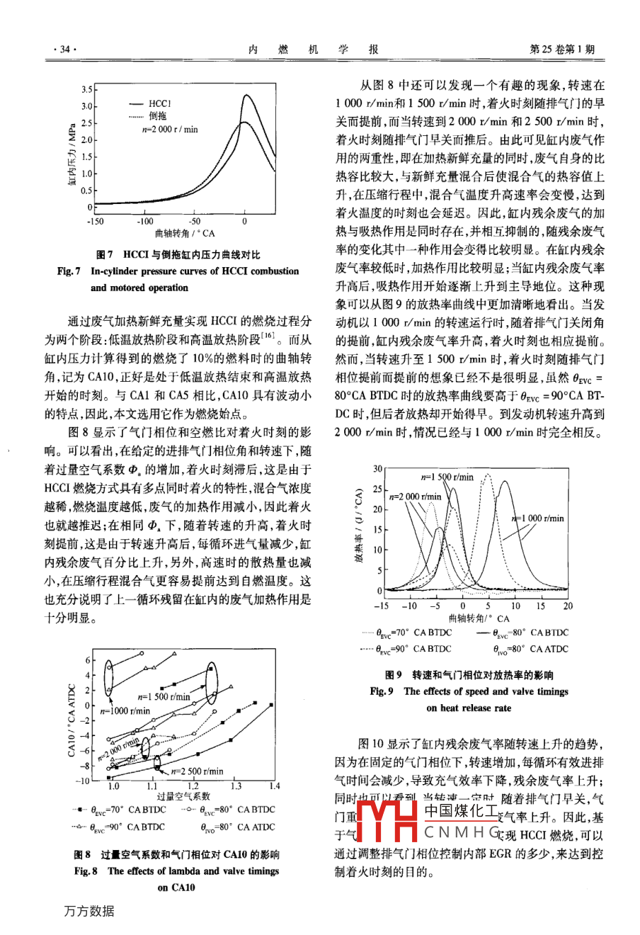 第25卷(2007)第1期內(nèi)燃機(jī)學(xué)報(bào)Transactions of CSICEVol.25(2007)No.1文章編號(hào):1000-0909(2007)01-0030-0725005乙醇燃料HCCI發(fā)動(dòng)機(jī)燃燒特性研究張巖,何邦全,謝輝,趙華(天津大學(xué)內(nèi)燃機(jī)燃燒學(xué)國(guó)家重點(diǎn)實(shí)驗(yàn)室,天津300072)摘要:應(yīng)用調(diào)整進(jìn)排氣門相位控制缸內(nèi)殘余廢氣率策略,在 Ricardo Hydra四沖程進(jìn)氣道噴射單缸試驗(yàn)機(jī)上實(shí)現(xiàn)了無水乙醇燃料的均質(zhì)壓燃,獲得了運(yùn)行工況范圍,并分析研究了空燃比、轉(zhuǎn)速和氣門相位對(duì)乙醇燃料均質(zhì)壓燃的燃燒特性。結(jié)果表明:乙醇燃料的均質(zhì)壓燃的可運(yùn)行范圍仍然受到爆震、換氣過程及失火的限制,但在高速及稀燃區(qū)域得到拓展;其著火時(shí)刻及燃燒持續(xù)期依賴于氣門定時(shí)、空燃比及轉(zhuǎn)速。關(guān)鍵詞:均質(zhì)壓燃;乙醇;燃燒;汽油機(jī)中圖分類號(hào):TK411.29文獻(xiàn)標(biāo)志碼:AThe Combustion Characteristics of an HCCI Engine Fuelled with EthanolZHANG Yan, HE Bang-quan, XIE Hui, ZHAO HuaState Key Laboratory of Engines, Tianjin University, Tianjin 300072, ChinAbstract: With the utilization of valve timing strategy in inlet and exhaust valve control, the Homogene-ous Charge Compression Ignition( HCCI)combustion was achieved by adjusting the amount of trapped residuals with the negative valve overlap in a Ricardo Hydra four-stroke port fuel injection engine fueled withhanol The effect of ethanol on HCCI combustion characteristics at different air-fuel ratios, enginespeeds and valve timings was investigated. The results indicate that HCCI ethanol combustion can be a-chieved by varying the inlet and exhaust valve timings. The operation range of an HCCI engine fuelled withethanol can be extended to the high speed and lean burn conditions. Meanwhile, ignition timing and com-bustion duration are dependent on valve timing, lambda and speedsKeywords: HCCI; Ethanol; Combustion; Gasoline engine問題引言從上世紀(jì)20年代開始,代用燃料的概念就被提均質(zhì)充量壓縮著火(HCC)燃燒模式是一種新型出,到70年代得到廣泛接受。由于石油資源的有的燃燒方式,有著不同于傳統(tǒng)汽油機(jī)及柴油機(jī)的燃燒限性并隨著人們的開采和利用而日益減少,如今代用過程。工作于HCCI燃燒模式的發(fā)動(dòng)機(jī)(HCCI發(fā)動(dòng)燃料(特別是可再生燃料)已受到國(guó)內(nèi)外內(nèi)燃機(jī)界的機(jī))在進(jìn)氣和壓縮行程中形成均質(zhì)混合氣,當(dāng)活塞到關(guān)注。乙醇作為可再生含氧燃料,具有辛烷值高、抗爆達(dá)上止點(diǎn)附近時(shí)均質(zhì)混合氣被壓縮產(chǎn)生自燃著火。性好等特點(diǎn)。研究表明乙醇是實(shí)現(xiàn)HCCI燃燒的理想HCI燃然燒模式可大大提高汽油機(jī)部分負(fù)荷時(shí)的燃油燃料之一,但是基于內(nèi)部廢氣再循環(huán)策略下的乙醇經(jīng)濟(jì)性,同時(shí)在無催化器的條件下顯著降低發(fā)動(dòng)機(jī)的HCl發(fā)動(dòng)機(jī)的燃燒研究開展得還比較少。為此,本文NO,排放2。HCI發(fā)動(dòng)機(jī)集成了傳統(tǒng)火花點(diǎn)燃式在 Ricardo Hydra四沖程進(jìn)氣道噴射發(fā)動(dòng)機(jī)上通過內(nèi)發(fā)動(dòng)機(jī)及壓燃式發(fā)動(dòng)機(jī)的優(yōu)點(diǎn),被認(rèn)為是新一代內(nèi)燃部廢氣再循環(huán)的方法研究空燃比、轉(zhuǎn)速和氣門定時(shí)對(duì)機(jī)的代表。乙醇恬沽丑的響,進(jìn)一步了解乙醇燃雖然HCCI發(fā)動(dòng)機(jī)有著誘人的前景但HCl發(fā)動(dòng)料對(duì)中國(guó)煤化工燃燒特性的影響,更機(jī)還存在著火時(shí)刻控制困難、運(yùn)行工況范圍小等好CNMHG收稿日期:2006-03-17;修回日期:2006-07-12基金項(xiàng)目:國(guó)家重點(diǎn)基礎(chǔ)研究發(fā)展規(guī)劃資助項(xiàng)目(2001CB209204);國(guó)家自然科學(xué)基金資助項(xiàng)目(50476064)。作者簡(jiǎn)介:張巖博土研究生,E-mal: zhangyan@ tju. edu007年1月張巖等:乙醇燃料HCCI發(fā)動(dòng)機(jī)燃燒特性研究試驗(yàn)裝置和試驗(yàn)過程空燃比的精確控制。在每個(gè)試驗(yàn)點(diǎn),用奇石樂6125B壓電晶體傳感器配合5011B電荷放大器連續(xù)采集100試驗(yàn)用發(fā)動(dòng)機(jī)為 Ricardo Hydra四沖程進(jìn)氣道噴個(gè)循環(huán)的缸內(nèi)壓力,并求出其平均值,用于分析。同射單缸試驗(yàn)機(jī),其具體參數(shù)及試驗(yàn)條件見表1。時(shí),用精度為±1%的渦街流量計(jì)測(cè)量進(jìn)氣流量。為了消除冷卻水和潤(rùn)滑油溫度的差異對(duì)敏感的表1發(fā)動(dòng)機(jī)參數(shù)及試驗(yàn)條件HCCI燃燒造成的影響,試驗(yàn)過程中冷卻水溫和油溫被Tab. 1 Engine specifications and test conditions嚴(yán)格控制在(80±1)℃和(55±1)℃。參數(shù)的值試驗(yàn)時(shí)節(jié)氣門始終保持全開,這大大減小了一直缸徑/mm抑制傳統(tǒng)汽油機(jī)熱效率的泵吸損失。開始試驗(yàn)時(shí),發(fā)行程/mm動(dòng)機(jī)首先由交流電力測(cè)功機(jī)倒拖至一穩(wěn)定轉(zhuǎn)速,并以非量t/mL火花點(diǎn)燃模式使發(fā)動(dòng)機(jī)著火,用于在氣缸內(nèi)產(chǎn)生足夠壓縮比量的高溫殘余廢氣。幾個(gè)循環(huán)后,關(guān)閉火花塞點(diǎn)火系氣門數(shù)統(tǒng),發(fā)動(dòng)機(jī)即可在HCCⅠ模式下穩(wěn)定運(yùn)行。通過調(diào)節(jié)轉(zhuǎn)速/(r/min)<6500測(cè)功機(jī)和噴油脈寬,HCCI發(f