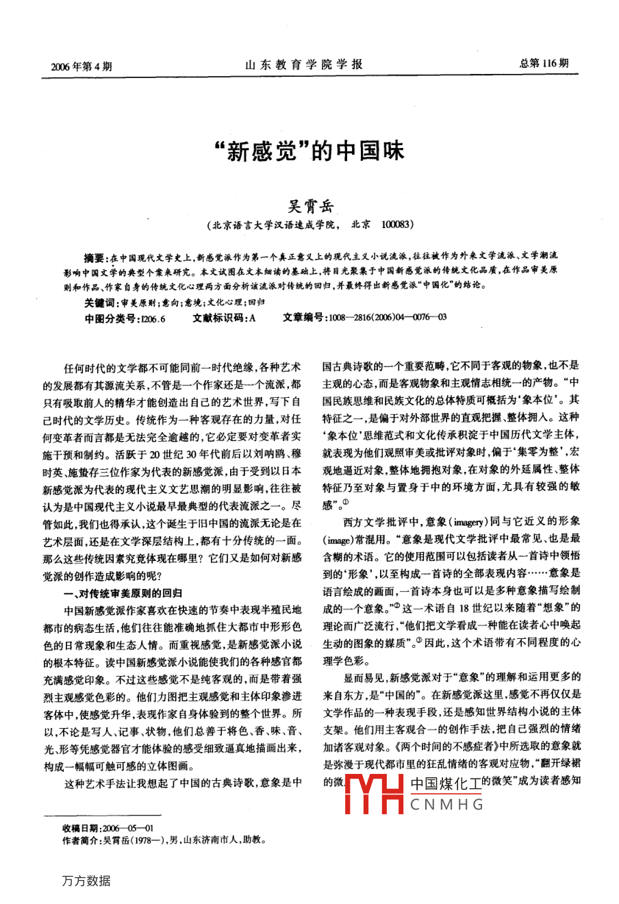 2006年第4期山東教育學(xué)院學(xué)報(bào)總第116期“新感覺”的中國味吳霄岳(北京語言大學(xué)漢語速成學(xué)院,北京10003摘要:在中國現(xiàn)代文學(xué)史上,新感覺派作為第一個真正意義上的現(xiàn)代主義小說流派,往往被作為外來文學(xué)流派、文學(xué)潮流彩響中國文學(xué)的典型個案來研究。本文試圖在文本細(xì)讀的基礎(chǔ)上,將目光聚集于中國新感覺派的傳統(tǒng)文化品質(zhì),在作品審美原則和作品、作家自身的傳統(tǒng)文化心理兩方面分析該流派對傳統(tǒng)的回歸,并最終得出新惑覺派“中國化”的結(jié)論關(guān)鍵詞:審美原則;意向;意境;文化心理;回歸中圖分類號:D66文獻(xiàn)標(biāo)識碼:A文章編號:008-2816(2004060任何時代的文學(xué)都不可能同前一時代絕緣,各種藝術(shù)國古典詩歌的一個重要范疇它不同于客觀的物象,也不是的發(fā)展都有其源流關(guān)系,不管是一個作家還是一個流派,都主觀的心態(tài),而是客觀物象和主觀情志相統(tǒng)一的產(chǎn)物?!爸兄挥形∏叭说木A才能創(chuàng)造出自己的藝術(shù)世界,寫下自國民族思維和民族文化的總體特質(zhì)可概括為‘象本位’。其己時代的文學(xué)歷史。傳統(tǒng)作為一種客觀存在的力量,對任特征之一,是偏于對外部世界的直觀把握整體擁入。這種何變革者而言都是無法完全逾越的它必定要對變革者實(shí)象本位思維范式和文化傳承積淀于中國歷代文學(xué)主體施干預(yù)和制約。活躍于20世紀(jì)30年代前后以劉吶鷗、穆就表現(xiàn)為他們觀照審美或批評對象時偏于“集零為整’宏時英、施蟄存三位作家為代表的新感覺派,由于受到以日本觀地逼近對象整體地?fù)肀ο?在對象的外延屬性、整體新感覺派為代表的現(xiàn)代主義文藝思潮的明顯影響,往往被特征乃至對象與置身于中的環(huán)境方面,尤具有較強(qiáng)的敏認(rèn)為是中國現(xiàn)代主義小說最早最典型的代表流派之一。盡感”。管如此我們也得承認(rèn)這個誕生于舊中國的流派無論是在西方文學(xué)批評中,意象( imagery)同與它近義的形象藝術(shù)層面,還是在文學(xué)深層結(jié)構(gòu)上都有十分傳統(tǒng)的一面。(img)常混用?!耙庀笫乾F(xiàn)代文學(xué)批評中最常見、也是最那么這些傳統(tǒng)因素究竟體現(xiàn)在哪里?它們又是如何對新感含糊的術(shù)語。它的使用范圍可以包括讀者從一首詩中領(lǐng)悟覺派的創(chuàng)作造成影響的呢?到的形象’,以至構(gòu)成一首詩的全部表現(xiàn)內(nèi)容……意象是對傳統(tǒng)審美原則的回歸語言繪成的畫面,一首詩本身也可以是多種意象描寫繪制中國新感覺派作家喜歡在快速的節(jié)奏中表現(xiàn)半殖民地成的一個意象。這一術(shù)語自18世紀(jì)以來隨著“想象”的都市的病態(tài)生活,他們往往能準(zhǔn)確地抓住大都市中形形色理論而廣泛流行,“他們把文學(xué)看成一種能在讀者心中喚起色的日常現(xiàn)象和生態(tài)人情。而重視感覺是新感覺派小說生動的圖象的媒質(zhì)”。因此,這個術(shù)語帶有不同程度的心的根本特征。讀中國新感覺派小說能使我們的各種感官都理學(xué)色彩。充滿感黨印象。不過這些感覺不是純客觀的,而是帶著強(qiáng)顯而易見,新感覺派對于“意象”的理解和運(yùn)用更多的烈主觀感覺色彩的。他們力圖把主觀感覺和主體印象滲進(jìn)來自東方,是“中國的”。在新感覺派這里,感覺不再僅僅是客體中,使感覺升華,表現(xiàn)作家自身體驗(yàn)到的整個世界。所文學(xué)作品的一種表現(xiàn)手段,還是感知世界結(jié)構(gòu)小說的主體以,不論是寫人、記事、狀物他們總善于將色、香、味、音、支架。他們用主客觀合一的創(chuàng)作手法把自己強(qiáng)烈的情緒光、形等憑感覺器官才能體驗(yàn)的感受細(xì)致逼真地描畫出來,加諸客觀對象?!秲蓚€時間的不感癥者》中所選取的意象就構(gòu)成一幅幅可觸可感的立體圖畫是彌漫于現(xiàn)代都市里的狂亂情緒的客觀對應(yīng)物“翻開綠裙這種藝術(shù)手法讓我想起了中國的古典詩歌,意象是中的微YH中國煤化工的微笑成為讀者感知CNMHG收稿日期:200605-01作者簡介:昊霄岳(1978-),男,山東濟(jì)南市人,助教。總第116期山東教育學(xué)院學(xué)報(bào)主人內(nèi)心焦躁迷亂、春情涌動的形象符號。這些相關(guān)意象小說如《梅雨之夕》《春陽》等篇雖然有人物的自由聯(lián)想、意暗示了情感意向渲染了特定的氛圍喚起讀者的相似情感識跳躍但作者從未退出小說而且往往運(yùn)用傳統(tǒng)的心理描體驗(yàn),從整體上受到浸染而無意去詳究其細(xì)節(jié)和所以然。寫方法以第三人稱全知全能視角切入,通過人物動作、神再看施蟄存的《扇》,小說寫兩小無猜的一對少男少女以一態(tài)的刻畫而顯示其內(nèi)心。至于人物心理活動本身遵循的柄茜色輕紗的團(tuán)扇作為初戀的贈物。其中寫到他們在花園也是時空發(fā)展的正常秩序,所以讀起來十分曉暢,不會產(chǎn)生賞月,以團(tuán)扇追撲流螢的情景,其意象顯然取自杜牧“輕羅像讀西方意識流小說那種捉摸不定的飄忽感和煞費(fèi)周章的小扇撲流螢”之句晦澀感。穆時英的《街景》對都市乞丐死前意識的描寫:女新感覺派還將多個意象疊加,形成意境。穆時英在子的叫聲巡捕輪子跑著的人