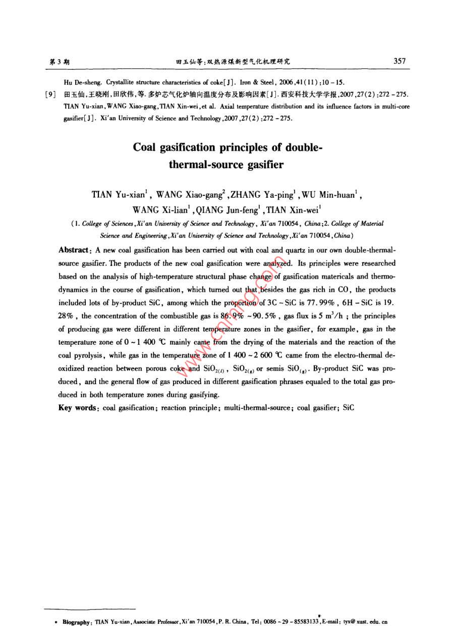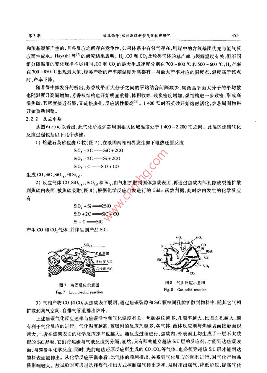第29卷第3期西安科技大學(xué)學(xué)報Vol.29 No.32009年5月JOURNAL OF XI'AN UNIVERSITY OF SCIENCE AND TECHNOLOCYMay. 2009文章編號: 1672 -9315(2009)03 -0352 -06雙熱源煤新型氣化機理研究田玉仙' ,王曉剛”,張亞平',吳敏煥',王喜蓮' ,強軍鋒' ,田欣偉'(1.西安科技大學(xué)理學(xué)院.陜西西安710054; 2.西安科技大學(xué)材料科學(xué)與工程學(xué)院,陜西西安710054)商要:以煤和石英砂為原料,在自制雙熱源煤新型氣化爐上實現(xiàn)了煤炭新型氣化,測試了氣化產(chǎn)物,從氣化原料的高溫結(jié)構(gòu)相變和氣化反應(yīng)過程熱力學(xué)分析出發(fā),研究了煤新型氣化機理。結(jié)果表明:雙熱源煤新型氣化的產(chǎn)物除了富含CO的煤氣外,還包括大量SiC副產(chǎn)品,其晶相以3C -SiC(77. 99%)和6H - SiC(19. 28%)為主,煤氣中可燃?xì)怏w濃度為86. 9% ~90. 5%,產(chǎn)率5.0 m'/h;氣化爐內(nèi)不同溫區(qū),煤氣產(chǎn)生原理不同,0~1 400C溫區(qū),煤氣主要來源于原料干燥和煤熱解反應(yīng),1 400-2600 C溫區(qū),煤氣主要來源于多孔焦碳與SiO2u), SiOze及中間產(chǎn)物Si0。的電熱還原反應(yīng),同時伴生副產(chǎn)品SiC;各氣化反應(yīng)階段所產(chǎn)煤氣總量為該時刻所有溫區(qū)所產(chǎn)煤氣總和。關(guān)鍵詞:煤炭氣化;反應(yīng)機理;多熱源;氣化爐;碳化硅中圖分類號: TQ 53文獻(xiàn)標(biāo)志碼: A中國是一個煤資源較為豐富的國家,煤的年產(chǎn)量在10億t以上,在一次能源消費中占72%左右,其中大部分是直接燃燒用于電力工業(yè)和運輸行業(yè),不僅能源利用率低下,而且會釋放大量SO2,CO2,煙塵和NO,,嚴(yán)重污染環(huán)境。以“ 煤氣化為基礎(chǔ)的多聯(lián)產(chǎn)技術(shù)”,是實現(xiàn)煤炭潔凈高效開發(fā)與利用的途徑"。然而,我國煤氣化比重較低,且整體氣化技術(shù)比較落后。開發(fā)新的煤炭氣化方法,盡快形成有自主知識產(chǎn)權(quán)的煤氣化技術(shù)迫在眉睫。課題組在多年從事煤炭潔凈轉(zhuǎn)化研究中,以煤、石英砂、電為基礎(chǔ)資源,在自行發(fā)明的雙熱源煤新型氣化爐上實現(xiàn)了煤的氣化,并得到了四高SiC副產(chǎn)品23。文中用雙熱源煤新型氣化法將陜北低變質(zhì)煙煤變成了富含Co煤氣,并結(jié)合原料的高溫結(jié)構(gòu)相變,從爐內(nèi)氣化反應(yīng)過程熱力學(xué)出發(fā),研究了氣化機理。1實驗表1煤質(zhì)分析Tab.1 Technical analysis of bituminous%工業(yè)分析/%(u),元素分析/% (w,du)MatAaF.CNS9.793.9153.424.6714.030.99實驗采用自行發(fā)明的雙熱源煤新型氣化爐(圖1) ,爐膛體積740 mm x560 mmx1 140 mm,裝料量約300 kg.雙石墨矩形爐芯,尺寸為40 mm x40 mm x60 mm,供電功率30~35 kW,集氣裝置為自制高分子復(fù)合材料集氣罩,送電前集氣罩頂部距爐表580mm.實驗原料有石英砂和陜北低變質(zhì)煙煤。石英砂純度99% ,粒度0~5 mm,煤粒度0~4 mm,煤質(zhì)分析見表1。按碳硅比0.67配料后,球磨混合120 min直接裝爐氣化。煤氣由排氣管引出后直接燒掉。定時采集煤氣,用QF - 1904奧氏氣體分析器、玻璃轉(zhuǎn)子流量計收稿日期: 2008-10-20基金項目:國家自然科學(xué)基金項日(50174046)作者簡介:田玉仙( 1970- ).女,重慶市人,副教授,博士生,主要從事礦物加工利用研究.第3期田玉仙等:雙熱源煤新型氣化機理研究353分別對氣體組分和氣流量進(jìn)行分析,用“U型"壓力計在線監(jiān)集氣罩防護(hù)網(wǎng)測爐壓,使之始終處于微正壓狀態(tài),用D/max-2400型X射]熱電網(wǎng)線行射儀測定副產(chǎn)品SiC晶相,用掃描電鏡觀察SsiC的形貌。流量計2結(jié)果與分析圖1 實驗裝置2.1雙熱源煤新型氣化產(chǎn)物Fig. 1 Experimental apparatus表2煙煤全新料氣化后煤氣成分Tab.2 Gas composition of new bituminous material時間/hCO2 + NH,02_CHCHV236.81.661.223.26.1.07.00.827.63.87.60.5s0.430.83.100.747.58.4.178ε74E \一全新料+全新料]70E一-焙燒料熔燒料」9.S+全新料:培燒料; 66i 62Ee 58包7.5s4soE46253456789101213823456789101112132345678910111213時間ha)(bc)圖2焙燒原料對煤氣有 效成分影響Fig.2 The ffet of roasting material on gas composition(a)CO (b) C0+H2 (c) CO+H2 +CH,雙熱源煤新型氣化產(chǎn)物有2種:主產(chǎn)品煤氣和副產(chǎn)品SiC.從表2可知,低變質(zhì)煙煤全新料氣化后所得煤氣主要由CO組成,還含有一定量的H2,CH。以及微量的CO2,N2,02,。455爐樂NH,.全新料氣化,整個氣化反應(yīng)期間CO濃度介于47.5% ~61.2% ,H2的濃度介于23.2% ~31. 3% , CH.的濃度介于6.中3.0E果25F1% ~8. 1% ,化工原料氣(CO + H2)的濃度介于78.8% ~ 84.4%,可燃性氣體濃度介于86. 9% ~ 90. 5%。而采用焙燒料(原料先在1 000C下焙燒后再氣化)氣化(圖2),煤氣基本成05105205分不變,但其co濃度比全新料法高,H2的濃度略有下降,煤圖3 35 kW氣化爐煤氣產(chǎn)率氣有效組分濃度增加??梢姎饣に噷γ簹庥行ЫM成有較大Fig3 Gas flux of 35 kW coal gasifier影響。圖3為微正壓下(平均爐壓3.2 kPa)實測煤氣流量。從圖3可看出,恒功率送電,氣流量在很短時間內(nèi)迅速升至穩(wěn)定值,反應(yīng)中期變化較小,整個氣化過程中煤氣平均產(chǎn)率為5.0 m'/h,且煤氣產(chǎn)率有一-定的穩(wěn)定性。如果氣化時采用“循環(huán)”生產(chǎn)模式,即至少4臺氣化爐同時協(xié)調(diào)工作,裝料、氣化、冷卻和拆爐過程在爐組內(nèi)4臺氣化爐上循環(huán)進(jìn)行,即可實現(xiàn)煤氣的連續(xù)生產(chǎn)。拆爐后發(fā)現(xiàn)爐芯外圍有一-近似橢圓的結(jié)晶簡。用肉眼看,結(jié)晶筒